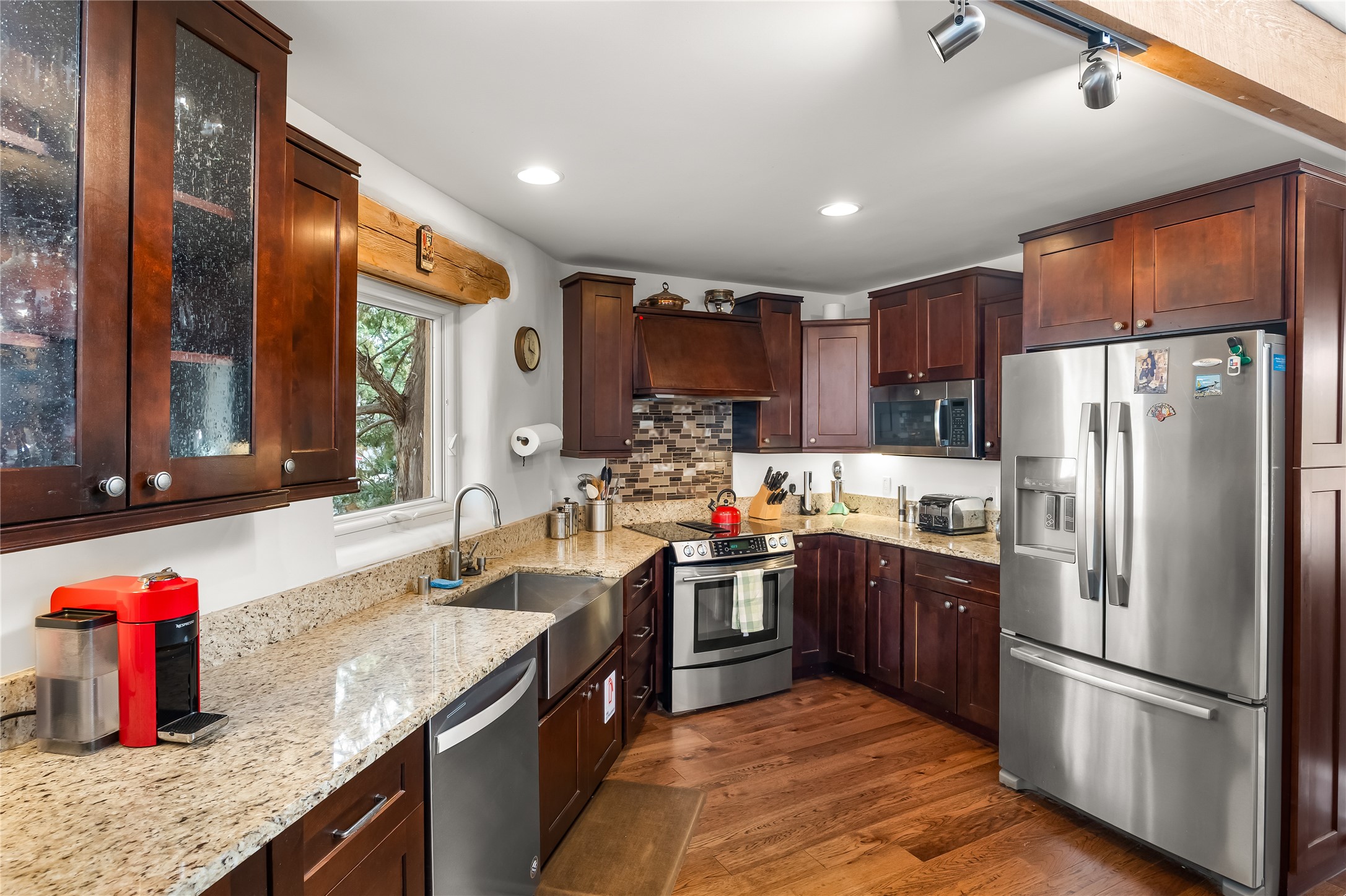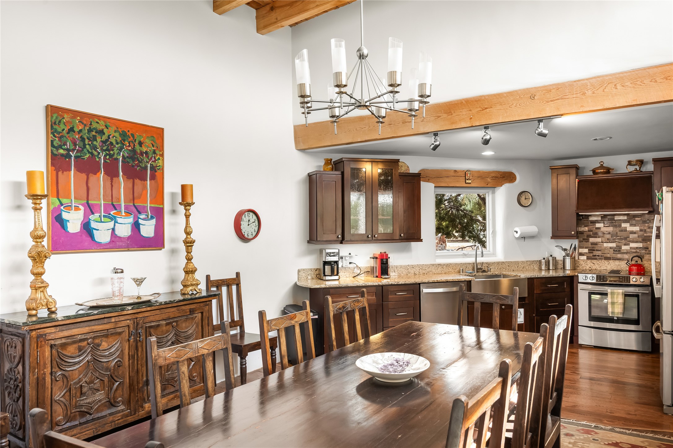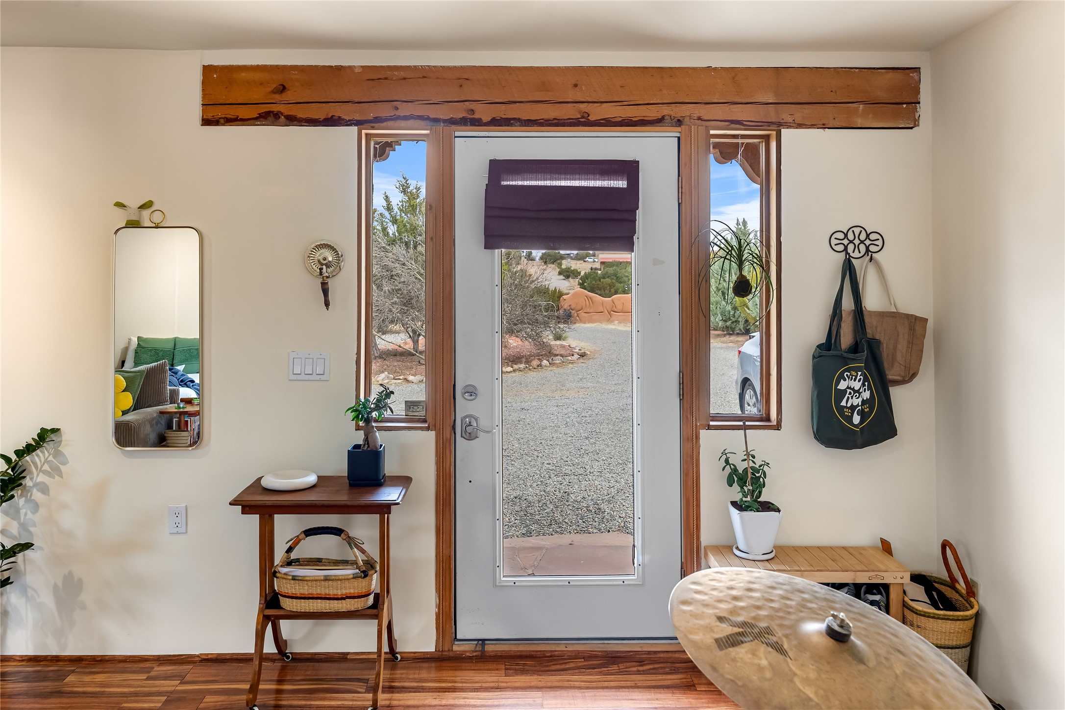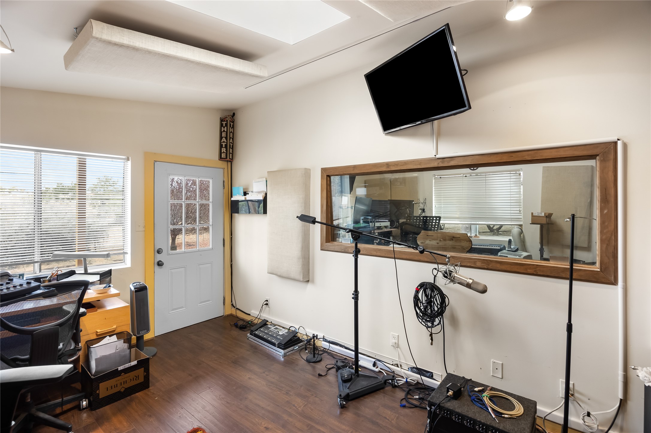 A very cool opportunity is knocking! Convenient in-town location for an adobemain home, plus a detached, spacious Guest House, plus an attached set of(unheated) studio spaces, currently used for music production, plus a detachedoutbuilding, all sited on a 1.8 acre lot! The magic begins as you enter the propertythrough a set of stylized stucco buffalo gates, built by local sculptor, Don Redman; the buffalo theme is repeated in theGuest House's entry. The main home, which has passive solar design, exudes warmth & quintessential Southwestcharm, with brick flooring, a beautifully designed kiva fireplace, high woodaccented ceilings and a Sunroom built by Tent Rock Construction.. An open floor plan and large dining room suggest wonderful times with friends and/or family!! Its two nicely sized bedrooms each featuredoors leading out to the inviting front patio; the primary bedroom also features akiva fireplace. Settings for outdoor gatherings at the home's entry abound. GuestHouse is currently leased. Property to be sold in as is condition.