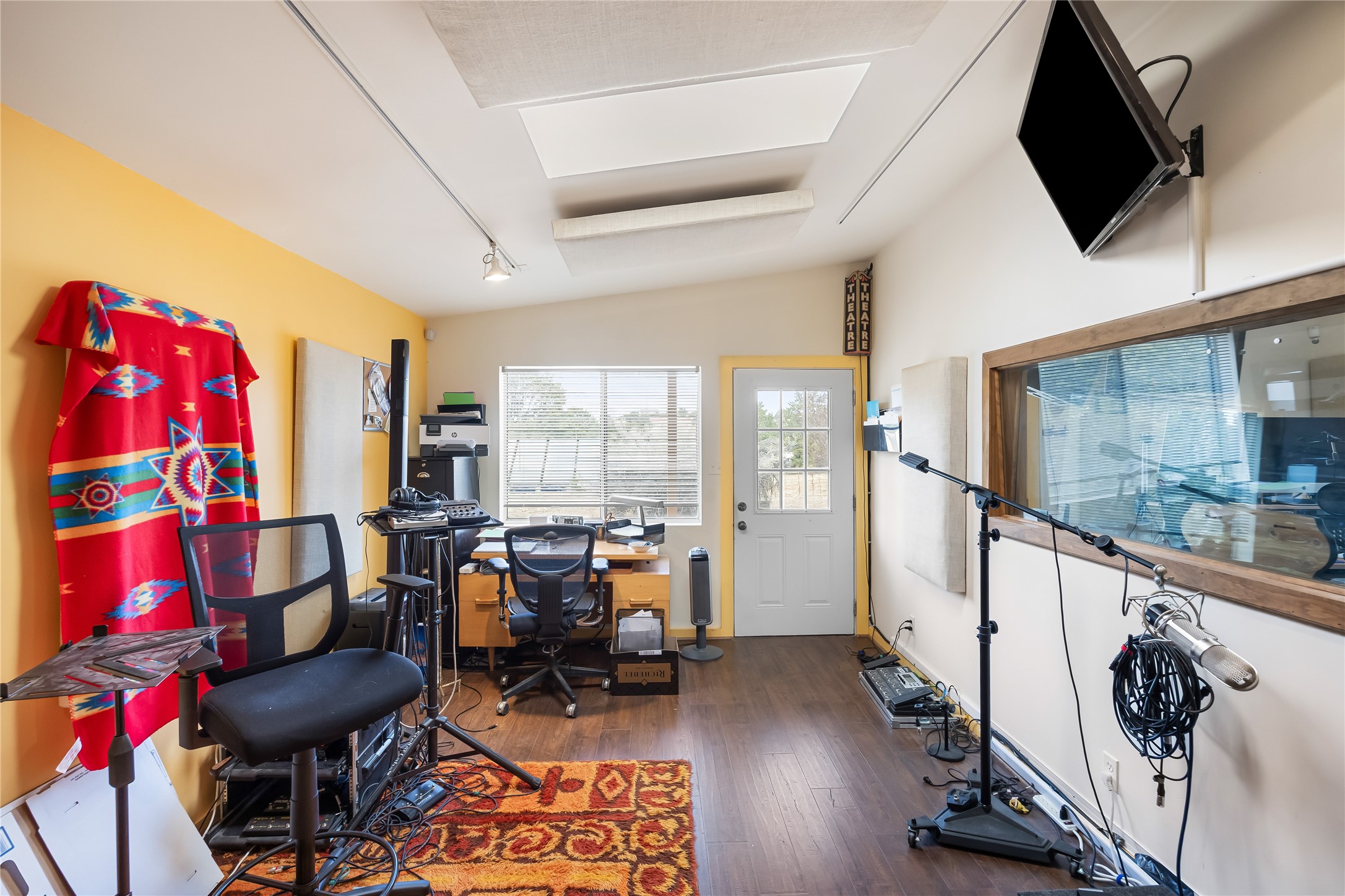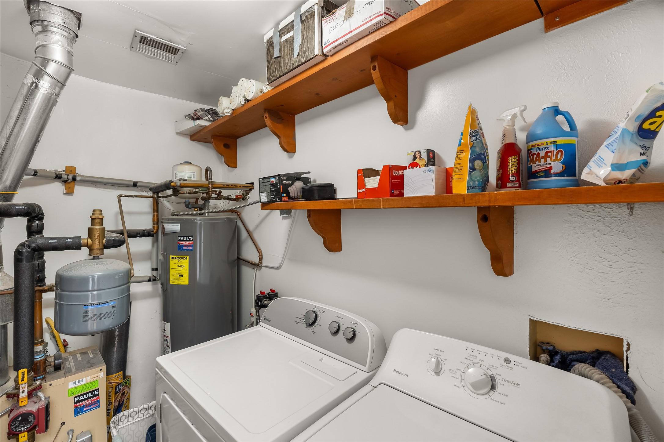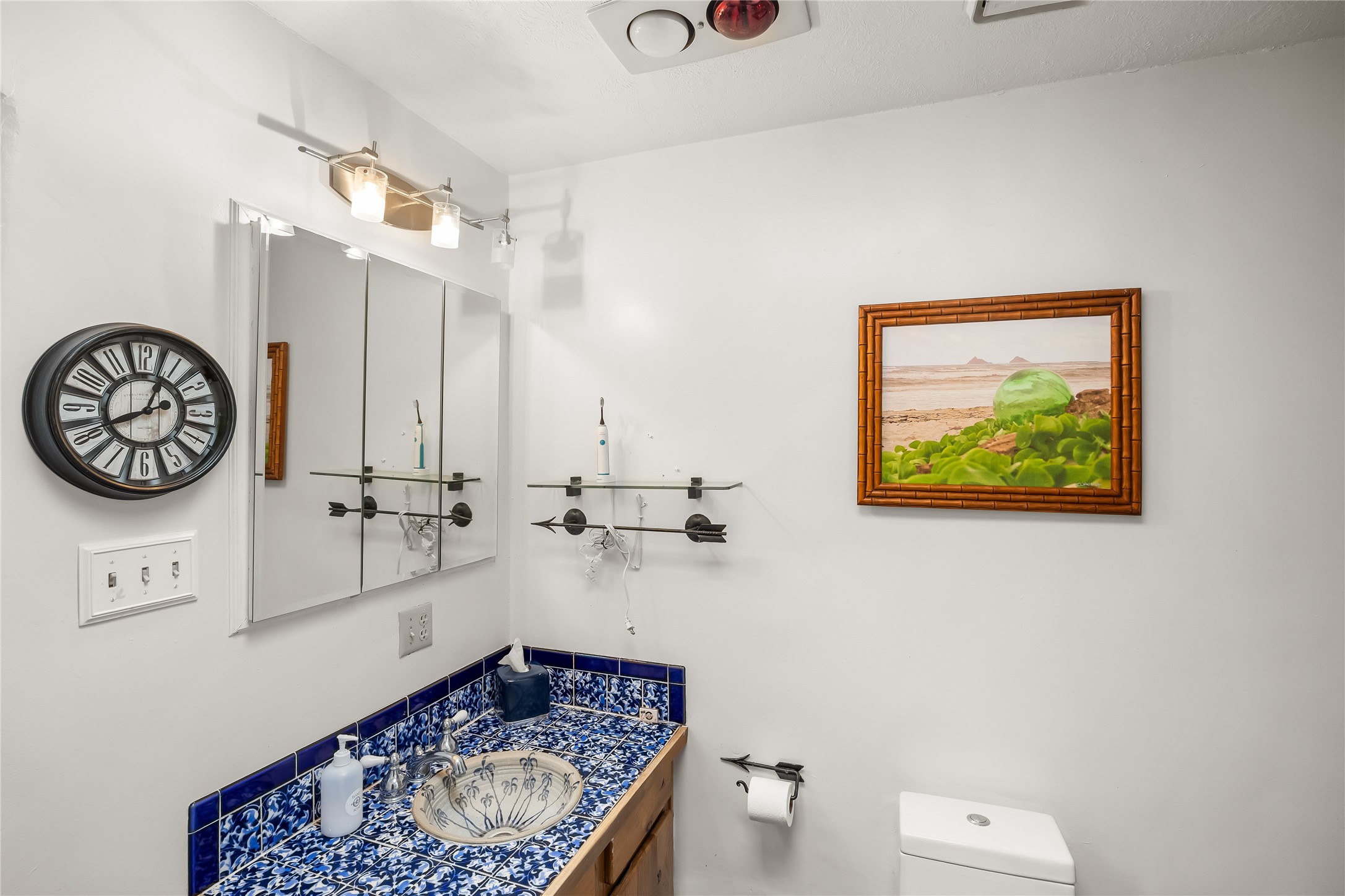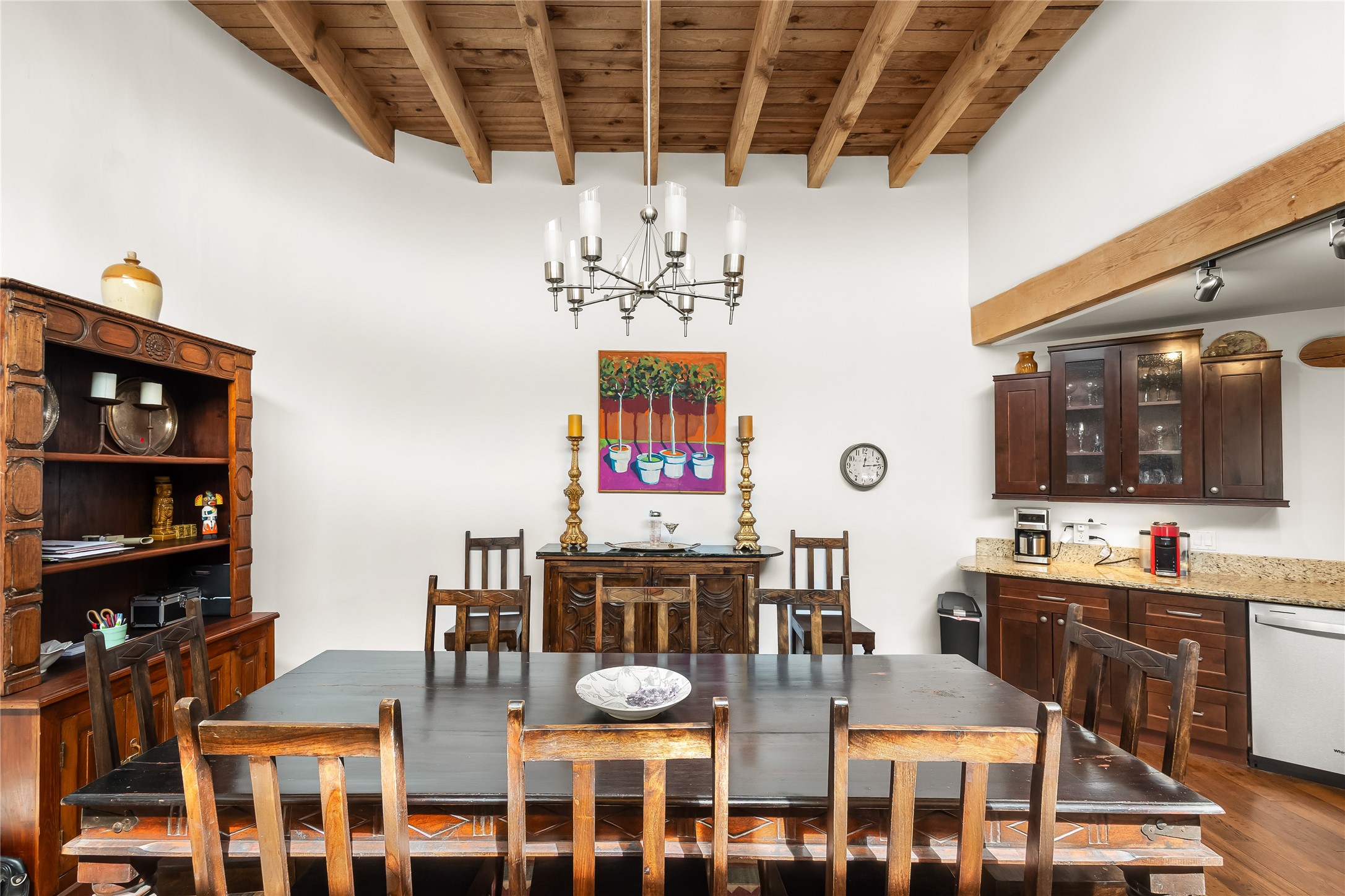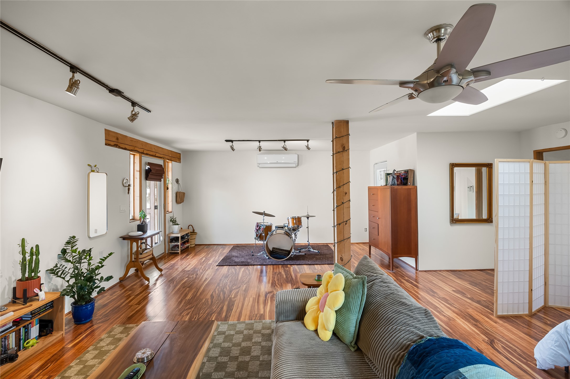 A very cool opportunity is knocking! Convenient in-town location for an adobemain home, plus a detached, spacious Guest House, plus an attached set of(unheated) studio spaces, currently used for music production, plus a detachedoutbuilding, all sited on a 1.8 acre lot! The magic begins as you enter the propertythrough a set of stylized stucco buffalo gates, built by local sculptor, Don Redman; the buffalo theme is repeated in theGuest House's entry. The main home, which has passive solar design, exudes warmth & quintessential Southwestcharm, with brick flooring, a beautifully designed kiva fireplace, high woodaccented ceilings and a Sunroom built by Tent Rock Construction.. An open floor plan and large dining room suggest wonderful times with friends and/or family!! Its two nicely sized bedrooms each featuredoors leading out to the inviting front patio; the primary bedroom also features akiva fireplace. Settings for outdoor gatherings at the home's entry abound. GuestHouse is currently leased. Property to be sold in as is condition.