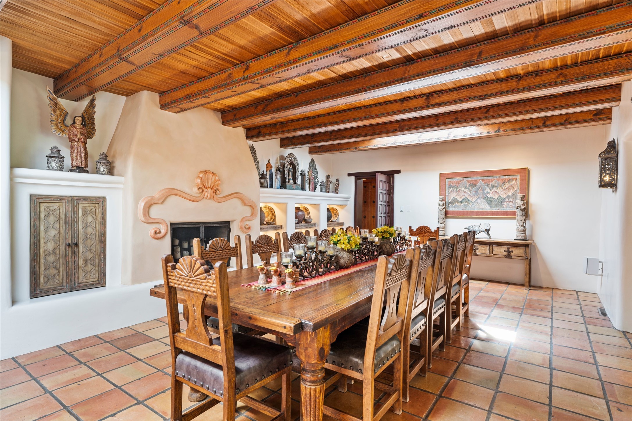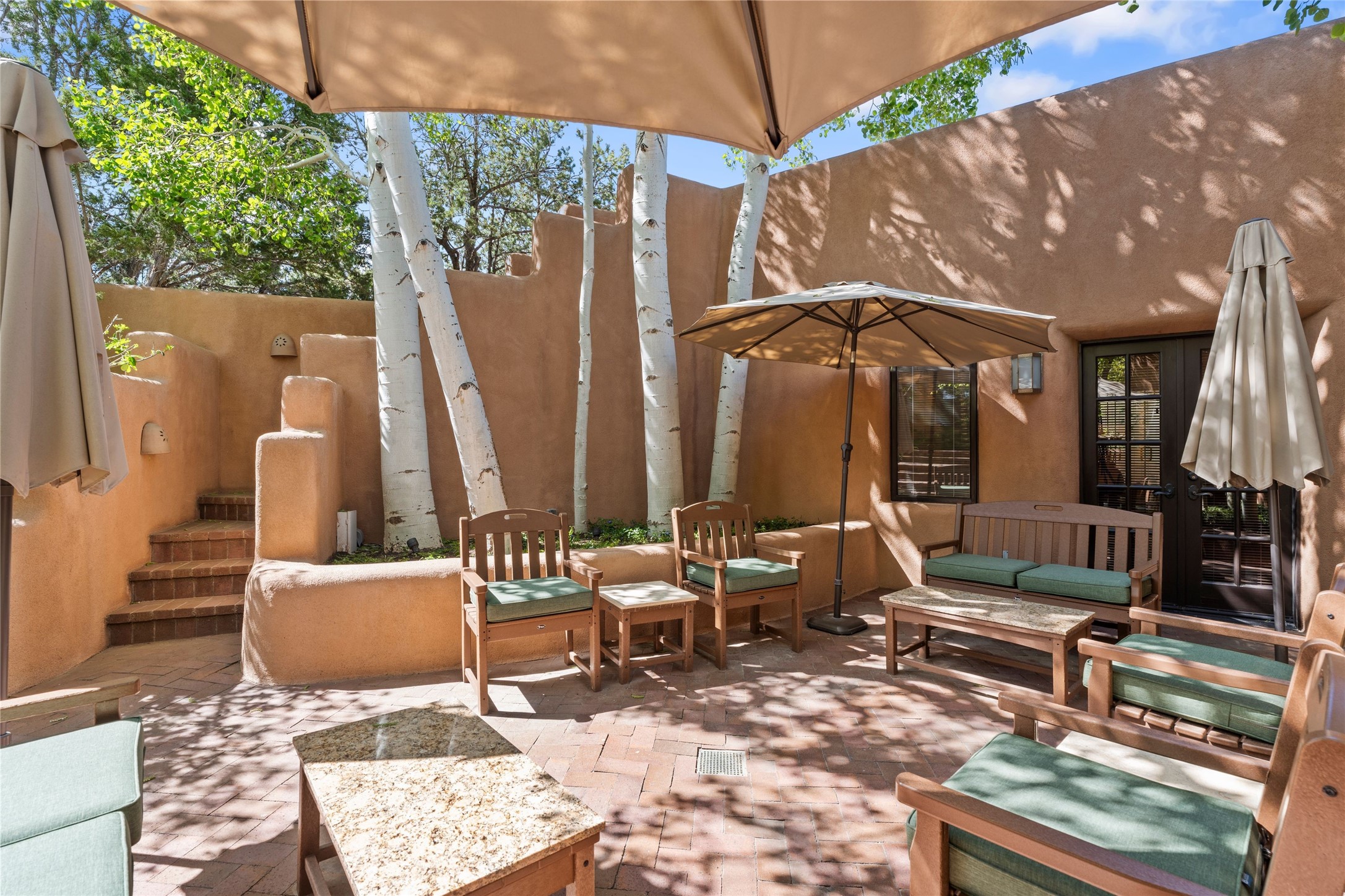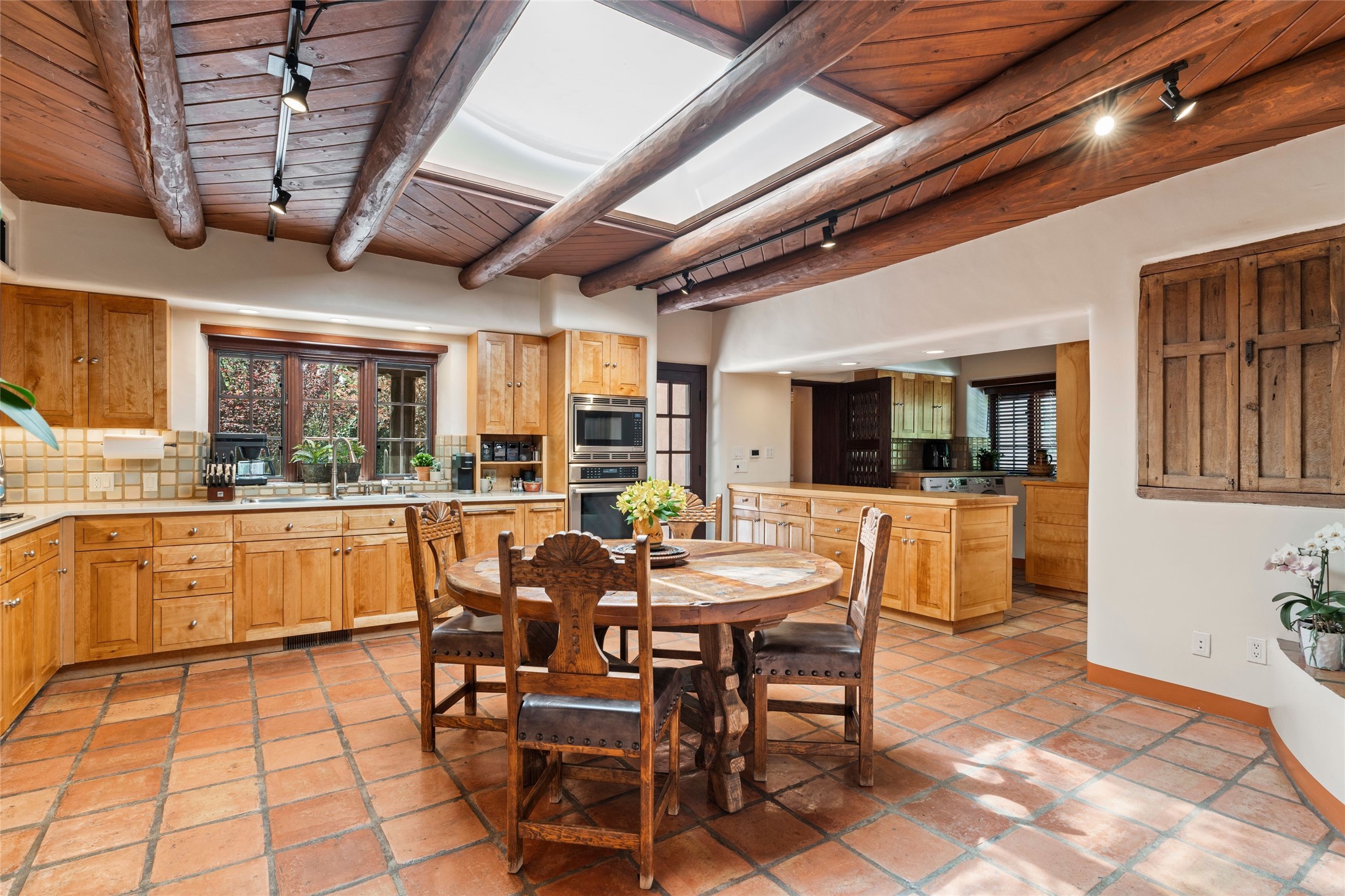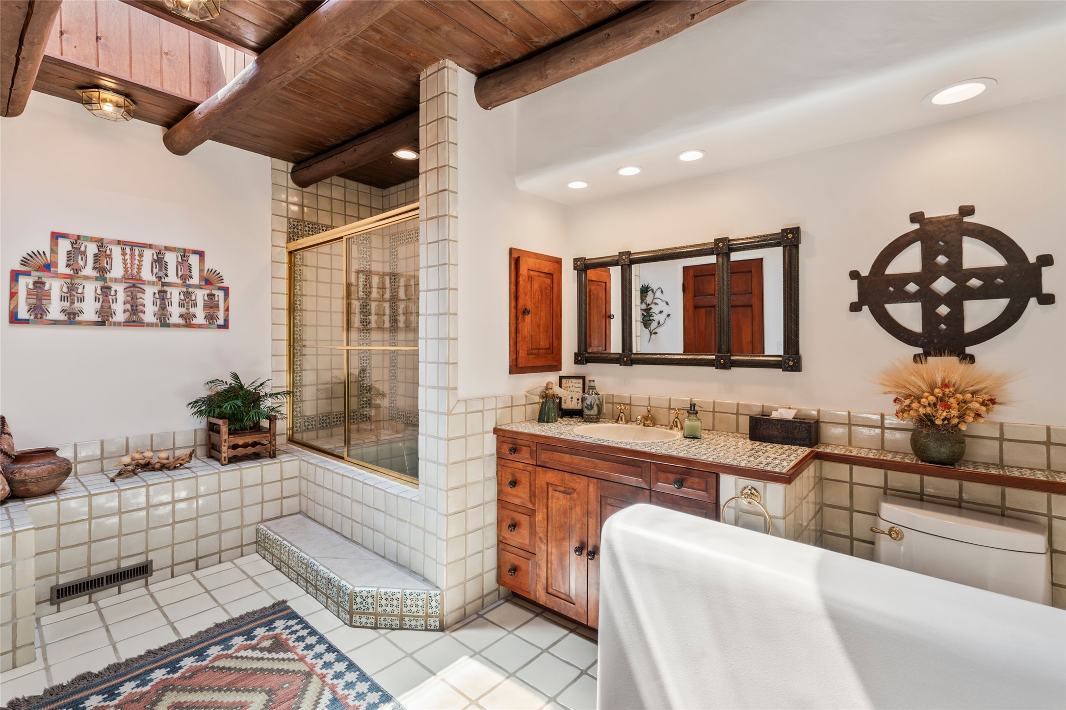 The elegant entry courtyard and portal set an appropriate tone for this impressive property. Privately hidden behind a gated wall is an impeccably maintained home, surrounded by mature trees and multiple courtyards. In addition to the main residence is a 1 bedroom casita. The main house is spacious , gracious and full of authentic Southwest details: vintage Saltillo floors, French doors, vigas, hand-carved and painted beams and woodwork, nichos, bancos and fireplaces. The primary bedroom is expansive and private, and opens to its own patio with hot tub, fireplace, and views.There are 2 additional bedrooms in the main house, plus many extras, including: a large office, a wet bar, a media/library room, a roof top deck and a generator that services the entire house. Plus ample parking (for up to 10 cars) and a 2 car garage are amenities not often found in this coveted Eastside neighborhood. And finally, the LOCATION - not to be missed!!!