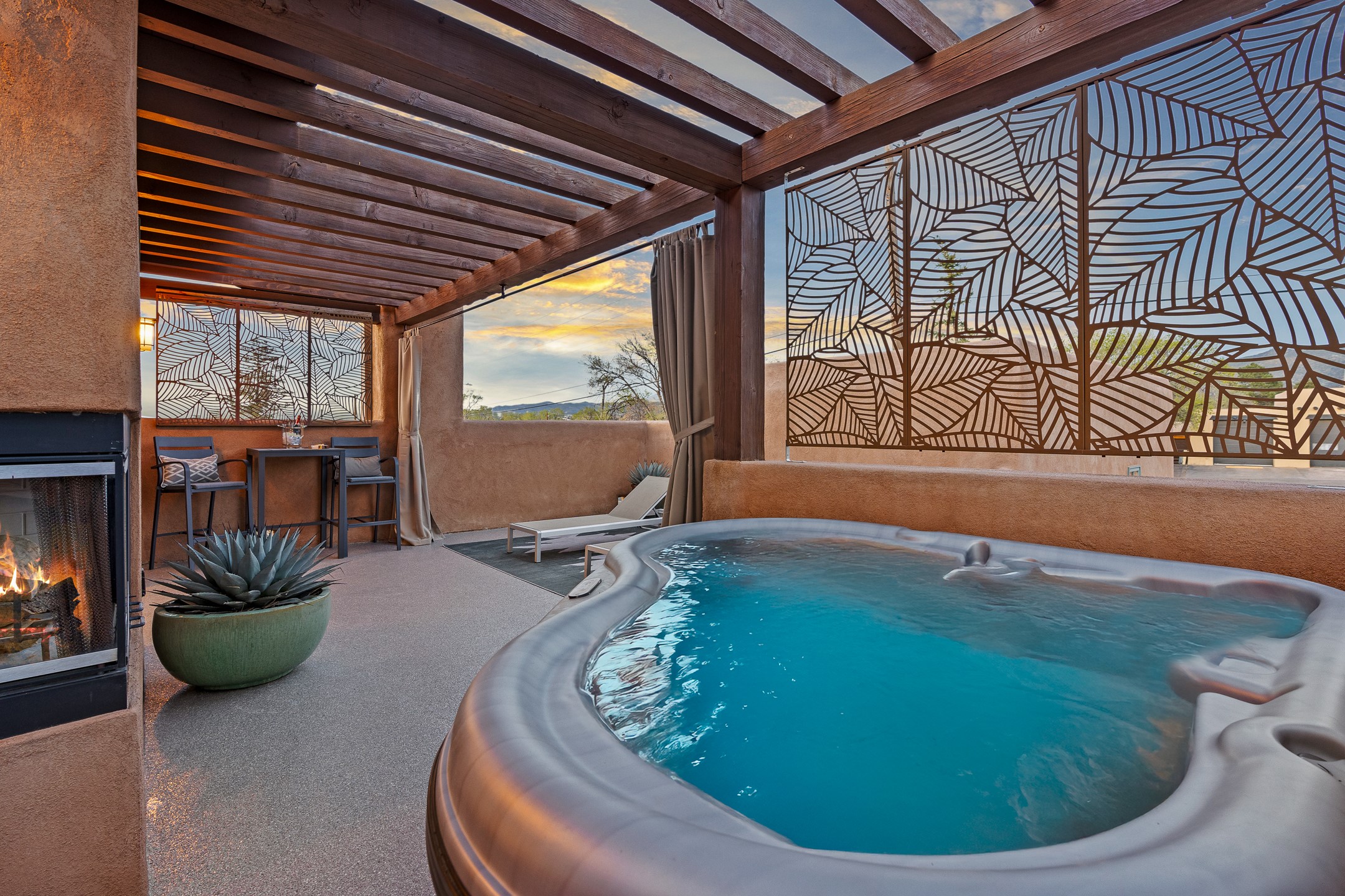 An Architectural & Design Masterpiece.A brilliant collaboration between renowned architect and designer has produced a serene, sophisticated sanctuary in one of Santa Fe's most desirable neighborhoods. This private, gated, 4-bedroom, 4-bath compound is located in the coveted Eastside along the Old Santa Fe trail just moments from the Plaza, Canyon Road, museums, shopping, and world-class dining. Recently elevated with extensive high-end upgrades, the property seamlessly blends quality craftsmanship with timeless elegance. Architectural highlights include soaring ceilings, natural American Clay plaster walls, Douglas Fir coffered wood beam ceilings, and dramatic floor-to-ceiling transom windows. Expertly curated lighting creates a warm and refined ambiance throughout. At the heart of the home is a stunning chef's kitchen--outfitted with a Subzero refrigerator and new Viking appliances--overlooking a beautifully landscaped central courtyard designed for effortless indoor/outdoor living. Each room opens to this verdant garden oasis featuring a tranquil waterfall fountain, lush greenery, alfresco dining, and multiple verandas for entertaining. The grand living and dining rooms are anchored by a natural stone fireplace and expansive glass doors that frame a courtyard garden with mature Wisteria, Aspen, and a stately Cherry tree. Upstairs, the luxurious primary suite offers breathtaking views of Picacho Peak and includes a spa-like bath with Jacuzzi tub, steam shower, dual vanities, and walk-in closet. The crown jewel: a private rooftop terrace with fireplace, cedar hot tub, sauna, and wrap-around deck--perfect for starry Santa Fe nights. Additional amenities include a 2.5-car garage, new mini splits, recessed lighting, designer tile work, and custom draperies. This property is currently part of a rare compound opportunity with 994 Old Pecos Trail next door. While both homes are offered individually, a buyer also has the unique opportunity to purchase them together and create an extraordinary multi-residence estate. (See listing #202501401.)