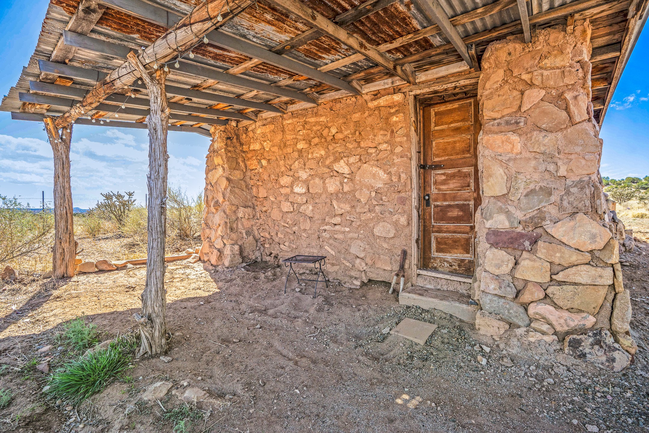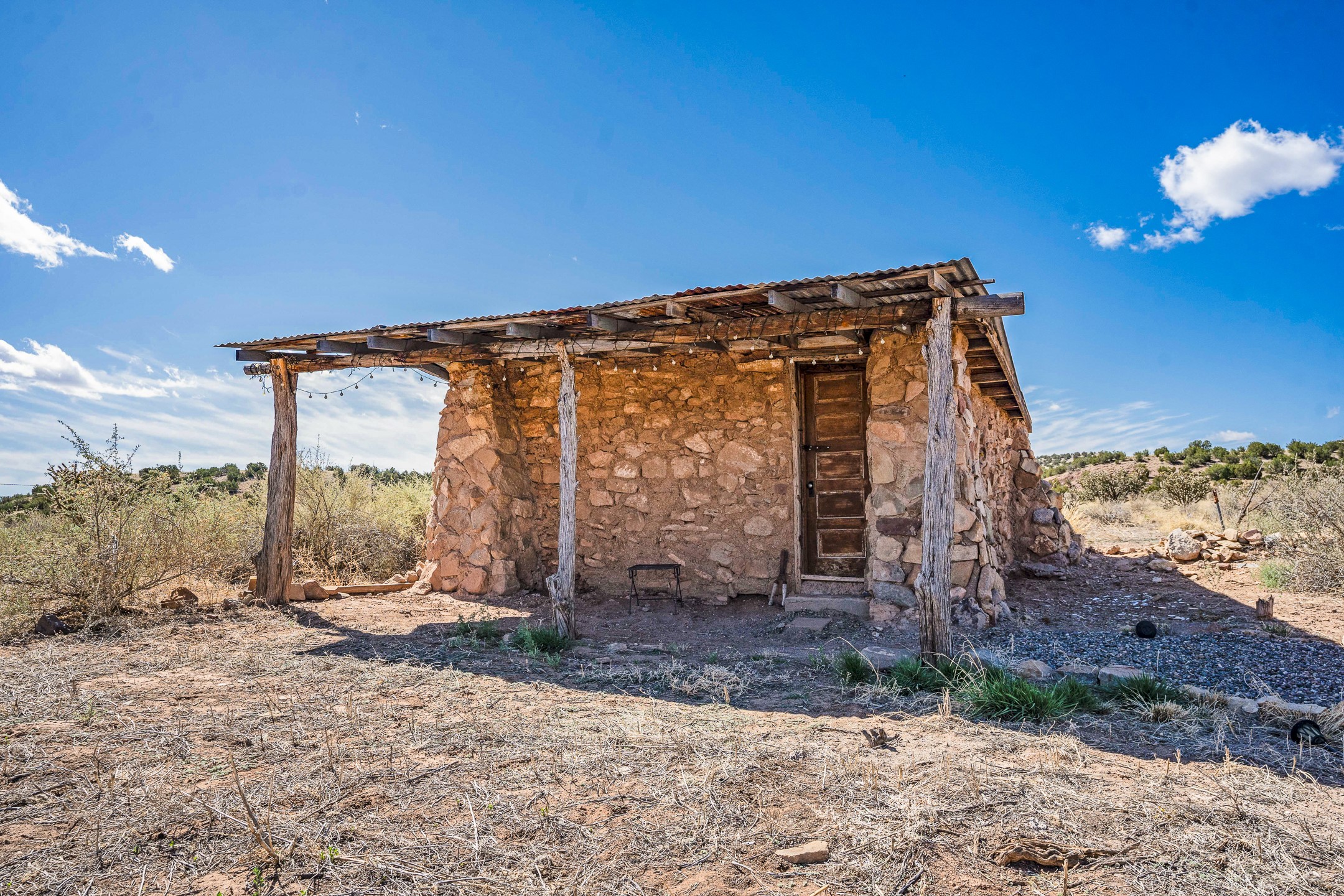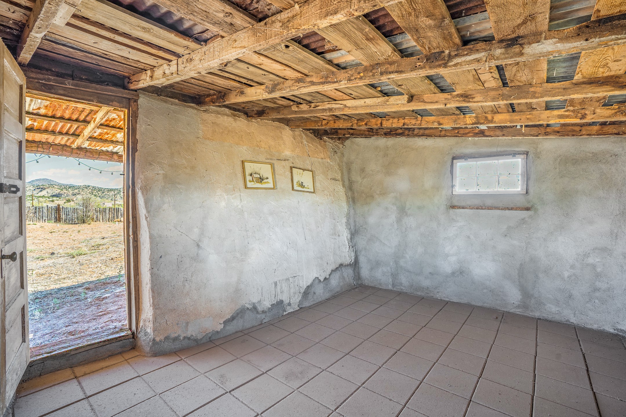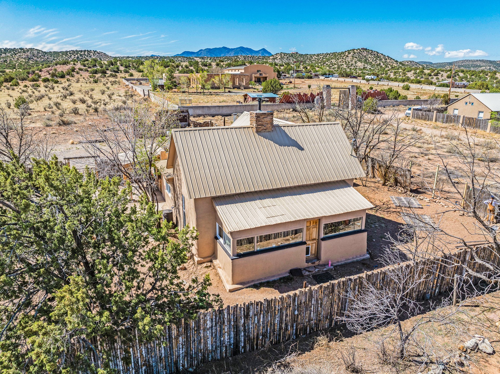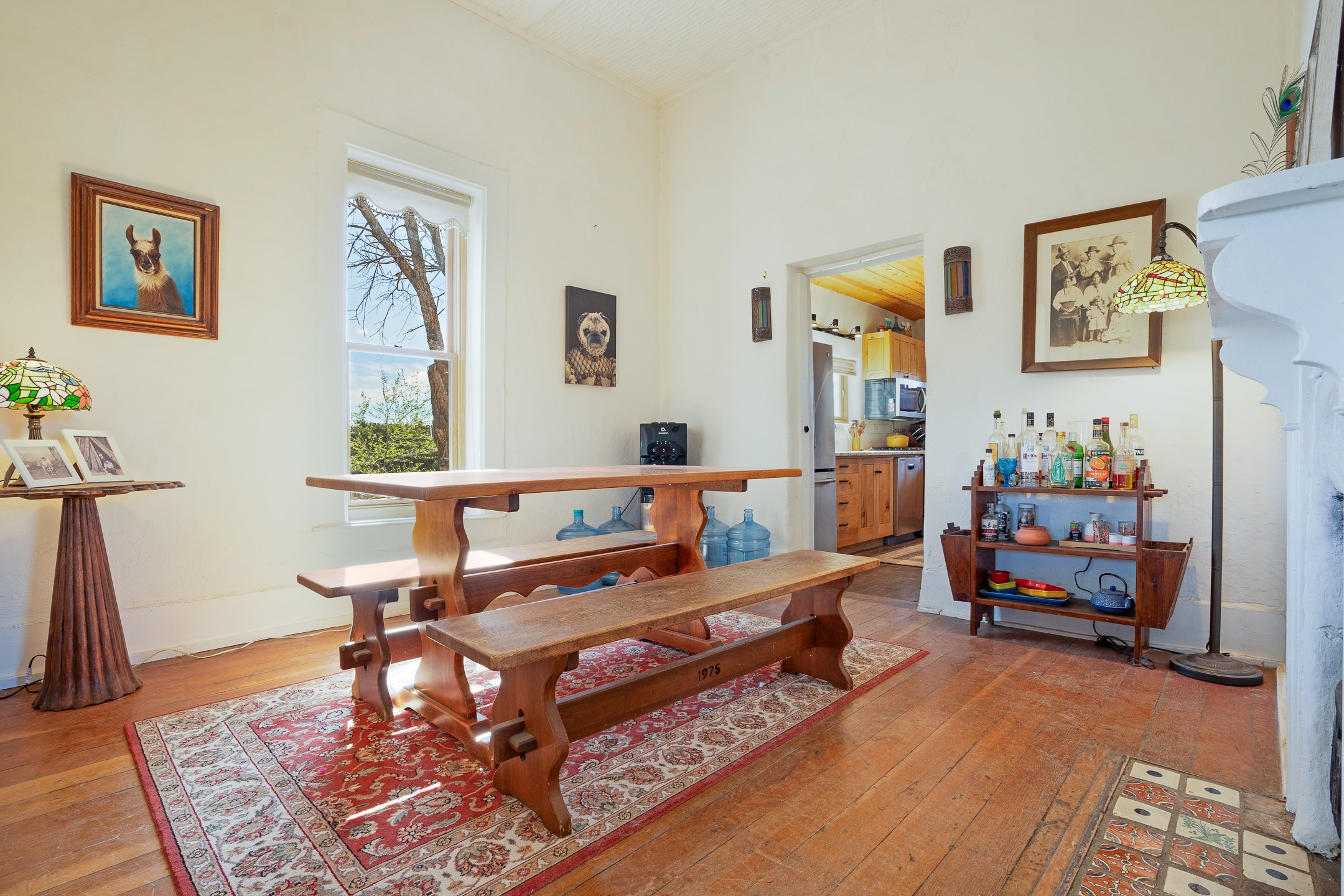 Old West charm abounds in this light filled home just outside of Cerrillos. The original parts of the building are believed to date to 1900, and many vintage details remain intact, including the wood floors and high, stamped metal ceilings. A lower level addition with banks of south facing windows brings in light and solar gain in winter, while mini-splits cool in summer. Outdoor spaces are well delineated, with mature plantings, a pleasant fenced patio space, and an old stone building has been used as a studio. A chicken coop, not currently occupied, doubles as a storage space. Less than a minute from the pavement, and on community water, the home is within walking distance of Cerrillos or a quick drive from Santa Fe.