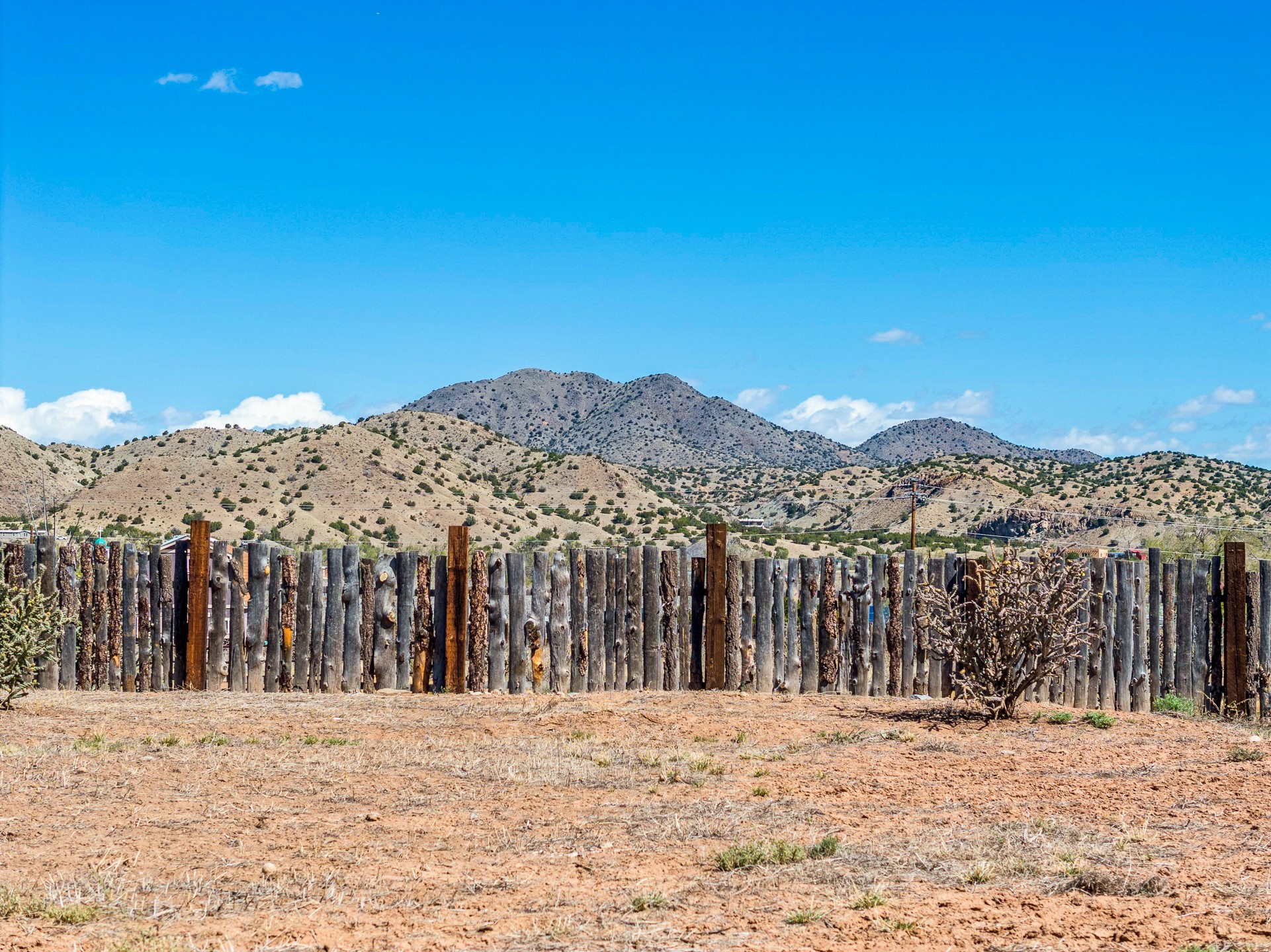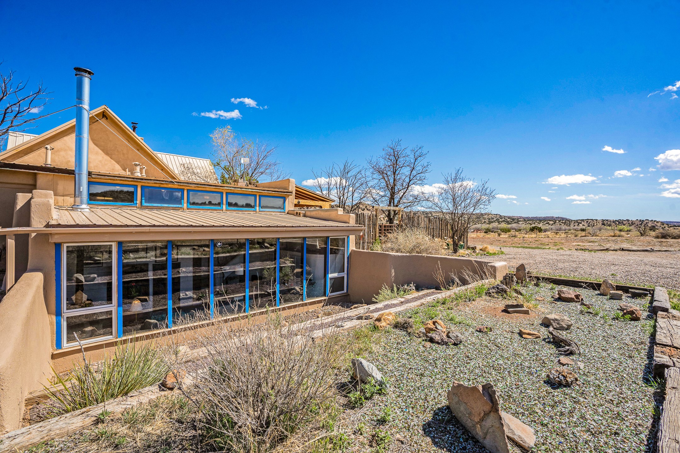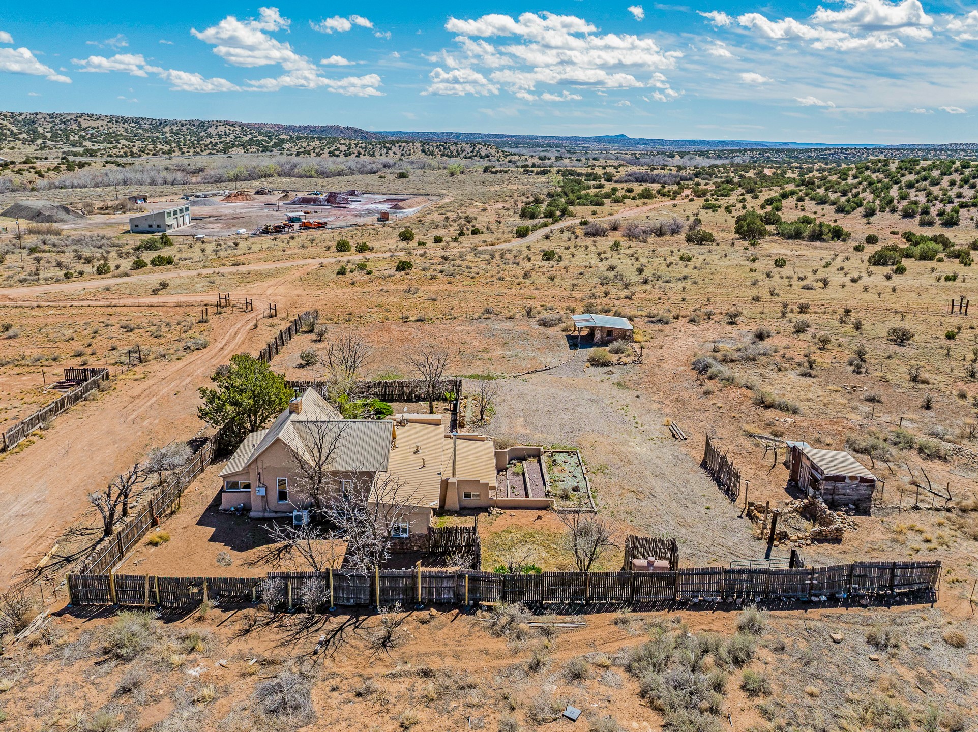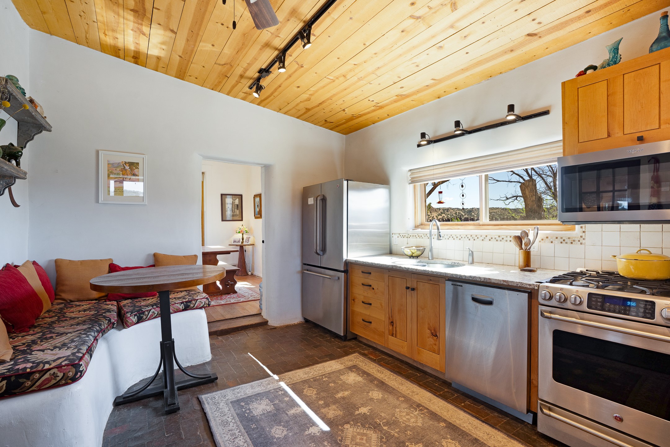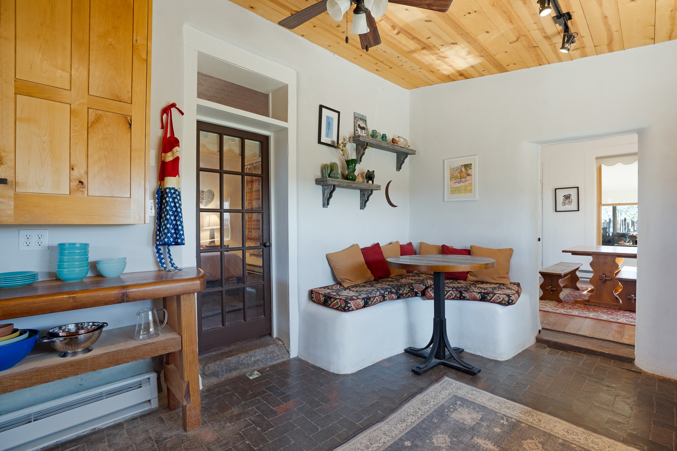 Old West charm abounds in this light filled home just outside of Cerrillos. The original parts of the building are believed to date to 1900, and many vintage details remain intact, including the wood floors and high, stamped metal ceilings. A lower level addition with banks of south facing windows brings in light and solar gain in winter, while mini-splits cool in summer. Outdoor spaces are well delineated, with mature plantings, a pleasant fenced patio space, and an old stone building has been used as a studio. A chicken coop, not currently occupied, doubles as a storage space. Less than a minute from the pavement, and on community water, the home is within walking distance of Cerrillos or a quick drive from Santa Fe.