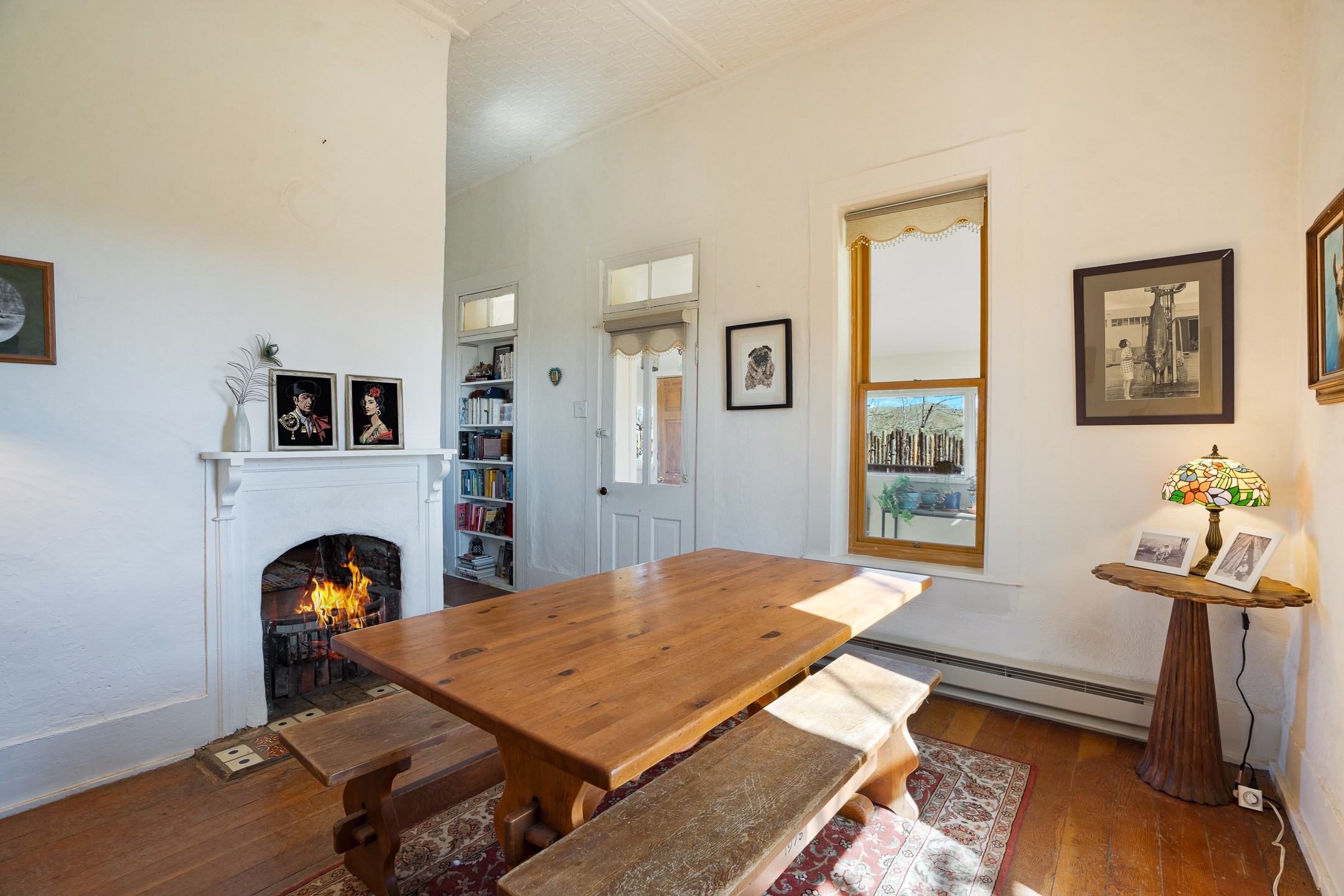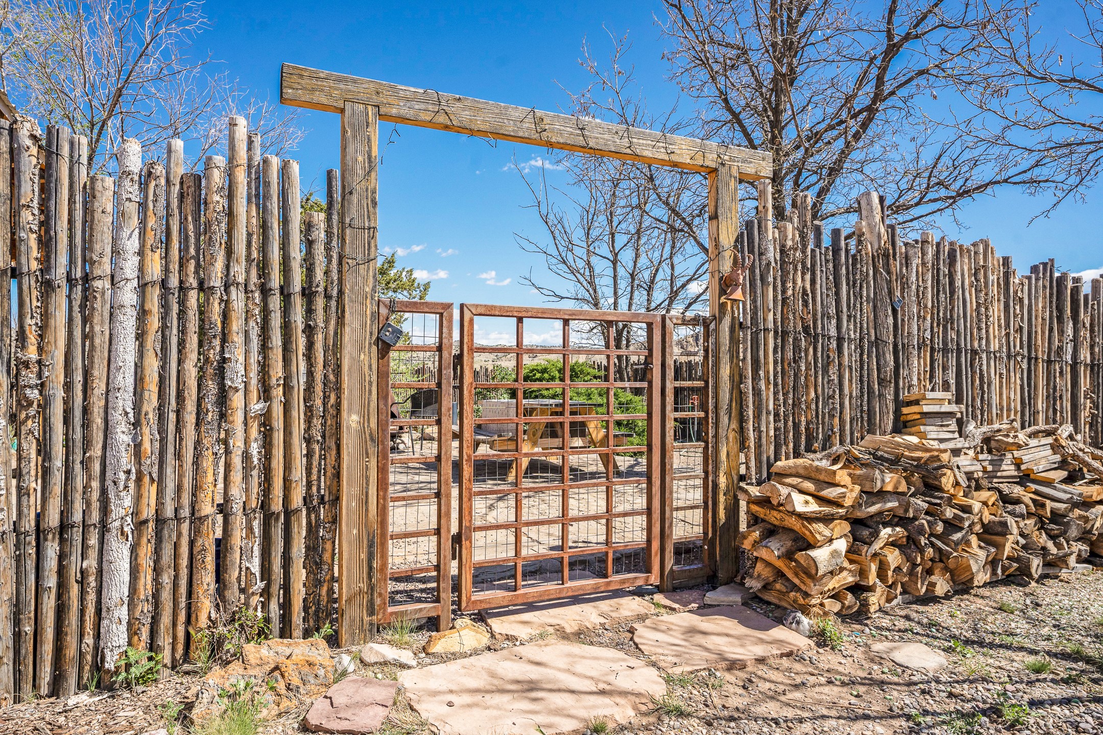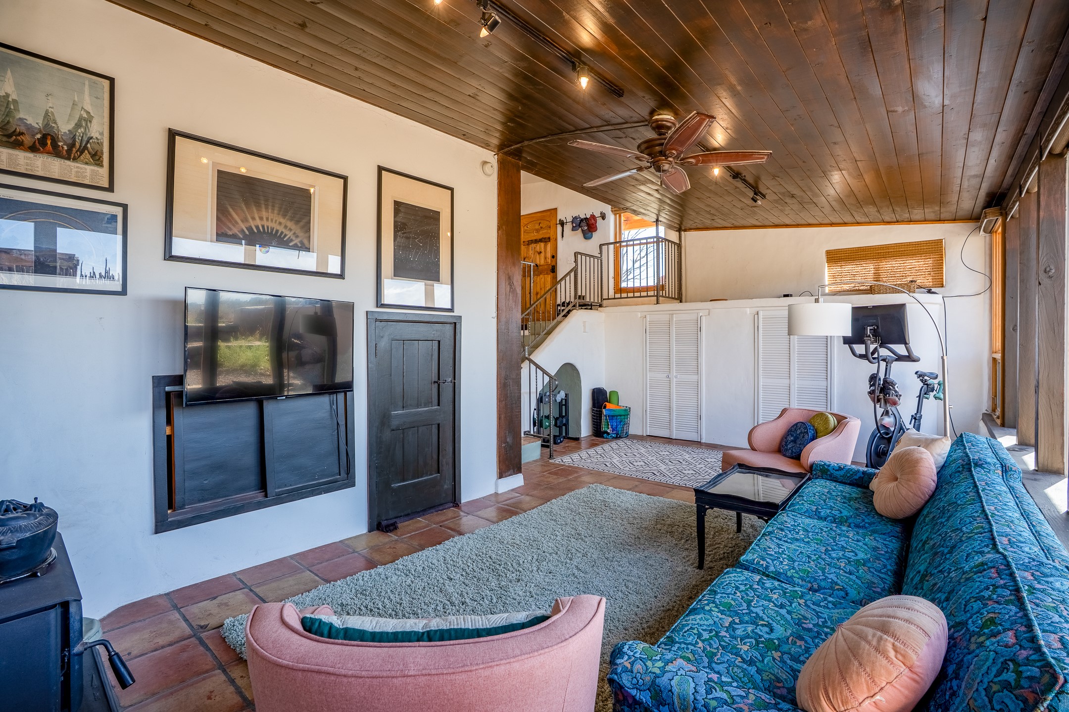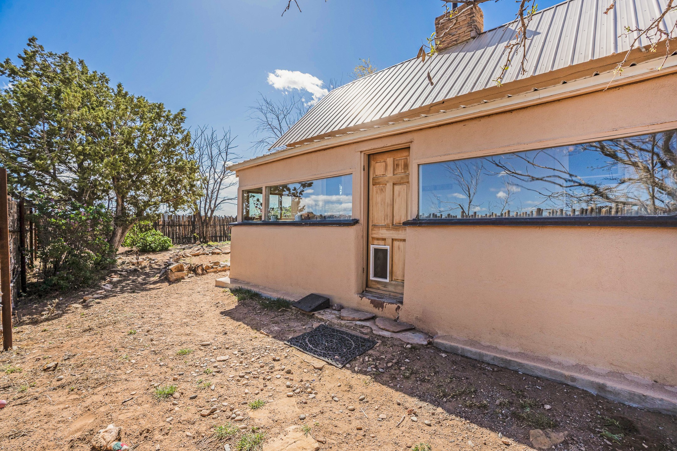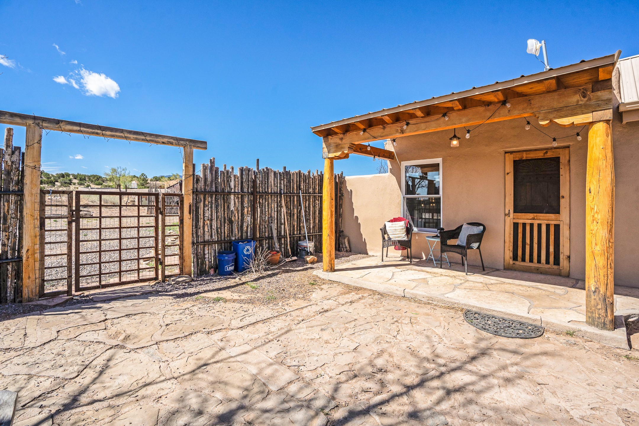 Old West charm abounds in this light filled home just outside of Cerrillos. The original parts of the building are believed to date to 1900, and many vintage details remain intact, including the wood floors and high, stamped metal ceilings. A lower level addition with banks of south facing windows brings in light and solar gain in winter, while mini-splits cool in summer. Outdoor spaces are well delineated, with mature plantings, a pleasant fenced patio space, and an old stone building has been used as a studio. A chicken coop, not currently occupied, doubles as a storage space. Less than a minute from the pavement, and on community water, the home is within walking distance of Cerrillos or a quick drive from Santa Fe.