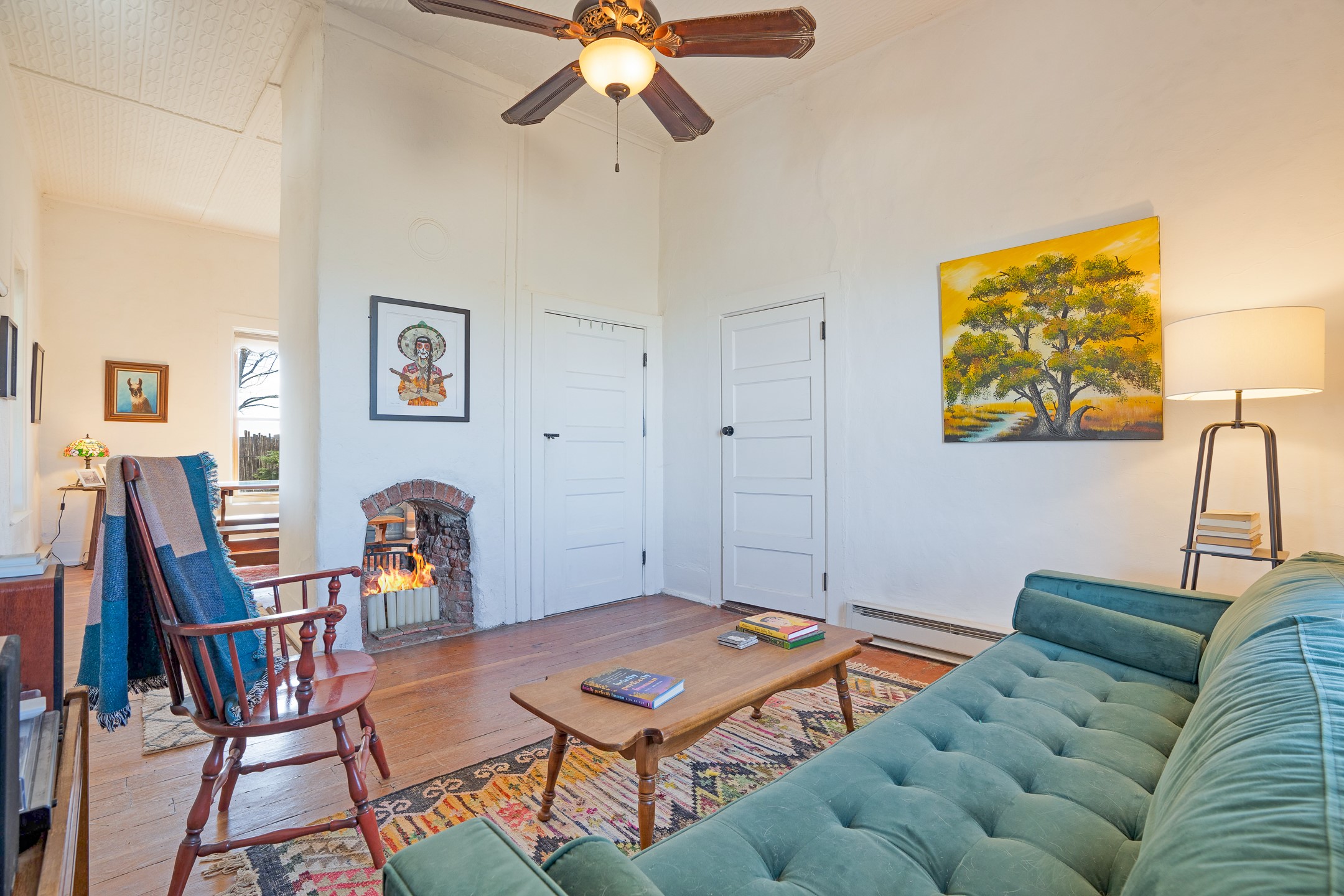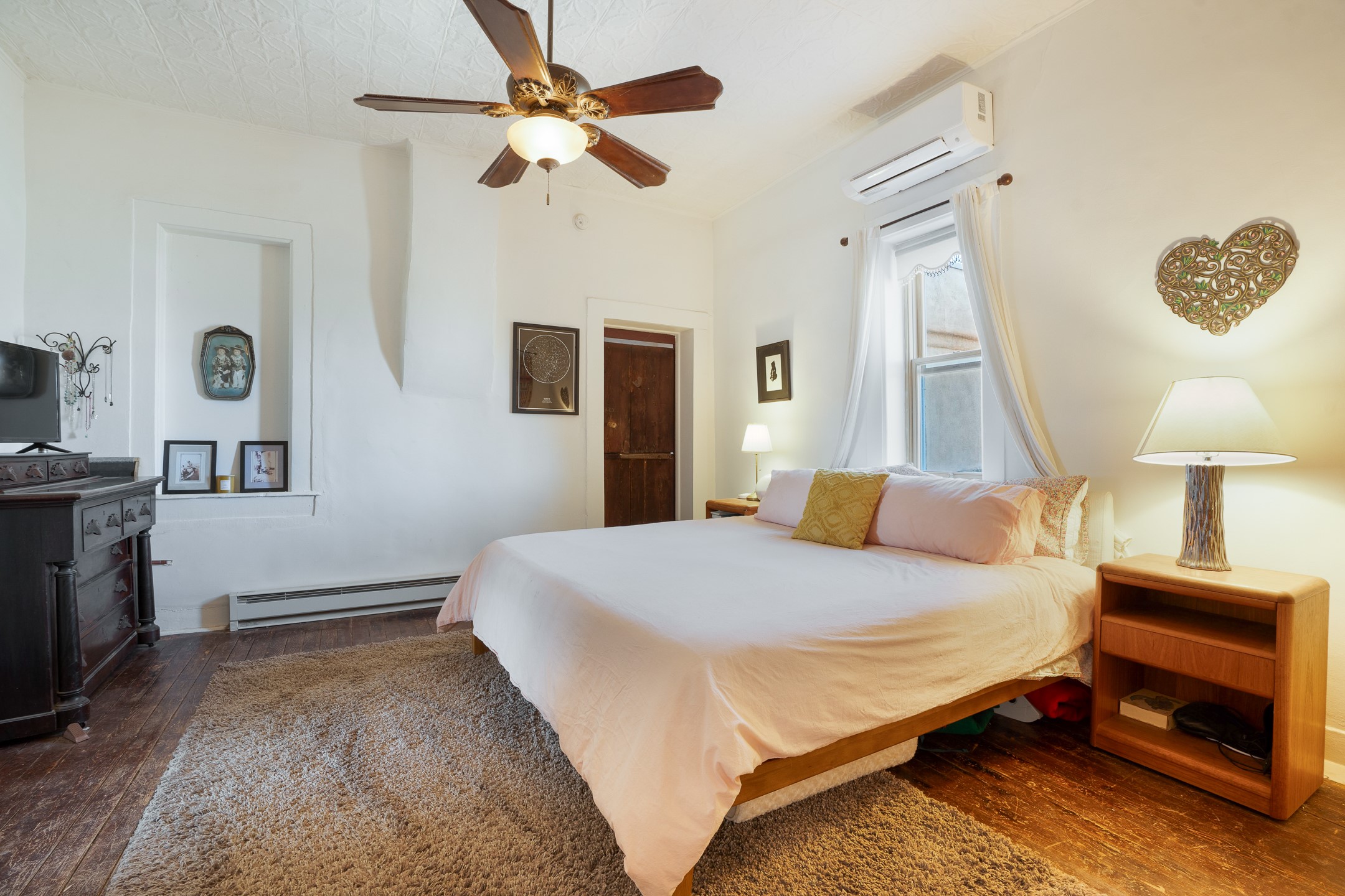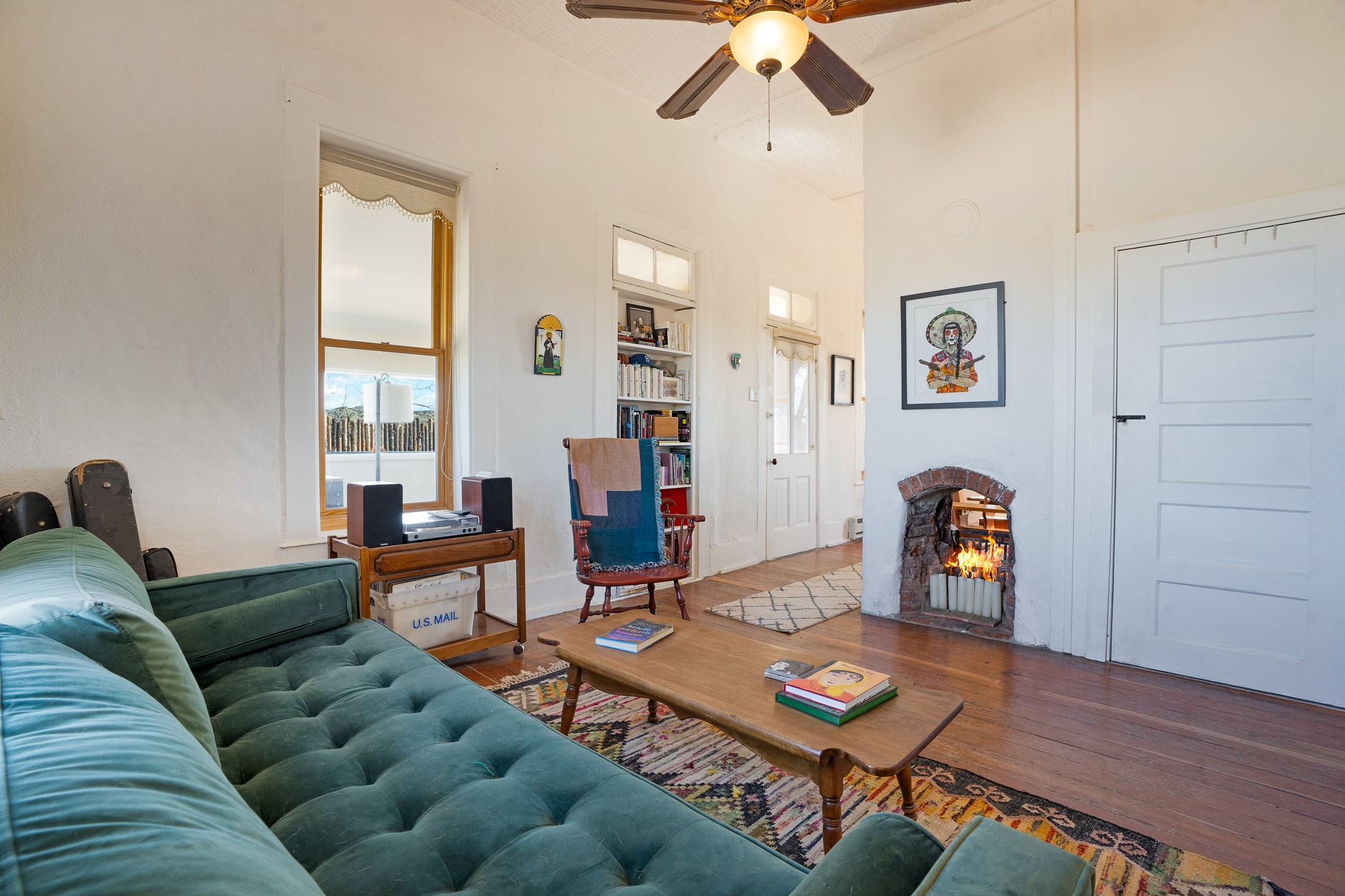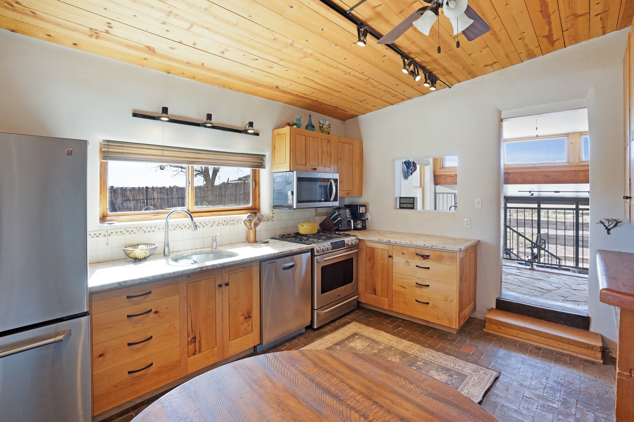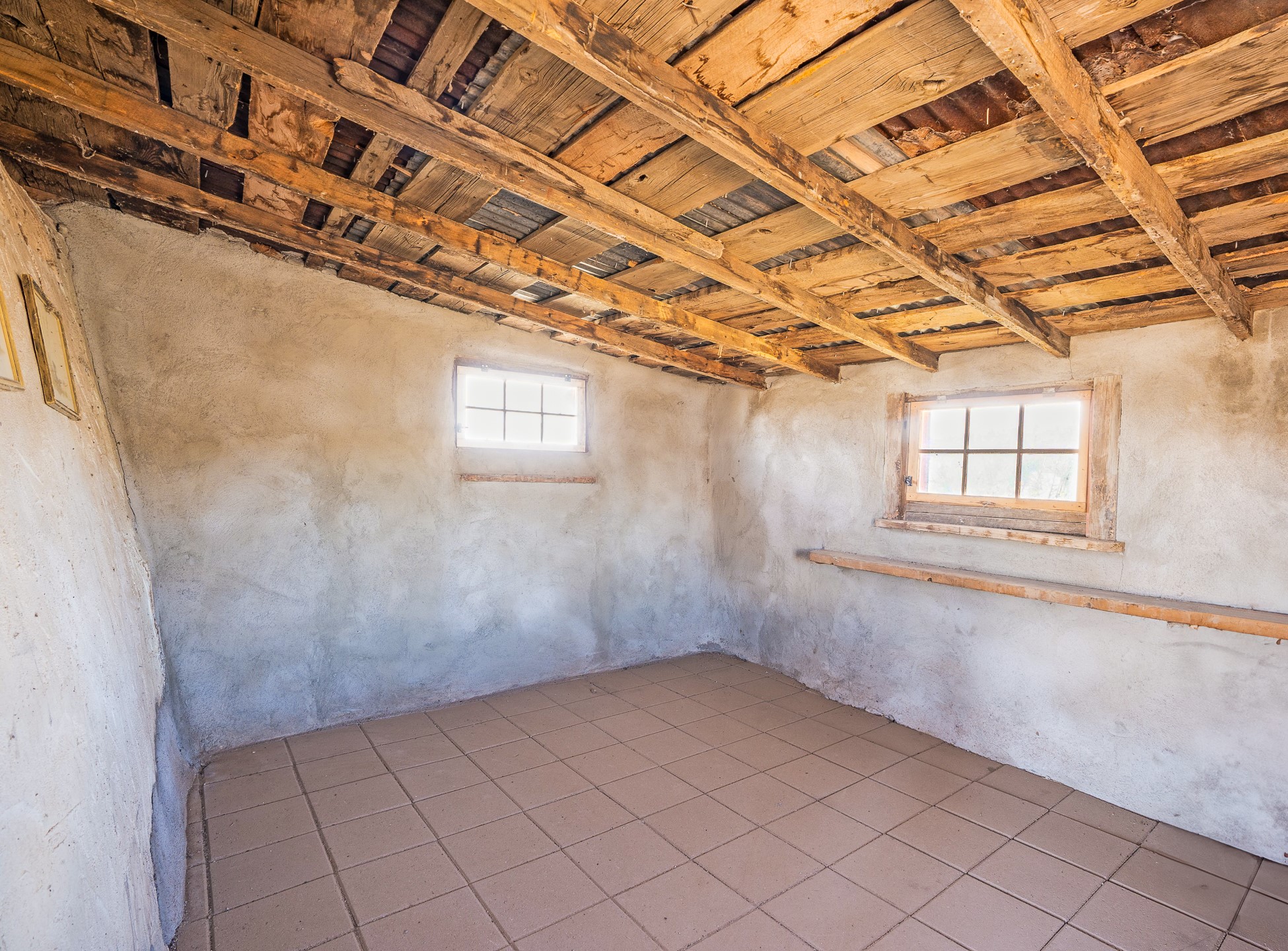 Old West charm abounds in this light filled home just outside of Cerrillos. The original parts of the building are believed to date to 1900, and many vintage details remain intact, including the wood floors and high, stamped metal ceilings. A lower level addition with banks of south facing windows brings in light and solar gain in winter, while mini-splits cool in summer. Outdoor spaces are well delineated, with mature plantings, a pleasant fenced patio space, and an old stone building has been used as a studio. A chicken coop, not currently occupied, doubles as a storage space. Less than a minute from the pavement, and on community water, the home is within walking distance of Cerrillos or a quick drive from Santa Fe.