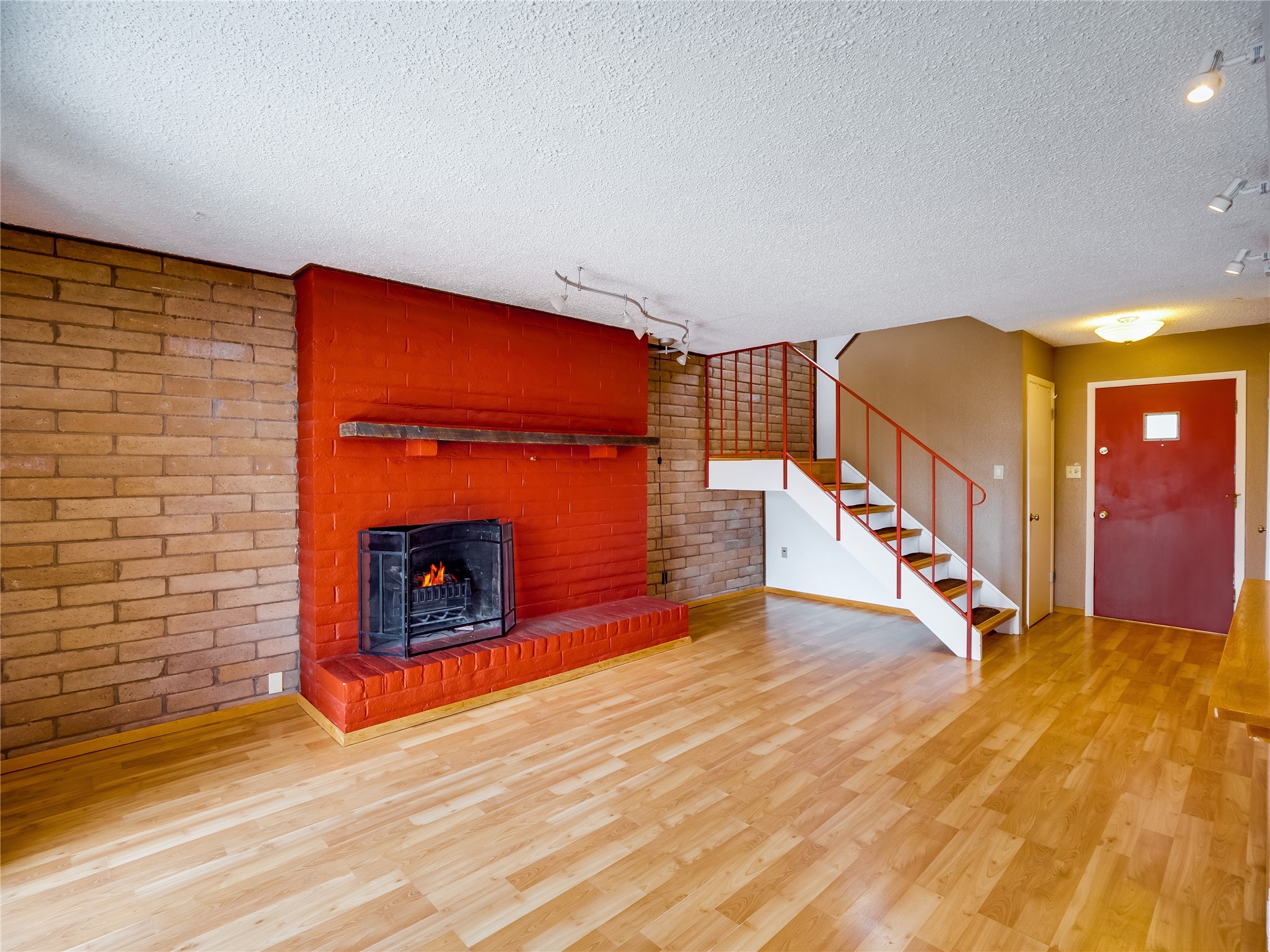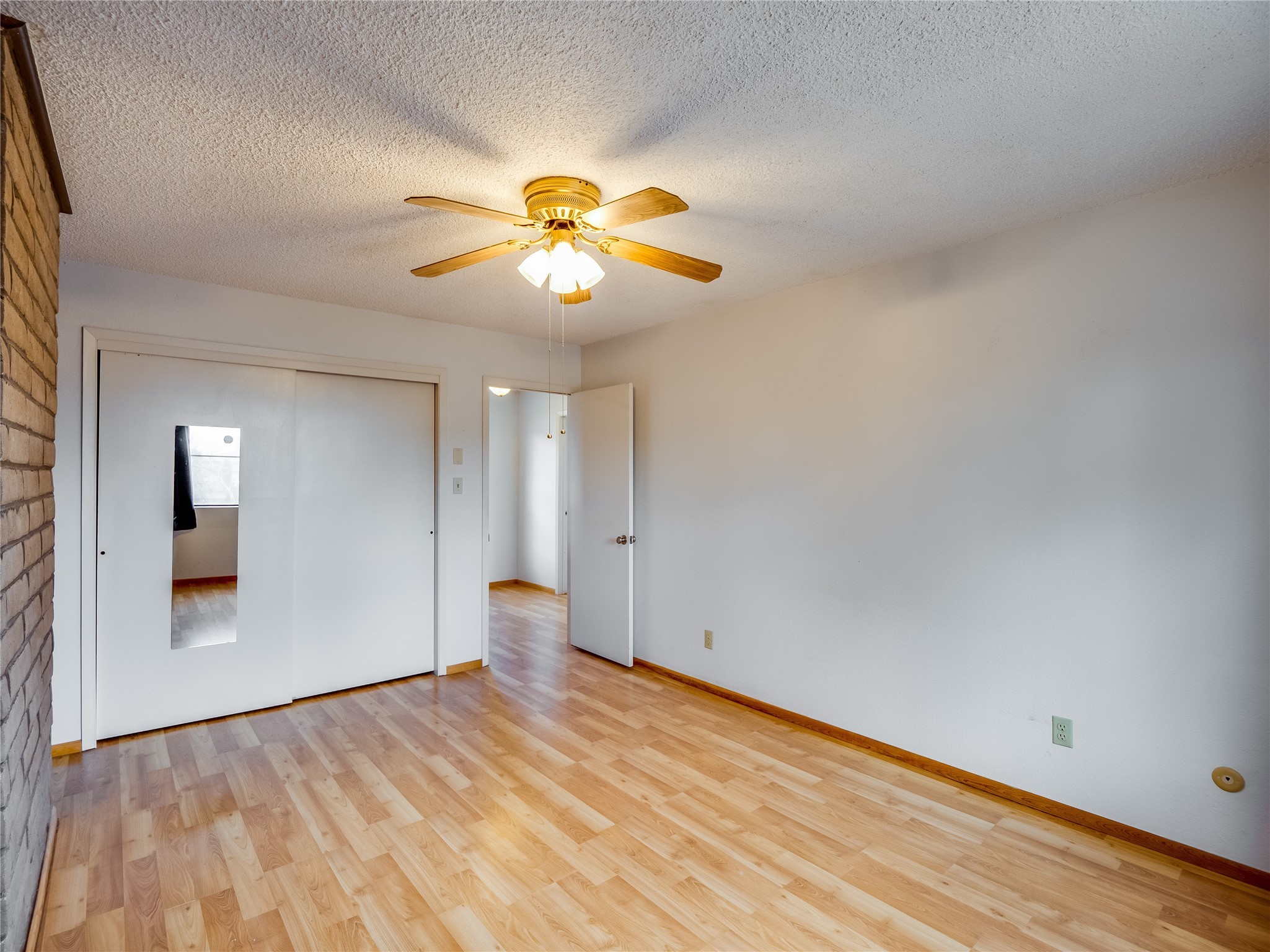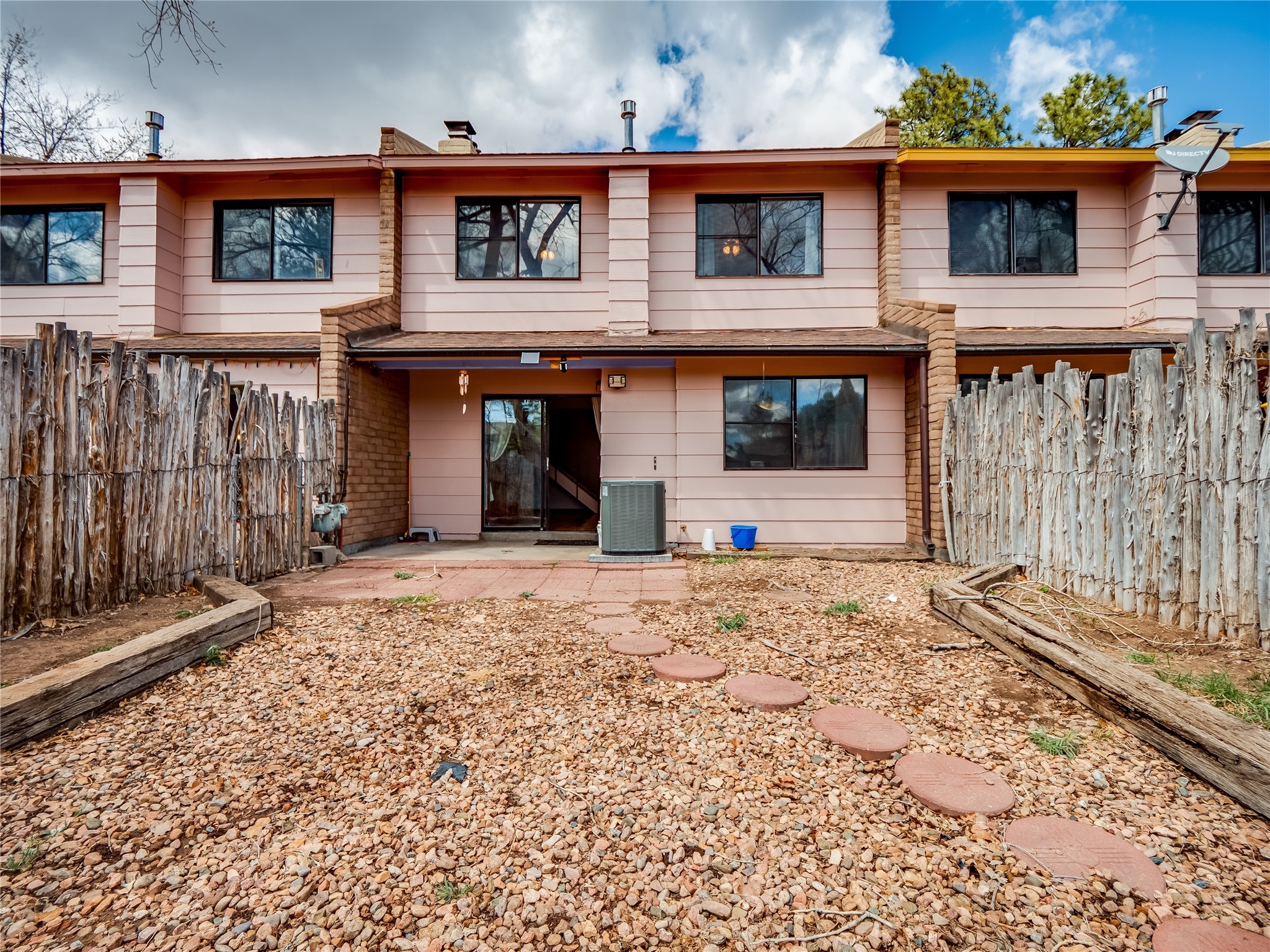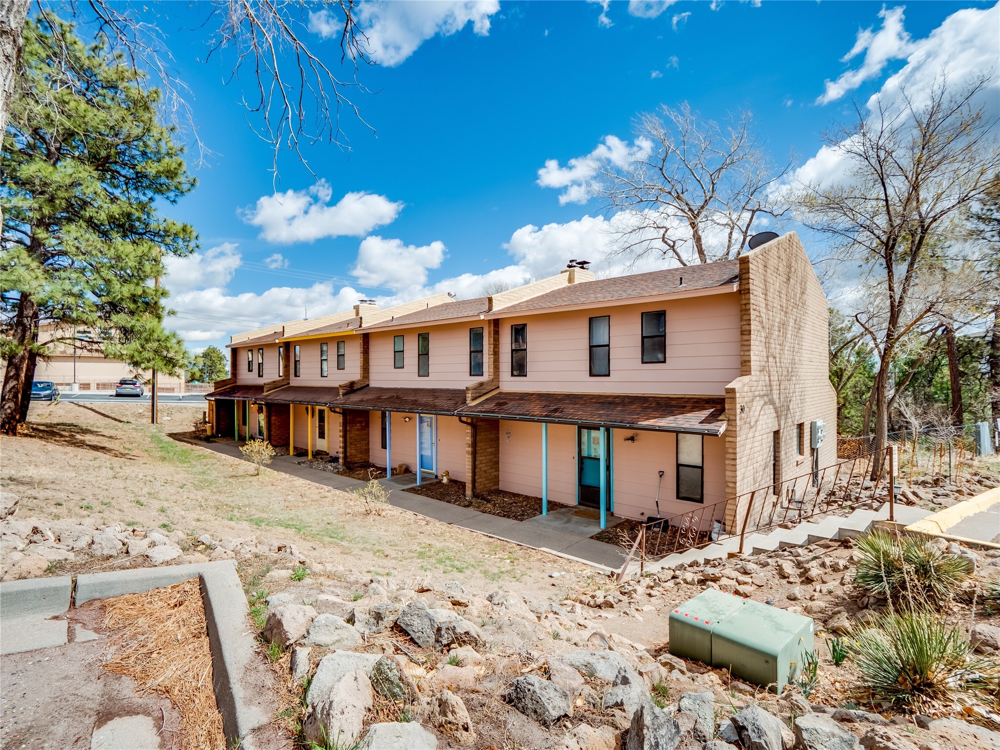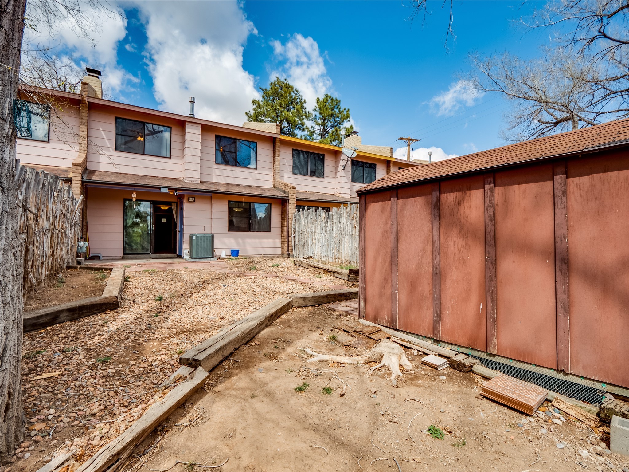 Discover character and comfort in this unique two-story condo perched above the canyon in the sought-after Eastern Area. From your designated parking spots, descend to your front entrance and step into a welcoming foyer featuring a convenient coat closet and a deep storage closet--perfect for stashing gear and everyday essentials. Light-colored laminate wood flooring flows throughout the home, creating a bright and cohesive aesthetic. The spacious living room invites you in with a stunning focal point, a vibrant painted brick fireplace accented by natural brick on either side, adding both warmth and personality. Sliding glass doors lead to a fully fenced yard with a covered patio--ideal for outdoor lounging and entertaining. There's also room for gardening and a large storage shed for all your tools and seasonal items. Just off the living area, the dining space seamlessly connects to the kitchen, promoting easy flow and conversation. The kitchen features tile flooring, rich wood cabinetry with sleek chrome hardware, light-colored countertops, and included black appliances that offer a classic contrast. Down the hallway, you'll find a well-placed powder room and a laundry space with stackable washer and dryer units that convey with the home, adding convenience to your daily routine. Upstairs, you'll find two generously sized bedrooms--nearly identical in layout--each offering plenty of natural light and ample closet space. One bedroom features a charming exposed brick wall, adding a touch of rustic texture and style. The full guest bathroom is equipped with a large single sink vanity, tiled flooring, and a tiled shower/tub combo for a timeless finish. Ideally located close to the gym, parks, shopping, and more, this condo offers the best of both nature and convenience. With its canyon-side setting, outdoor space, and thoughtful interior touches, this home is ready to welcome you. Come see it for yourself!