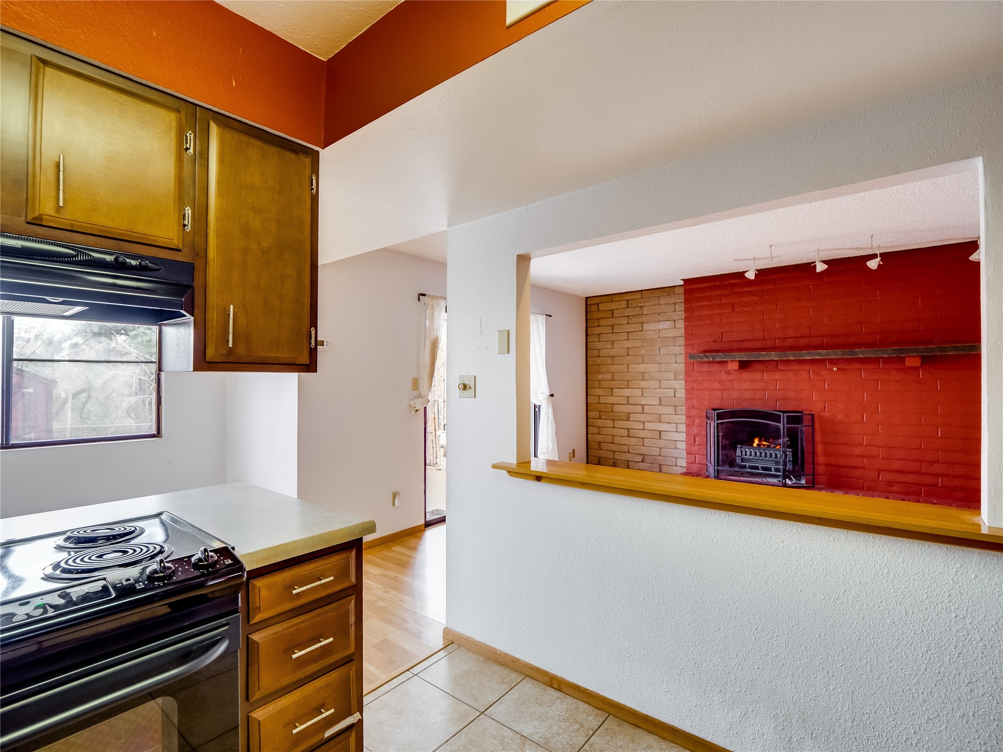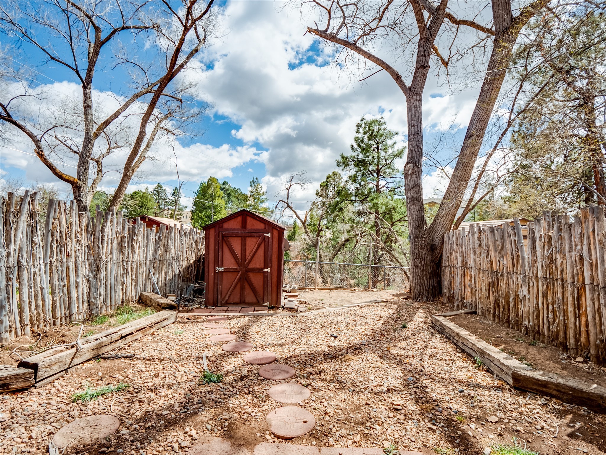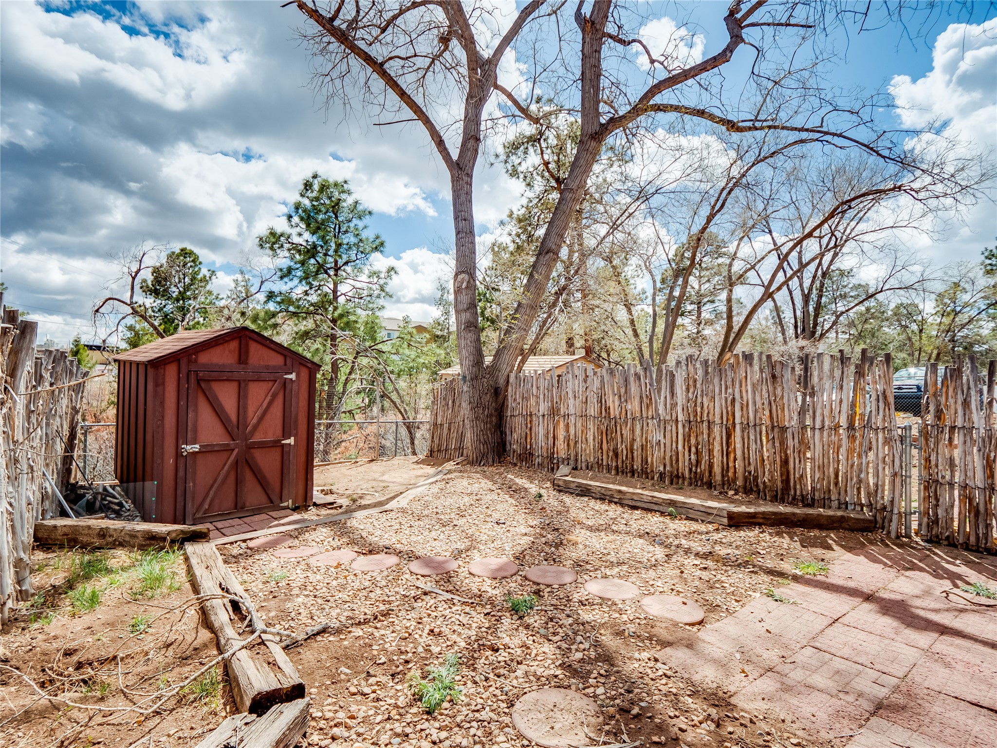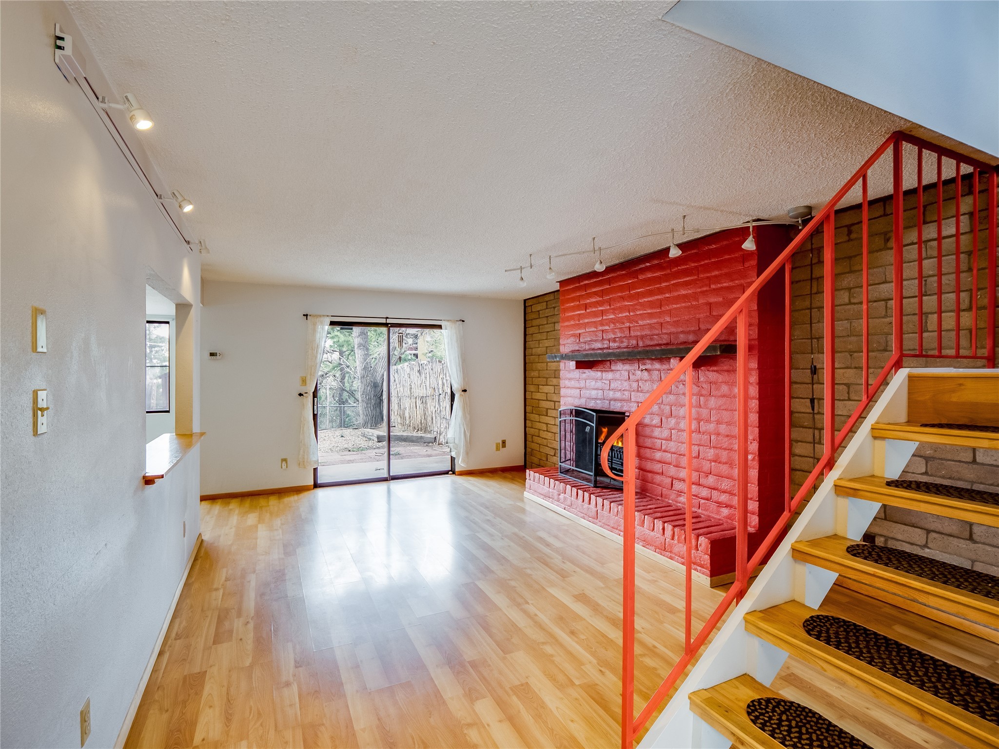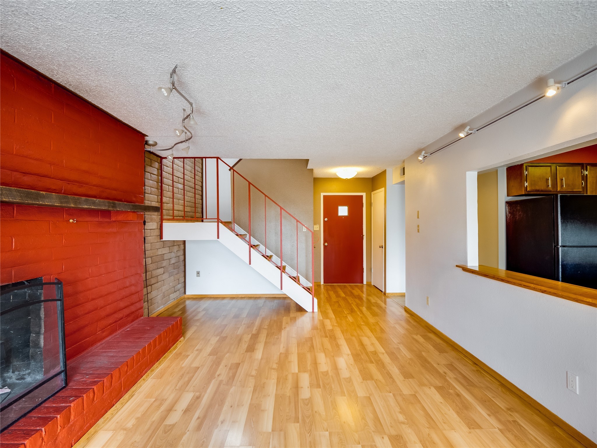 Discover character and comfort in this unique two-story condo perched above the canyon in the sought-after Eastern Area. From your designated parking spots, descend to your front entrance and step into a welcoming foyer featuring a convenient coat closet and a deep storage closet--perfect for stashing gear and everyday essentials. Light-colored laminate wood flooring flows throughout the home, creating a bright and cohesive aesthetic. The spacious living room invites you in with a stunning focal point, a vibrant painted brick fireplace accented by natural brick on either side, adding both warmth and personality. Sliding glass doors lead to a fully fenced yard with a covered patio--ideal for outdoor lounging and entertaining. There's also room for gardening and a large storage shed for all your tools and seasonal items. Just off the living area, the dining space seamlessly connects to the kitchen, promoting easy flow and conversation. The kitchen features tile flooring, rich wood cabinetry with sleek chrome hardware, light-colored countertops, and included black appliances that offer a classic contrast. Down the hallway, you'll find a well-placed powder room and a laundry space with stackable washer and dryer units that convey with the home, adding convenience to your daily routine. Upstairs, you'll find two generously sized bedrooms--nearly identical in layout--each offering plenty of natural light and ample closet space. One bedroom features a charming exposed brick wall, adding a touch of rustic texture and style. The full guest bathroom is equipped with a large single sink vanity, tiled flooring, and a tiled shower/tub combo for a timeless finish. Ideally located close to the gym, parks, shopping, and more, this condo offers the best of both nature and convenience. With its canyon-side setting, outdoor space, and thoughtful interior touches, this home is ready to welcome you. Come see it for yourself!