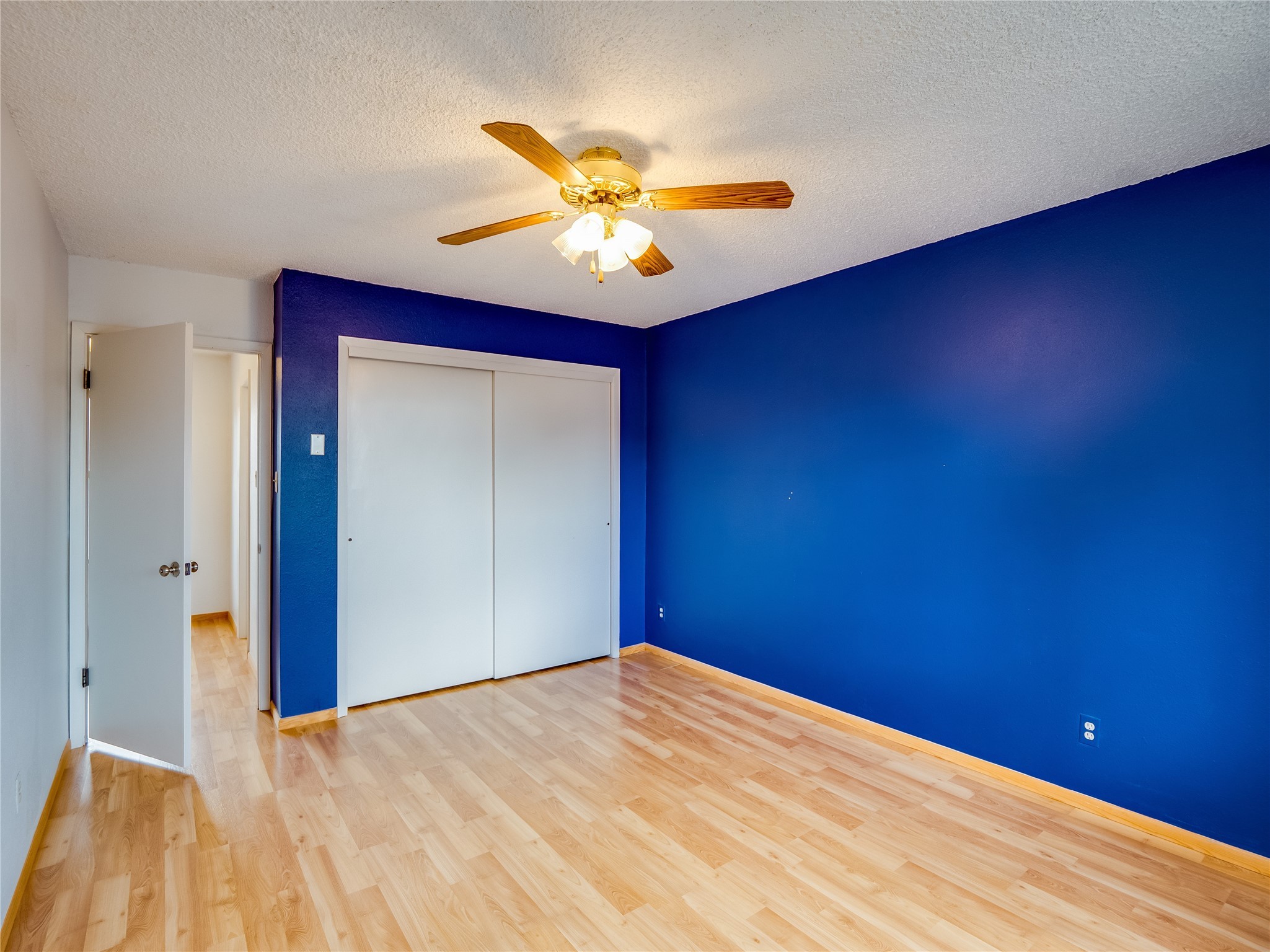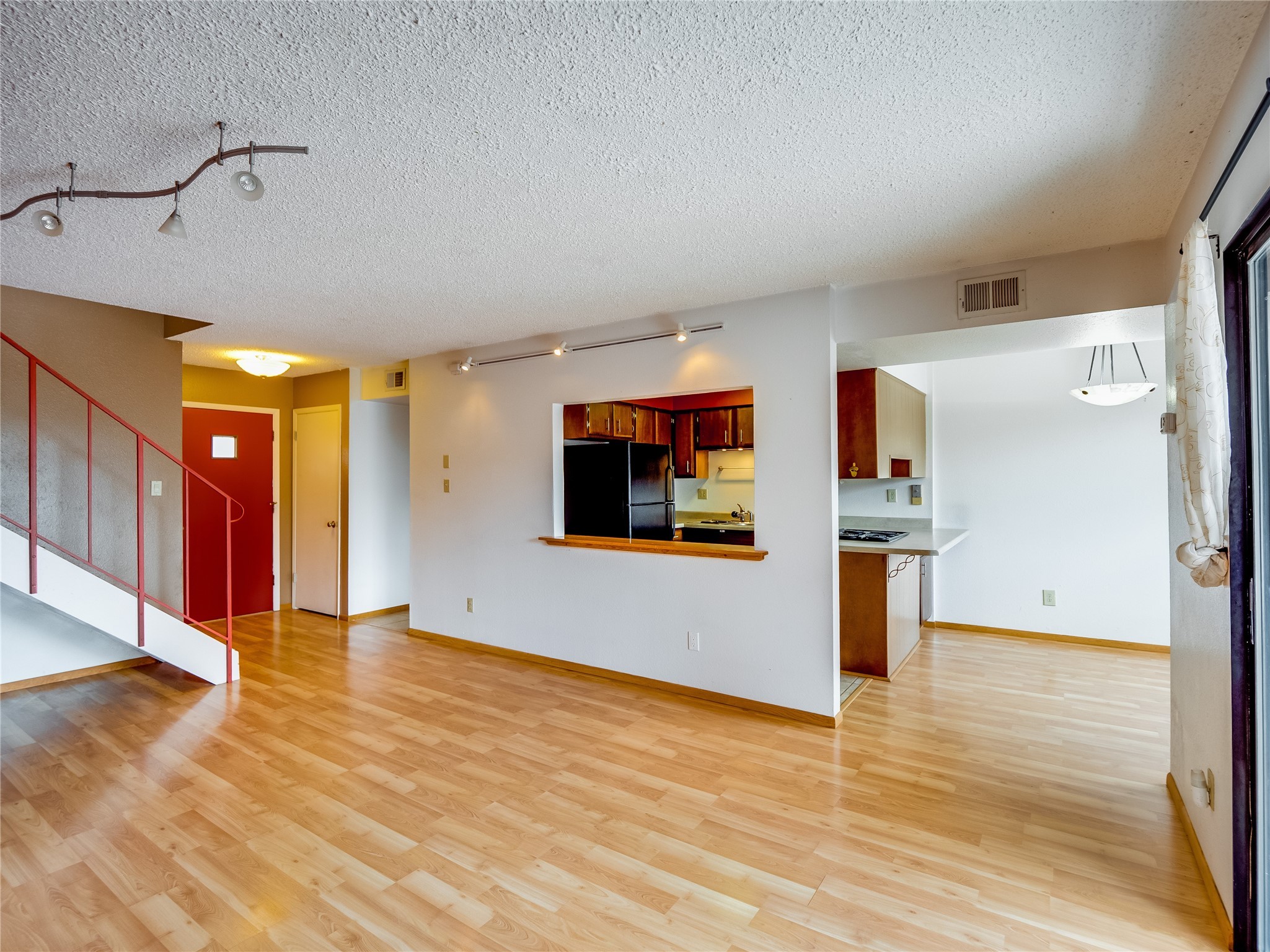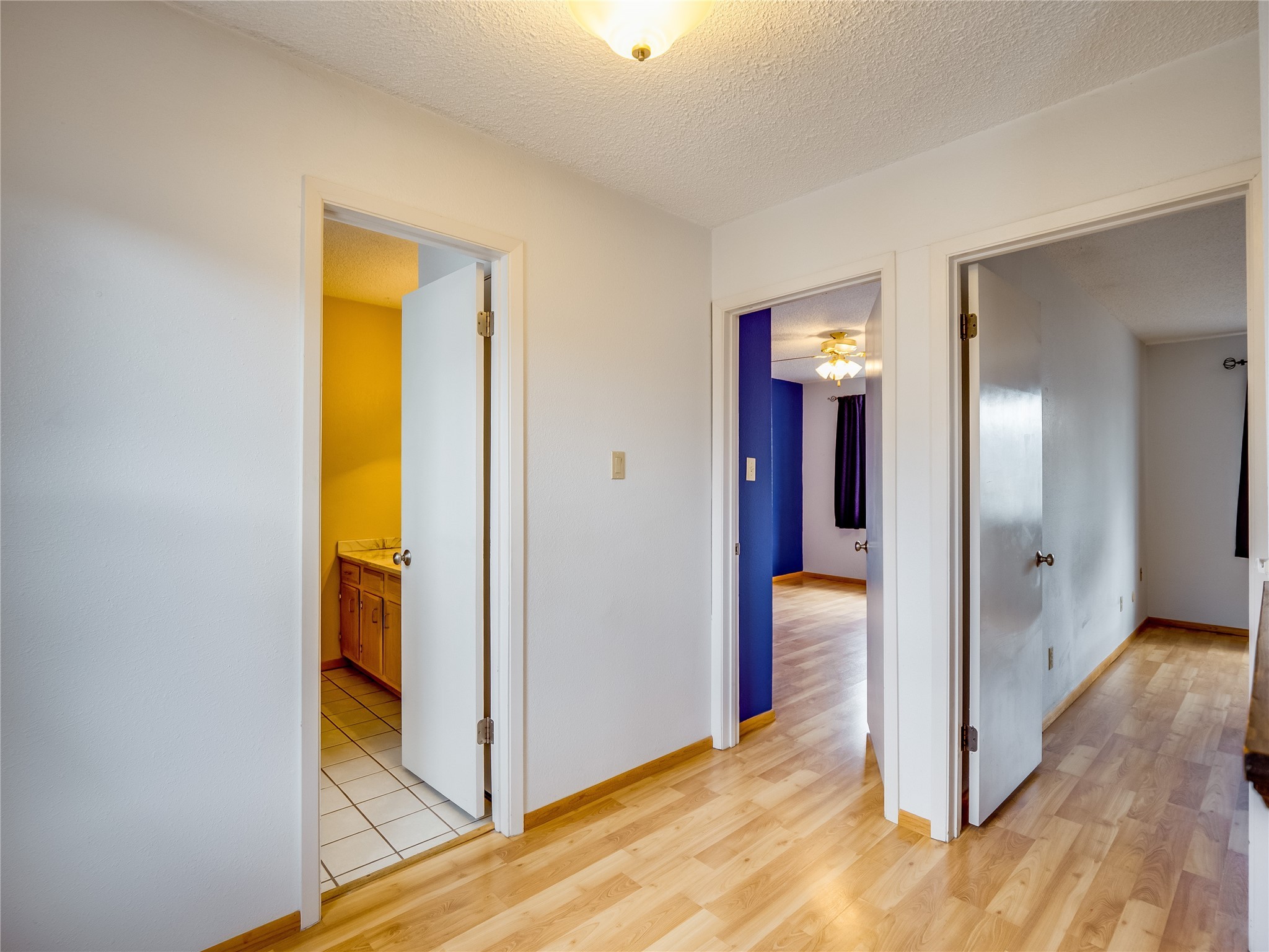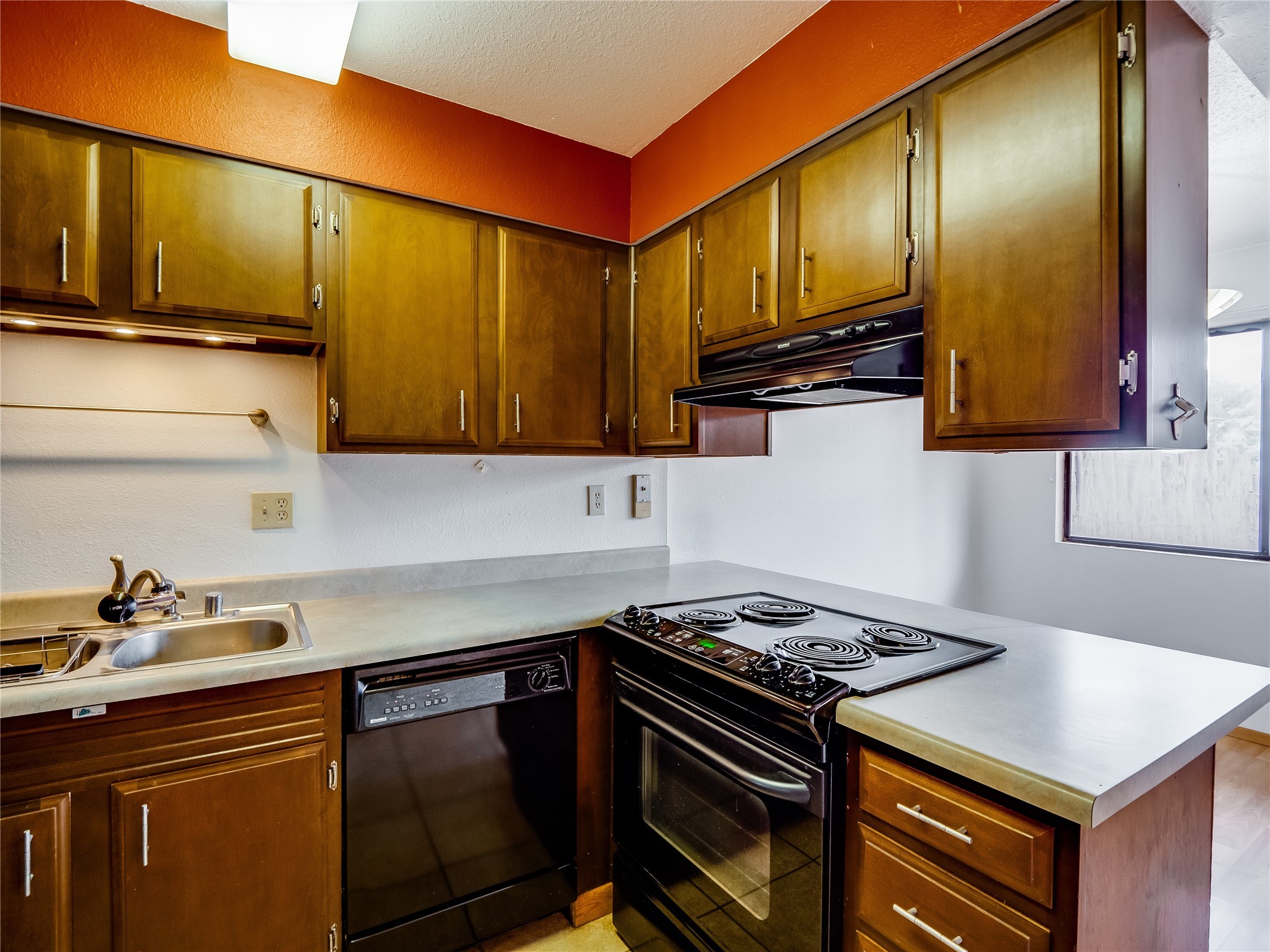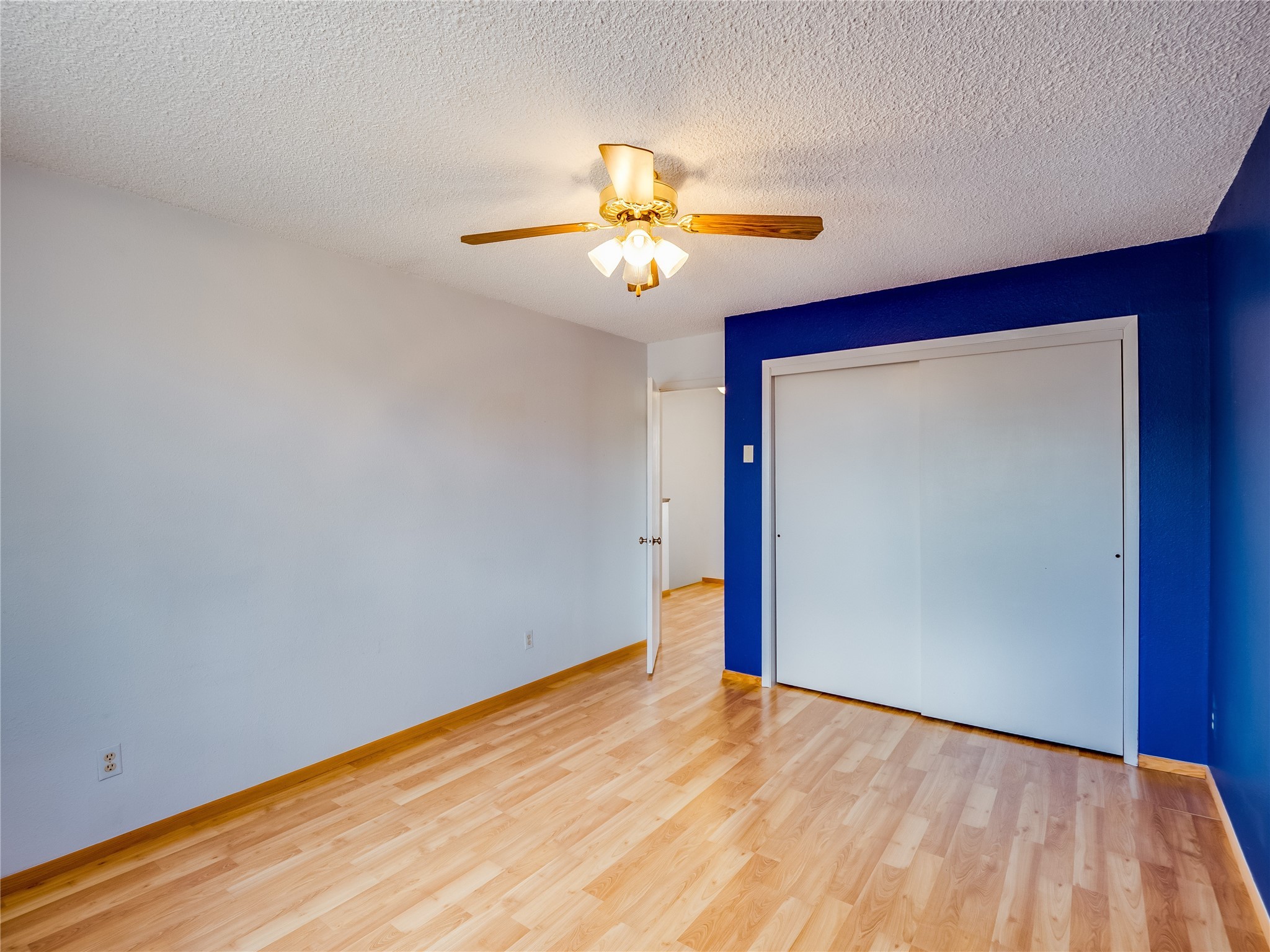 Discover character and comfort in this unique two-story condo perched above the canyon in the sought-after Eastern Area. From your designated parking spots, descend to your front entrance and step into a welcoming foyer featuring a convenient coat closet and a deep storage closet--perfect for stashing gear and everyday essentials. Light-colored laminate wood flooring flows throughout the home, creating a bright and cohesive aesthetic. The spacious living room invites you in with a stunning focal point, a vibrant painted brick fireplace accented by natural brick on either side, adding both warmth and personality. Sliding glass doors lead to a fully fenced yard with a covered patio--ideal for outdoor lounging and entertaining. There's also room for gardening and a large storage shed for all your tools and seasonal items. Just off the living area, the dining space seamlessly connects to the kitchen, promoting easy flow and conversation. The kitchen features tile flooring, rich wood cabinetry with sleek chrome hardware, light-colored countertops, and included black appliances that offer a classic contrast. Down the hallway, you'll find a well-placed powder room and a laundry space with stackable washer and dryer units that convey with the home, adding convenience to your daily routine. Upstairs, you'll find two generously sized bedrooms--nearly identical in layout--each offering plenty of natural light and ample closet space. One bedroom features a charming exposed brick wall, adding a touch of rustic texture and style. The full guest bathroom is equipped with a large single sink vanity, tiled flooring, and a tiled shower/tub combo for a timeless finish. Ideally located close to the gym, parks, shopping, and more, this condo offers the best of both nature and convenience. With its canyon-side setting, outdoor space, and thoughtful interior touches, this home is ready to welcome you. Come see it for yourself!