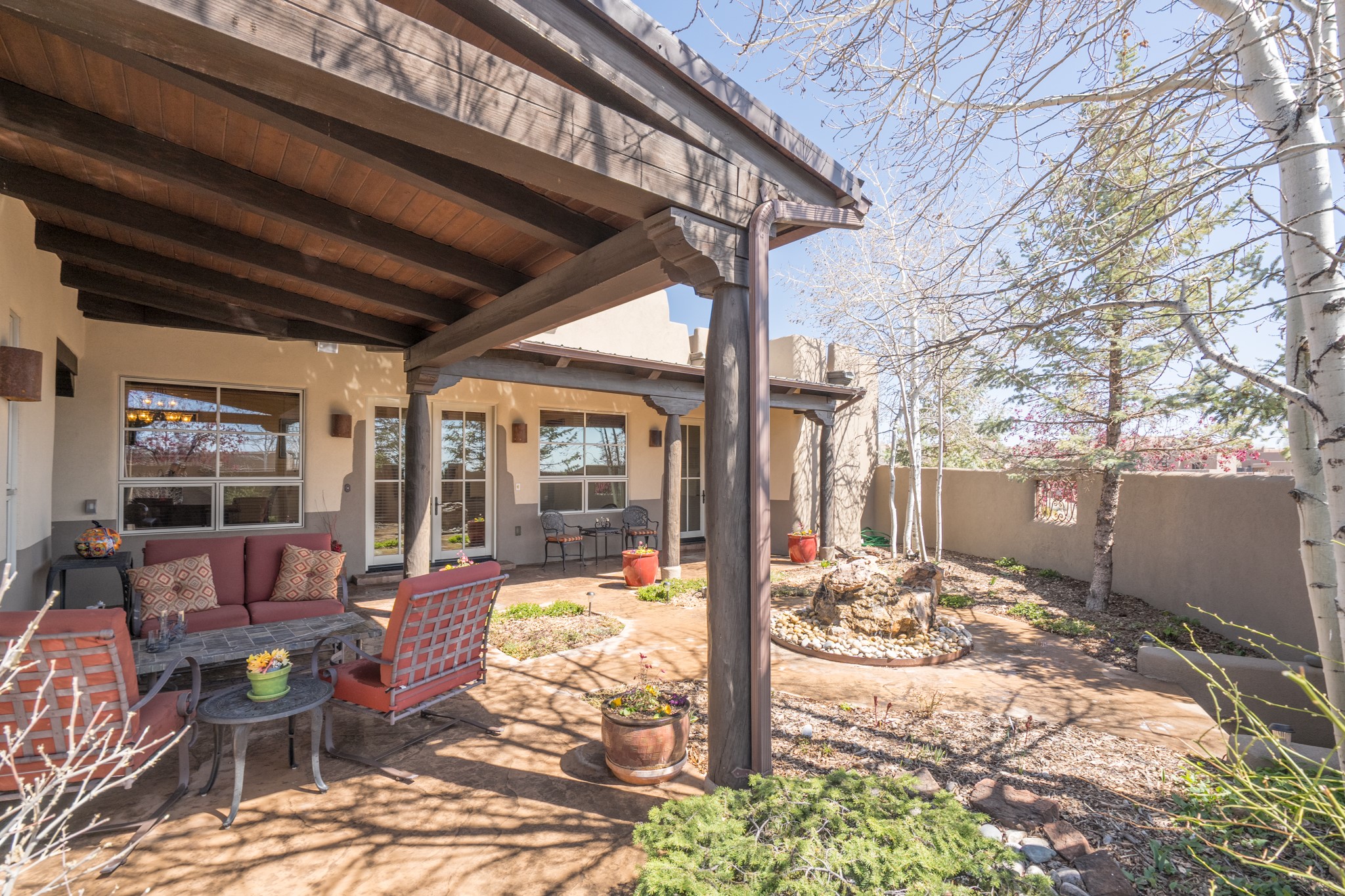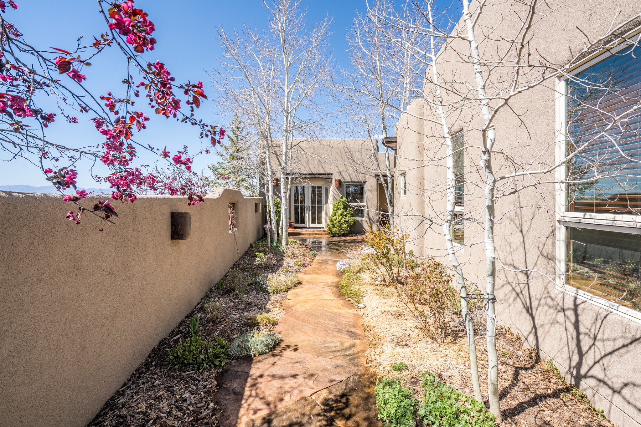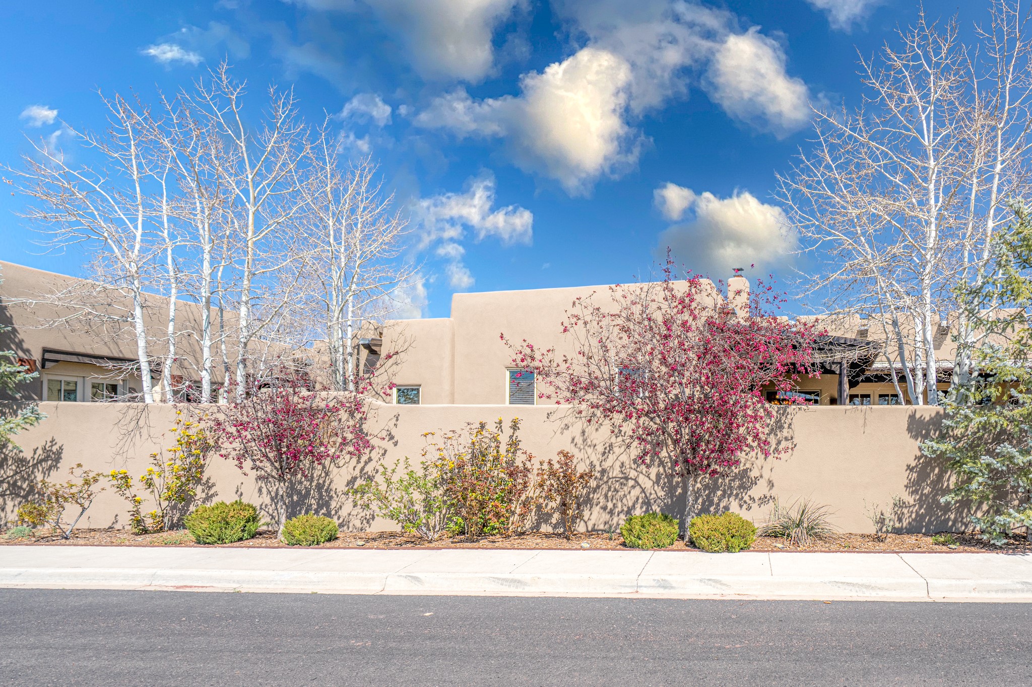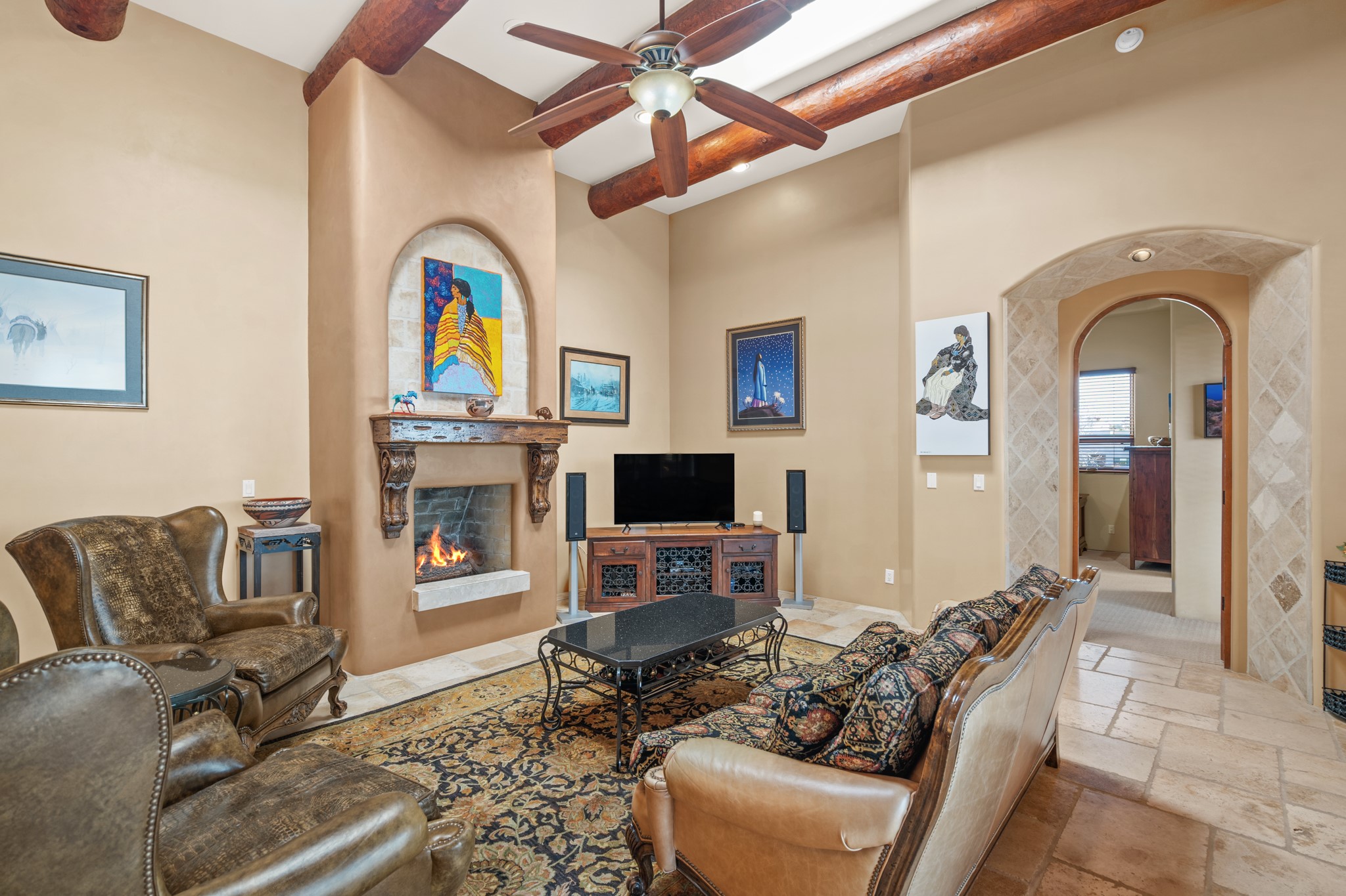 Discover this amazing single-level home with a detached guest house nestled in the serene community of Aldea. Located on a quiet cul-de-sac, this property welcomes you home with a charming enclosed courtyard and fountain, leading into a light-filled, open-concept floor plan that's perfect for both relaxing and entertaining. Enjoy breathtaking sunset views from the covered portals, or cozy up by one of the two gas fireplaces. The home features vaulted ceilings, beautiful travertine tile, and handcrafted wood doors and cabinetry imported from Mexico. The chef's kitchen is a dream, complete with a pantry, wine cooler, and plenty of space for culinary creativity. Each bedroom is ensuite with its own bathroom and walk-in closet, offering great separation and privacy. Just minutes from downtown, the neighborhood offers quiet charm, walking and hiking paths, a tennis court, a basketball court, and regular HOA-hosted events. With peaceful open spaces, wildlife, and a strong sense of community, this home truly has it all.