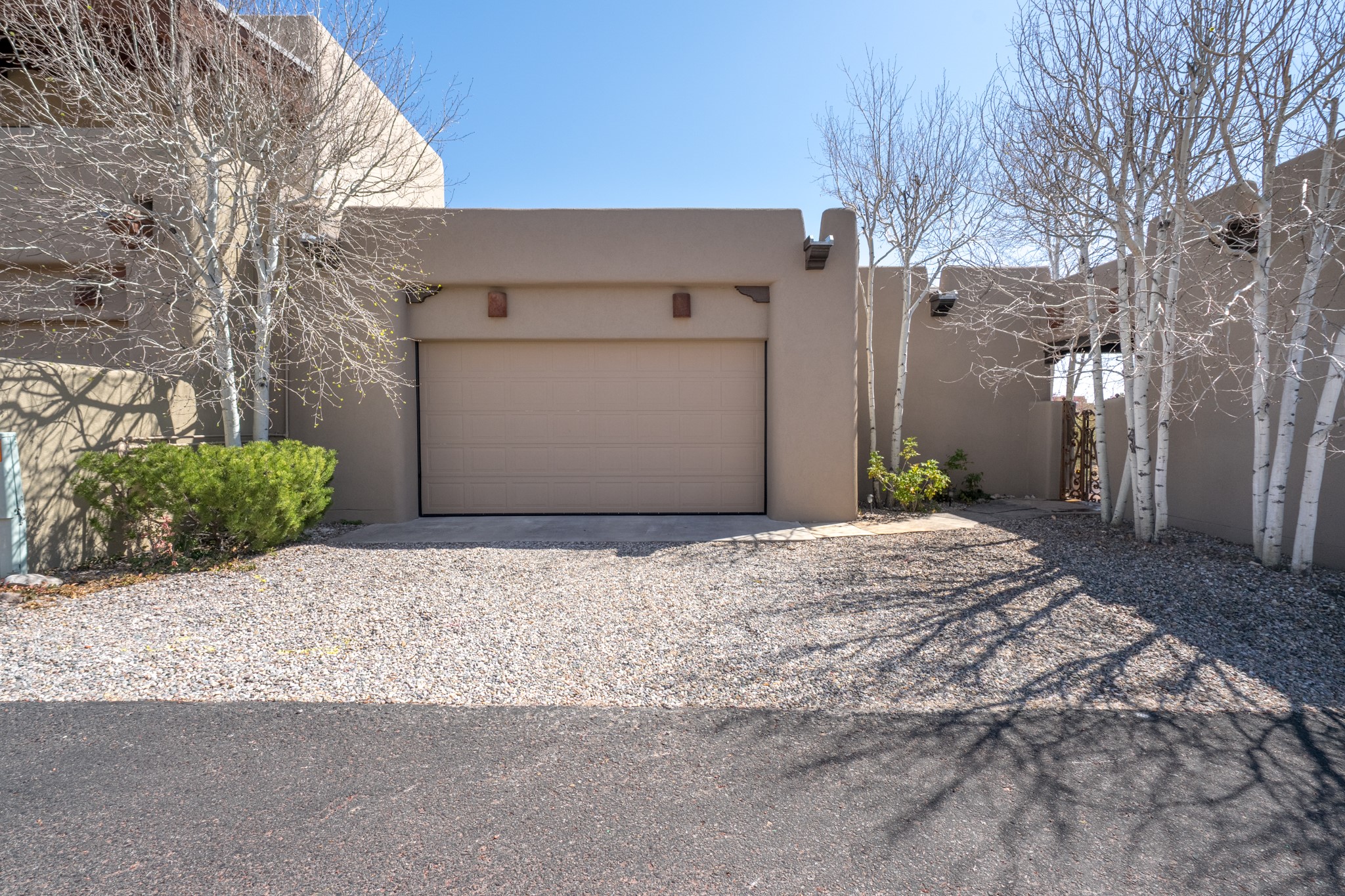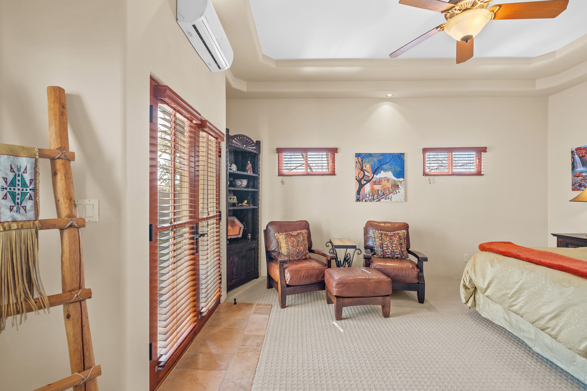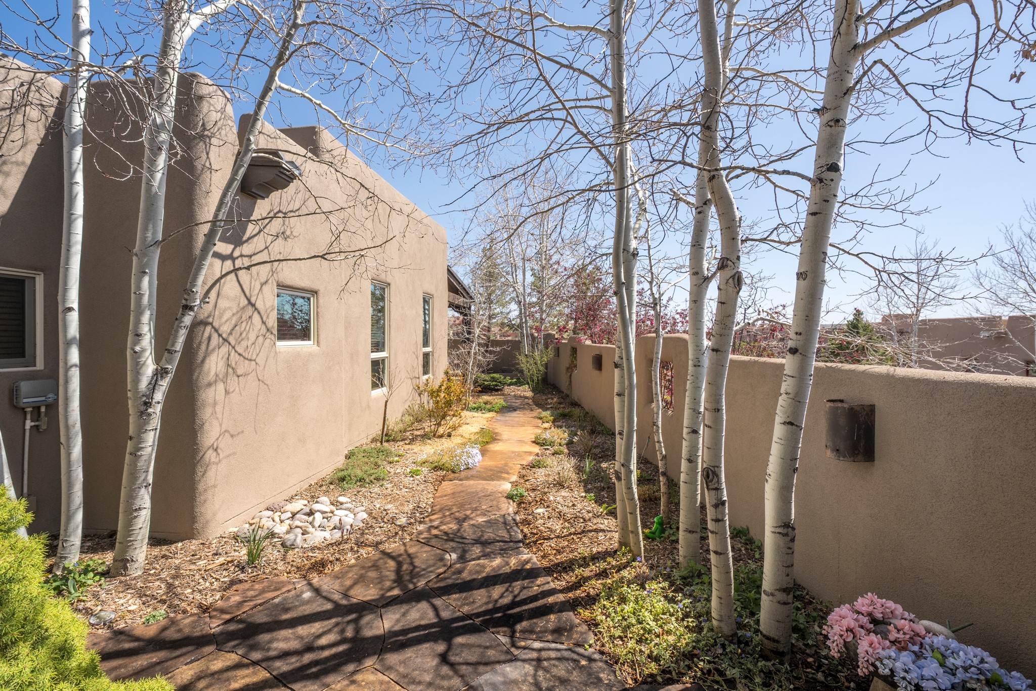 Discover this amazing single-level home with a detached guest house nestled in the serene community of Aldea. Located on a quiet cul-de-sac, this property welcomes you home with a charming enclosed courtyard and fountain, leading into a light-filled, open-concept floor plan that's perfect for both relaxing and entertaining. Enjoy breathtaking sunset views from the covered portals, or cozy up by one of the two gas fireplaces. The home features vaulted ceilings, beautiful travertine tile, and handcrafted wood doors and cabinetry imported from Mexico. The chef's kitchen is a dream, complete with a pantry, wine cooler, and plenty of space for culinary creativity. Each bedroom is ensuite with its own bathroom and walk-in closet, offering great separation and privacy. Just minutes from downtown, the neighborhood offers quiet charm, walking and hiking paths, a tennis court, a basketball court, and regular HOA-hosted events. With peaceful open spaces, wildlife, and a strong sense of community, this home truly has it all.