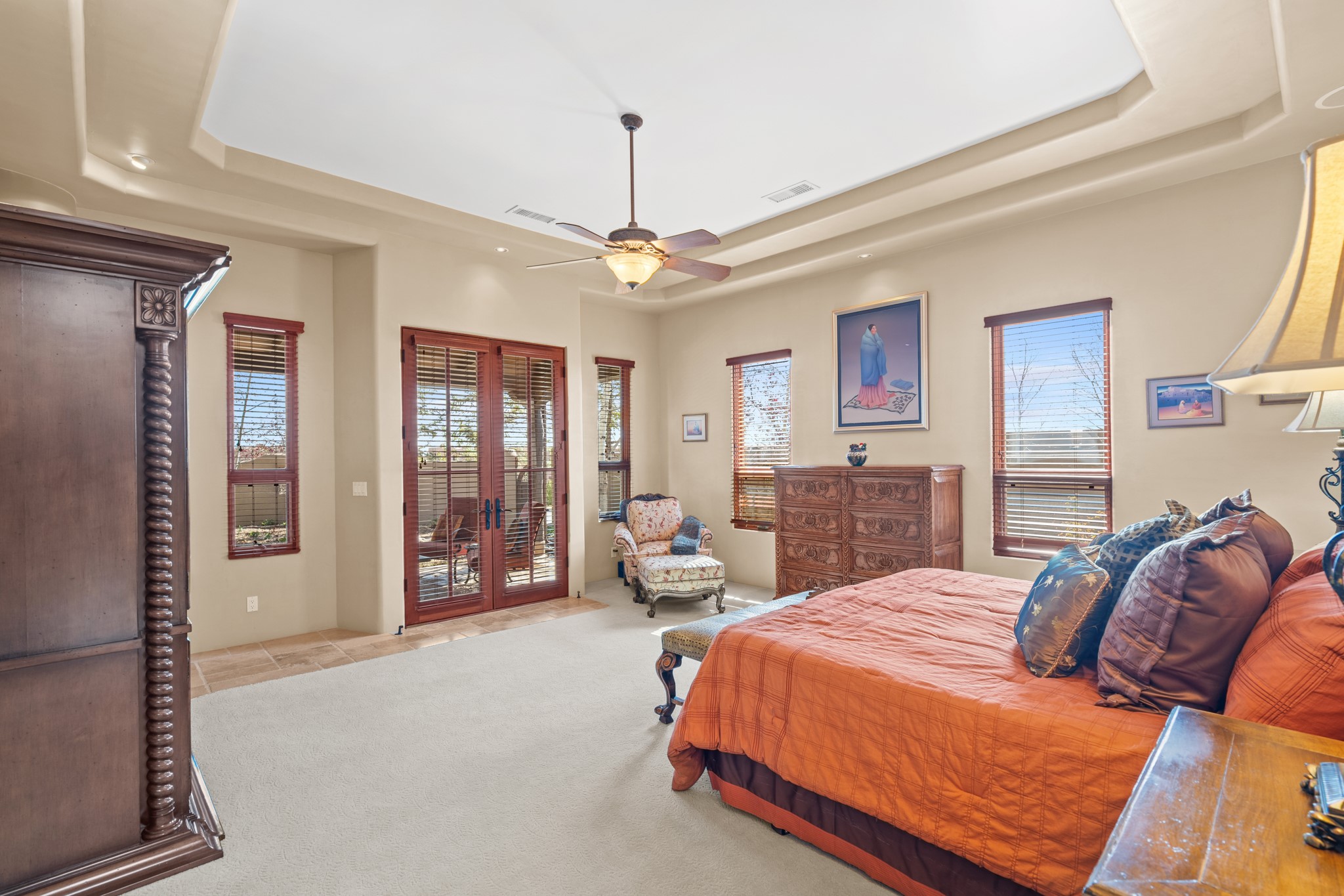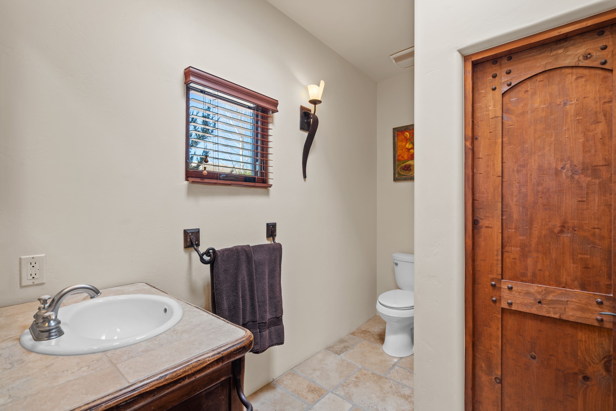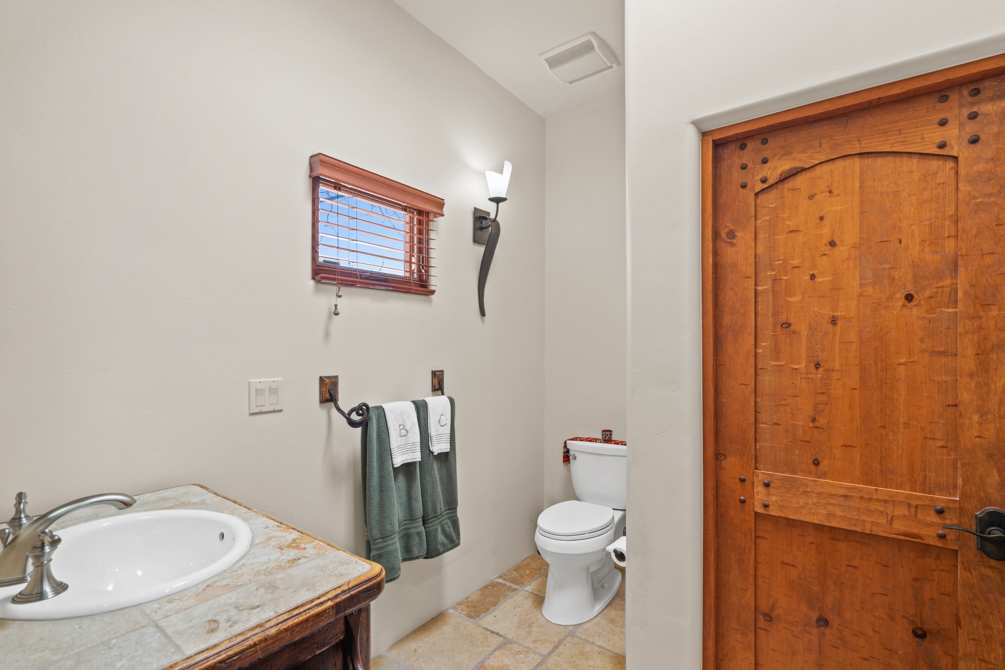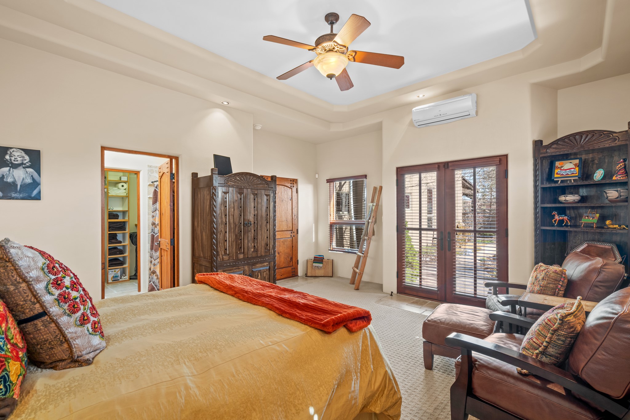 Discover this amazing single-level home with a detached guest house nestled in the serene community of Aldea. Located on a quiet cul-de-sac, this property welcomes you home with a charming enclosed courtyard and fountain, leading into a light-filled, open-concept floor plan that's perfect for both relaxing and entertaining. Enjoy breathtaking sunset views from the covered portals, or cozy up by one of the two gas fireplaces. The home features vaulted ceilings, beautiful travertine tile, and handcrafted wood doors and cabinetry imported from Mexico. The chef's kitchen is a dream, complete with a pantry, wine cooler, and plenty of space for culinary creativity. Each bedroom is ensuite with its own bathroom and walk-in closet, offering great separation and privacy. Just minutes from downtown, the neighborhood offers quiet charm, walking and hiking paths, a tennis court, a basketball court, and regular HOA-hosted events. With peaceful open spaces, wildlife, and a strong sense of community, this home truly has it all.