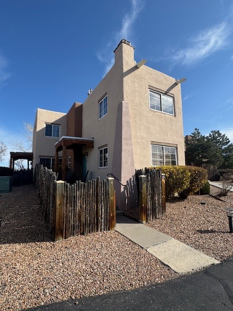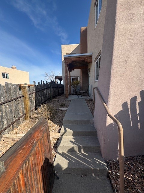 Well, no one thought this prime location in Dos Santos would hit the market. Elevated on high end of subdivision, this one bedroom/one bath town-home style condo has a friendly elongated patio that overlooks the Santa Fe sunset skies. Inside the natural sun graces the corners of your next home. This efficient kitchen has no obstacles meandering your next meal. Wood burning fireplace is neatly tucked in the living room. Upstairs houses the washer/dryer just off the bedroom and the full bath. Energy equipped with newer furnace, refrigerated air and a water heater replaced 2025! Currently parking space next to the condo. Life just got easier.