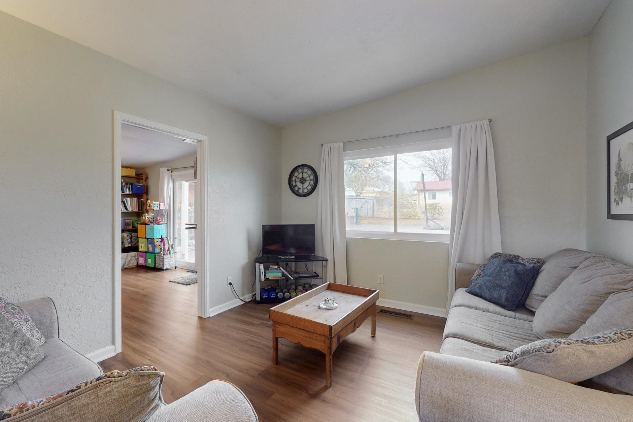 OPEN HOUSE: Saturday, April 19 10-1 Charming home with many amazing updated features and very nicely maintained. Newer roof, windows, doors, gutters and restored ducts. 2024 Cellulose blown-in insulation in ceiling space R-30 on top of current R-19. Cozy all year round with gas fireplace and refrigerated air. Two living areas make it comfortable for the whole family. Vinyl flooring throughout with carpet in the bedrooms. Separate laundry room with shelves and closet. Amazing backyard! Wonderful courtyard and patio, backyard has sprinklers and is shady in the summer, plus has a basketball court. Nice size shed. One car garage has built in shelving to make it very useable. Additional parking pad in front for car or small trailer. Location is ideal on a pleasant cul-de-sac only 2 blocks from the elementary school and walking distance to Overlook and Rover Parks. Make this your new home.