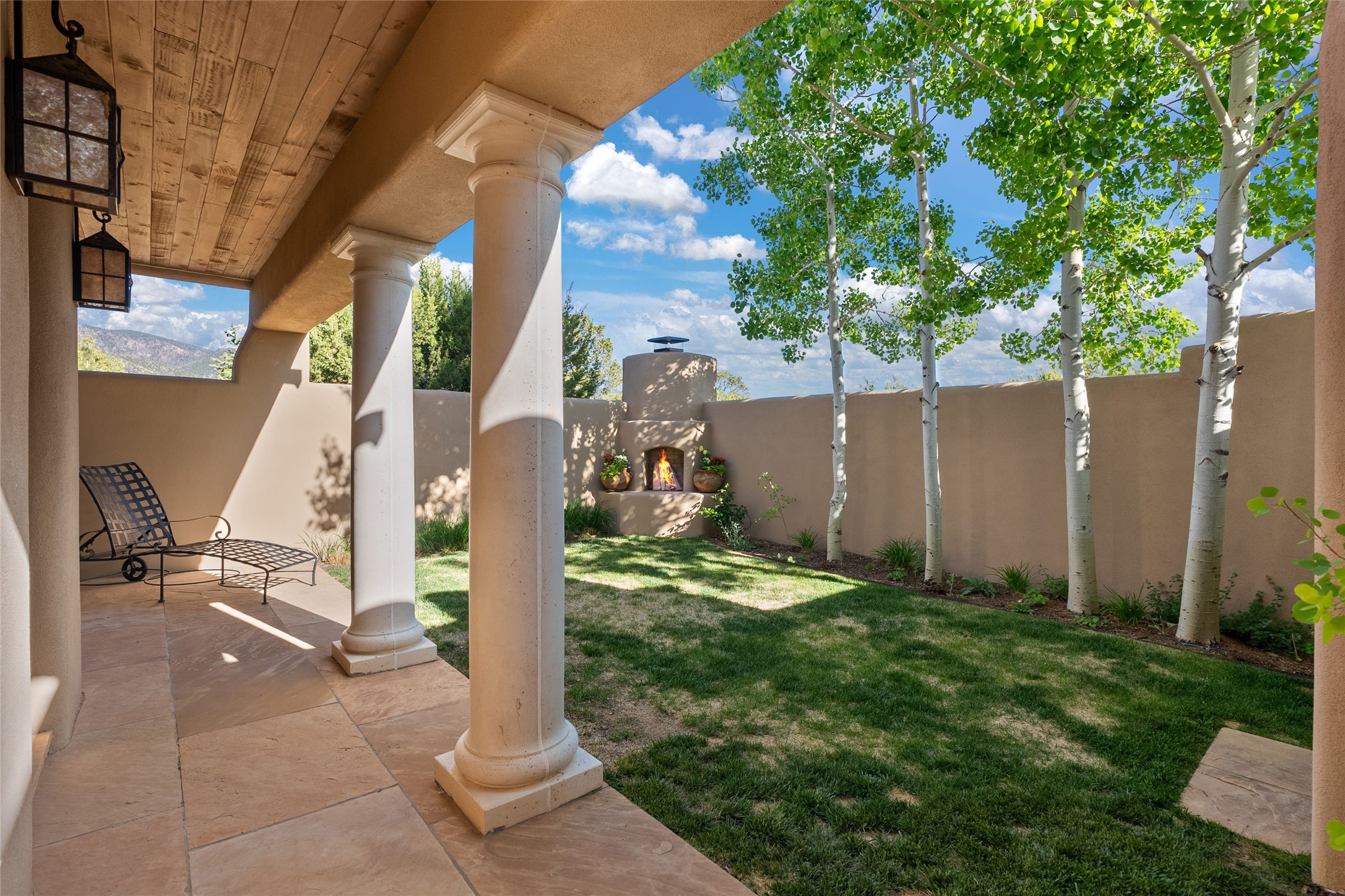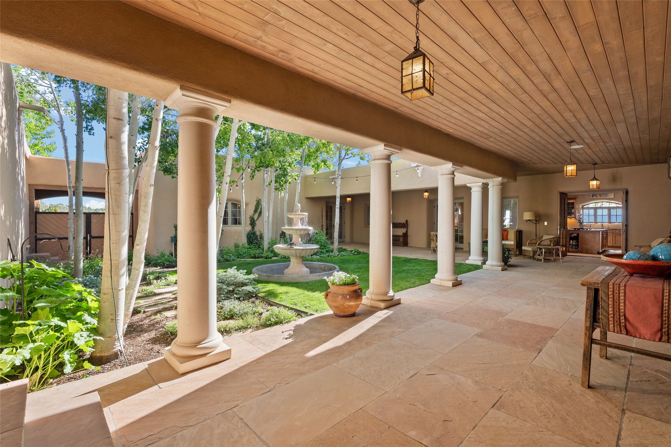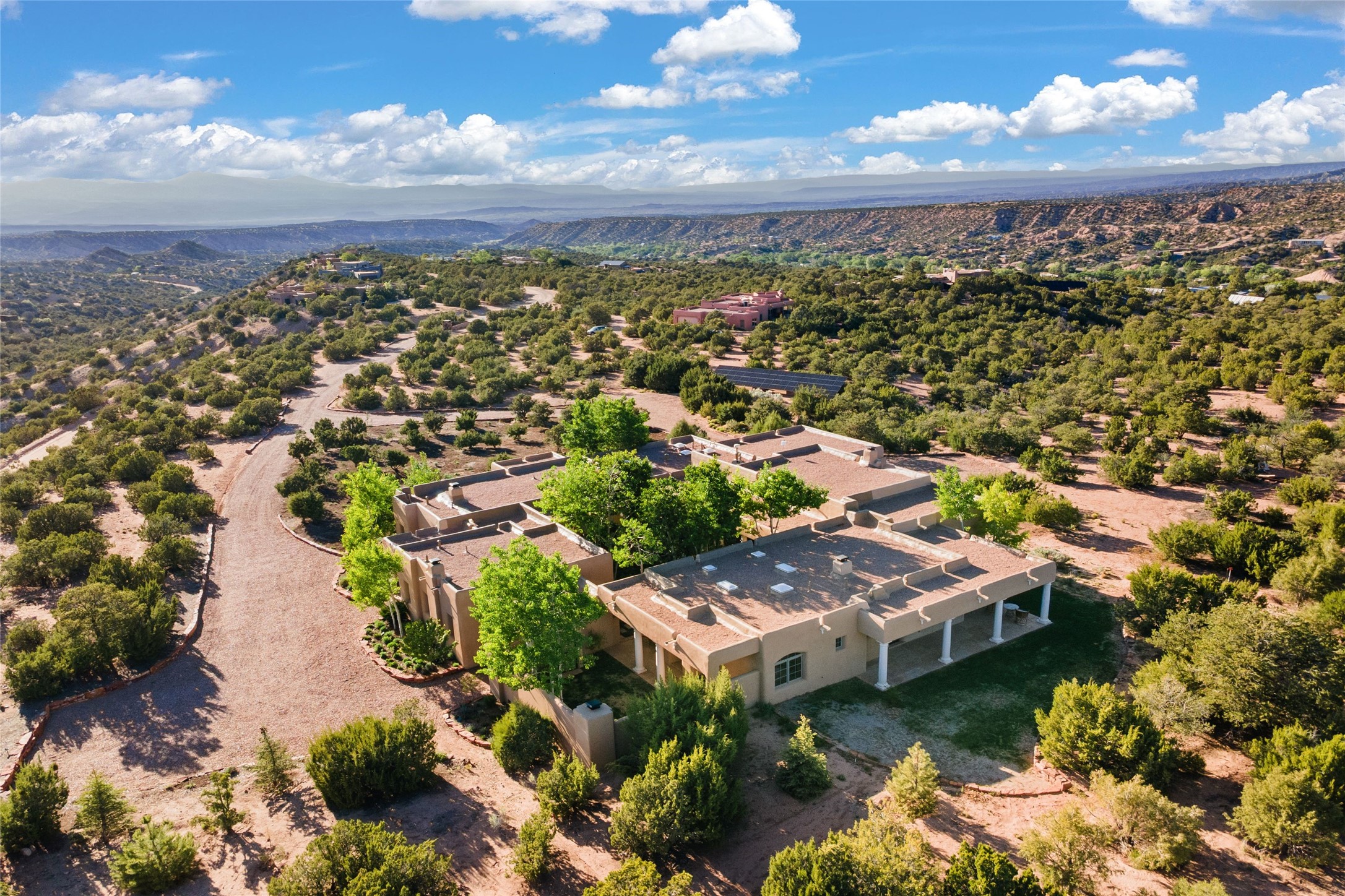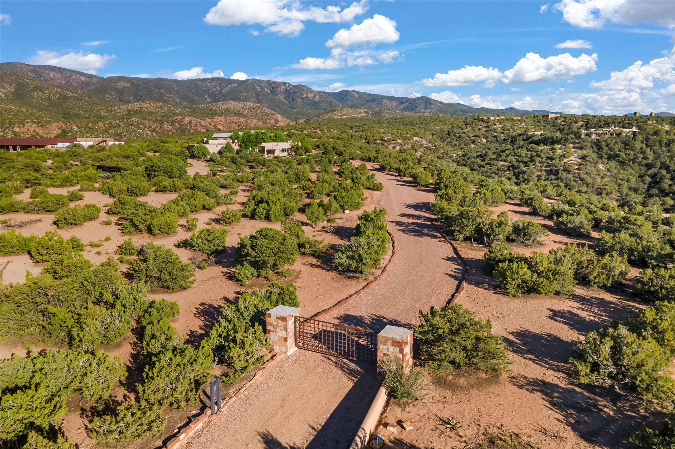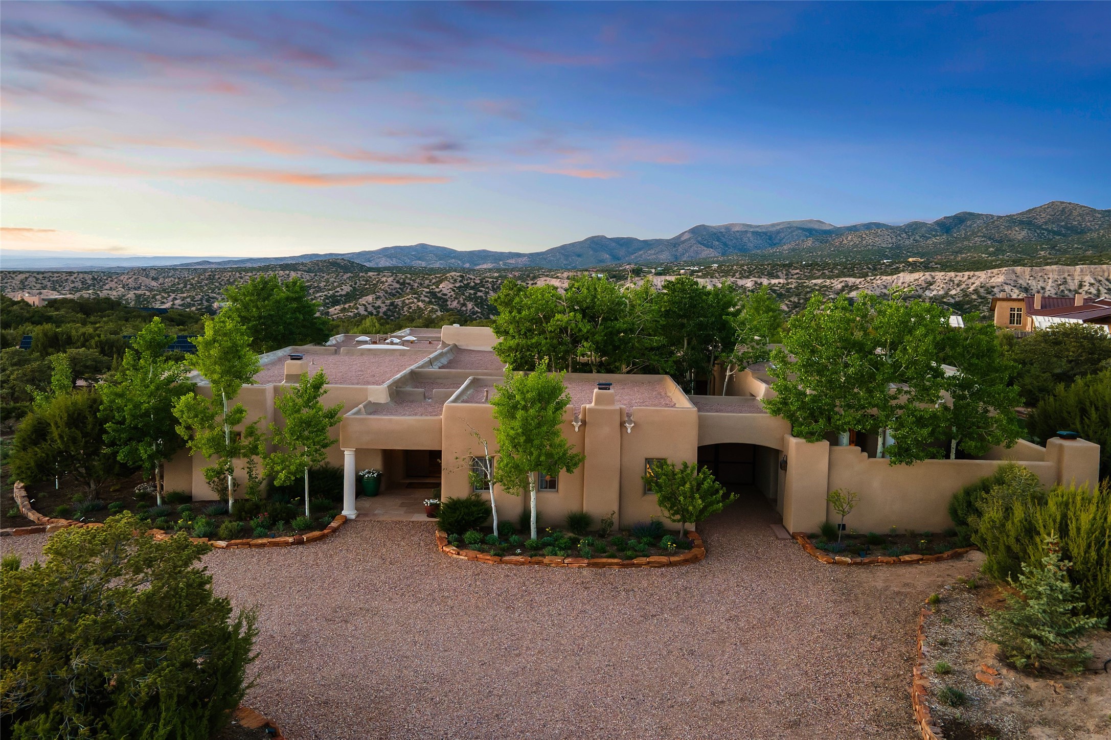 This gated 5.2-acre estate in the Sangre de Cristo foothills is only 18 minutes from the Santa Fe Plaza and offers panoramic views of the Sangres, Jemez Mountains, and Badlands. 4,752 sf living, 802 sf 2-car garage, 5 portals totaling 1,820 sf. of outdoor living space! 880 sf portal wraps the central, Aspen shaded courtyard with large stone fountain. Beds and gardens are filled with a vibrant array of flowers, grasses, and trees. West facing portal offers dramatic sunsets with lovely outdoor eating area. A private walled garden off the primary suite includes a smaller portal and outdoor fireplace. Interiors are warm, and light filled with a wide choice of cozy private and formal entertainment spaces. Rich interior finishes focus on traditional and timeless New Mexican details, beamed and wood plank ceilings, meticulously cut flagstone floors, Diamond plaster walls, 4 interior fireplaces, custom cabinetry, granite, sandstone counters and 10 skylights. Constructed with 2' to 4' thick Pumice-Crete walls, a labor-intensive, fireproof building method that beautifully replicates the look and feel of traditional triple-stacked adobe and is noted for its beauty, stability, noise reduction, and energy efficient qualities. Radiant floor heating, recently installed high efficiency AC condenser system save energy by preheating water for the propane fired boiler and converts to a chilled floor cooling system during summer months! Low profile solar panel system produces more power than the residence uses yielding monthly electric bills less than $12.00/month! A cozy family room, formal dining, kitchen, and spacious great room, all access the courtyard for spectacular entertaining or intimate gatherings. Two separated primarysuites plus office with tasteful built-ins. New improvements include stone planters and driveway borders, native trees, grasses, shrubs and flowers, new landscape irrigation system, new roof with extended warranty,new skylights, refreshed exterior stucco.