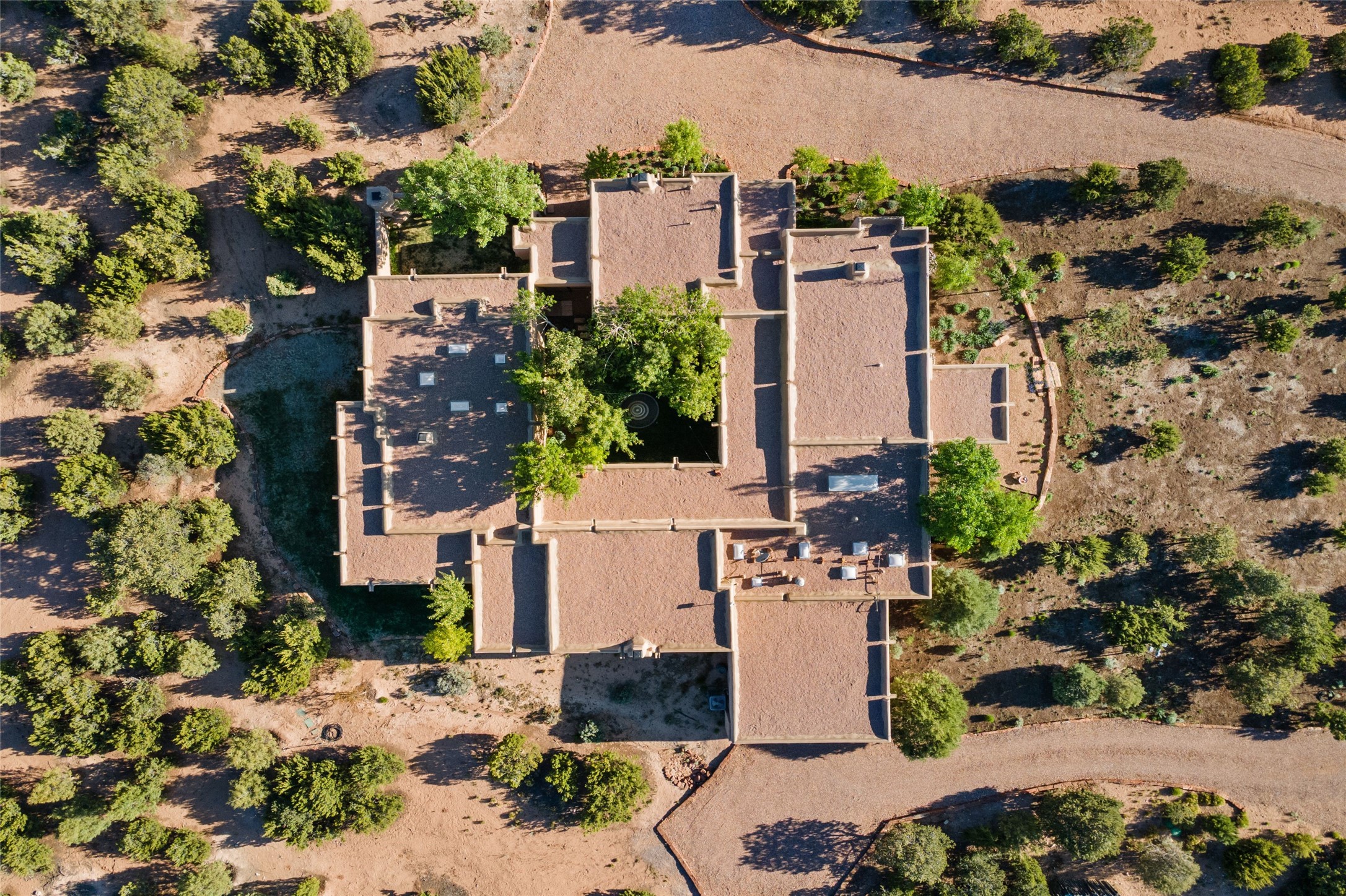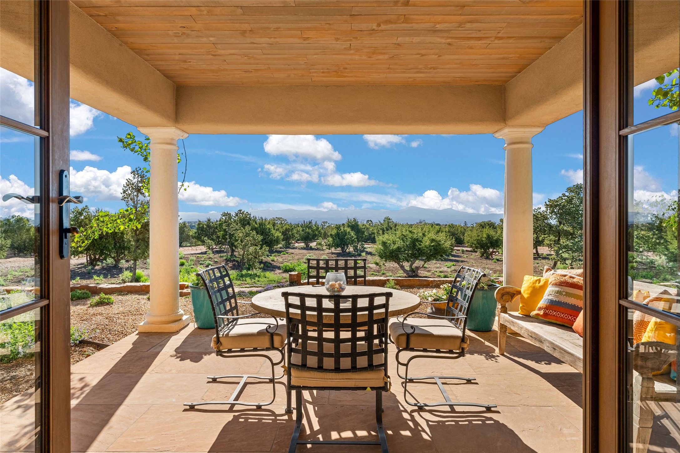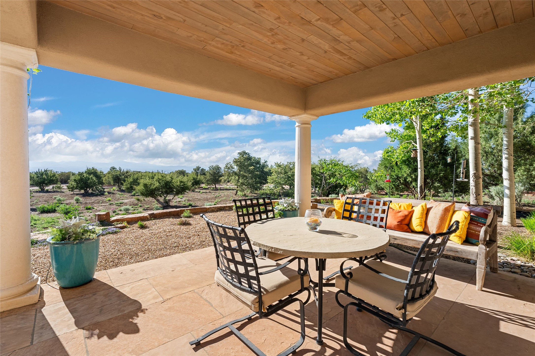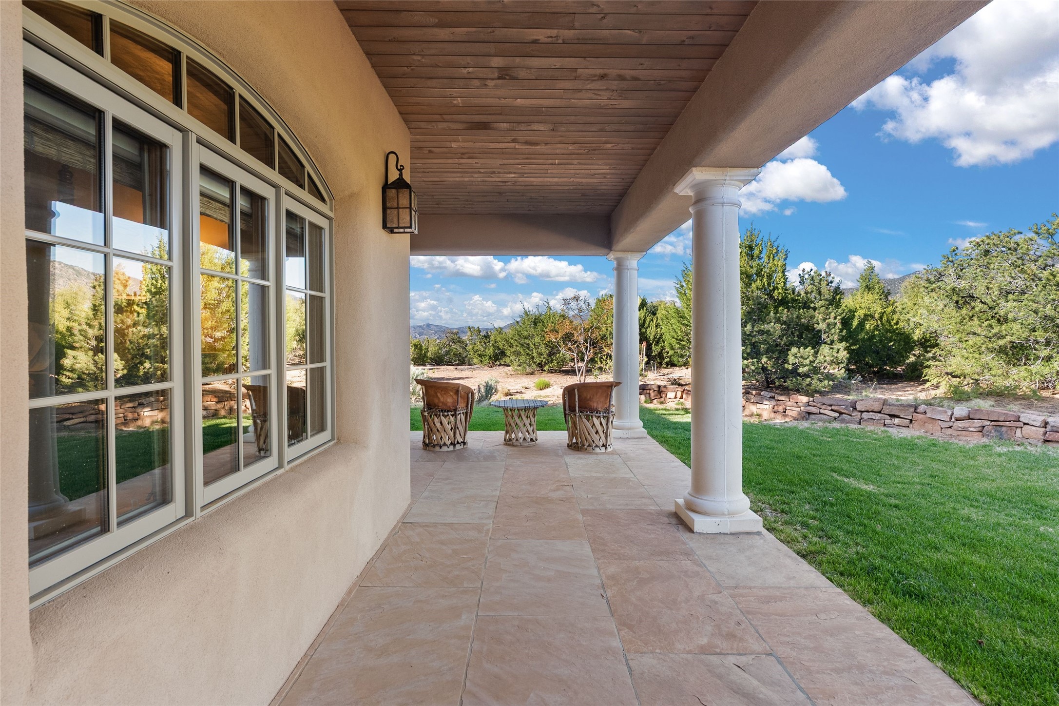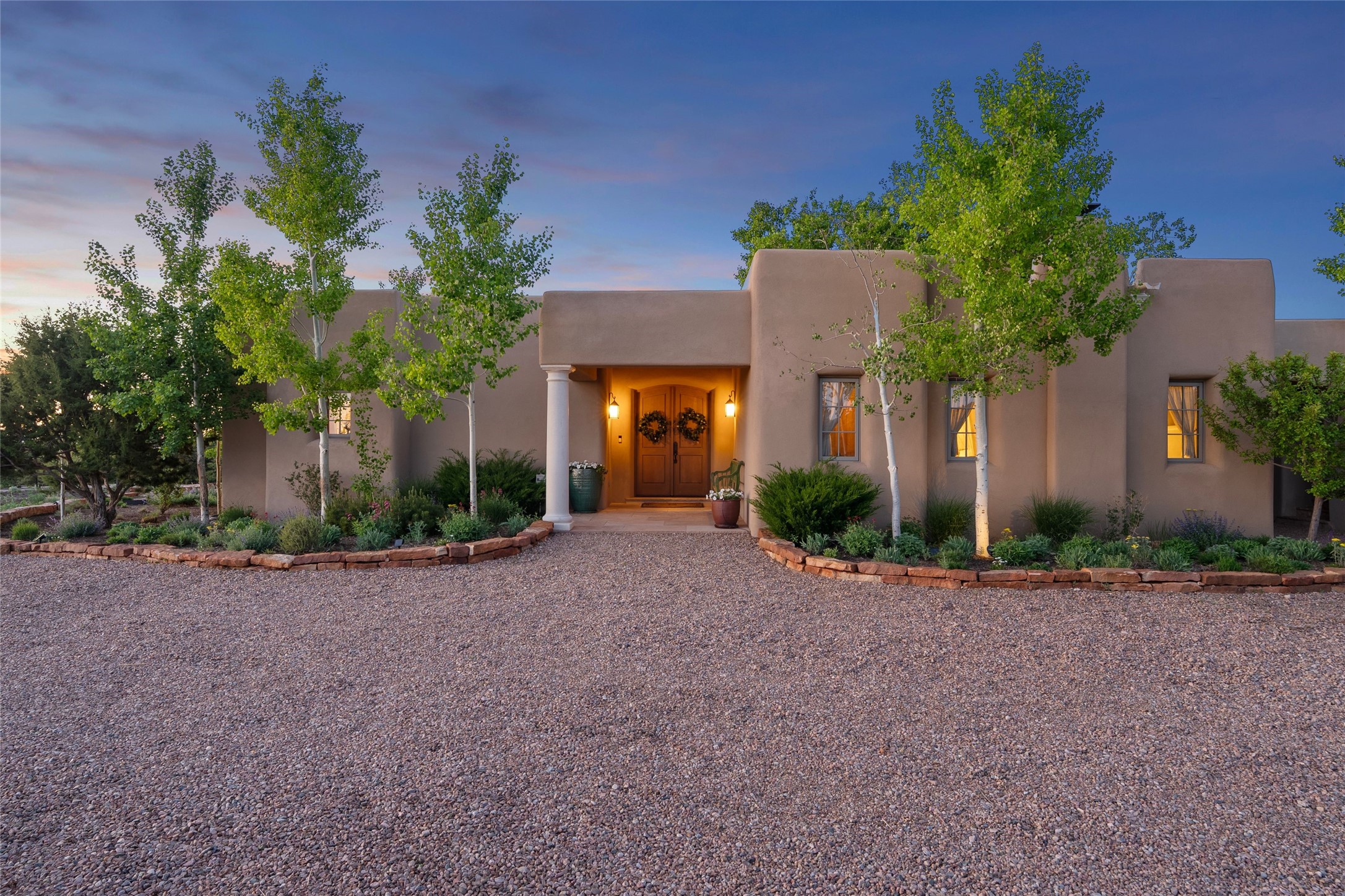 This gated 5.2-acre estate in the Sangre de Cristo foothills is only 18 minutes from the Santa Fe Plaza and offers panoramic views of the Sangres, Jemez Mountains, and Badlands. 4,752 sf living, 802 sf 2-car garage, 5 portals totaling 1,820 sf. of outdoor living space! 880 sf portal wraps the central, Aspen shaded courtyard with large stone fountain. Beds and gardens are filled with a vibrant array of flowers, grasses, and trees. West facing portal offers dramatic sunsets with lovely outdoor eating area. A private walled garden off the primary suite includes a smaller portal and outdoor fireplace. Interiors are warm, and light filled with a wide choice of cozy private and formal entertainment spaces. Rich interior finishes focus on traditional and timeless New Mexican details, beamed and wood plank ceilings, meticulously cut flagstone floors, Diamond plaster walls, 4 interior fireplaces, custom cabinetry, granite, sandstone counters and 10 skylights. Constructed with 2' to 4' thick Pumice-Crete walls, a labor-intensive, fireproof building method that beautifully replicates the look and feel of traditional triple-stacked adobe and is noted for its beauty, stability, noise reduction, and energy efficient qualities. Radiant floor heating, recently installed high efficiency AC condenser system save energy by preheating water for the propane fired boiler and converts to a chilled floor cooling system during summer months! Low profile solar panel system produces more power than the residence uses yielding monthly electric bills less than $12.00/month! A cozy family room, formal dining, kitchen, and spacious great room, all access the courtyard for spectacular entertaining or intimate gatherings. Two separated primarysuites plus office with tasteful built-ins. New improvements include stone planters and driveway borders, native trees, grasses, shrubs and flowers, new landscape irrigation system, new roof with extended warranty,new skylights, refreshed exterior stucco.