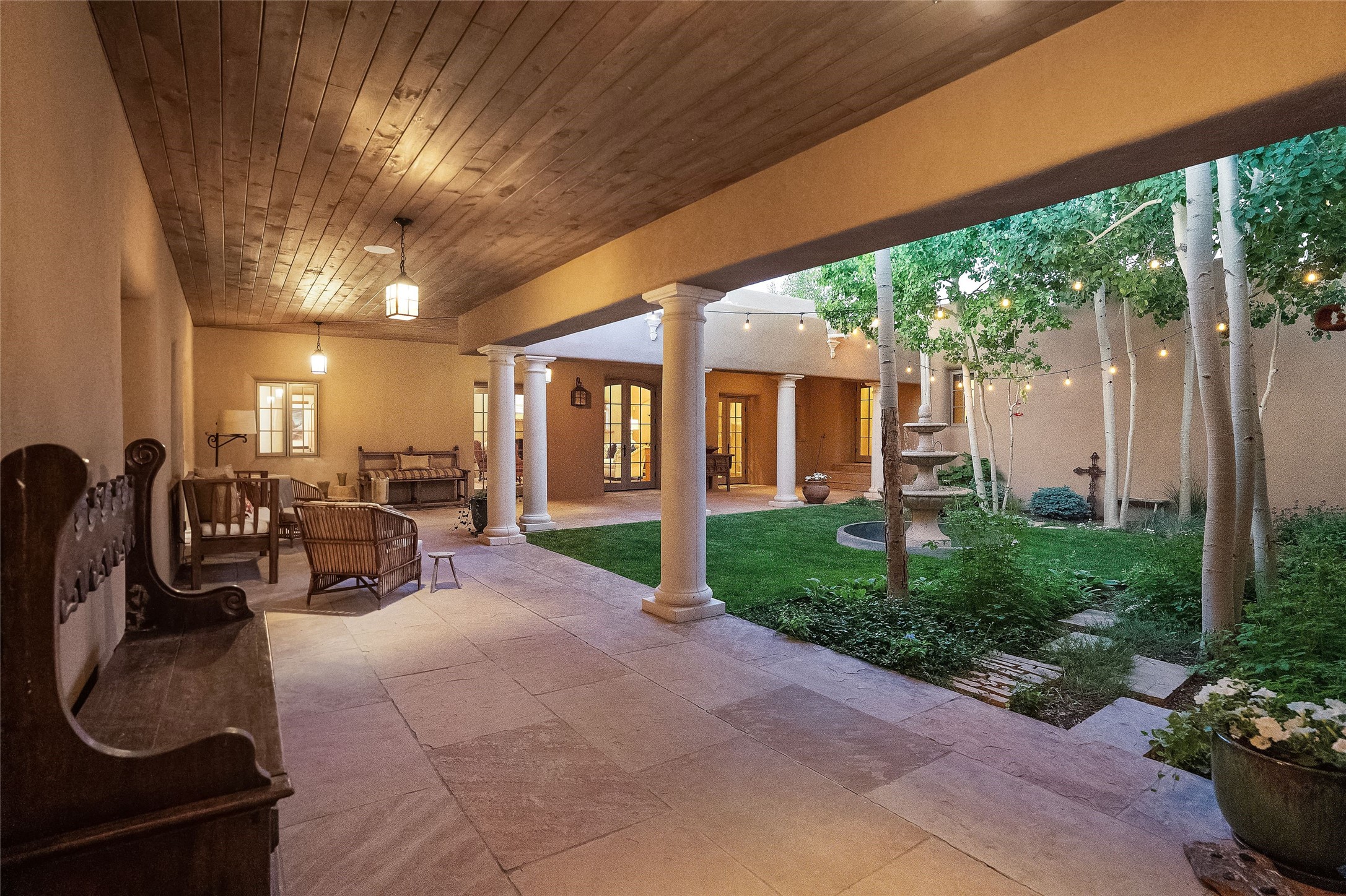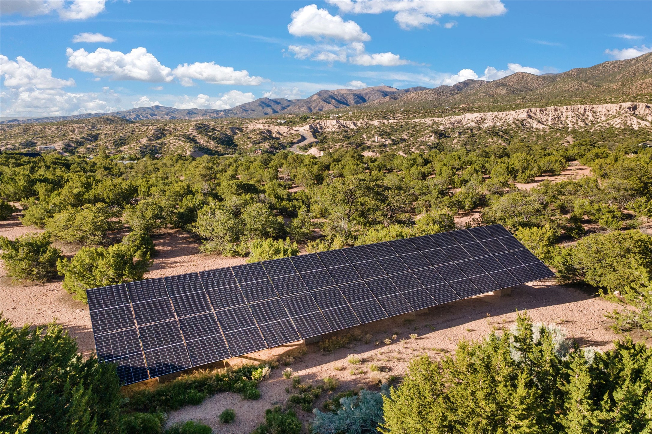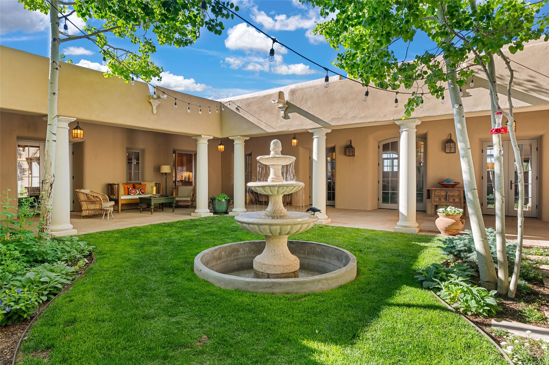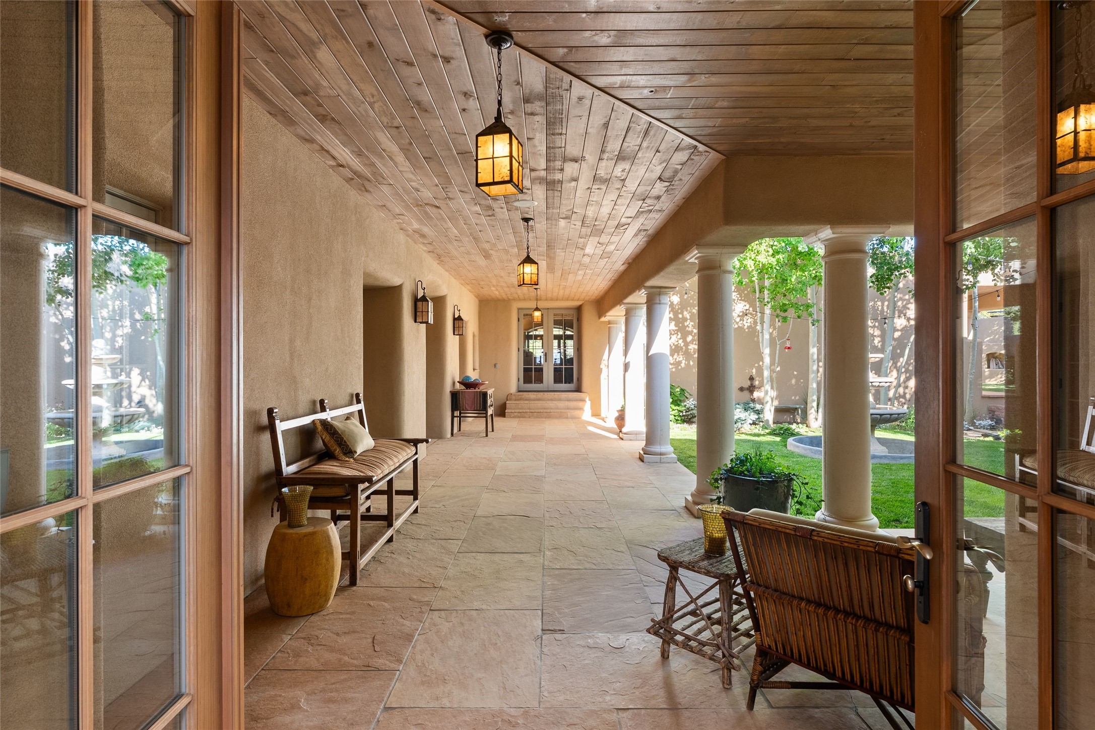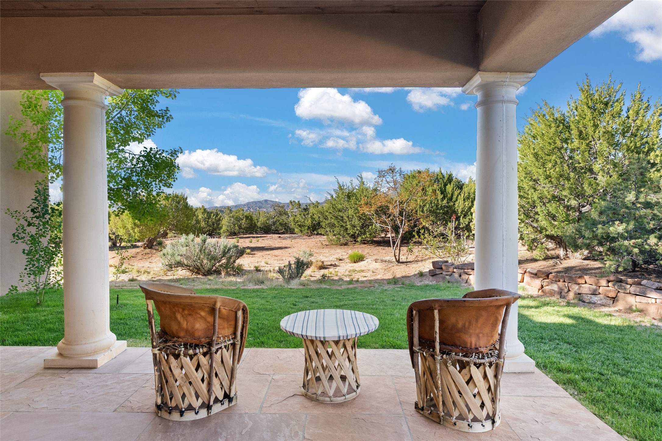 This gated 5.2-acre estate in the Sangre de Cristo foothills is only 18 minutes from the Santa Fe Plaza and offers panoramic views of the Sangres, Jemez Mountains, and Badlands. 4,752 sf living, 802 sf 2-car garage, 5 portals totaling 1,820 sf. of outdoor living space! 880 sf portal wraps the central, Aspen shaded courtyard with large stone fountain. Beds and gardens are filled with a vibrant array of flowers, grasses, and trees. West facing portal offers dramatic sunsets with lovely outdoor eating area. A private walled garden off the primary suite includes a smaller portal and outdoor fireplace. Interiors are warm, and light filled with a wide choice of cozy private and formal entertainment spaces. Rich interior finishes focus on traditional and timeless New Mexican details, beamed and wood plank ceilings, meticulously cut flagstone floors, Diamond plaster walls, 4 interior fireplaces, custom cabinetry, granite, sandstone counters and 10 skylights. Constructed with 2' to 4' thick Pumice-Crete walls, a labor-intensive, fireproof building method that beautifully replicates the look and feel of traditional triple-stacked adobe and is noted for its beauty, stability, noise reduction, and energy efficient qualities. Radiant floor heating, recently installed high efficiency AC condenser system save energy by preheating water for the propane fired boiler and converts to a chilled floor cooling system during summer months! Low profile solar panel system produces more power than the residence uses yielding monthly electric bills less than $12.00/month! A cozy family room, formal dining, kitchen, and spacious great room, all access the courtyard for spectacular entertaining or intimate gatherings. Two separated primarysuites plus office with tasteful built-ins. New improvements include stone planters and driveway borders, native trees, grasses, shrubs and flowers, new landscape irrigation system, new roof with extended warranty,new skylights, refreshed exterior stucco.