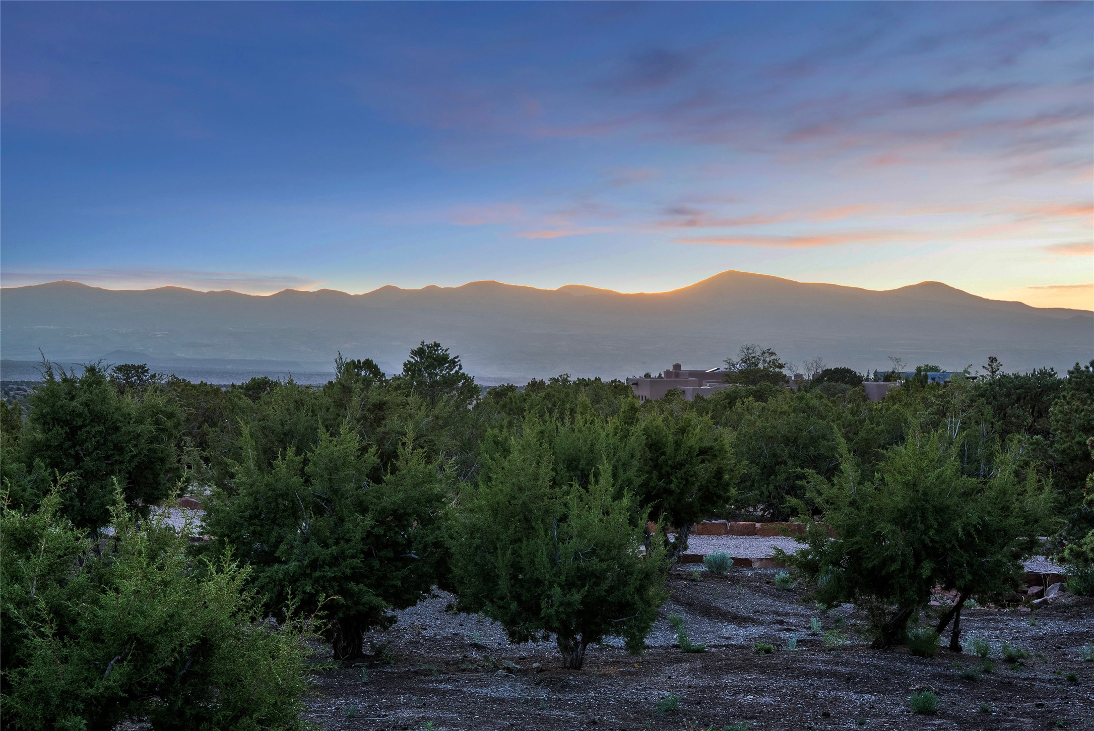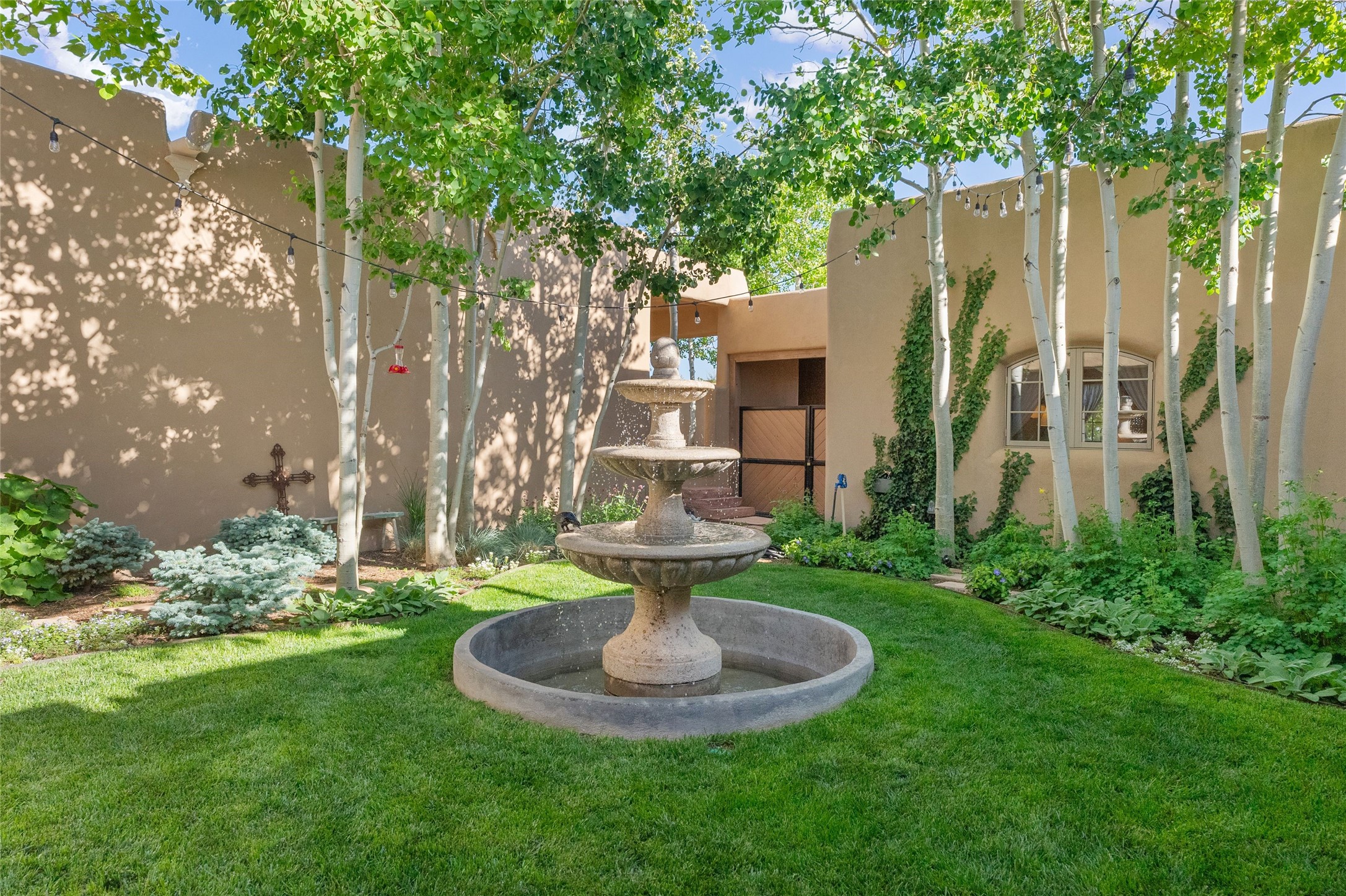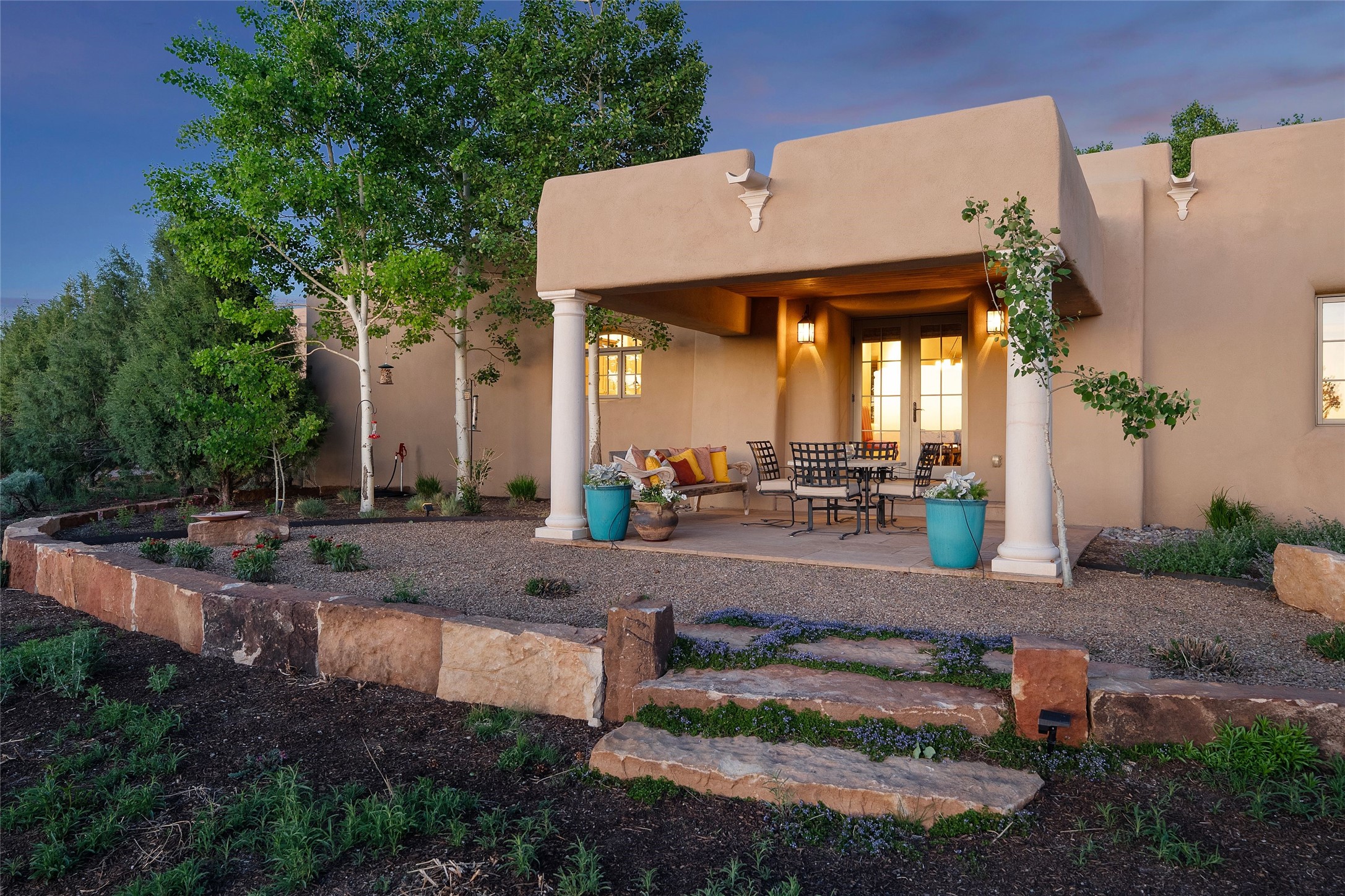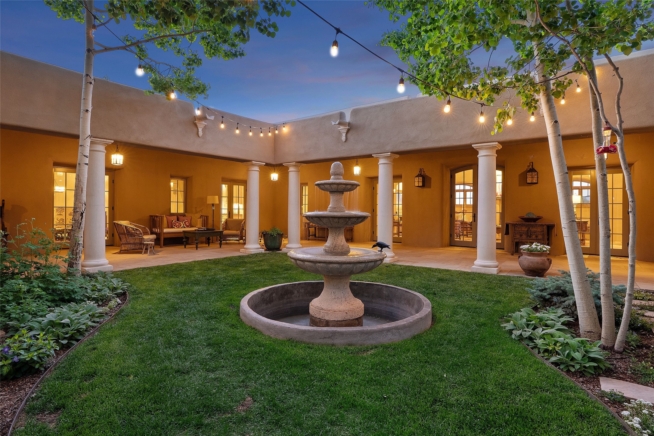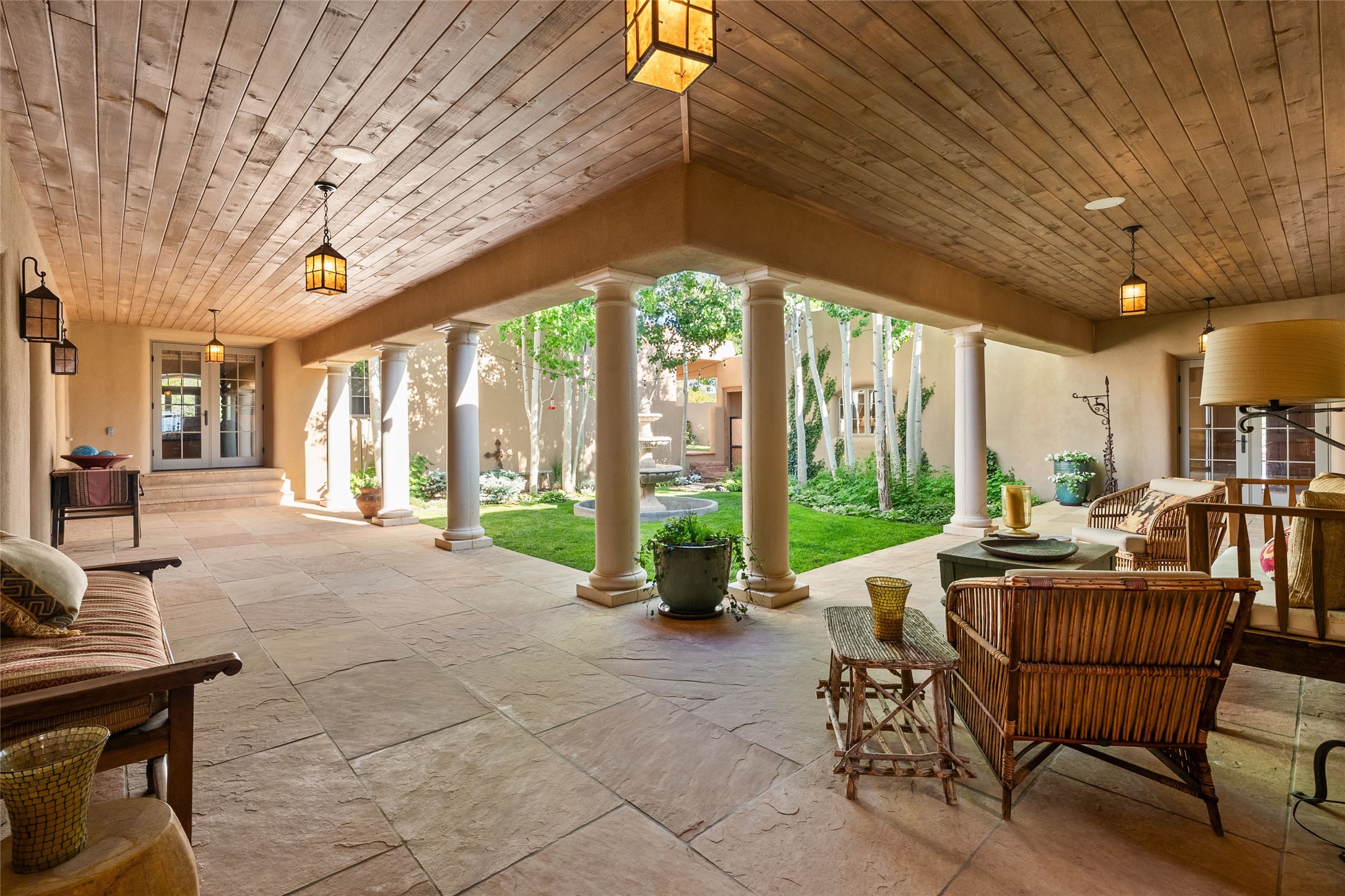 This gated 5.2-acre estate in the Sangre de Cristo foothills is only 18 minutes from the Santa Fe Plaza and offers panoramic views of the Sangres, Jemez Mountains, and Badlands. 4,752 sf living, 802 sf 2-car garage, 5 portals totaling 1,820 sf. of outdoor living space! 880 sf portal wraps the central, Aspen shaded courtyard with large stone fountain. Beds and gardens are filled with a vibrant array of flowers, grasses, and trees. West facing portal offers dramatic sunsets with lovely outdoor eating area. A private walled garden off the primary suite includes a smaller portal and outdoor fireplace. Interiors are warm, and light filled with a wide choice of cozy private and formal entertainment spaces. Rich interior finishes focus on traditional and timeless New Mexican details, beamed and wood plank ceilings, meticulously cut flagstone floors, Diamond plaster walls, 4 interior fireplaces, custom cabinetry, granite, sandstone counters and 10 skylights. Constructed with 2' to 4' thick Pumice-Crete walls, a labor-intensive, fireproof building method that beautifully replicates the look and feel of traditional triple-stacked adobe and is noted for its beauty, stability, noise reduction, and energy efficient qualities. Radiant floor heating, recently installed high efficiency AC condenser system save energy by preheating water for the propane fired boiler and converts to a chilled floor cooling system during summer months! Low profile solar panel system produces more power than the residence uses yielding monthly electric bills less than $12.00/month! A cozy family room, formal dining, kitchen, and spacious great room, all access the courtyard for spectacular entertaining or intimate gatherings. Two separated primarysuites plus office with tasteful built-ins. New improvements include stone planters and driveway borders, native trees, grasses, shrubs and flowers, new landscape irrigation system, new roof with extended warranty,new skylights, refreshed exterior stucco.