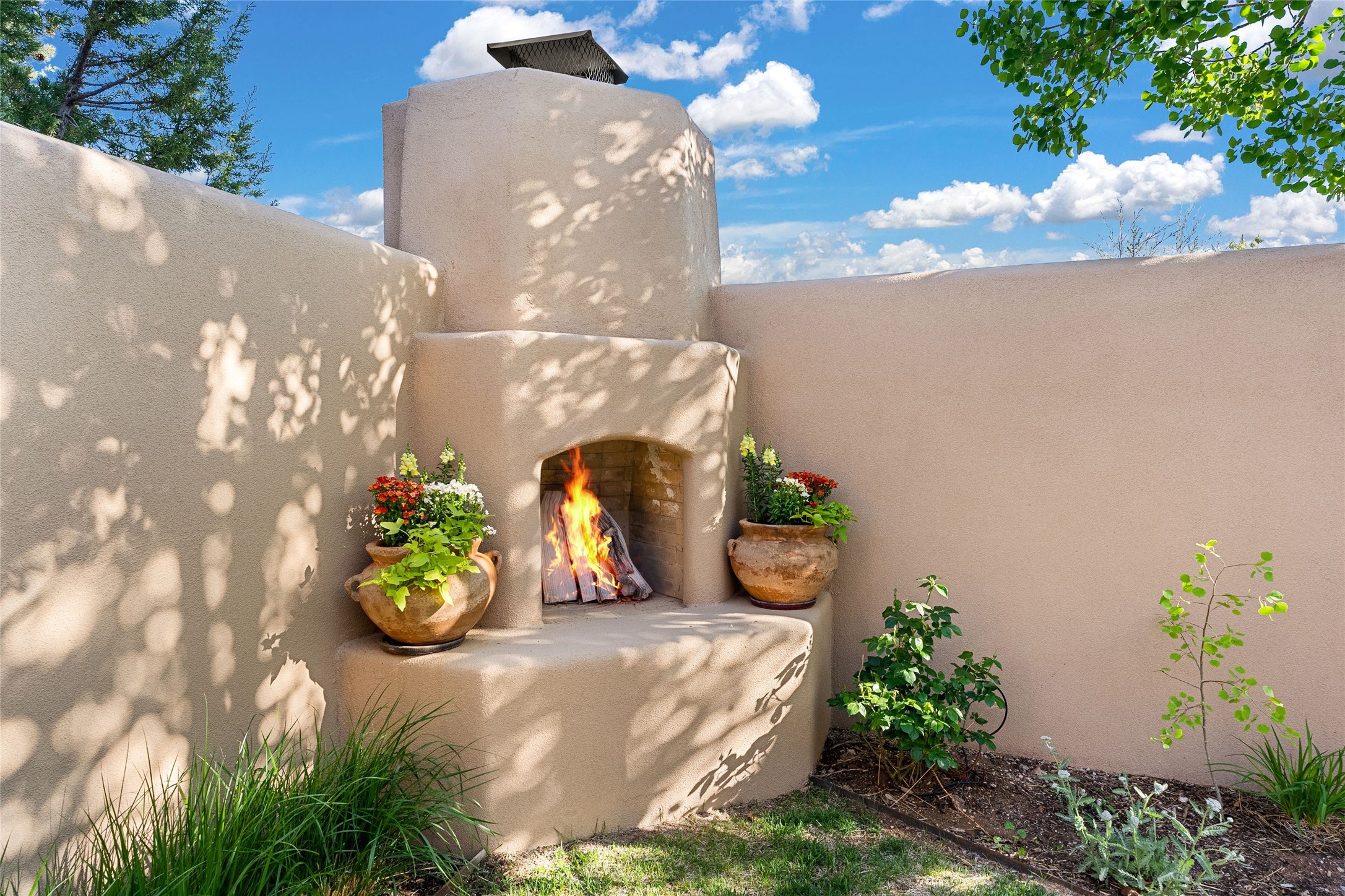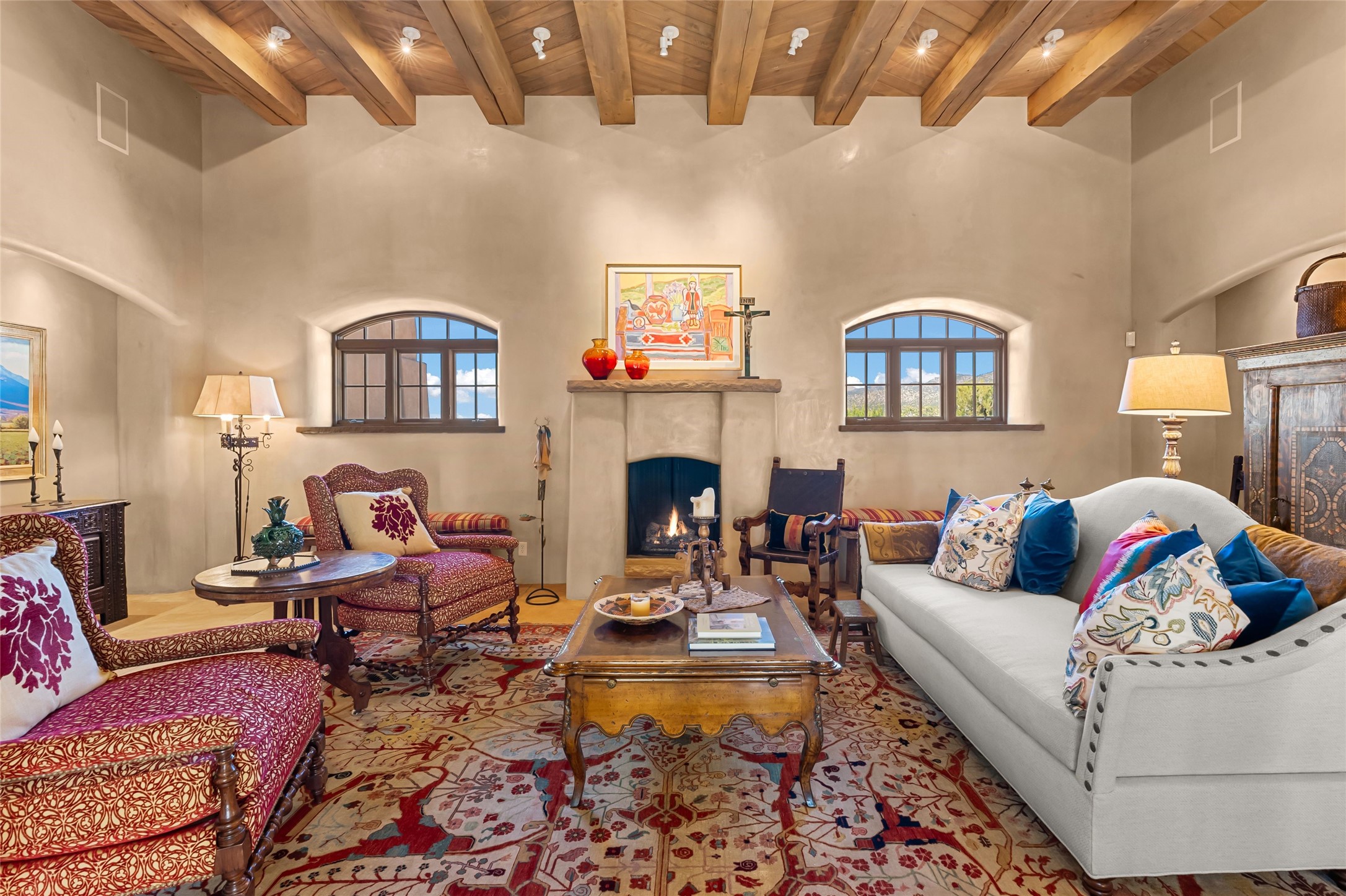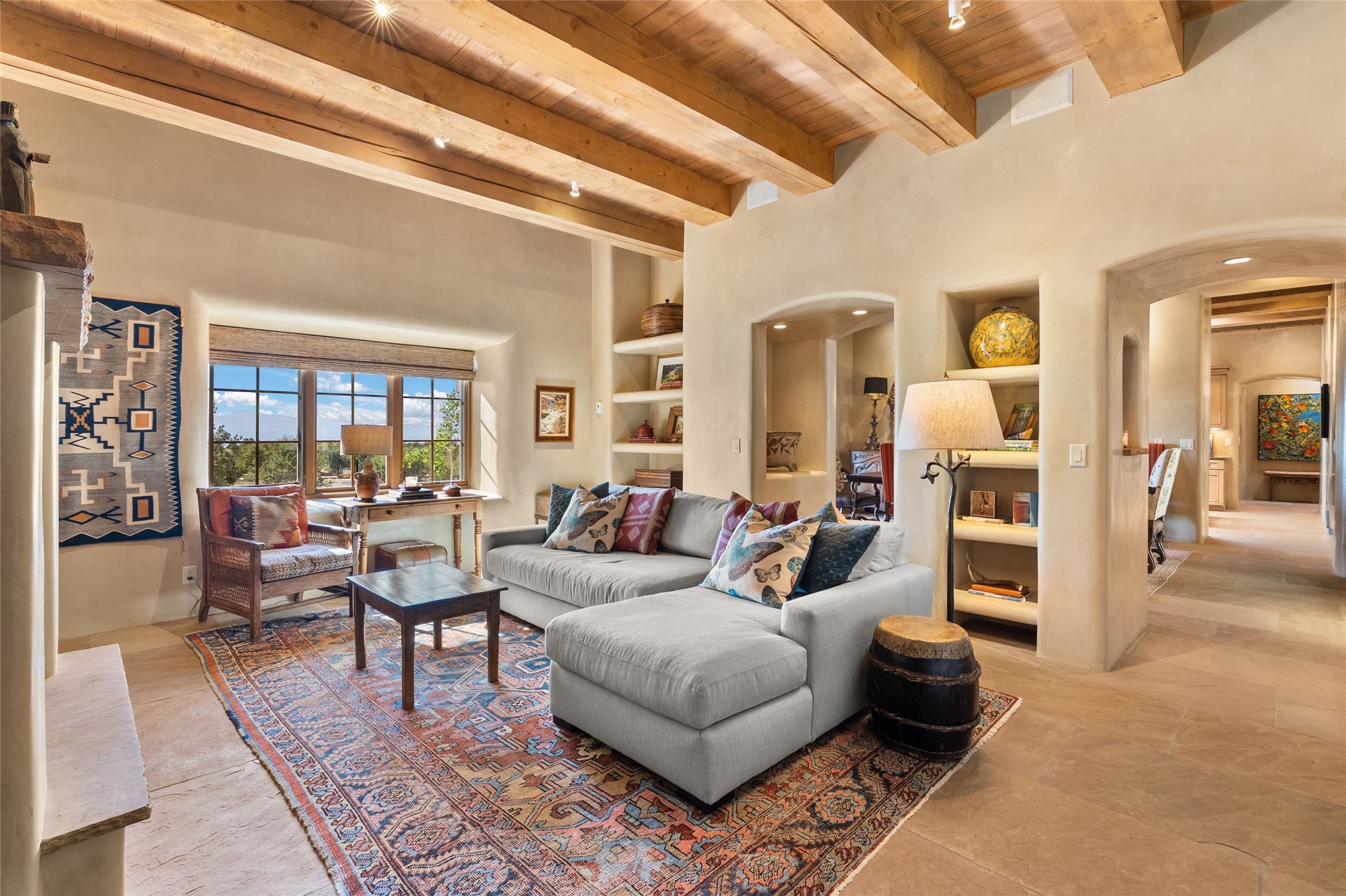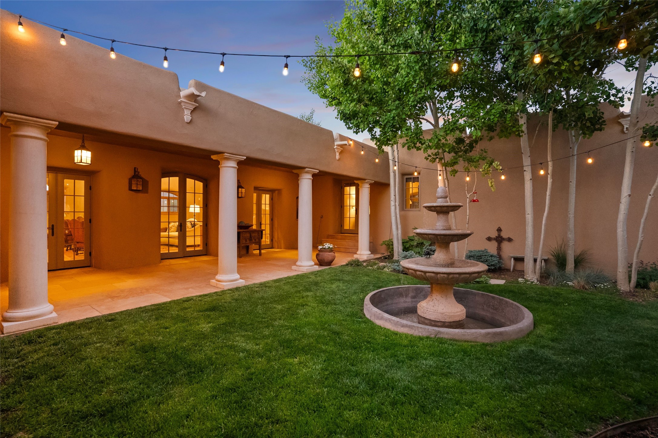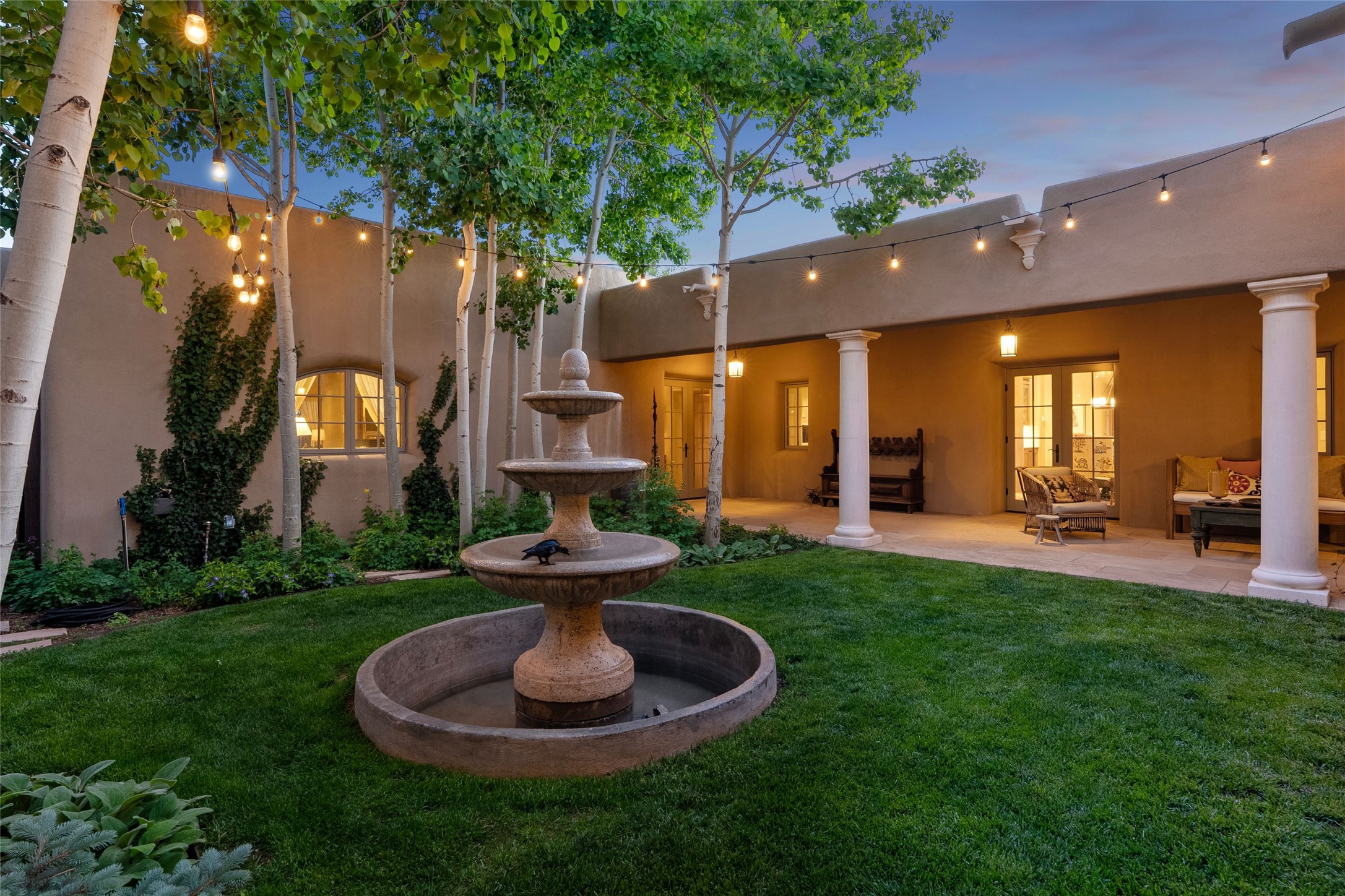 This gated 5.2-acre estate in the Sangre de Cristo foothills is only 18 minutes from the Santa Fe Plaza and offers panoramic views of the Sangres, Jemez Mountains, and Badlands. 4,752 sf living, 802 sf 2-car garage, 5 portals totaling 1,820 sf. of outdoor living space! 880 sf portal wraps the central, Aspen shaded courtyard with large stone fountain. Beds and gardens are filled with a vibrant array of flowers, grasses, and trees. West facing portal offers dramatic sunsets with lovely outdoor eating area. A private walled garden off the primary suite includes a smaller portal and outdoor fireplace. Interiors are warm, and light filled with a wide choice of cozy private and formal entertainment spaces. Rich interior finishes focus on traditional and timeless New Mexican details, beamed and wood plank ceilings, meticulously cut flagstone floors, Diamond plaster walls, 4 interior fireplaces, custom cabinetry, granite, sandstone counters and 10 skylights. Constructed with 2' to 4' thick Pumice-Crete walls, a labor-intensive, fireproof building method that beautifully replicates the look and feel of traditional triple-stacked adobe and is noted for its beauty, stability, noise reduction, and energy efficient qualities. Radiant floor heating, recently installed high efficiency AC condenser system save energy by preheating water for the propane fired boiler and converts to a chilled floor cooling system during summer months! Low profile solar panel system produces more power than the residence uses yielding monthly electric bills less than $12.00/month! A cozy family room, formal dining, kitchen, and spacious great room, all access the courtyard for spectacular entertaining or intimate gatherings. Two separated primarysuites plus office with tasteful built-ins. New improvements include stone planters and driveway borders, native trees, grasses, shrubs and flowers, new landscape irrigation system, new roof with extended warranty,new skylights, refreshed exterior stucco.
