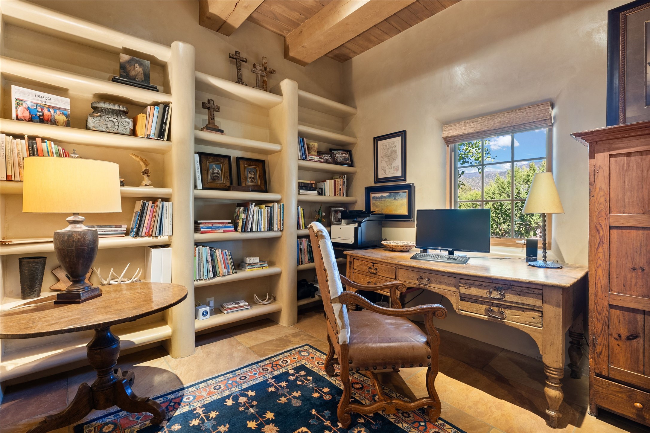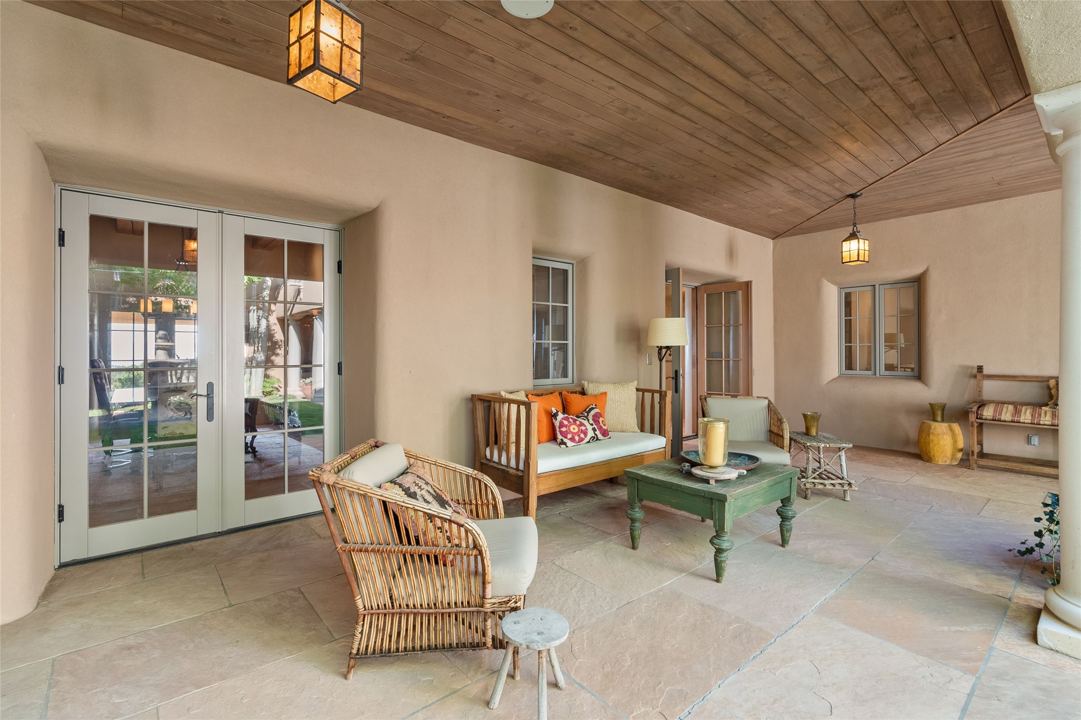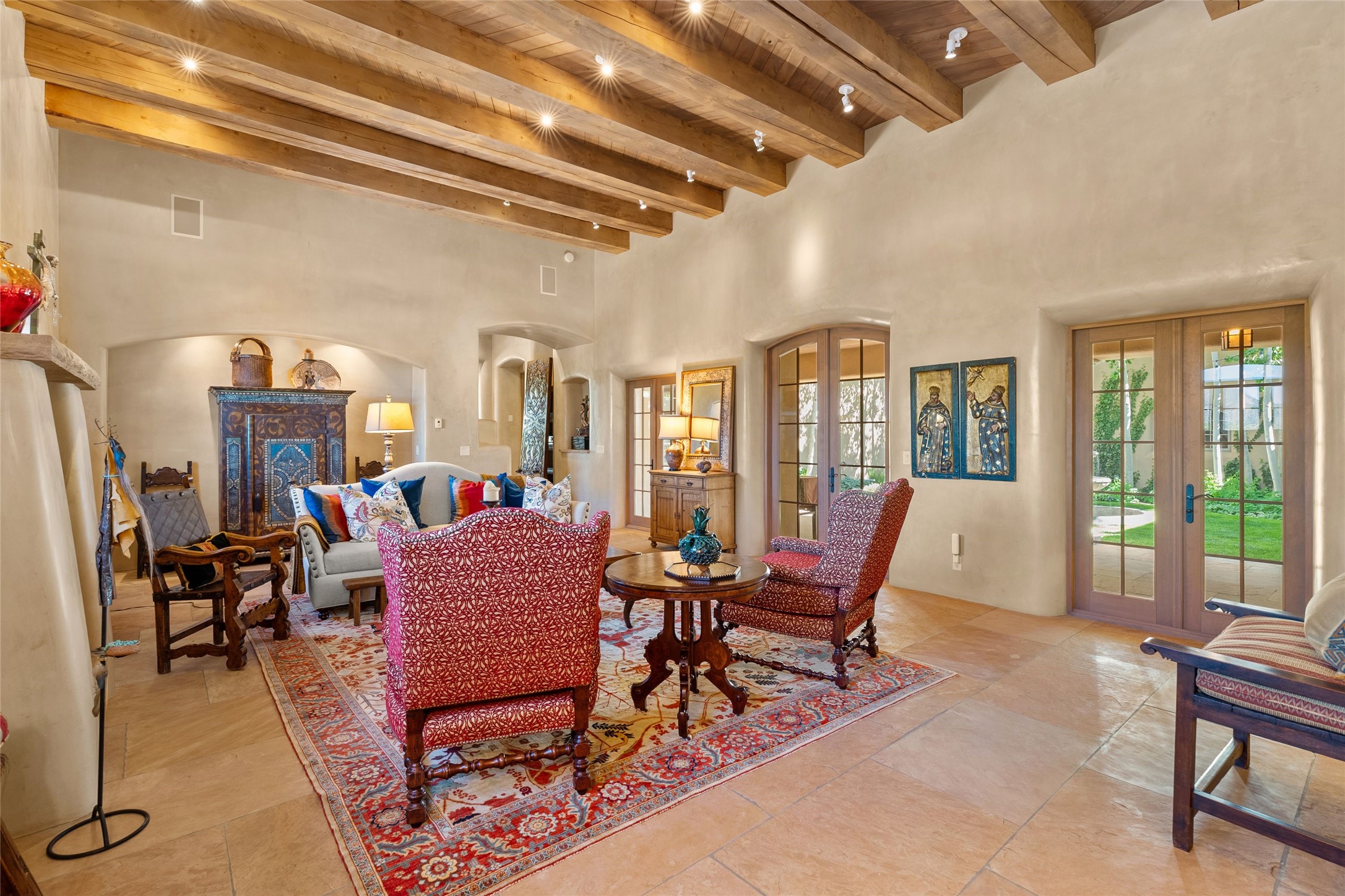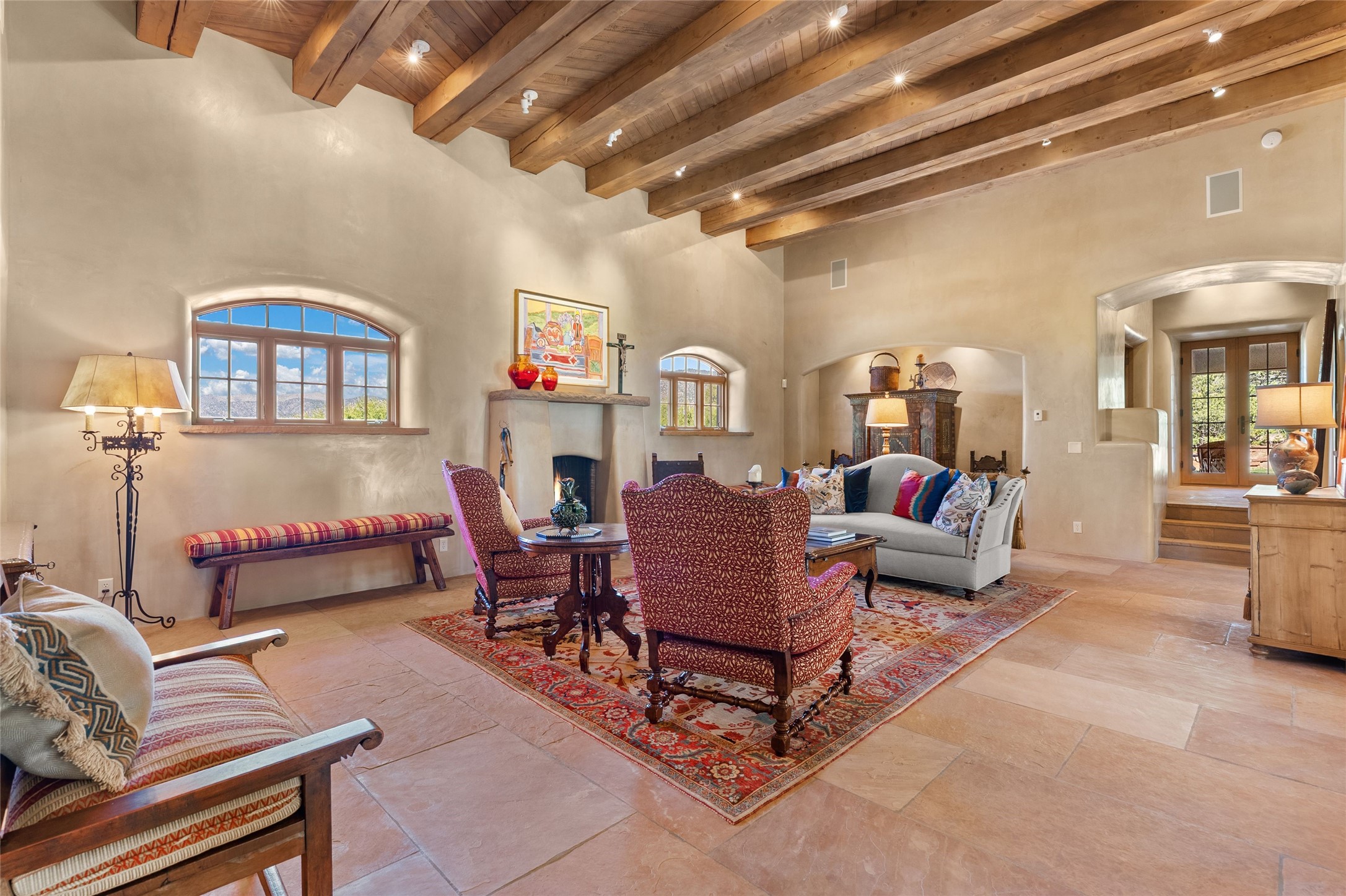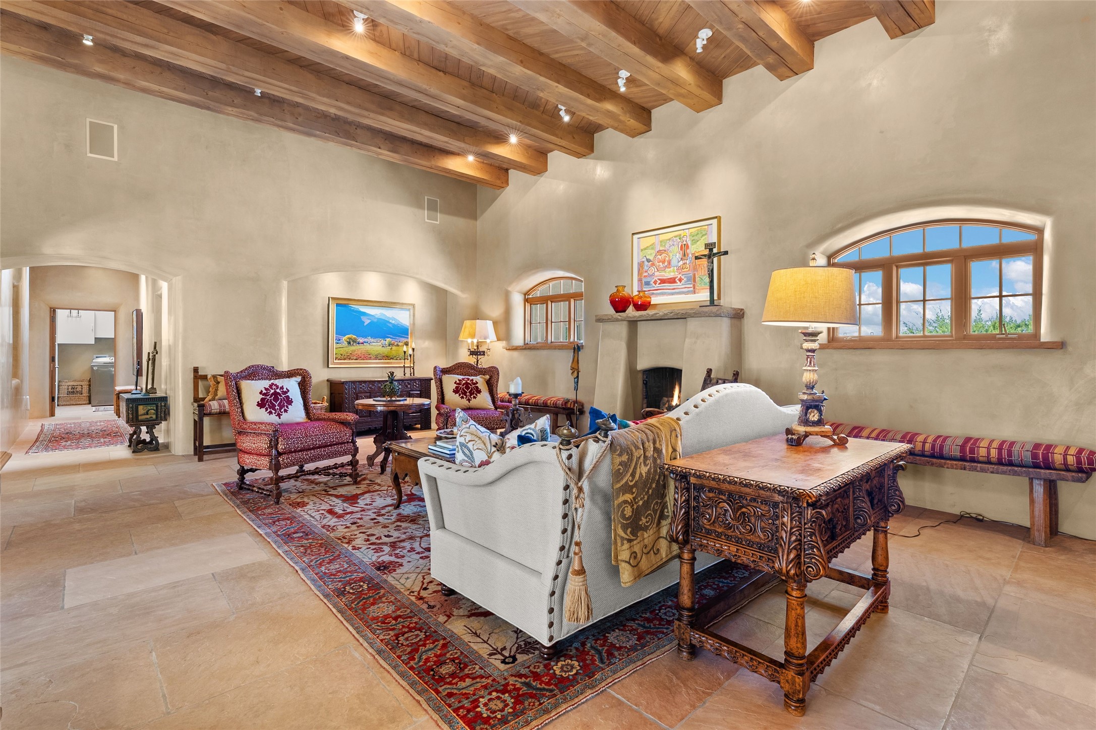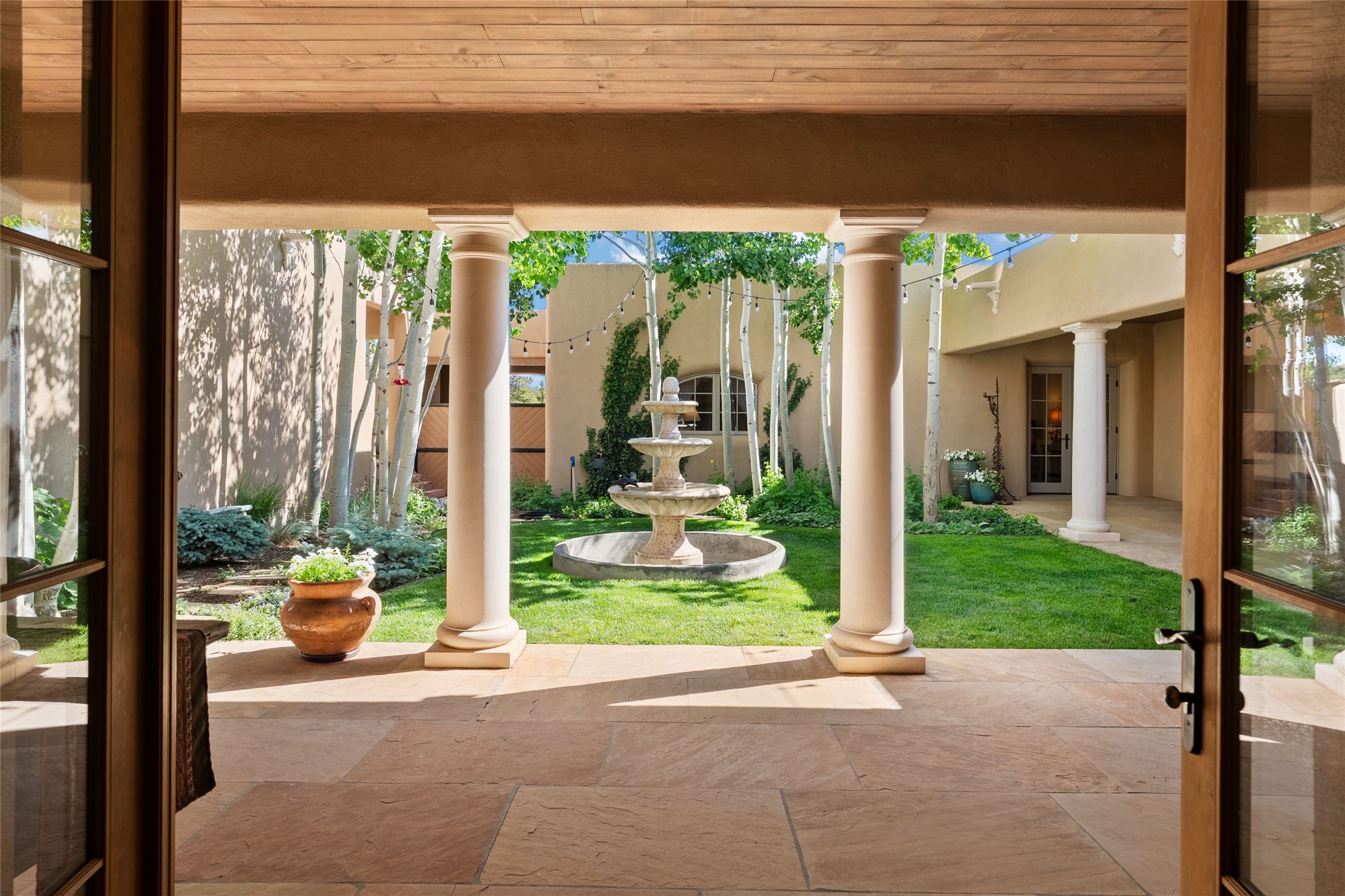 This gated 5.2-acre estate in the Sangre de Cristo foothills is only 18 minutes from the Santa Fe Plaza and offers panoramic views of the Sangres, Jemez Mountains, and Badlands. 4,752 sf living, 802 sf 2-car garage, 5 portals totaling 1,820 sf. of outdoor living space! 880 sf portal wraps the central, Aspen shaded courtyard with large stone fountain. Beds and gardens are filled with a vibrant array of flowers, grasses, and trees. West facing portal offers dramatic sunsets with lovely outdoor eating area. A private walled garden off the primary suite includes a smaller portal and outdoor fireplace. Interiors are warm, and light filled with a wide choice of cozy private and formal entertainment spaces. Rich interior finishes focus on traditional and timeless New Mexican details, beamed and wood plank ceilings, meticulously cut flagstone floors, Diamond plaster walls, 4 interior fireplaces, custom cabinetry, granite, sandstone counters and 10 skylights. Constructed with 2' to 4' thick Pumice-Crete walls, a labor-intensive, fireproof building method that beautifully replicates the look and feel of traditional triple-stacked adobe and is noted for its beauty, stability, noise reduction, and energy efficient qualities. Radiant floor heating, recently installed high efficiency AC condenser system save energy by preheating water for the propane fired boiler and converts to a chilled floor cooling system during summer months! Low profile solar panel system produces more power than the residence uses yielding monthly electric bills less than $12.00/month! A cozy family room, formal dining, kitchen, and spacious great room, all access the courtyard for spectacular entertaining or intimate gatherings. Two separated primarysuites plus office with tasteful built-ins. New improvements include stone planters and driveway borders, native trees, grasses, shrubs and flowers, new landscape irrigation system, new roof with extended warranty,new skylights, refreshed exterior stucco.