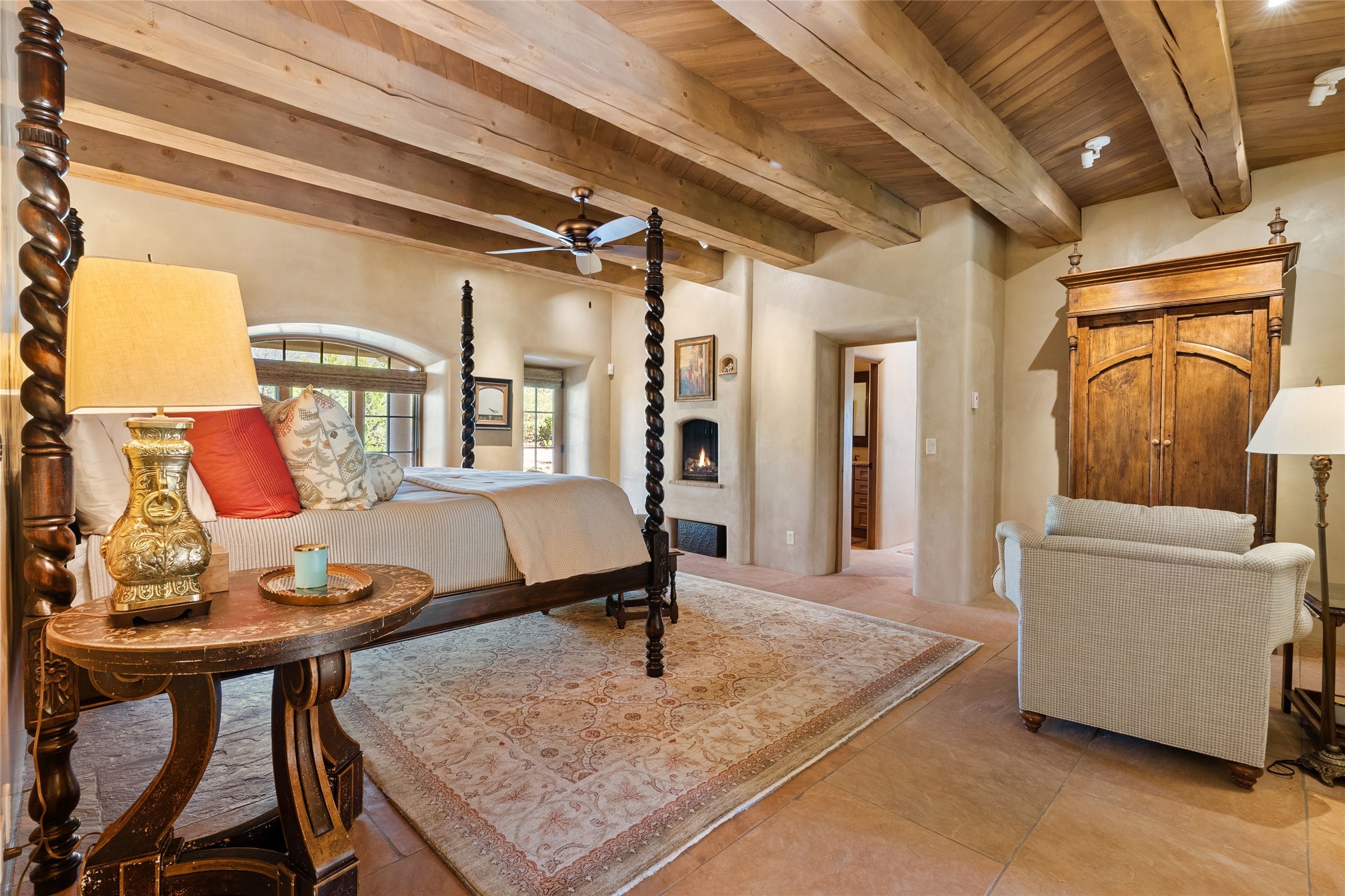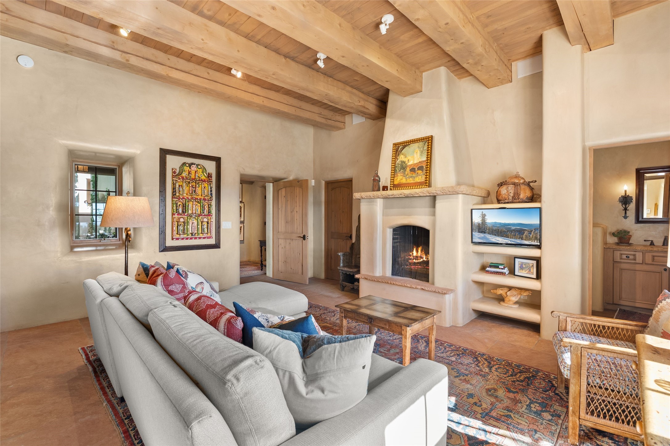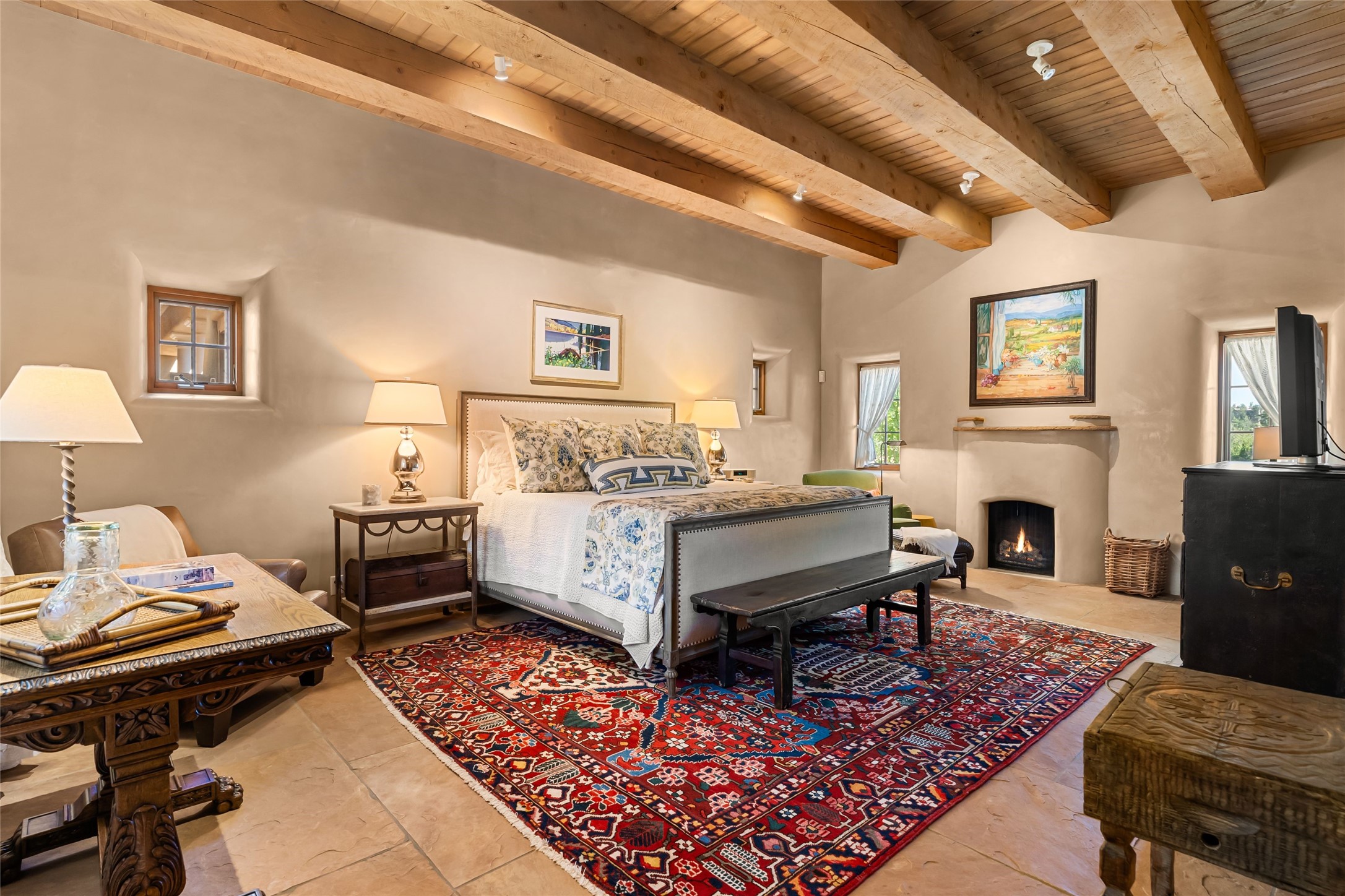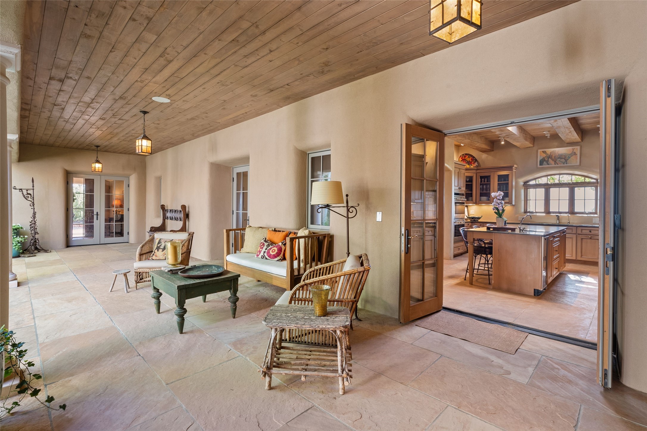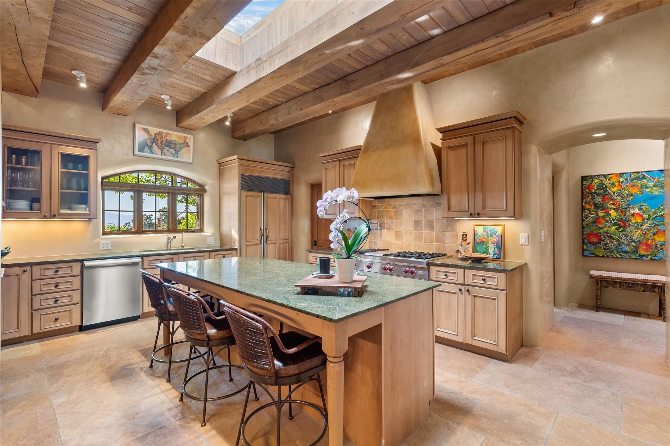 This gated 5.2-acre estate in the Sangre de Cristo foothills is only 18 minutes from the Santa Fe Plaza and offers panoramic views of the Sangres, Jemez Mountains, and Badlands. 4,752 sf living, 802 sf 2-car garage, 5 portals totaling 1,820 sf. of outdoor living space! 880 sf portal wraps the central, Aspen shaded courtyard with large stone fountain. Beds and gardens are filled with a vibrant array of flowers, grasses, and trees. West facing portal offers dramatic sunsets with lovely outdoor eating area. A private walled garden off the primary suite includes a smaller portal and outdoor fireplace. Interiors are warm, and light filled with a wide choice of cozy private and formal entertainment spaces. Rich interior finishes focus on traditional and timeless New Mexican details, beamed and wood plank ceilings, meticulously cut flagstone floors, Diamond plaster walls, 4 interior fireplaces, custom cabinetry, granite, sandstone counters and 10 skylights. Constructed with 2' to 4' thick Pumice-Crete walls, a labor-intensive, fireproof building method that beautifully replicates the look and feel of traditional triple-stacked adobe and is noted for its beauty, stability, noise reduction, and energy efficient qualities. Radiant floor heating, recently installed high efficiency AC condenser system save energy by preheating water for the propane fired boiler and converts to a chilled floor cooling system during summer months! Low profile solar panel system produces more power than the residence uses yielding monthly electric bills less than $12.00/month! A cozy family room, formal dining, kitchen, and spacious great room, all access the courtyard for spectacular entertaining or intimate gatherings. Two separated primarysuites plus office with tasteful built-ins. New improvements include stone planters and driveway borders, native trees, grasses, shrubs and flowers, new landscape irrigation system, new roof with extended warranty,new skylights, refreshed exterior stucco.