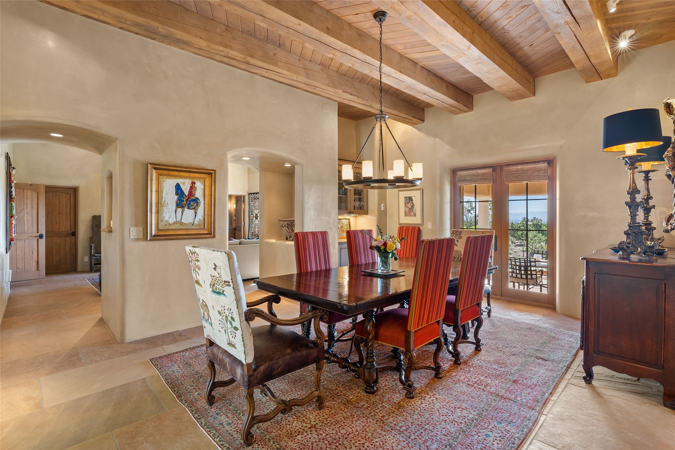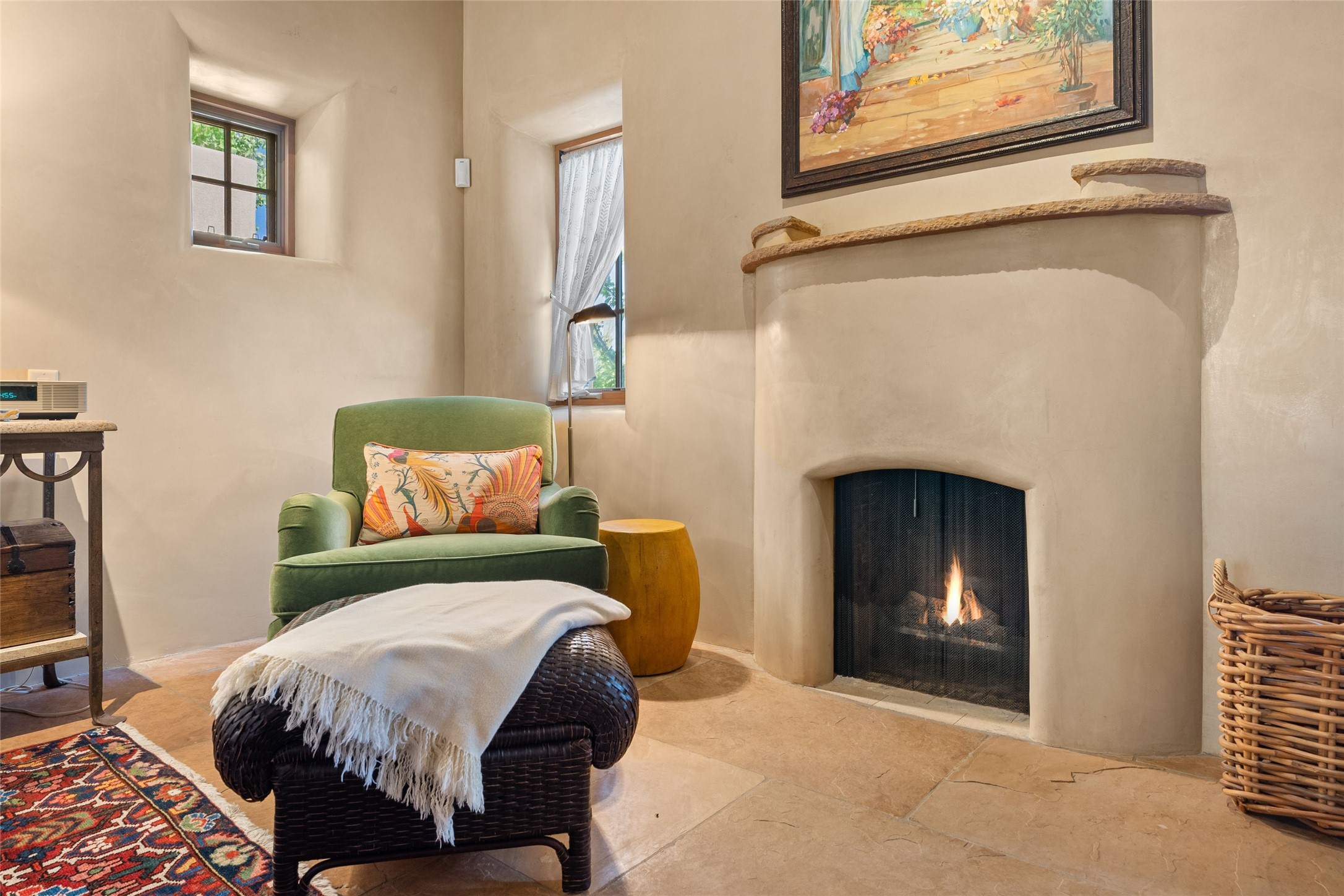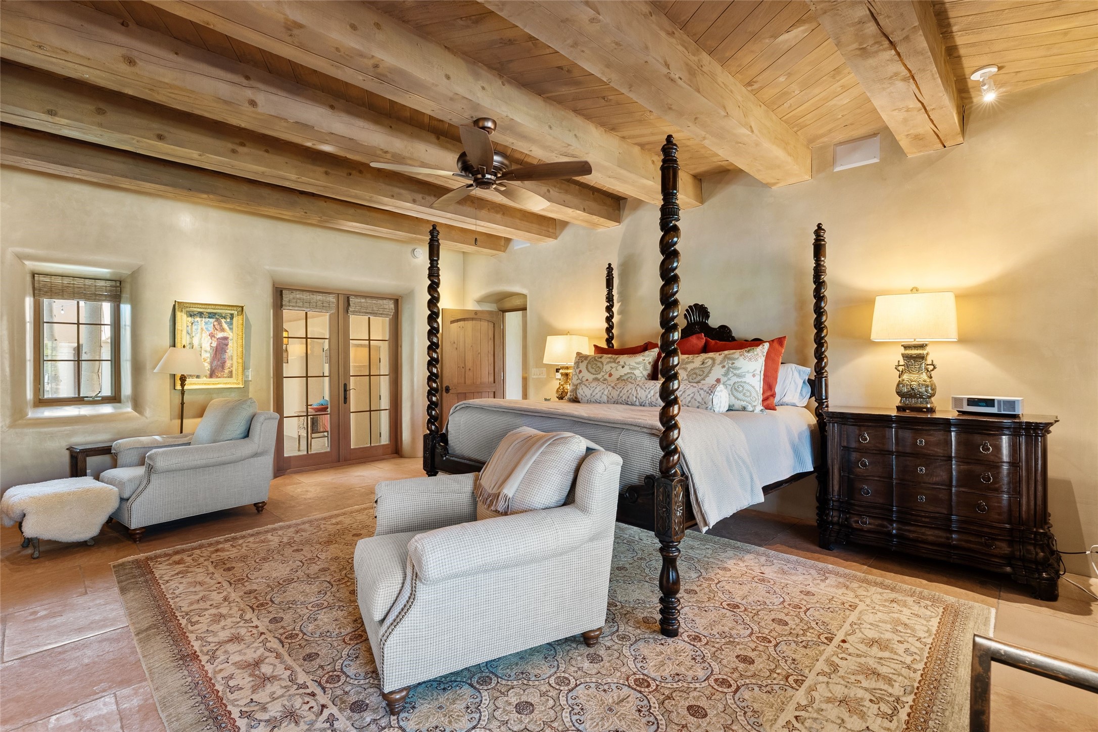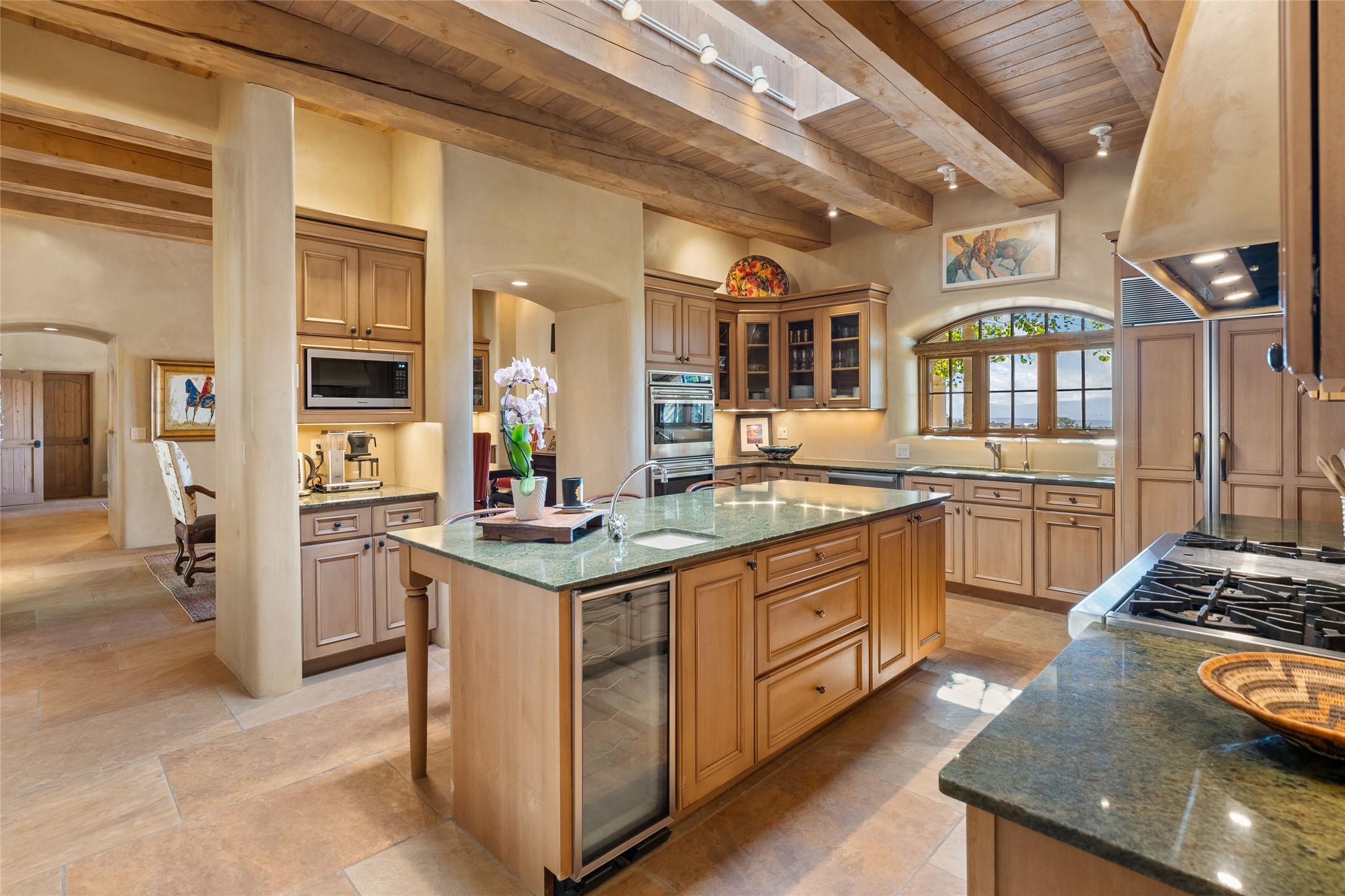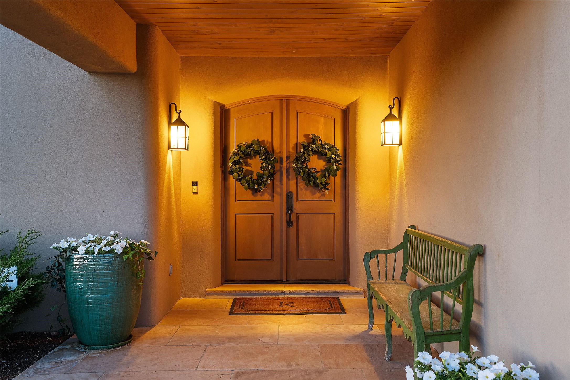This gated 5.2-acre estate in the Sangre de Cristo foothills is only 18 minutes from the Santa Fe Plaza and offers panoramic views of the Sangres, Jemez Mountains, and Badlands. 4,752 sf living, 802 sf 2-car garage, 5 portals totaling 1,820 sf. of outdoor living space! 880 sf portal wraps the central, Aspen shaded courtyard with large stone fountain. Beds and gardens are filled with a vibrant array of flowers, grasses, and trees. West facing portal offers dramatic sunsets with lovely outdoor eating area. A private walled garden off the primary suite includes a smaller portal and outdoor fireplace. Interiors are warm, and light filled with a wide choice of cozy private and formal entertainment spaces. Rich interior finishes focus on traditional and timeless New Mexican details, beamed and wood plank ceilings, meticulously cut flagstone floors, Diamond plaster walls, 4 interior fireplaces, custom cabinetry, granite, sandstone counters and 10 skylights. Constructed with 2' to 4' thick Pumice-Crete walls, a labor-intensive, fireproof building method that beautifully replicates the look and feel of traditional triple-stacked adobe and is noted for its beauty, stability, noise reduction, and energy efficient qualities. Radiant floor heating, recently installed high efficiency AC condenser system save energy by preheating water for the propane fired boiler and converts to a chilled floor cooling system during summer months! Low profile solar panel system produces more power than the residence uses yielding monthly electric bills less than $12.00/month! A cozy family room, formal dining, kitchen, and spacious great room, all access the courtyard for spectacular entertaining or intimate gatherings. Two separated primarysuites plus office with tasteful built-ins. New improvements include stone planters and driveway borders, native trees, grasses, shrubs and flowers, new landscape irrigation system, new roof with extended warranty,new skylights, refreshed exterior stucco.