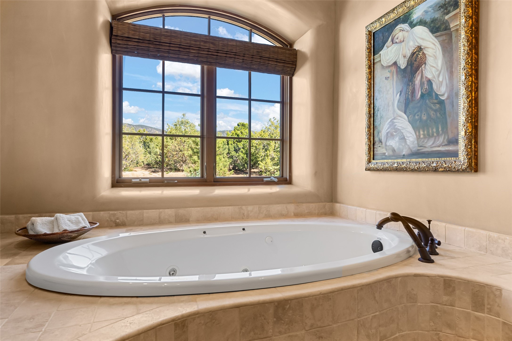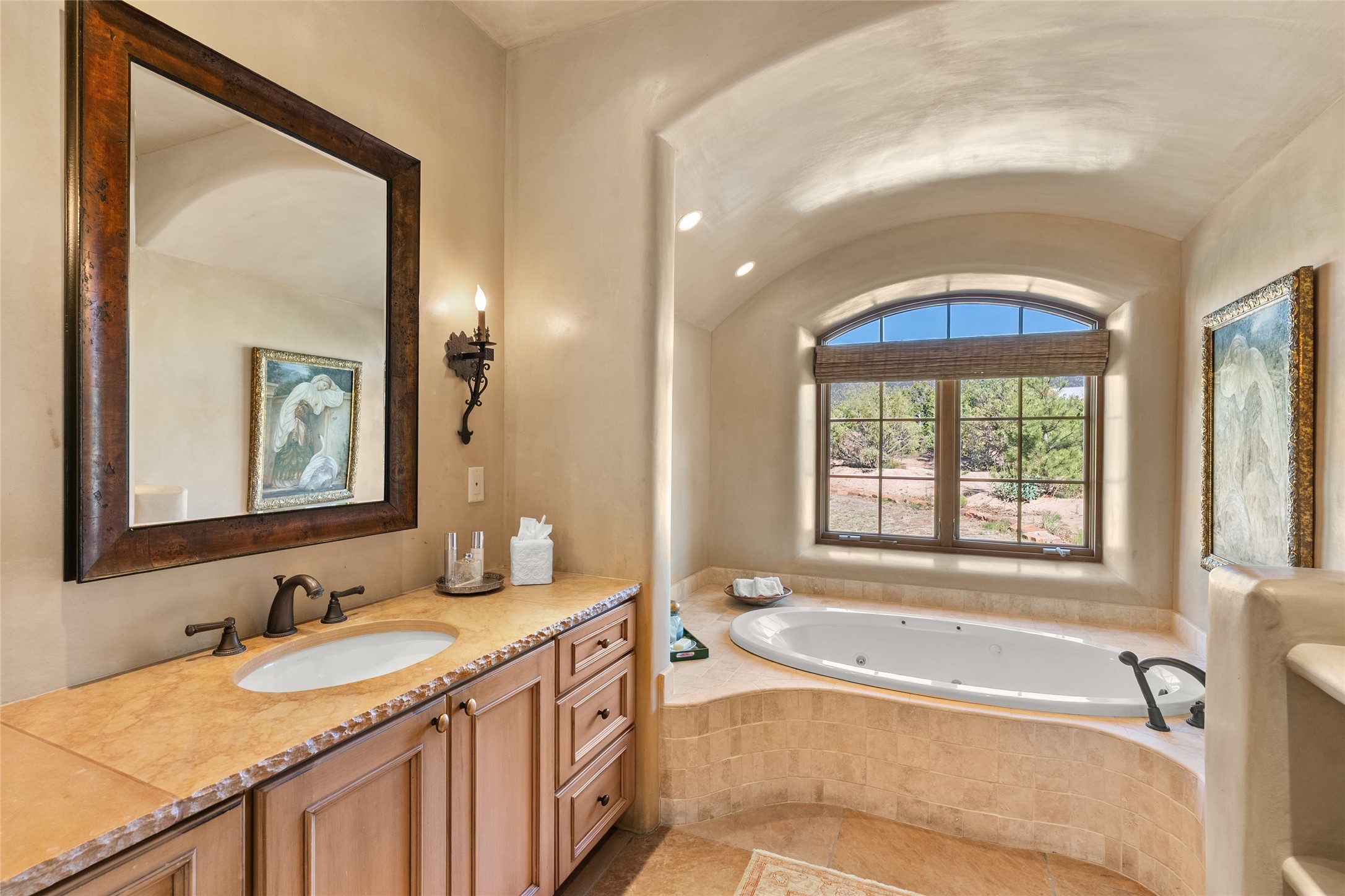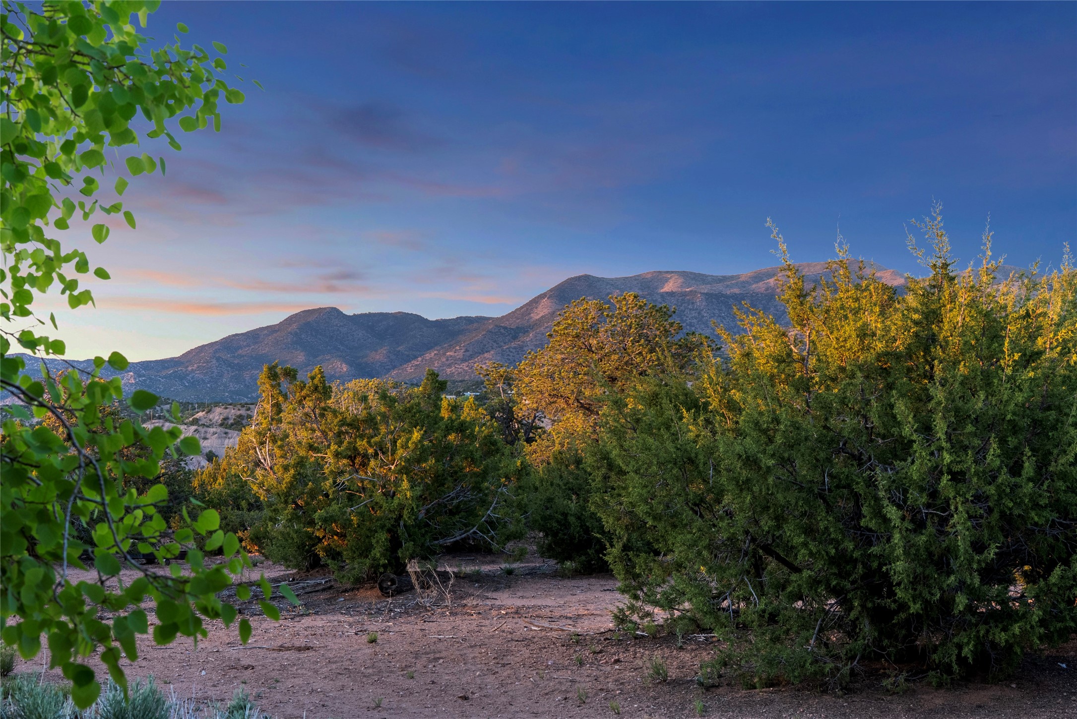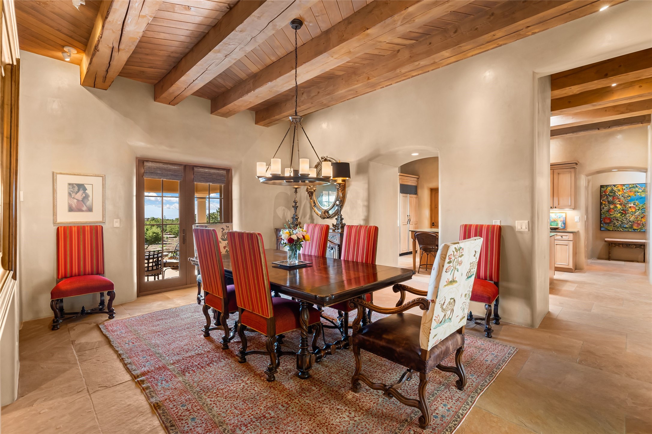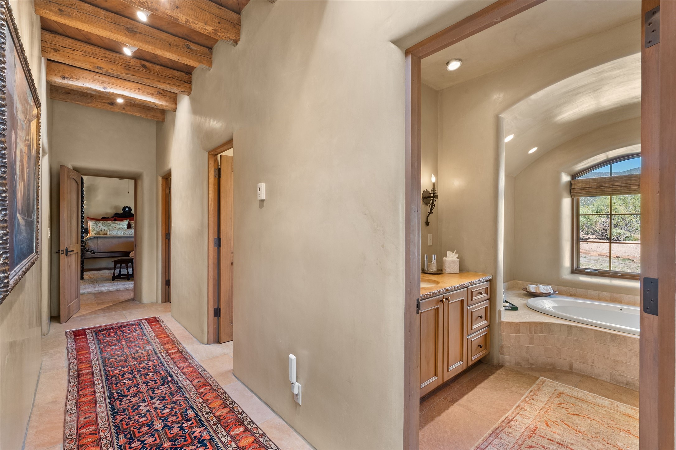 This gated 5.2-acre estate in the Sangre de Cristo foothills is only 18 minutes from the Santa Fe Plaza and offers panoramic views of the Sangres, Jemez Mountains, and Badlands. 4,752 sf living, 802 sf 2-car garage, 5 portals totaling 1,820 sf. of outdoor living space! 880 sf portal wraps the central, Aspen shaded courtyard with large stone fountain. Beds and gardens are filled with a vibrant array of flowers, grasses, and trees. West facing portal offers dramatic sunsets with lovely outdoor eating area. A private walled garden off the primary suite includes a smaller portal and outdoor fireplace. Interiors are warm, and light filled with a wide choice of cozy private and formal entertainment spaces. Rich interior finishes focus on traditional and timeless New Mexican details, beamed and wood plank ceilings, meticulously cut flagstone floors, Diamond plaster walls, 4 interior fireplaces, custom cabinetry, granite, sandstone counters and 10 skylights. Constructed with 2' to 4' thick Pumice-Crete walls, a labor-intensive, fireproof building method that beautifully replicates the look and feel of traditional triple-stacked adobe and is noted for its beauty, stability, noise reduction, and energy efficient qualities. Radiant floor heating, recently installed high efficiency AC condenser system save energy by preheating water for the propane fired boiler and converts to a chilled floor cooling system during summer months! Low profile solar panel system produces more power than the residence uses yielding monthly electric bills less than $12.00/month! A cozy family room, formal dining, kitchen, and spacious great room, all access the courtyard for spectacular entertaining or intimate gatherings. Two separated primarysuites plus office with tasteful built-ins. New improvements include stone planters and driveway borders, native trees, grasses, shrubs and flowers, new landscape irrigation system, new roof with extended warranty,new skylights, refreshed exterior stucco.