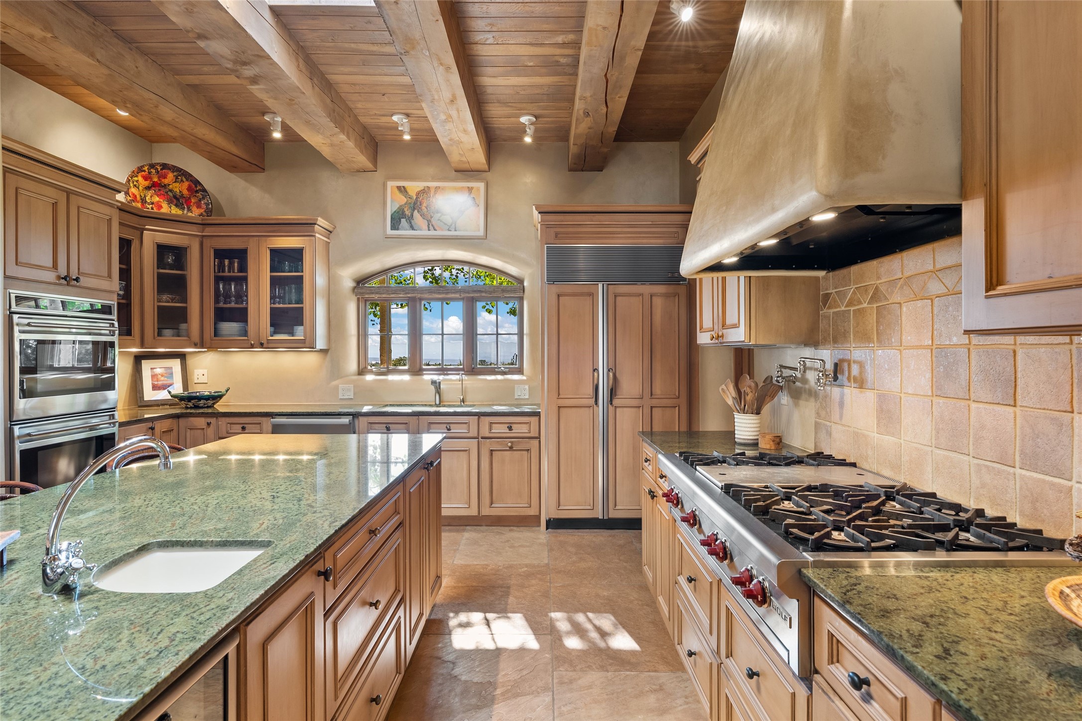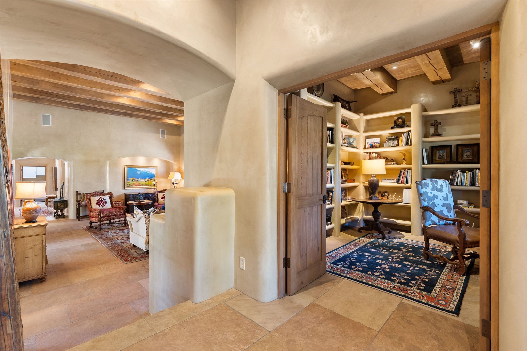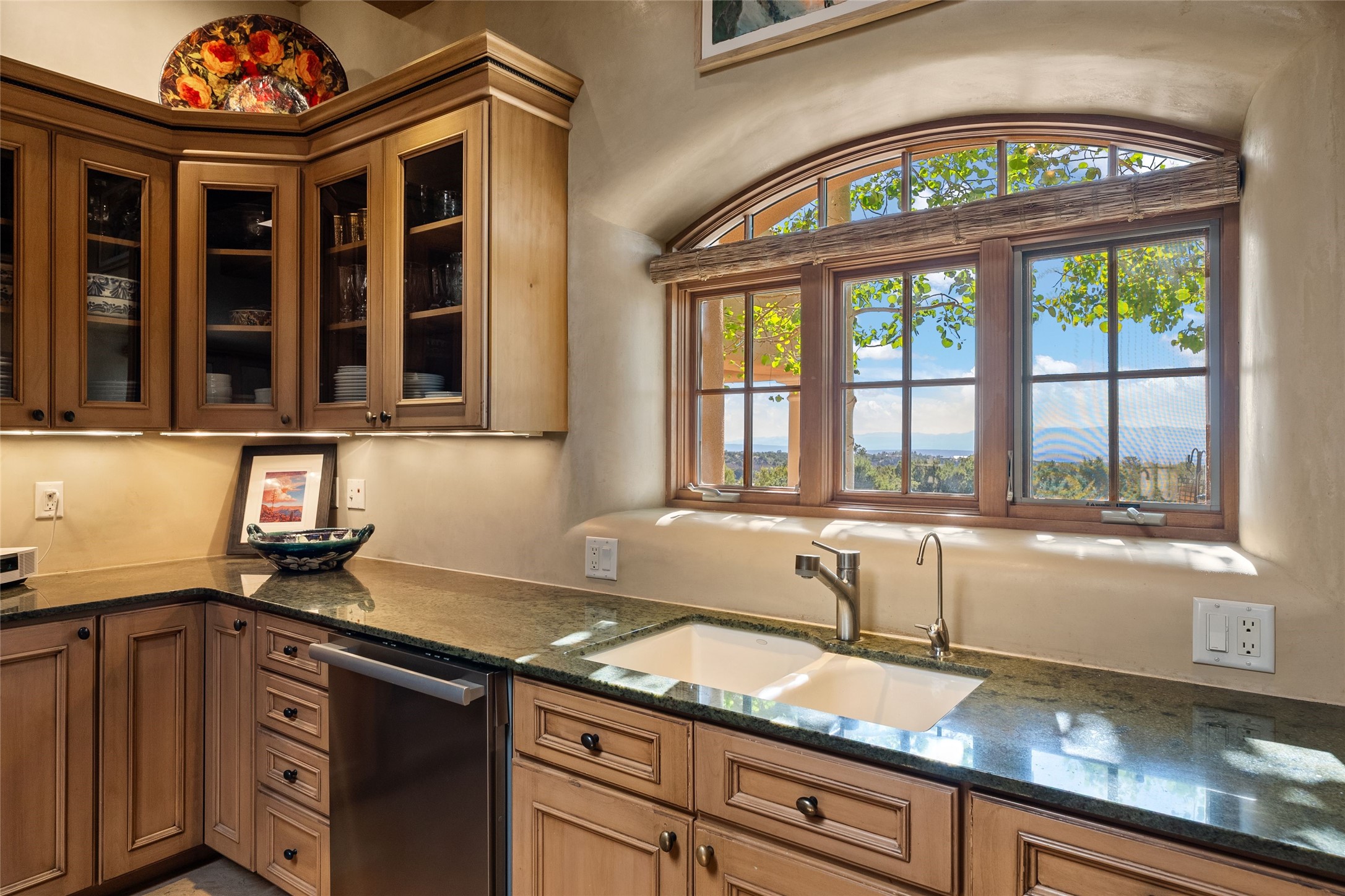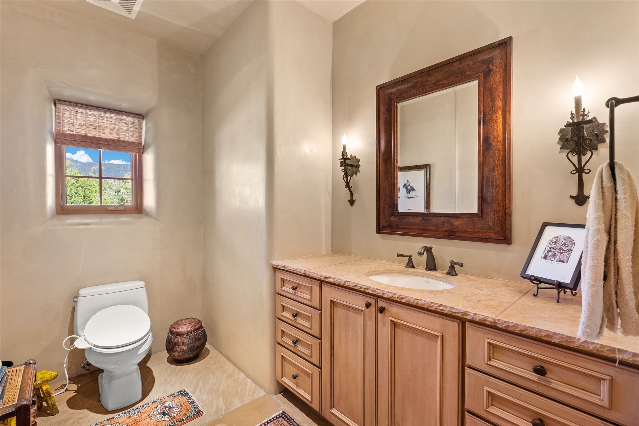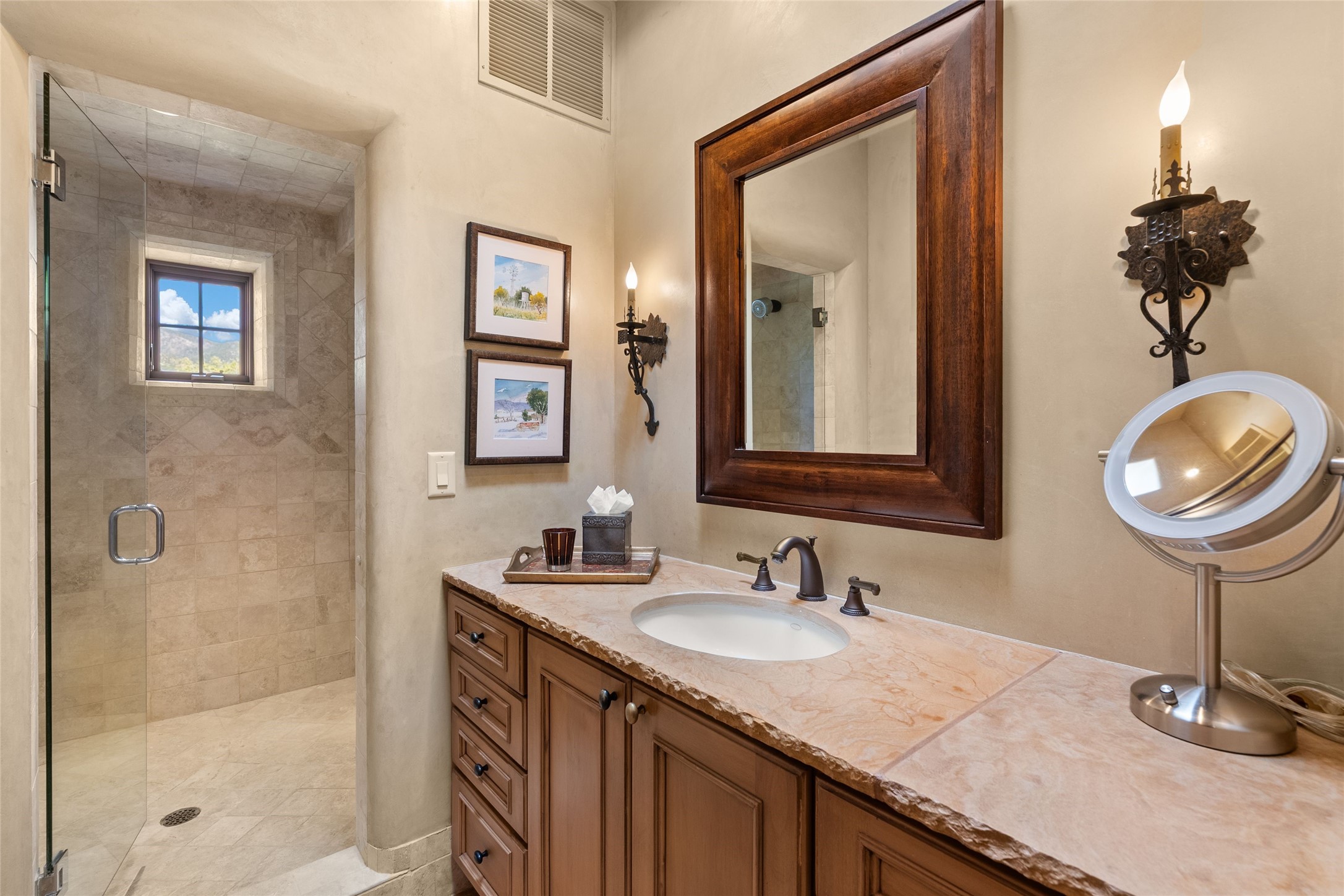 This gated 5.2-acre estate in the Sangre de Cristo foothills is only 18 minutes from the Santa Fe Plaza and offers panoramic views of the Sangres, Jemez Mountains, and Badlands. 4,752 sf living, 802 sf 2-car garage, 5 portals totaling 1,820 sf. of outdoor living space! 880 sf portal wraps the central, Aspen shaded courtyard with large stone fountain. Beds and gardens are filled with a vibrant array of flowers, grasses, and trees. West facing portal offers dramatic sunsets with lovely outdoor eating area. A private walled garden off the primary suite includes a smaller portal and outdoor fireplace. Interiors are warm, and light filled with a wide choice of cozy private and formal entertainment spaces. Rich interior finishes focus on traditional and timeless New Mexican details, beamed and wood plank ceilings, meticulously cut flagstone floors, Diamond plaster walls, 4 interior fireplaces, custom cabinetry, granite, sandstone counters and 10 skylights. Constructed with 2' to 4' thick Pumice-Crete walls, a labor-intensive, fireproof building method that beautifully replicates the look and feel of traditional triple-stacked adobe and is noted for its beauty, stability, noise reduction, and energy efficient qualities. Radiant floor heating, recently installed high efficiency AC condenser system save energy by preheating water for the propane fired boiler and converts to a chilled floor cooling system during summer months! Low profile solar panel system produces more power than the residence uses yielding monthly electric bills less than $12.00/month! A cozy family room, formal dining, kitchen, and spacious great room, all access the courtyard for spectacular entertaining or intimate gatherings. Two separated primarysuites plus office with tasteful built-ins. New improvements include stone planters and driveway borders, native trees, grasses, shrubs and flowers, new landscape irrigation system, new roof with extended warranty,new skylights, refreshed exterior stucco.