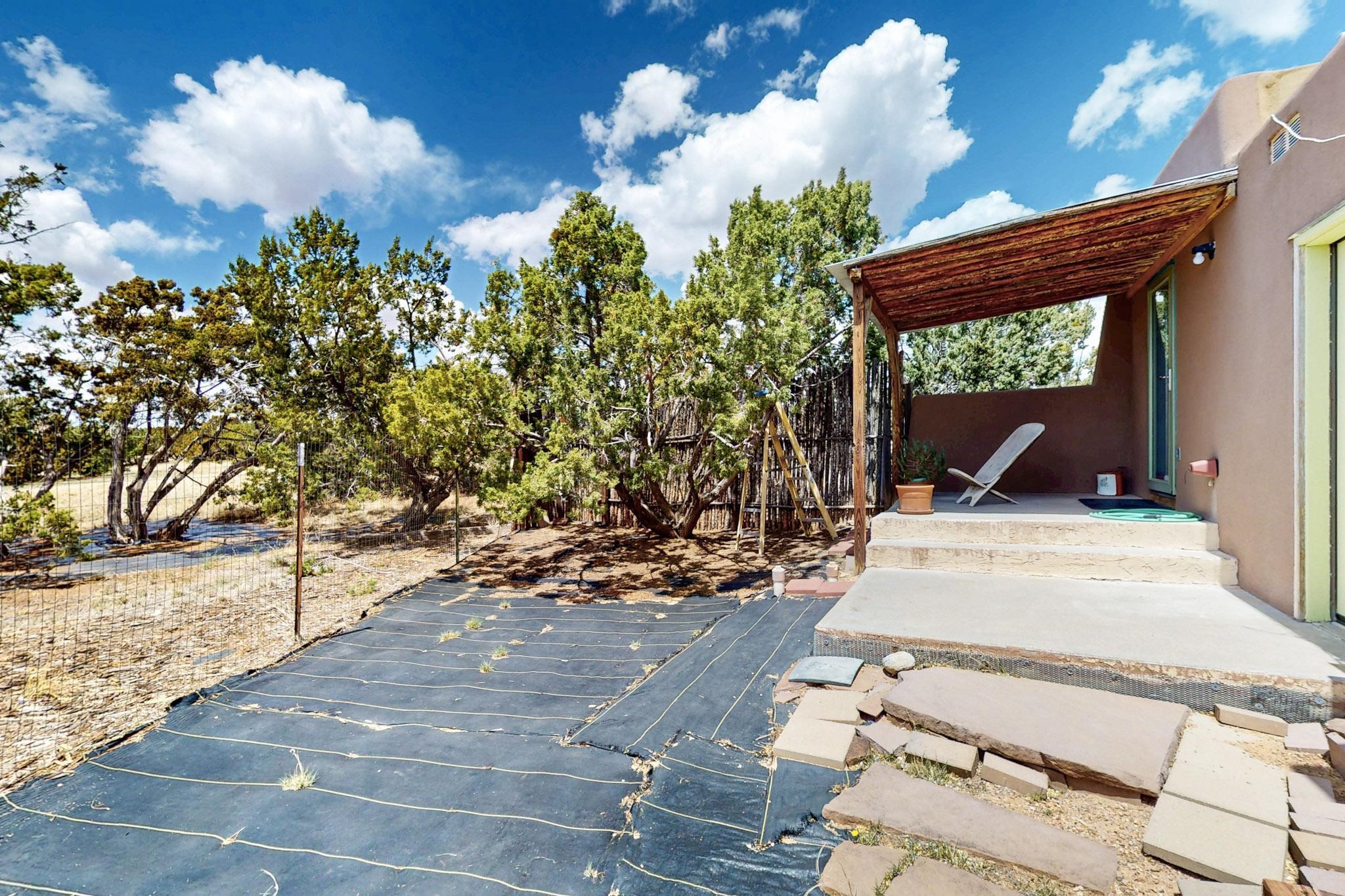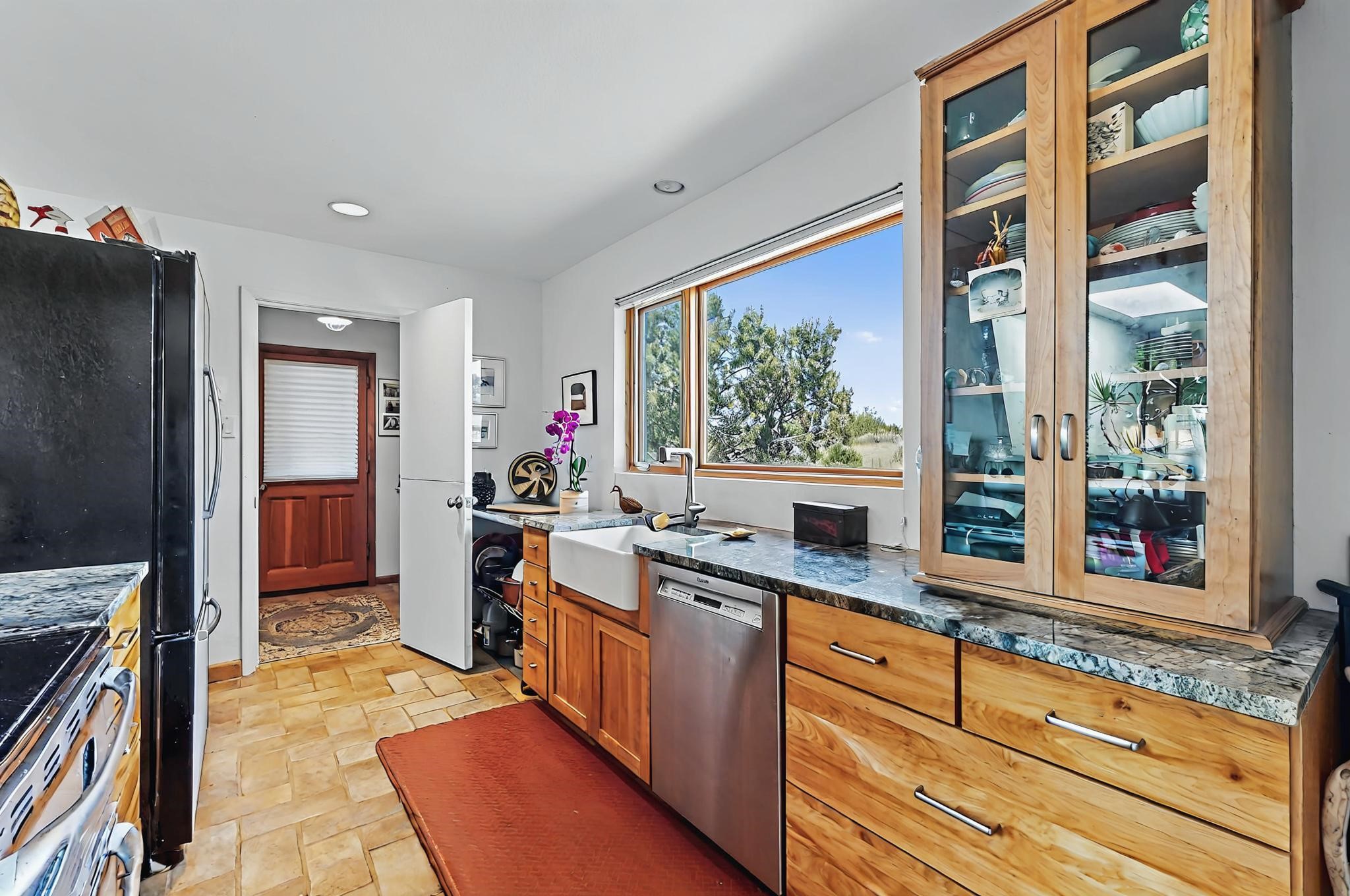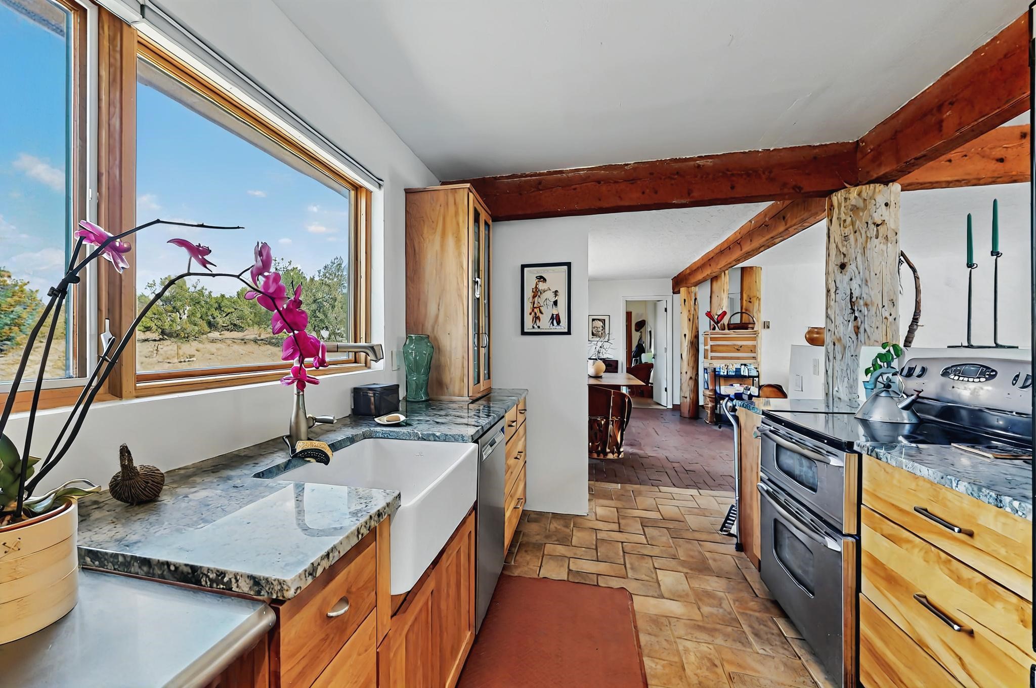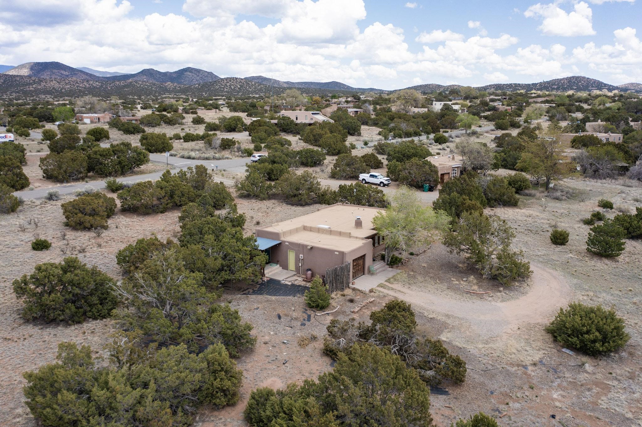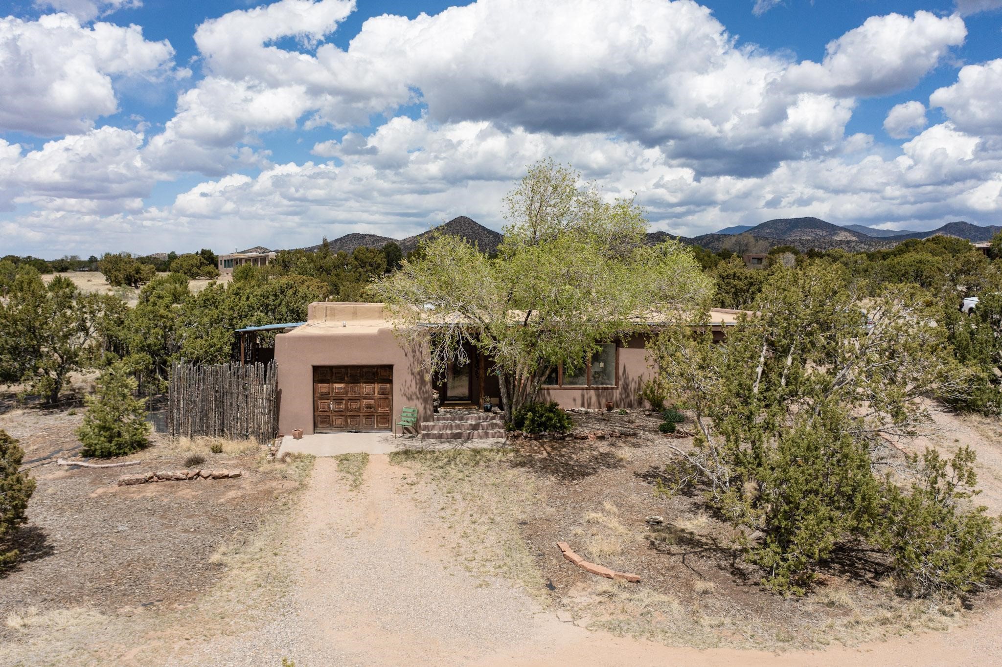 VIEWS VIEWS VIEWS from every room. Mountains, green belt and trees in a very private location. Traditional banco and kiva fireplace in living area, brick floors, and adobe wall at entry. Totally renovated kitchen with granite counters and totally renovated modern bathroom. Two bedrooms either side of updated bathroom have unfinished cement floors due to owner's allergies. Plantings on drip. 2 1/2 year old heat pump with electric baseboard backup; refrigerator 2020; dishwasher 2019; washing machine 2018; newer stucco with remaining 5 year warranty; roof refresh 2024 with 2 year warranty; water heater 2025. No VOC paints.