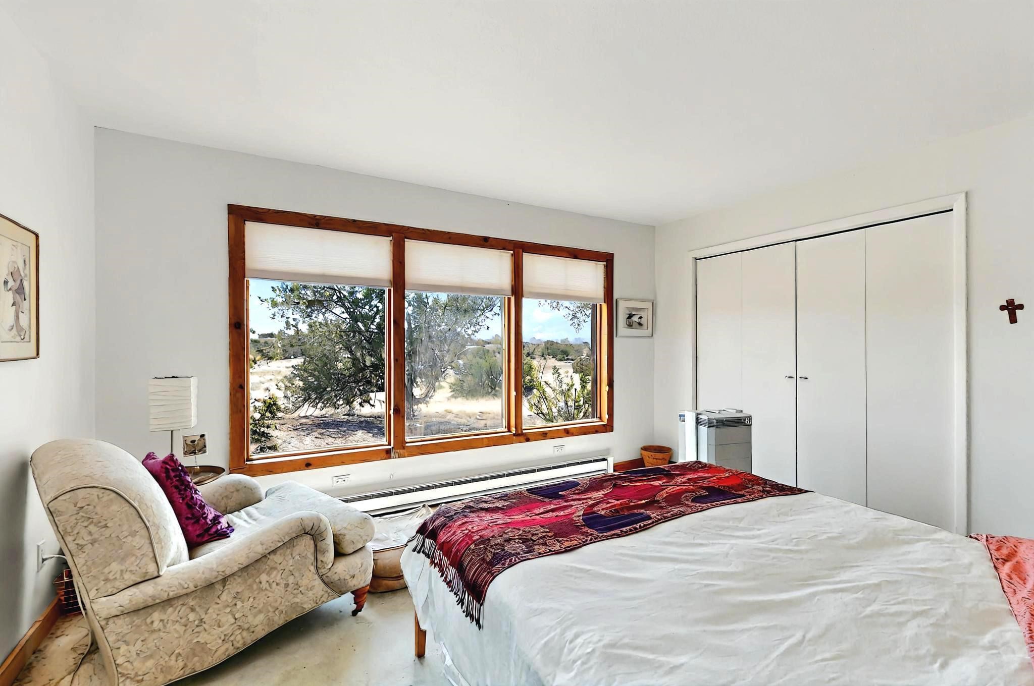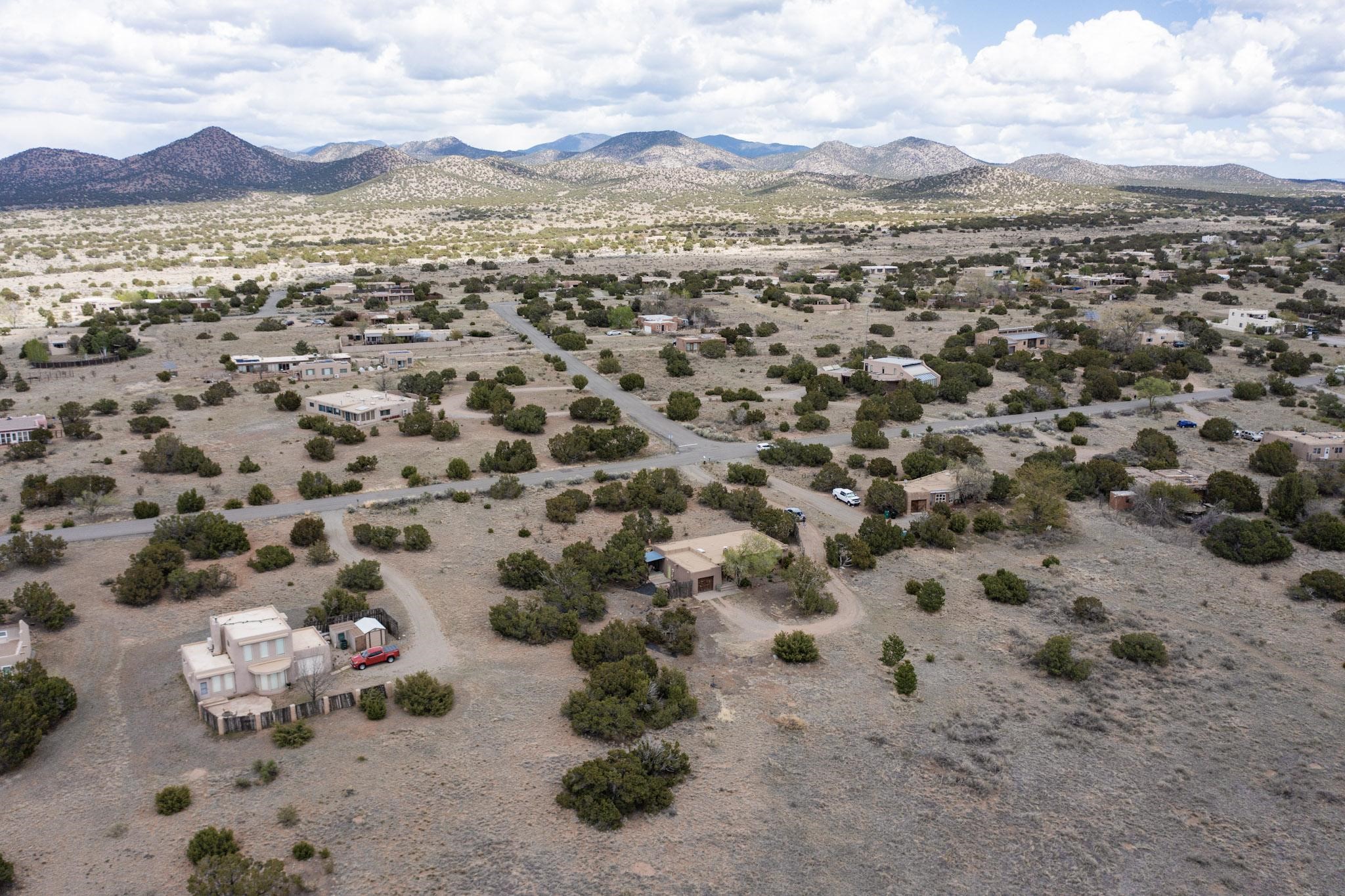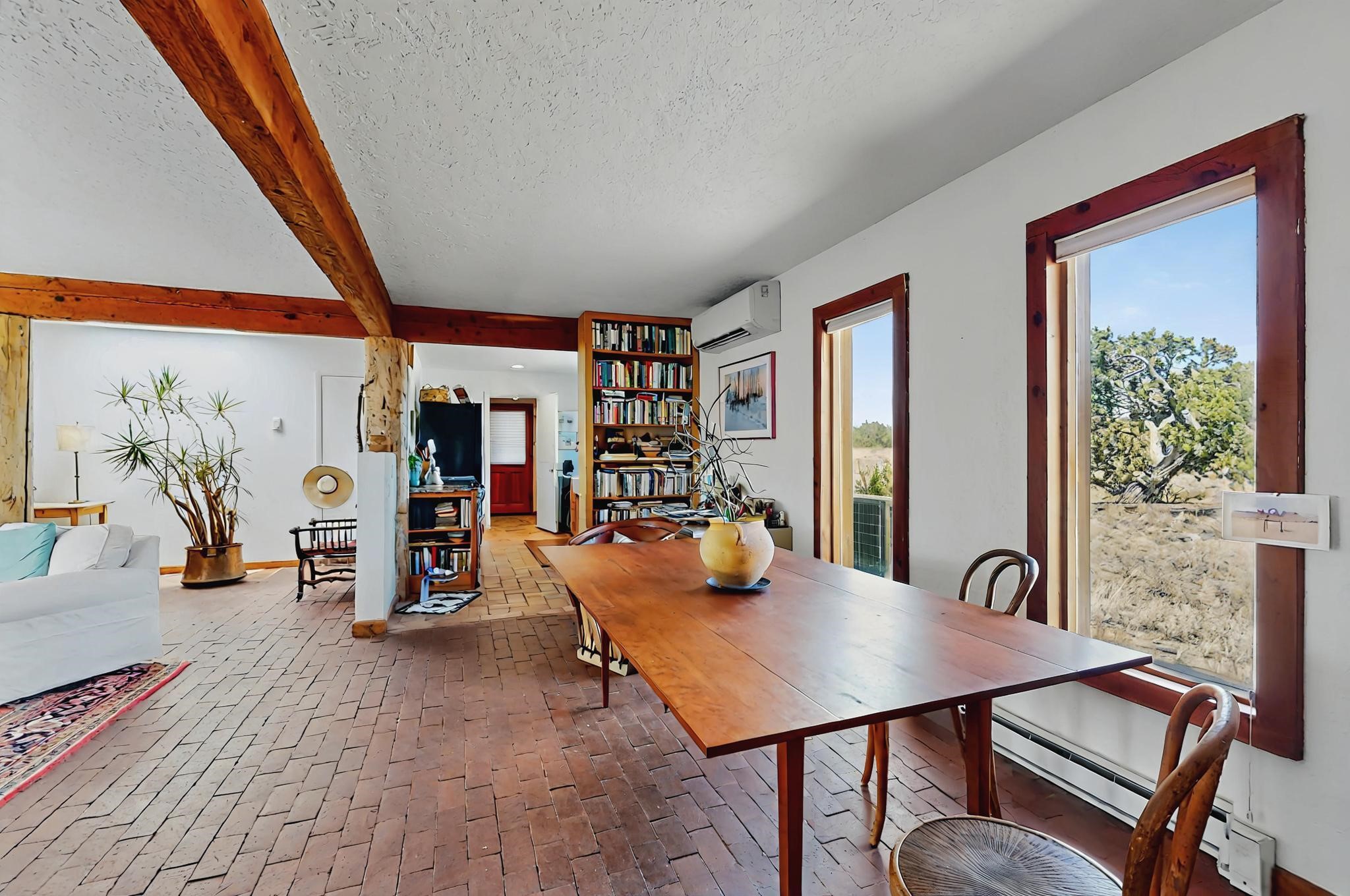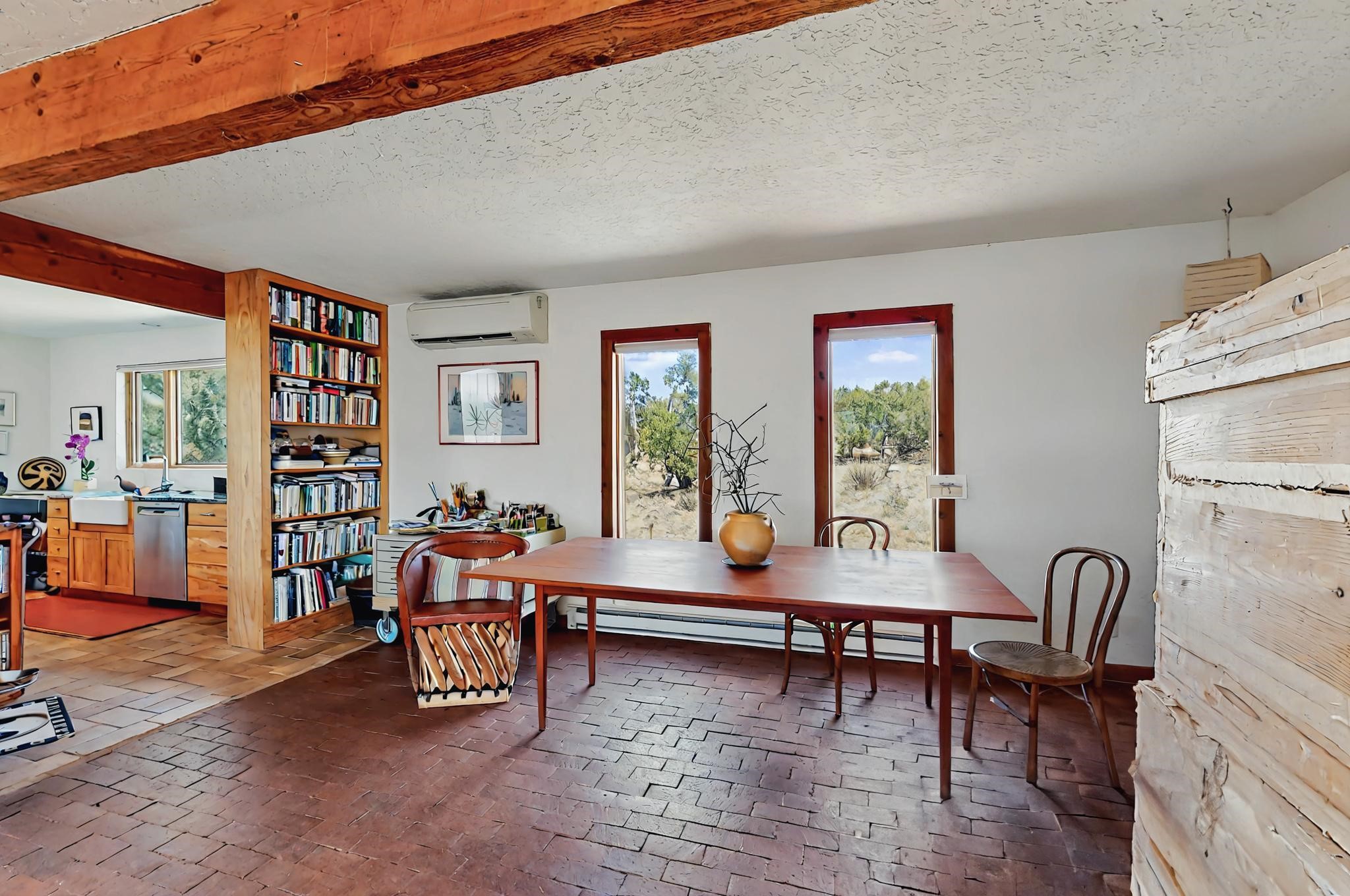 VIEWS VIEWS VIEWS from every room. Mountains, green belt and trees in a very private location. Traditional banco and kiva fireplace in living area, brick floors, and adobe wall at entry. Totally renovated kitchen with granite counters and totally renovated modern bathroom. Two bedrooms either side of updated bathroom have unfinished cement floors due to owner's allergies. Plantings on drip. 2 1/2 year old heat pump with electric baseboard backup; refrigerator 2020; dishwasher 2019; washing machine 2018; newer stucco with remaining 5 year warranty; roof refresh 2024 with 2 year warranty; water heater 2025. No VOC paints.