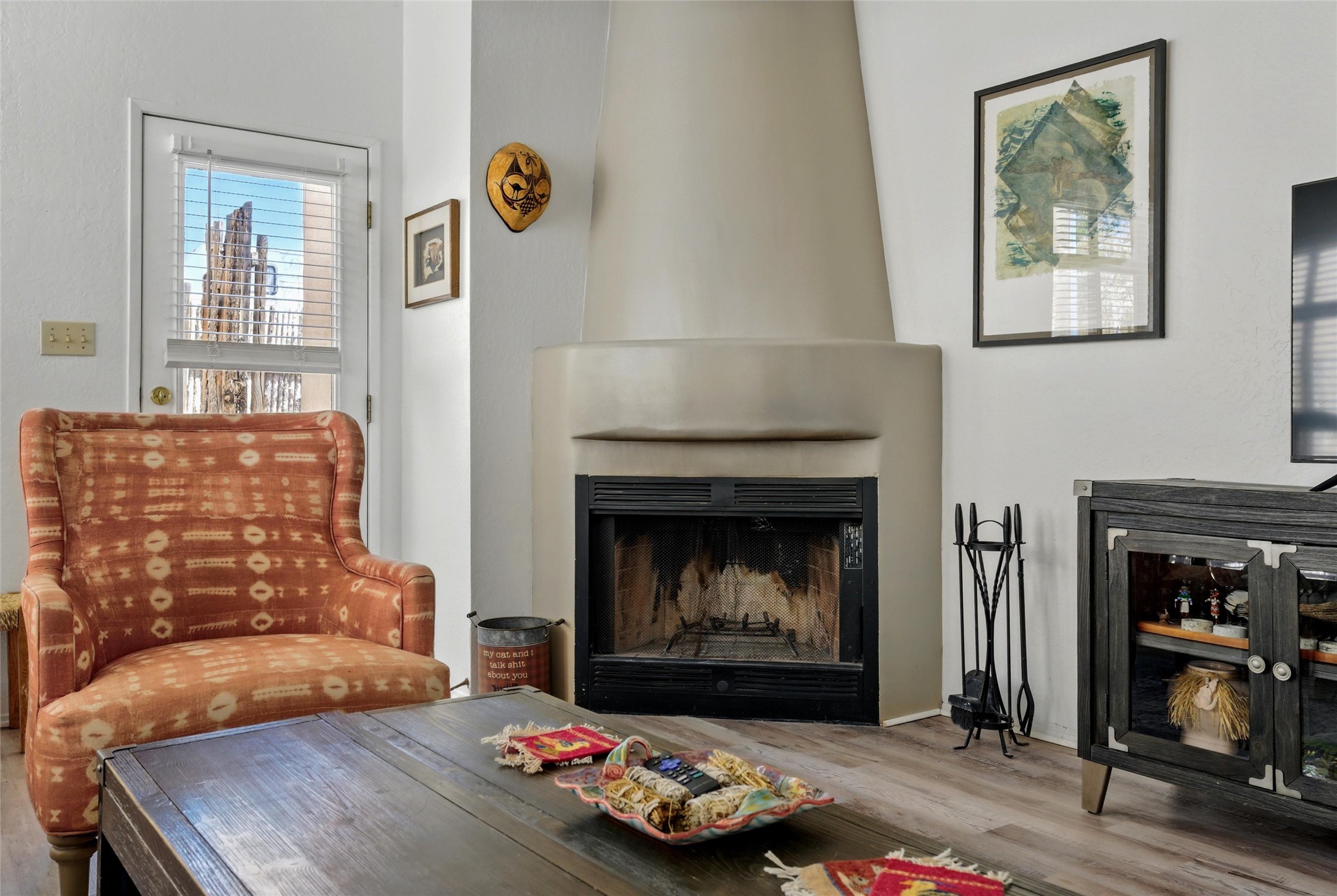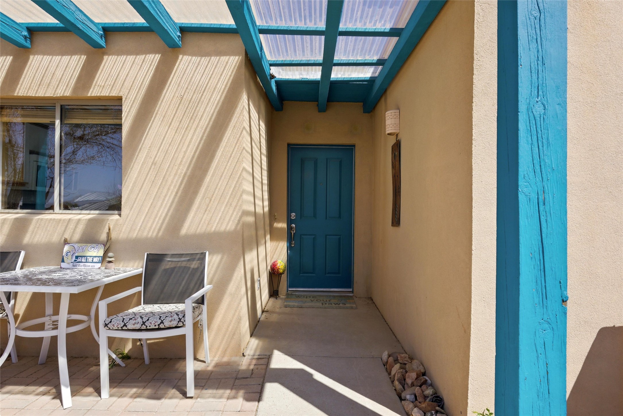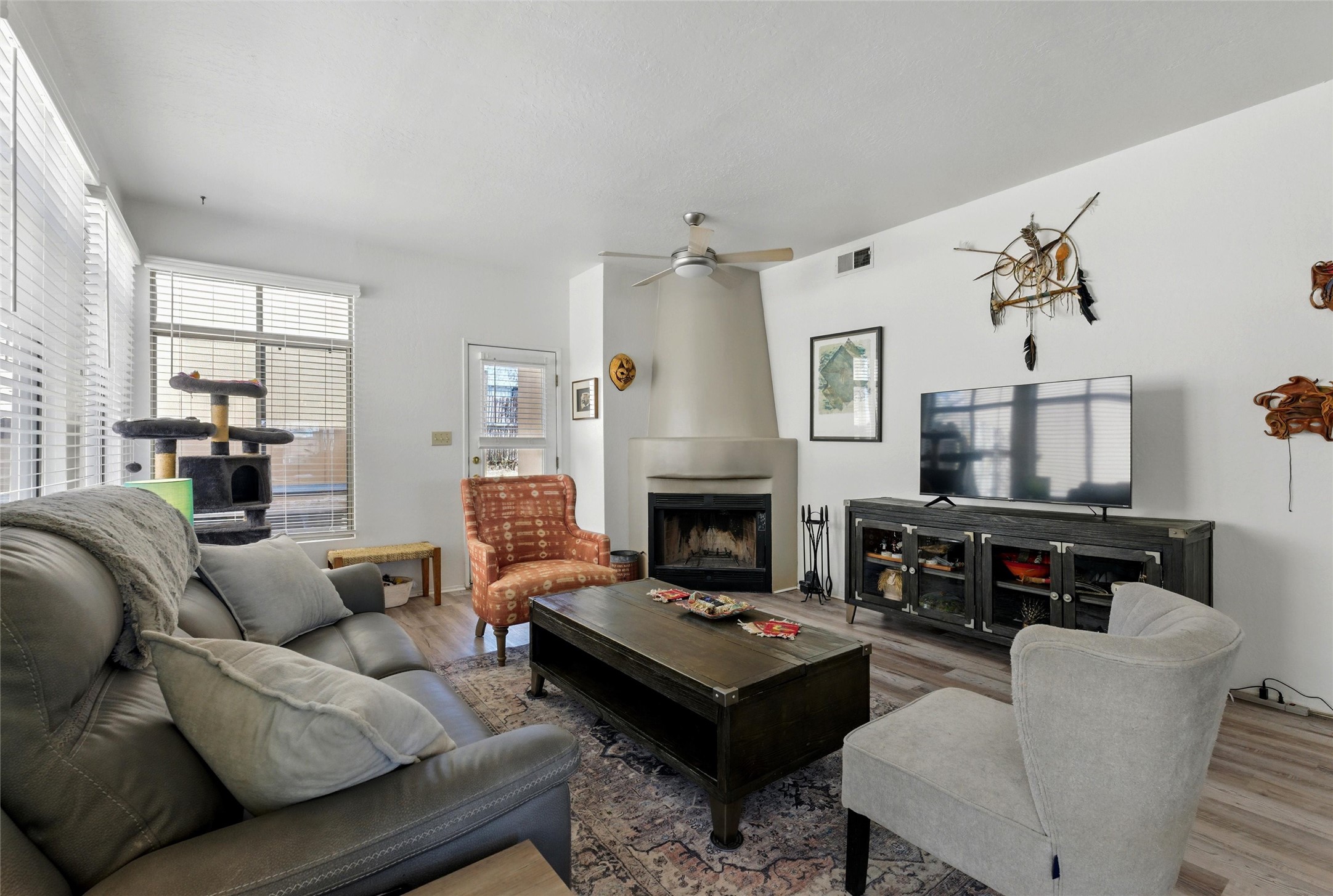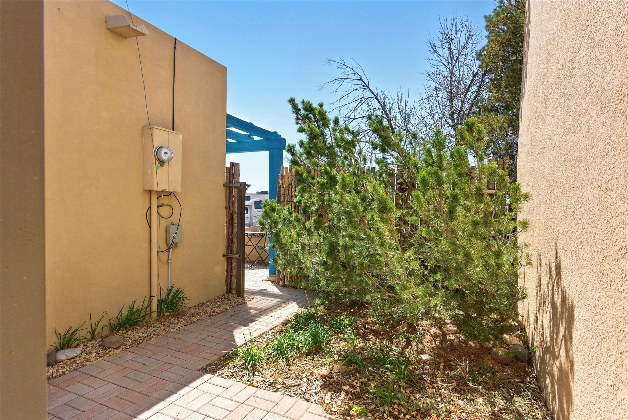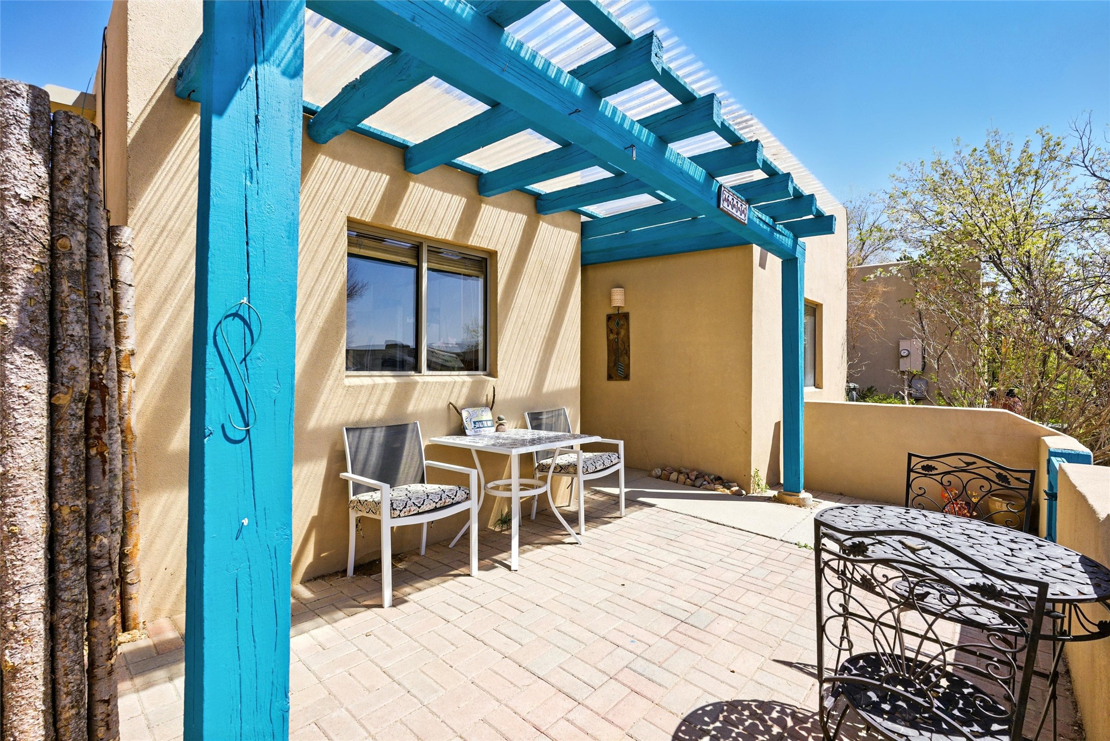 Charming 2-bed, 2-bath Pueblo-style home in the peaceful Los Milagros community. Features an open floor plan, Kiva fireplace, mountain views, landscaped yard, courtyard, and carport with storage. Located on a quiet cul-de-sac near shopping, schools, and the airport. Built in 1996, the home offers forced air heating, evaporative cooling, and a flat roof with classic Santa Fe stucco charm--perfect for low-maintenance living in a serene setting. This house is ideal for a family or investors alike.
