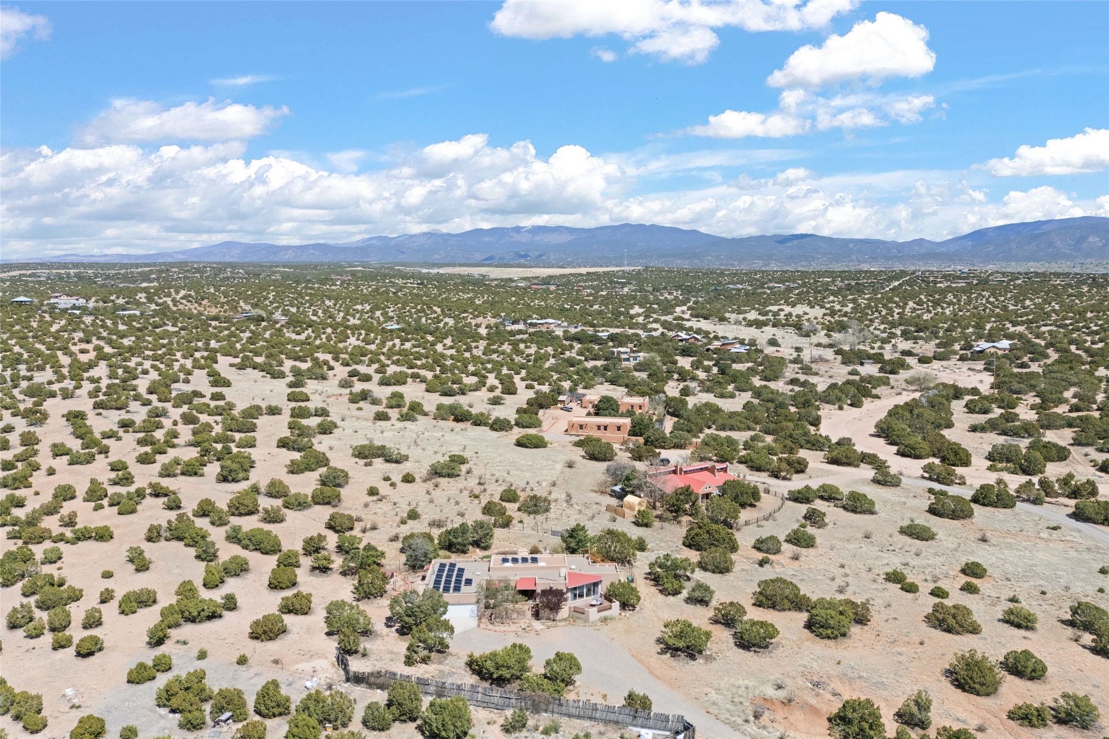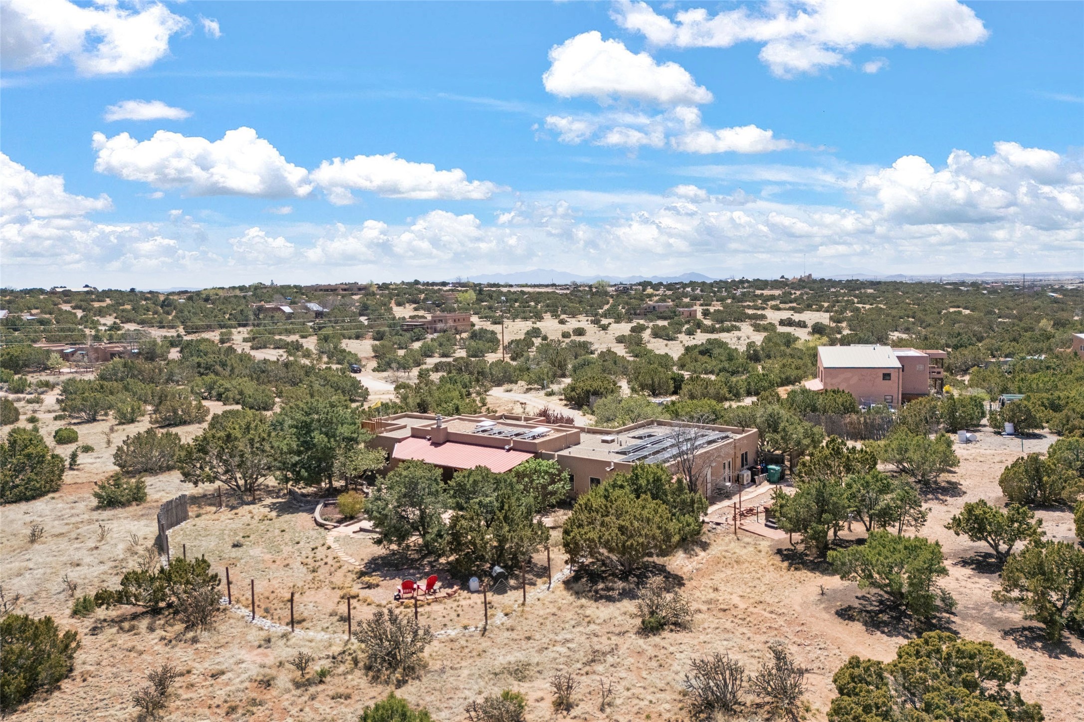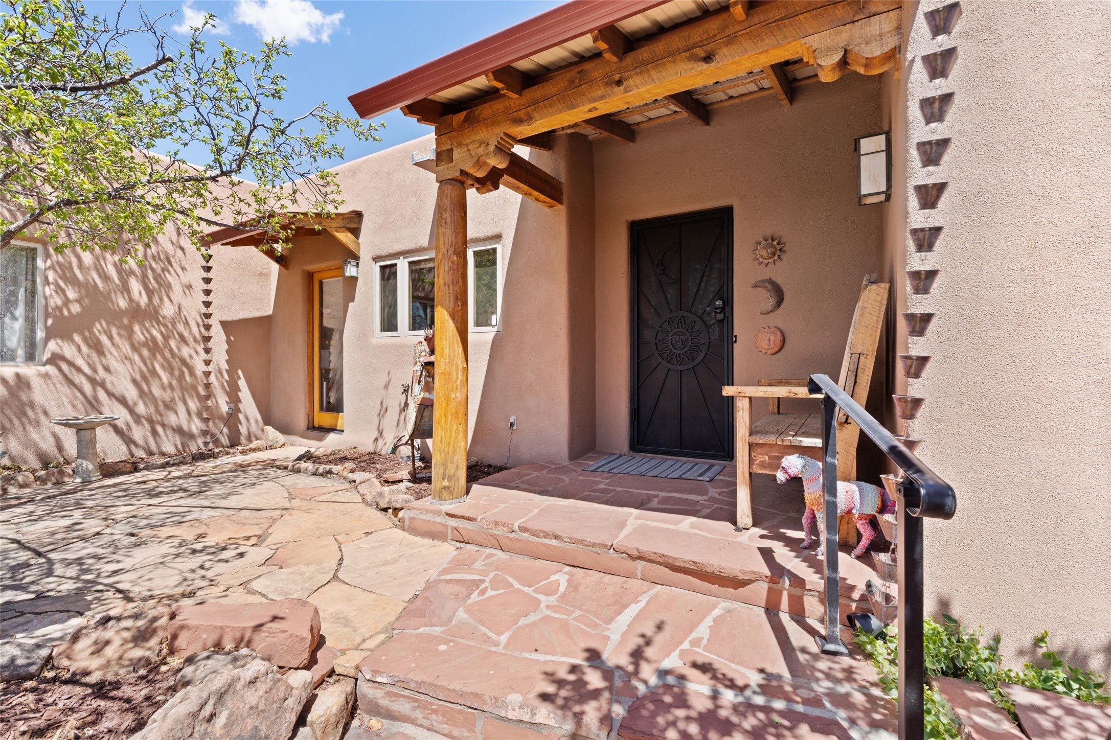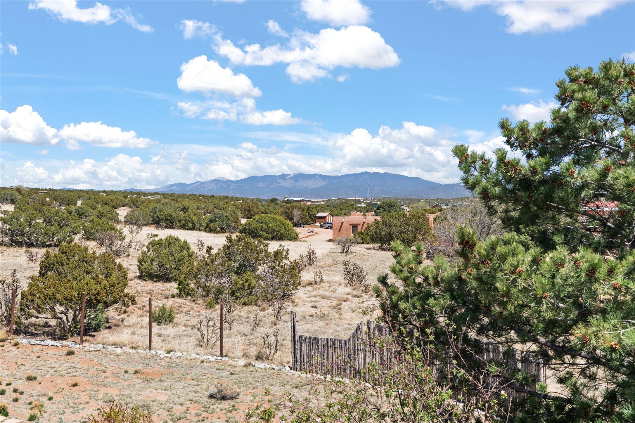 Welcome home to country living in the city with beautiful views in every direction! Enjoy the sunrise over the Sangre de Cristo's in the tastefully landscaped back portal and the sunset over the Jemez and Sandia mountains on the viewing deck off the sunroom or escape the sun in the spa off the primary bedroom at the north of the home. This 3 bedroom 2 bathroom pueblo style getaway has sleek concrete floors and a light and airy open living area with an extra space prime for a den. Peaceful and tranquil, 2.5 acres of lovely high desert expanse only a few miles from the downtown, ideally situated less than a mile off West Alameda. Oversized garage, solar powered, stairway to the roof to stargaze, fruit trees and pollinator garden and hiking trails all around. Also a great spot for dogs, with a large fenced in back yard and complete with custom doggie doors. Come and see, you'll be glad you did!