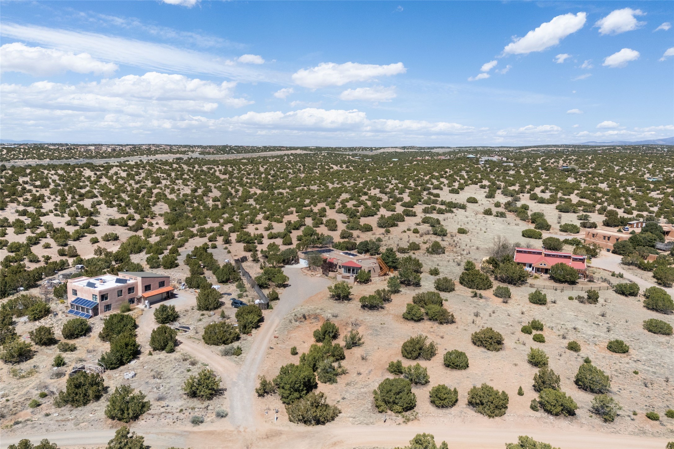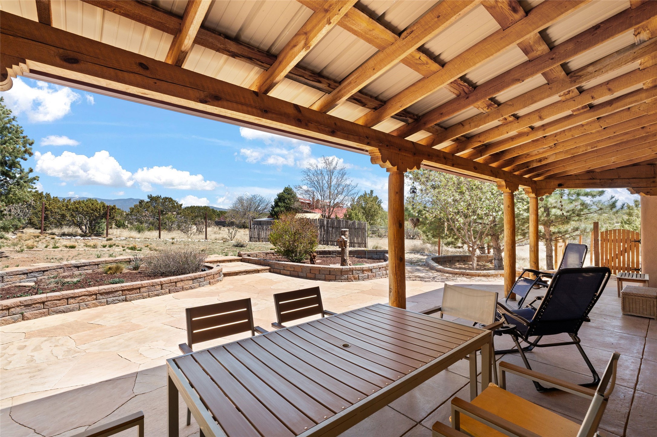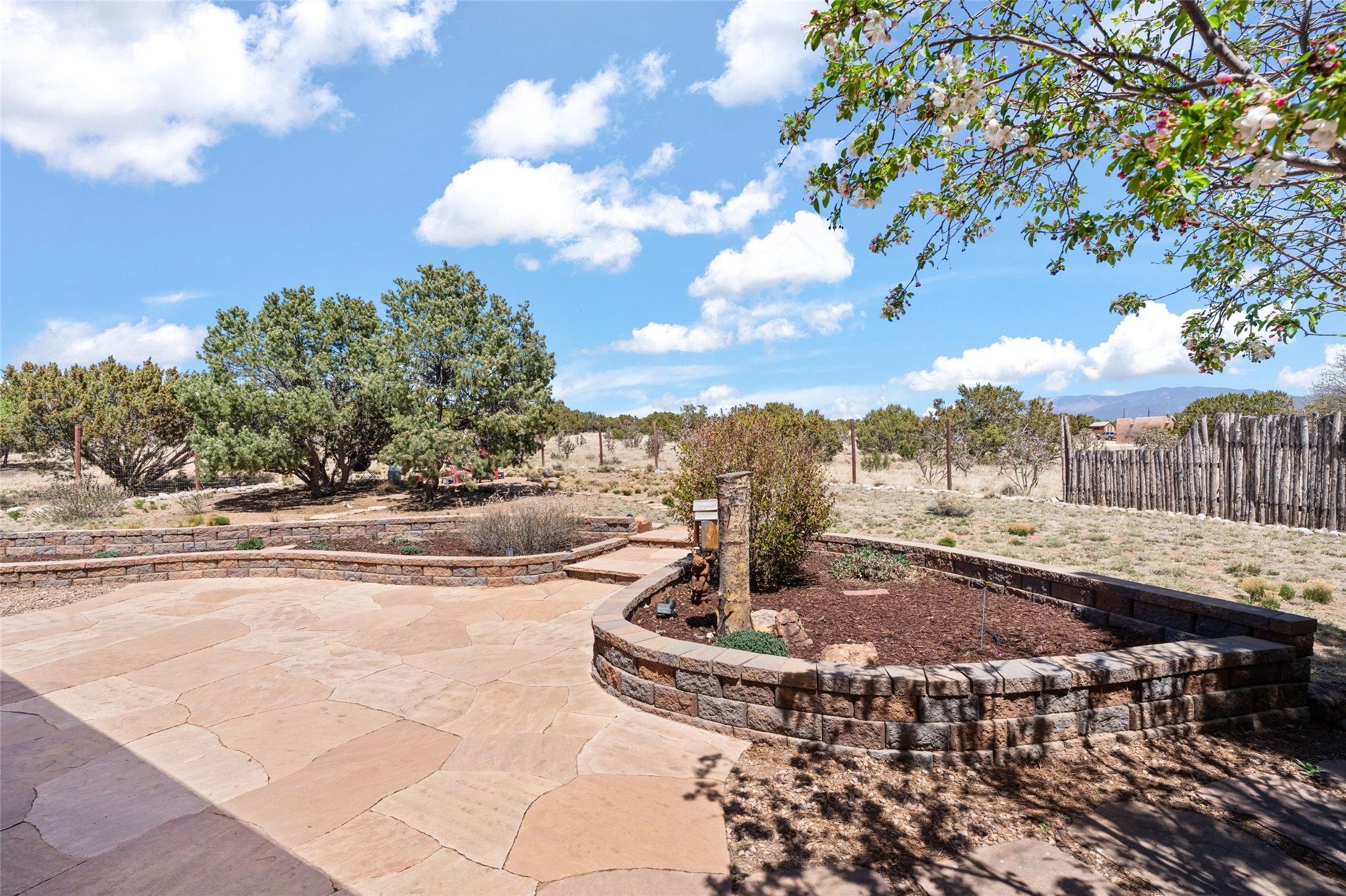 Welcome home to country living in the city with beautiful views in every direction! Enjoy the sunrise over the Sangre de Cristo's in the tastefully landscaped back portal and the sunset over the Jemez and Sandia mountains on the viewing deck off the sunroom or escape the sun in the spa off the primary bedroom at the north of the home. This 3 bedroom 2 bathroom pueblo style getaway has sleek concrete floors and a light and airy open living area with an extra space prime for a den. Peaceful and tranquil, 2.5 acres of lovely high desert expanse only a few miles from the downtown, ideally situated less than a mile off West Alameda. Oversized garage, solar powered, stairway to the roof to stargaze, fruit trees and pollinator garden and hiking trails all around. Also a great spot for dogs, with a large fenced in back yard and complete with custom doggie doors. Come and see, you'll be glad you did!