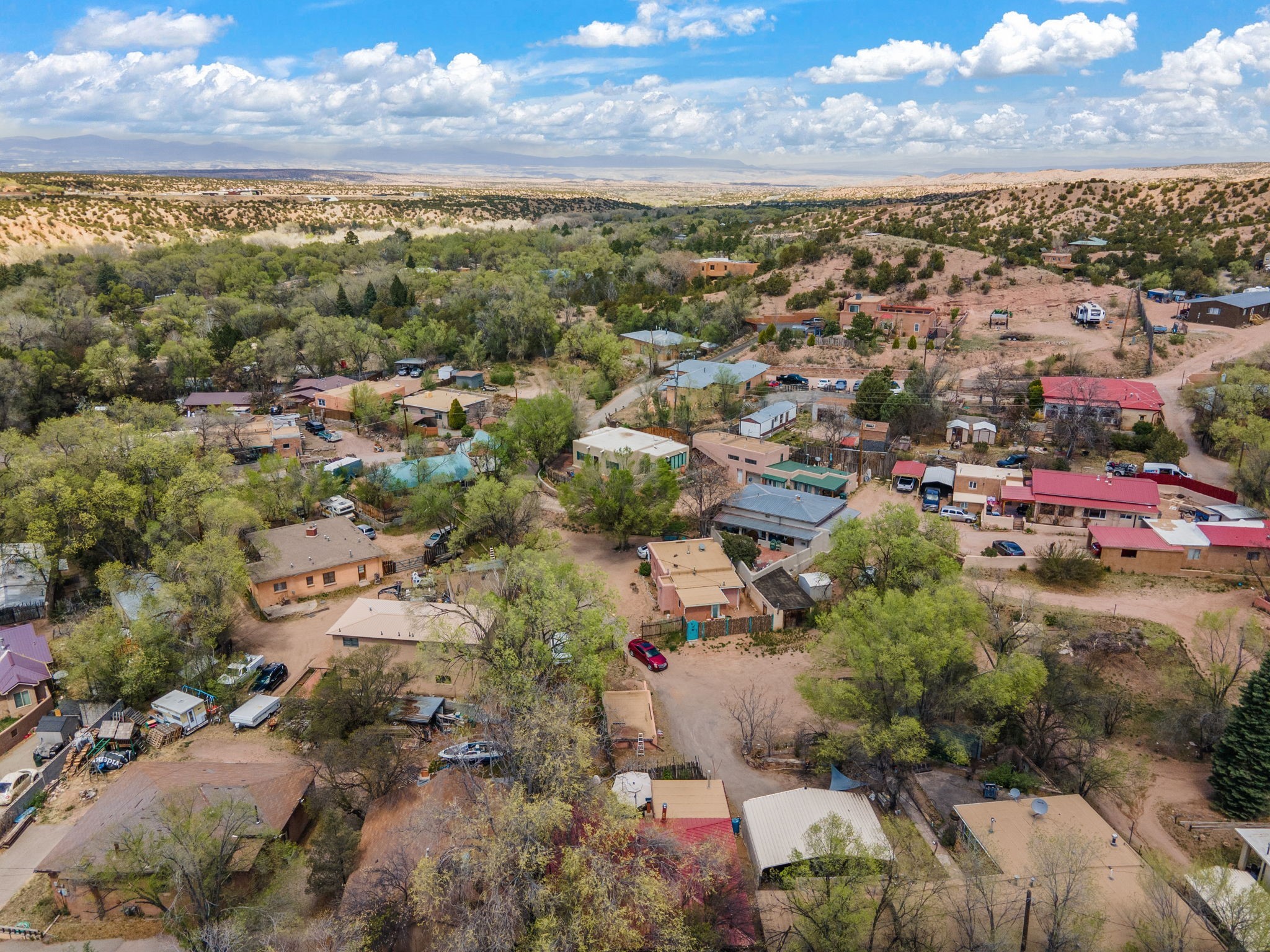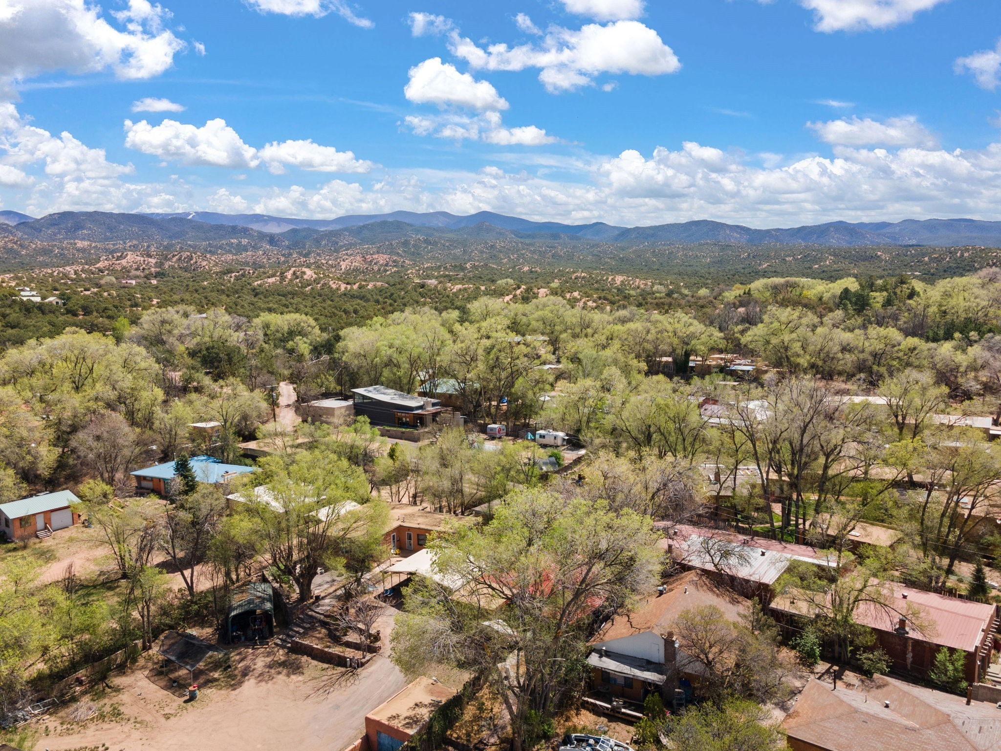 Nestled on a quiet, wooded lane just moments from the beloved Tesuque Market, this enchanting adobe residence, with its metal propanel roof, offers timeless New Mexico charm paired with thoughtful updates and serene outdoor living. A meandering brick pathway, lined with blooming tulips and spring bulbs, leads you from the front gate to a welcoming portal, setting the tone for the beauty that awaits inside. Step through the door and into a world of warmth and authenticity--hand-troweled plaster walls, Saltillo tile floors, and wide plank wood flooring create a rich, textured palette. The living room is a showstopper, infused with character featuring Mesquite wood end cut flooring. Eat-in kitchen area is grounded in history with rare 400-year-old walnut flooring. Coved ceilings with hand-hewn vigas add depth and tradition throughout the home. The sun-filled dining room is the heart of the home, featuring a striking corner Kiva fireplace with a cozy banco, perfect for intimate gatherings or peaceful mornings. A large picture window frames the lush, landscaped gardens like a living painting, making every meal feel like a celebration of nature. Newer windows throughout the home invite natural light while enhancing comfort and efficiency. Outside, your private oasis awaits. A tranquil onyx fountain adds gentle music to the air just below the shaded patio--an ideal setting for both relaxed lounging and al fresco dining. The fully fenced lot offers peace, privacy, and a connection to nature that's hard to find so close to town.This is more than a home--it's a soulful retreat that captures the essence of Tesuque living.