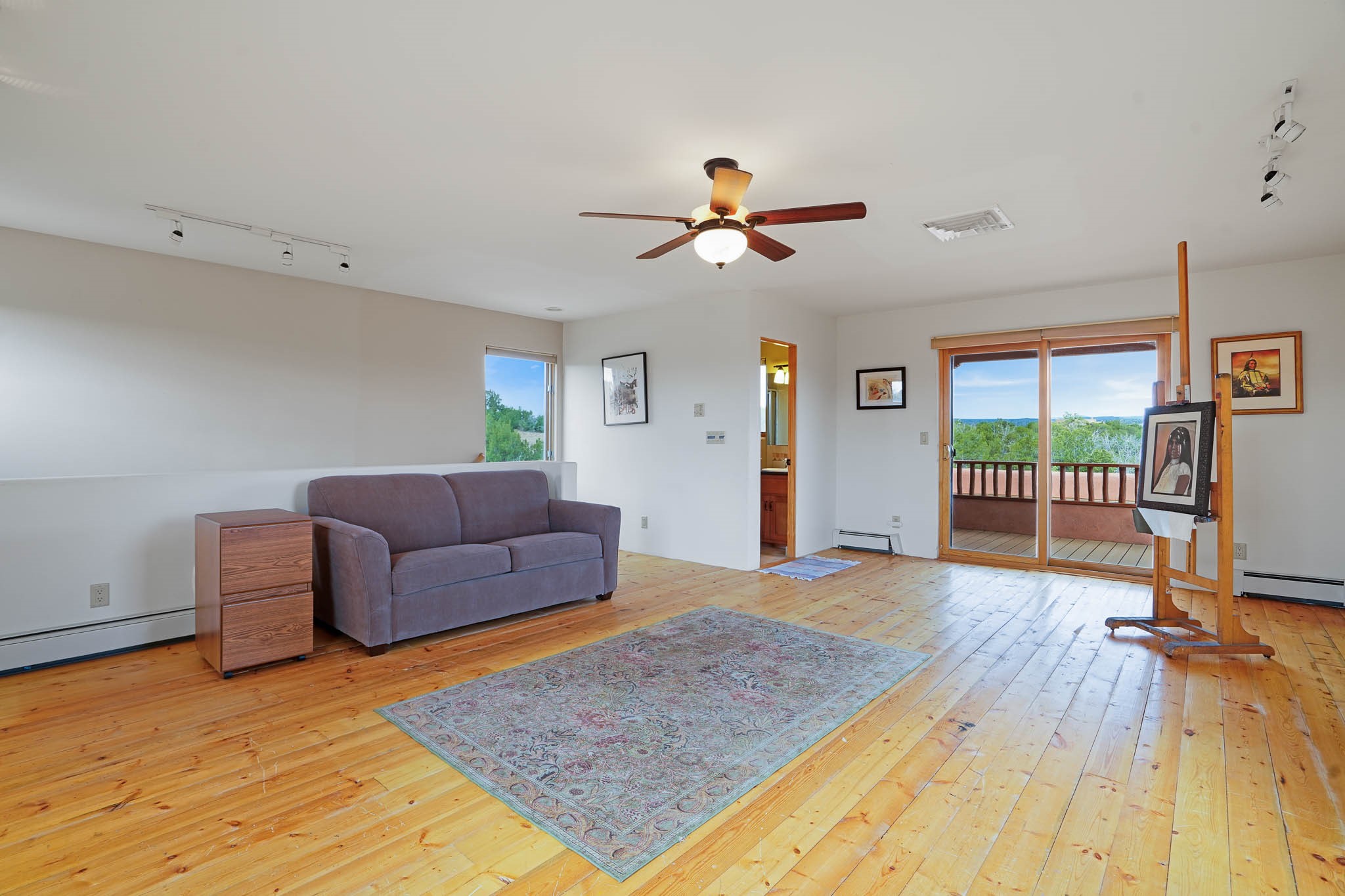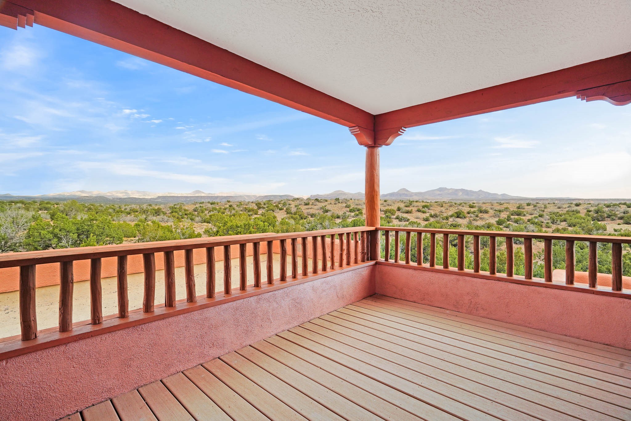 Perched near the top of Cochiti Lake, against the foothills of the Jemez Mountains, this two-story dwelling presents a fresh facade thanks to its recent exterior finish. The primary sleeping quarters reside on the entry level, offering ease of access. Inside, the lower level showcases sleek, modern surfaces underfoot. Gather around the warmth of the traditional hearth in the living space. The culinary area offers rich, cherry cabinetry complemented by gleaming stainless appliances. Experience comfortable warmth with the in-floor radiant heating system. Head upstairs to discover a versatile upper level with wood floors, perfect as a bedroom, creative workspace, or an additional private retreat. Step out onto the sheltered upper deck and be captivated by sweeping vistas encompassing the majestic Jemez range, the ancient landscape of Bandelier, and the iconic silhouette of St. Peter's Dome. A single-car garage provides sheltered parking. Enjoy the proximity to the recreational waters of Cochiti Lake, nearby links for the golf enthusiast, and trails system right out the front door. Call for your showing today!