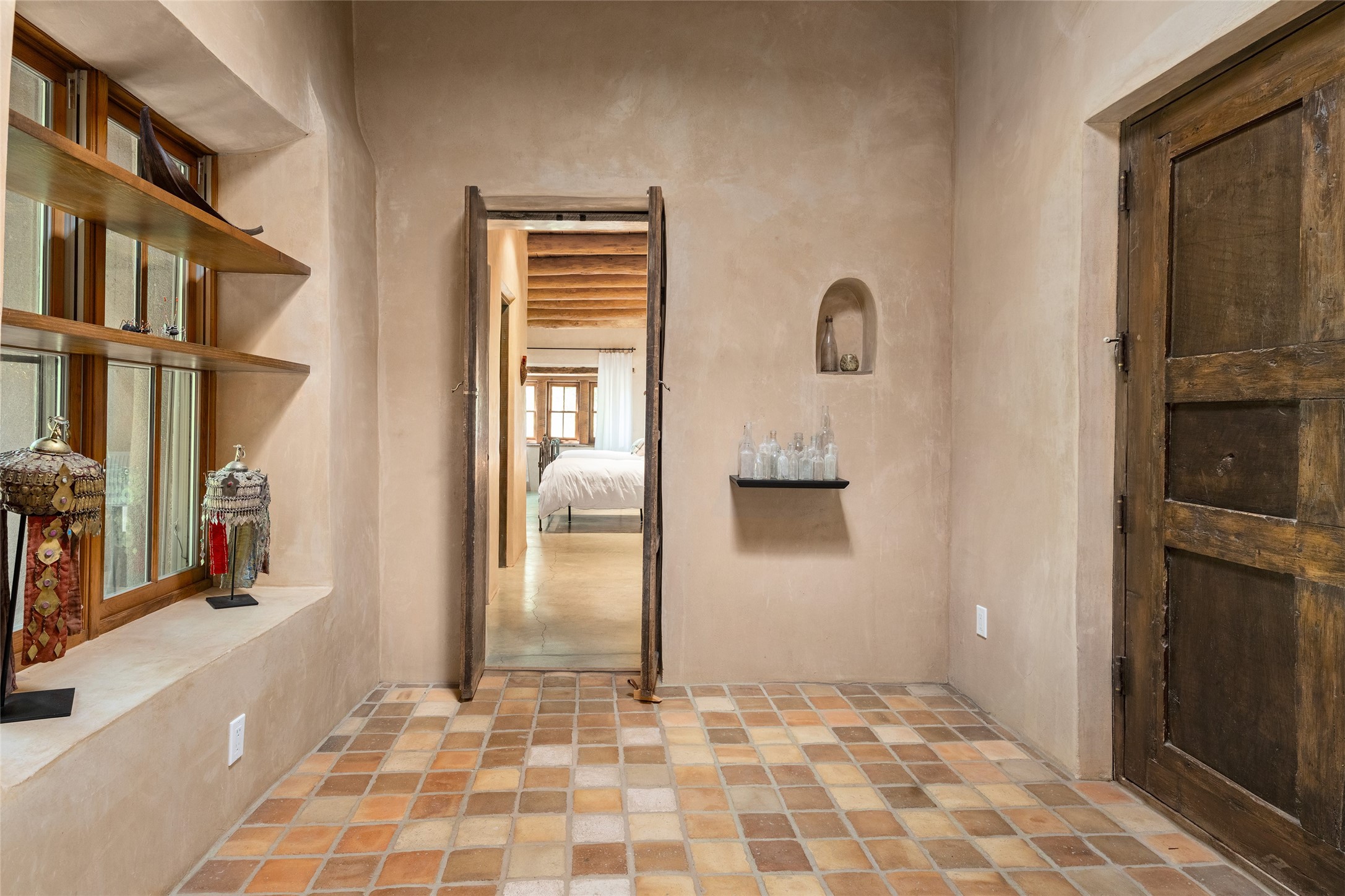 Historic Adobe Oasis on the Galisteo CreekCreate your own paradise along the Galisteo Creek. This stunning 6.39 acre estate offers a compelling blend of historic character, traditional craftsmanship, and natural beauty. A renovated 2 bed, 2 bath double adobe main residence, and a charming 1 bedroom, 1 bath guest quarters create a private compound offering the best of old and new in the heart of one of New Mexico's most storied villages, all a mere 30 minute drive from Santa Fe.The main home features 2 bedrooms and 2.5 baths, showcasing hand-plastered walls, vigas, latillas, deep adobe walls, high ceilings and wood-burning fireplaces that reflect the architectural heritage of the area, enhanced by historic ruins on the property dating back to 1880. Thoughtful renovations and preservation work ensure modern comfort while honoring the property's authenticity.Residents and guests will appreciate the privacy of the split floor plan, with the two bedroom suites separate and serene, each featuring their own cozy fireplace and en suite bath. The large kitchen boasts an equally large butlers pantry. It's a generous amount of space allowing for a multifaceted culinary experience. Set beneath majestic cottonwoods in a park-like setting, surrounded by lush irrigated landscaping, the grounds are verdant with fruit trees and flower gardens. Proximity to the Galisteo Creek enhances the sense of abundance and connection, with expansive portals and shaded outdoor spaces ideal for quiet retreat or entertaining.The separate guest house offers its own living space with a kitchenette and bath, ideal for hosting guests or tenants. It has also been used as an artist studio as the concrete floors allow for being creative. There is a large barn door that opens out to a small porch perfect for a lovely evening dinner. Experience this rare, water-adjacent adobe property in an artistic community full of heritage and natural splendor.