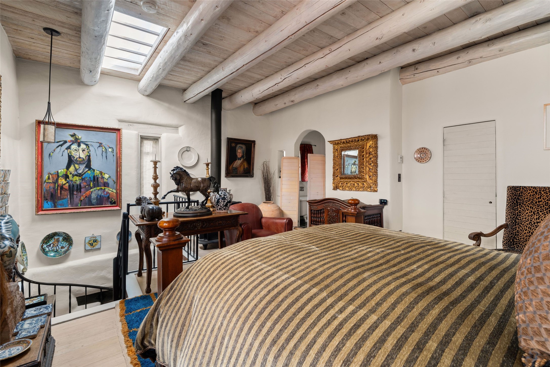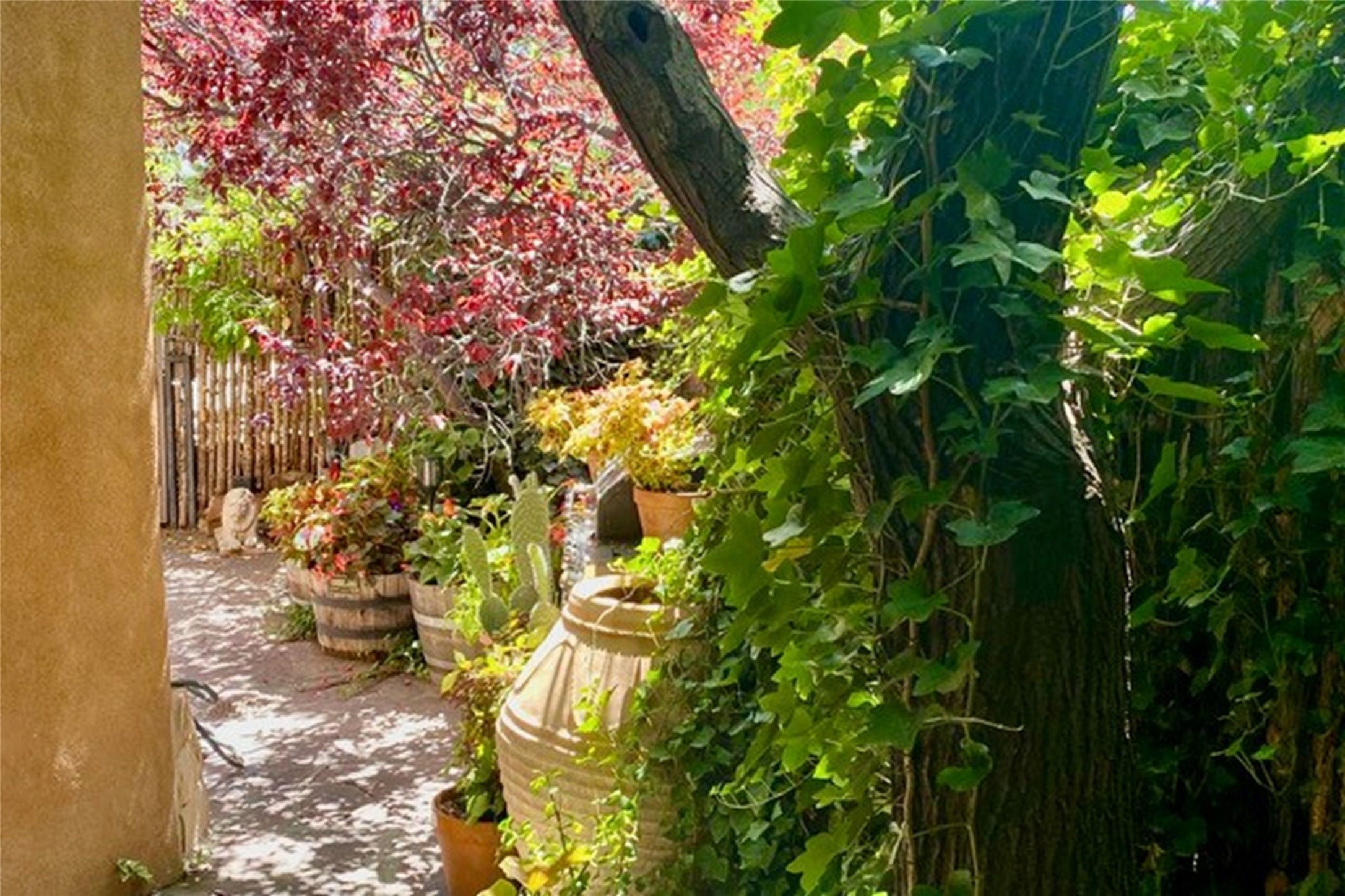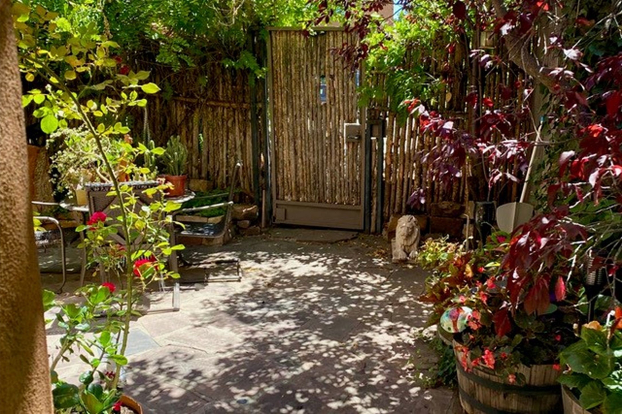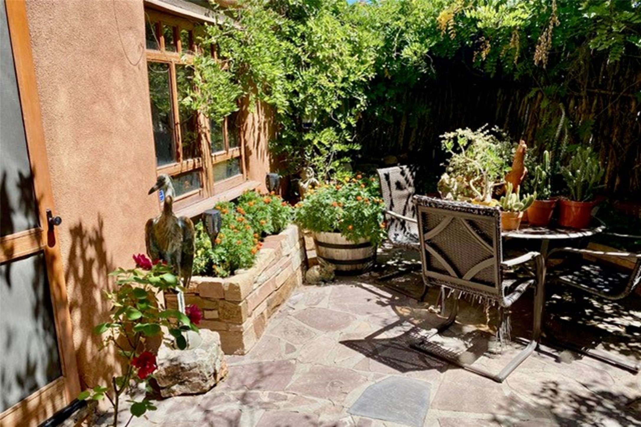 Situated in a downtown Santa Fe compound rich in history, this sophisticated and fully landscaped property represents a crown jewel in city architecture. Positioned on a quiet landscaped hilltop above Palace Avenue with convenient walkability to Canyon Road restaurants and galleries, riverside walking and bike trails, as well as the endless cultural attractions of the Santa Fe Plaza. Timeless in design and meticulously handcrafted, this adobe and frame compound in Santa Fe's highly desired Historic Eastside neighborhood was originally envisioned by a Frank Lloyd Wright trained architect to incorporate privacy, custom Pueblo design, and organic building techniques, while emphasizing an indoor-outdoor way of life borrowed heavily from Old World design. This two-bedroom and 1-3/4 bathroom, two-story condo has a spacious downstairs area perfect for an office or an additional bedroom. The flowing continuity of the adobe wall blends seamlessly with the cascade of organic wood details and hand laid bricked floors. The entire walled front and back exterior spaces are shaded and private, with seasonal landscaping and mature trees creating a visual canopy. The primary suite, anchored with a cozy wood stove, looks out to a rooftop view and is separated from the secondary bedroom. A bright and functional kitchen is located just off the large living area with a sensually designed corner wood-burning fireplace, a perfect union for entertaining and social gatherings. The owners' downstairs office space looks out onto the front gated and landscaped patio. Awash in natural light and replete with comfort, as well as in-town quiet privacy, the home also features radiant in-floor and baseboard heating, vigas, latillas, corbels, and skylights throughout the home enveloping the owner and guest in calm sophistication. Organic in feel, this property exudes an old-world charm difficult to find in many modern cities.