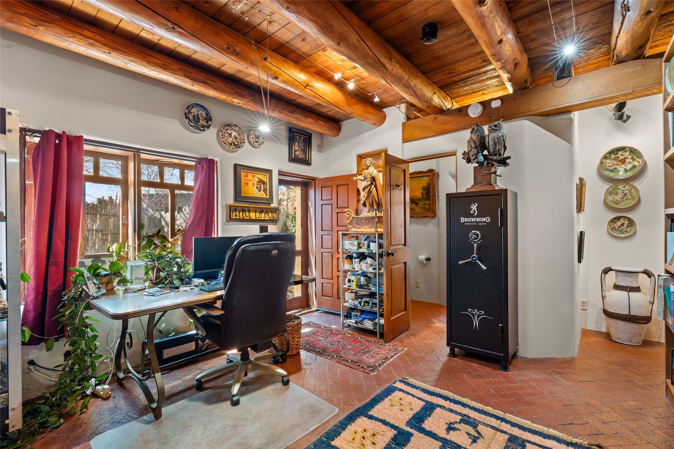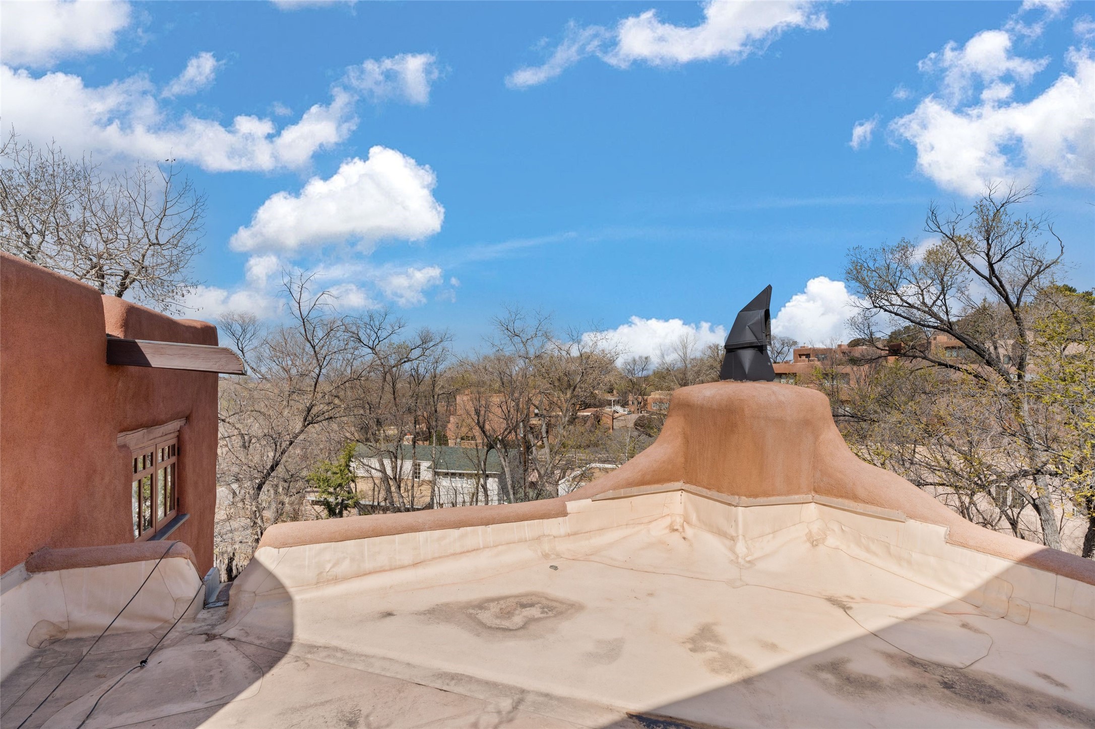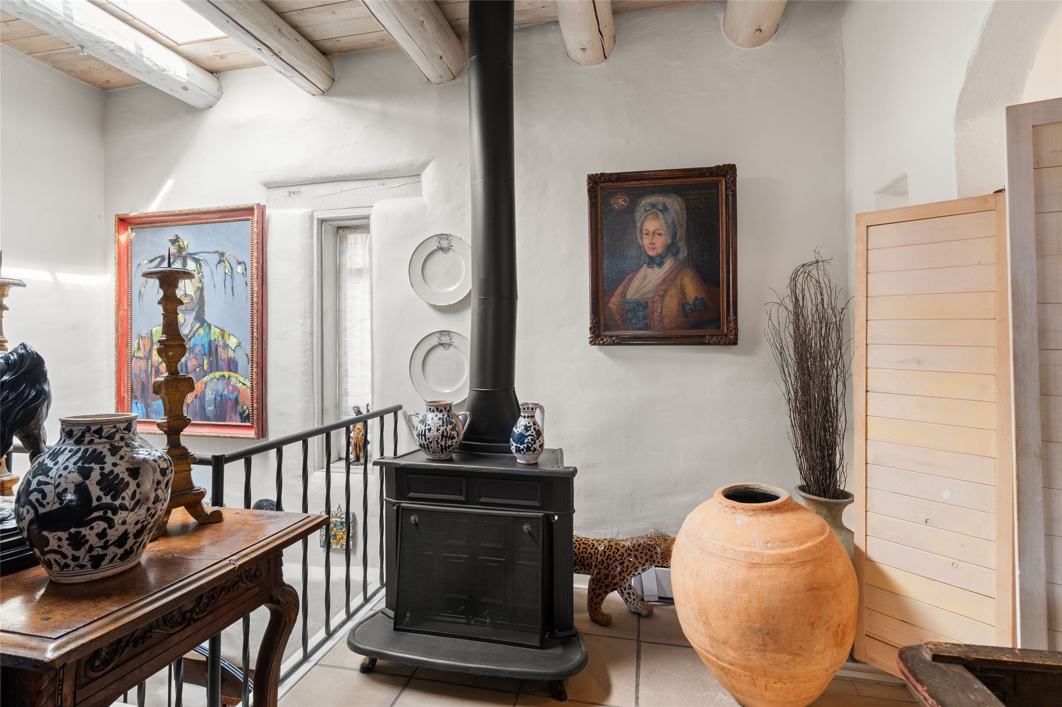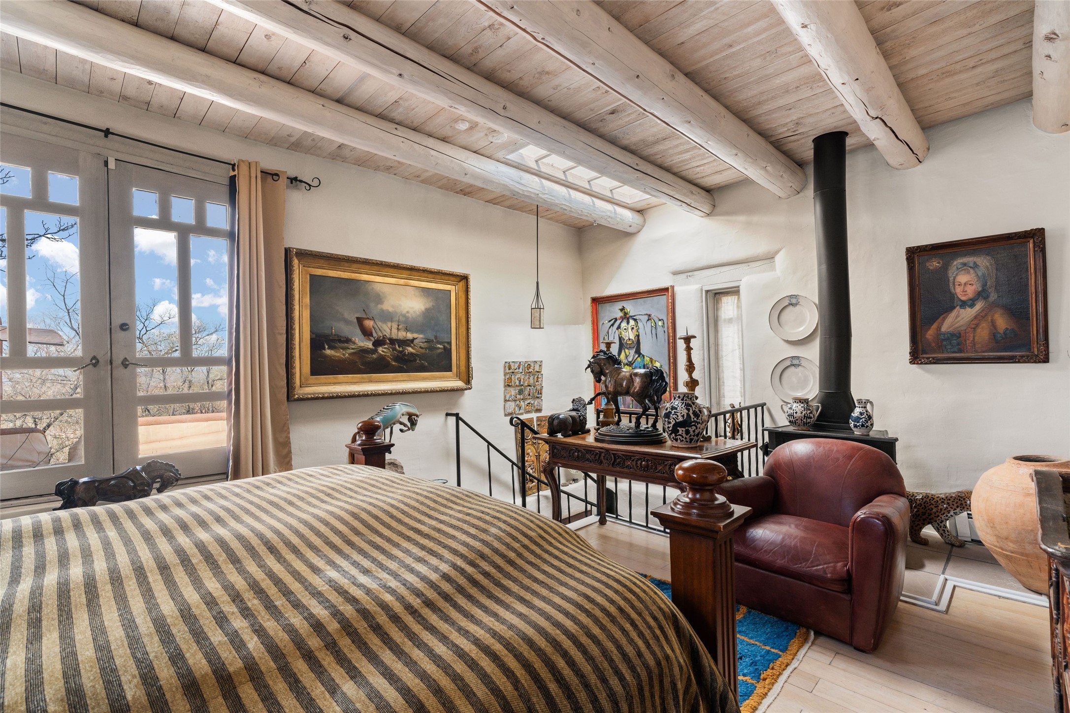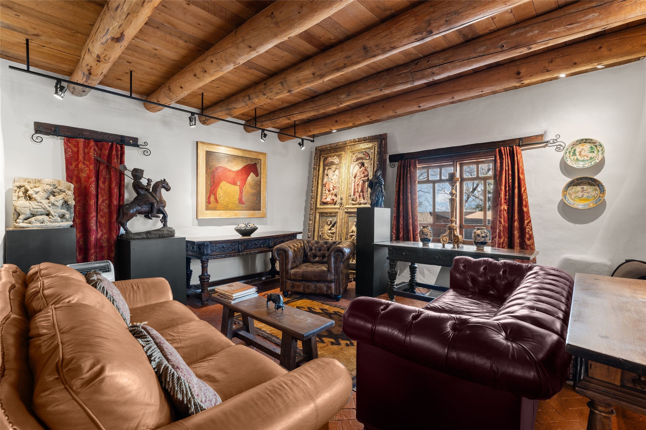 Situated in a downtown Santa Fe compound rich in history, this sophisticated and fully landscaped property represents a crown jewel in city architecture. Positioned on a quiet landscaped hilltop above Palace Avenue with convenient walkability to Canyon Road restaurants and galleries, riverside walking and bike trails, as well as the endless cultural attractions of the Santa Fe Plaza. Timeless in design and meticulously handcrafted, this adobe and frame compound in Santa Fe's highly desired Historic Eastside neighborhood was originally envisioned by a Frank Lloyd Wright trained architect to incorporate privacy, custom Pueblo design, and organic building techniques, while emphasizing an indoor-outdoor way of life borrowed heavily from Old World design. This two-bedroom and 1-3/4 bathroom, two-story condo has a spacious downstairs area perfect for an office or an additional bedroom. The flowing continuity of the adobe wall blends seamlessly with the cascade of organic wood details and hand laid bricked floors. The entire walled front and back exterior spaces are shaded and private, with seasonal landscaping and mature trees creating a visual canopy. The primary suite, anchored with a cozy wood stove, looks out to a rooftop view and is separated from the secondary bedroom. A bright and functional kitchen is located just off the large living area with a sensually designed corner wood-burning fireplace, a perfect union for entertaining and social gatherings. The owners' downstairs office space looks out onto the front gated and landscaped patio. Awash in natural light and replete with comfort, as well as in-town quiet privacy, the home also features radiant in-floor and baseboard heating, vigas, latillas, corbels, and skylights throughout the home enveloping the owner and guest in calm sophistication. Organic in feel, this property exudes an old-world charm difficult to find in many modern cities.