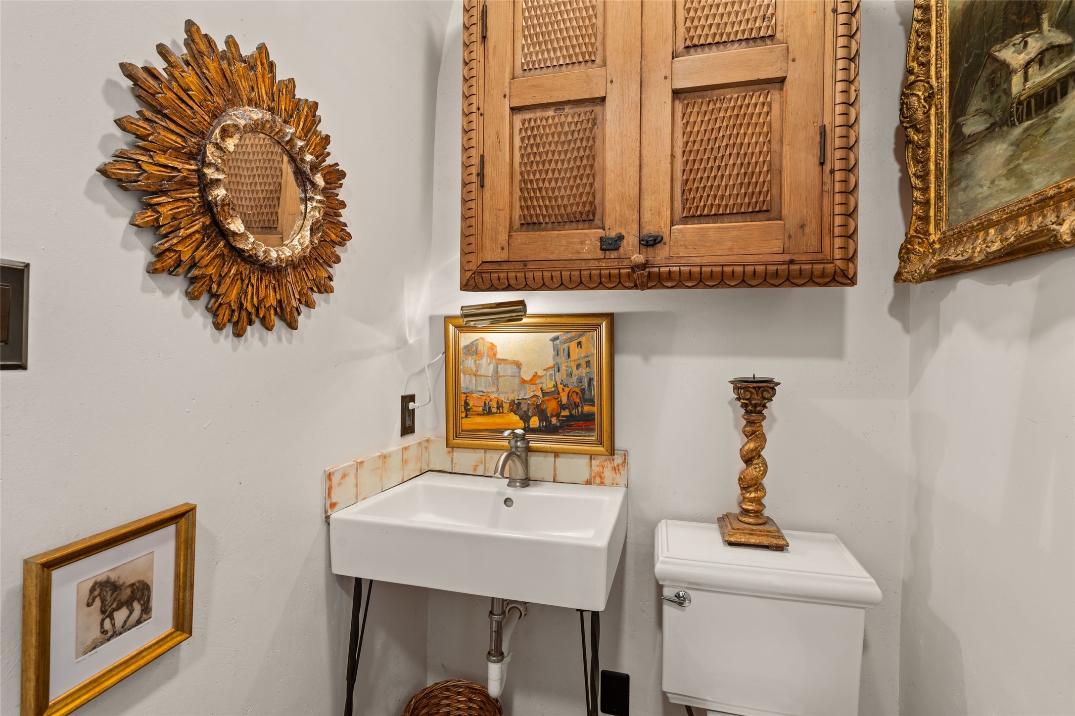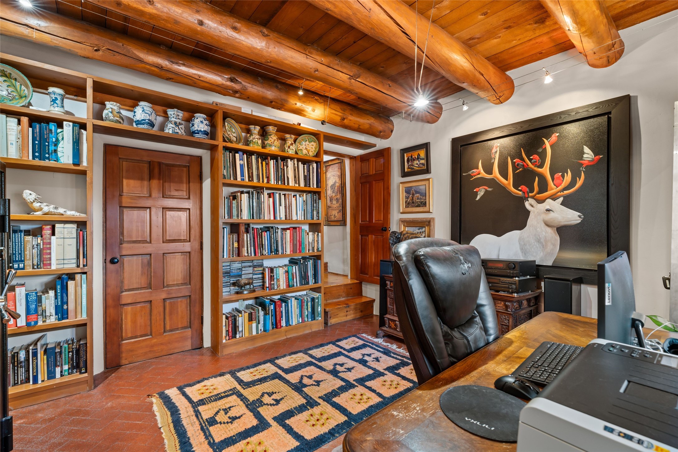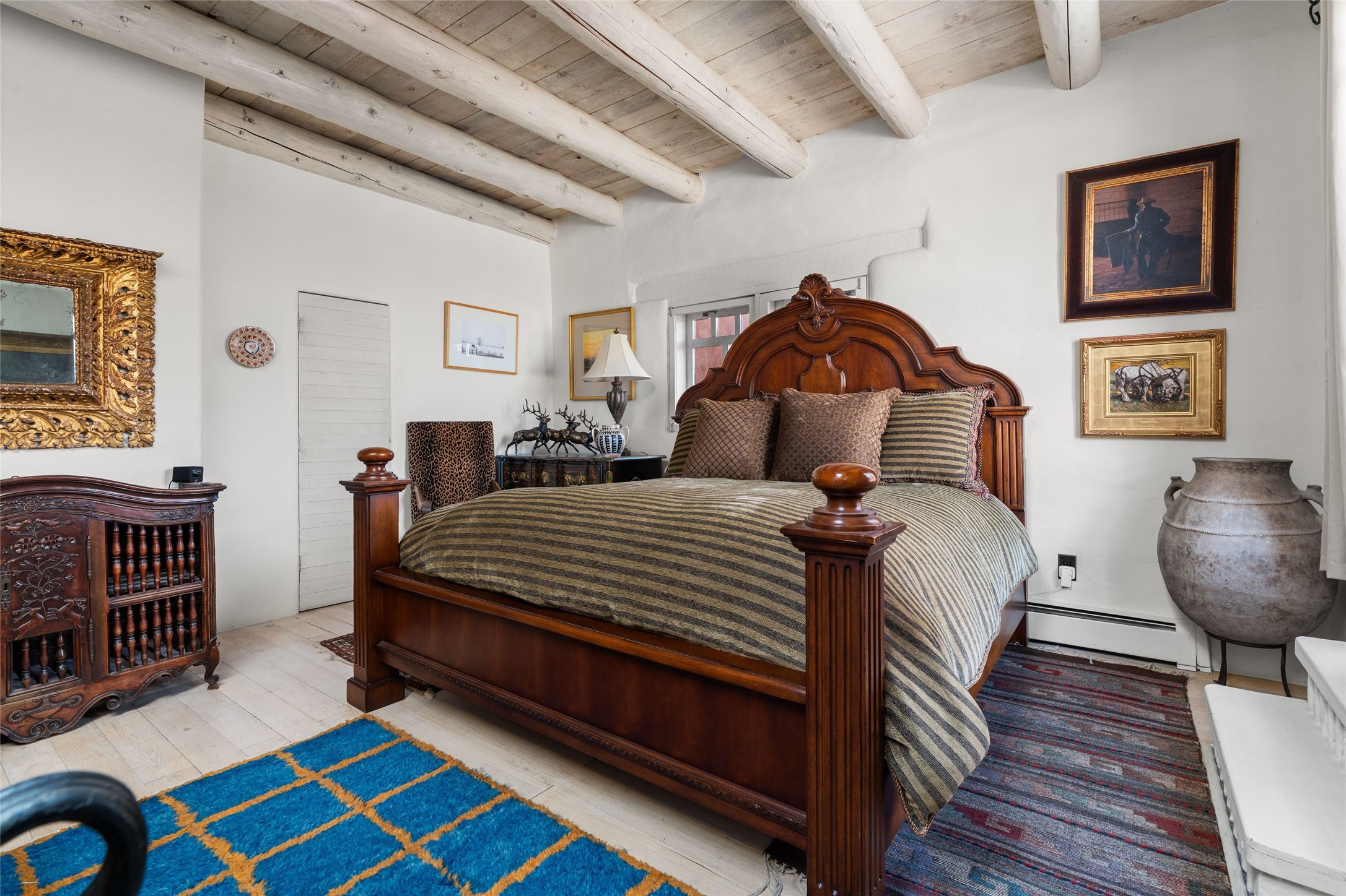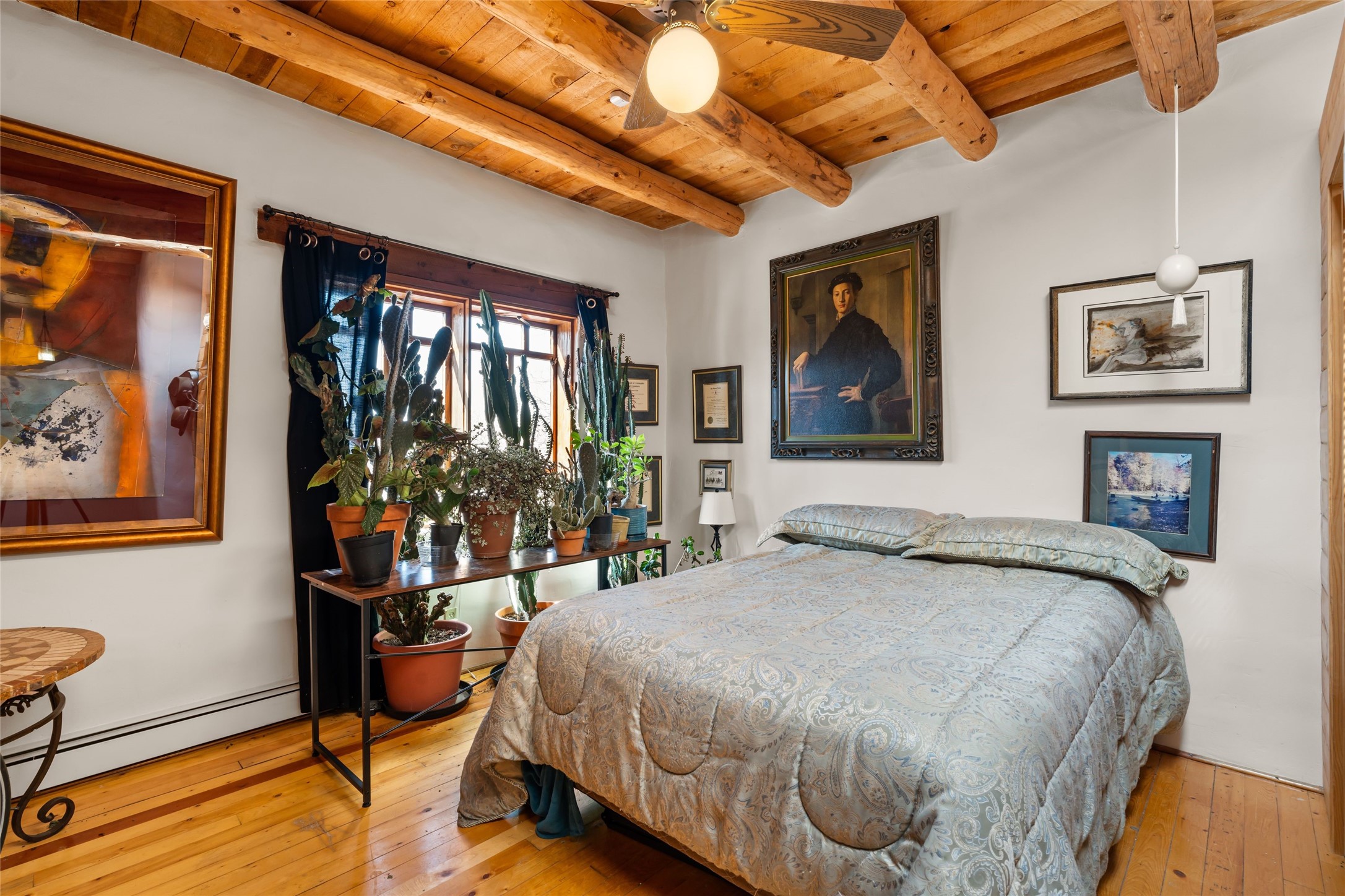 Situated in a downtown Santa Fe compound rich in history, this sophisticated and fully landscaped property represents a crown jewel in city architecture. Positioned on a quiet landscaped hilltop above Palace Avenue with convenient walkability to Canyon Road restaurants and galleries, riverside walking and bike trails, as well as the endless cultural attractions of the Santa Fe Plaza. Timeless in design and meticulously handcrafted, this adobe and frame compound in Santa Fe's highly desired Historic Eastside neighborhood was originally envisioned by a Frank Lloyd Wright trained architect to incorporate privacy, custom Pueblo design, and organic building techniques, while emphasizing an indoor-outdoor way of life borrowed heavily from Old World design. This two-bedroom and 1-3/4 bathroom, two-story condo has a spacious downstairs area perfect for an office or an additional bedroom. The flowing continuity of the adobe wall blends seamlessly with the cascade of organic wood details and hand laid bricked floors. The entire walled front and back exterior spaces are shaded and private, with seasonal landscaping and mature trees creating a visual canopy. The primary suite, anchored with a cozy wood stove, looks out to a rooftop view and is separated from the secondary bedroom. A bright and functional kitchen is located just off the large living area with a sensually designed corner wood-burning fireplace, a perfect union for entertaining and social gatherings. The owners' downstairs office space looks out onto the front gated and landscaped patio. Awash in natural light and replete with comfort, as well as in-town quiet privacy, the home also features radiant in-floor and baseboard heating, vigas, latillas, corbels, and skylights throughout the home enveloping the owner and guest in calm sophistication. Organic in feel, this property exudes an old-world charm difficult to find in many modern cities.