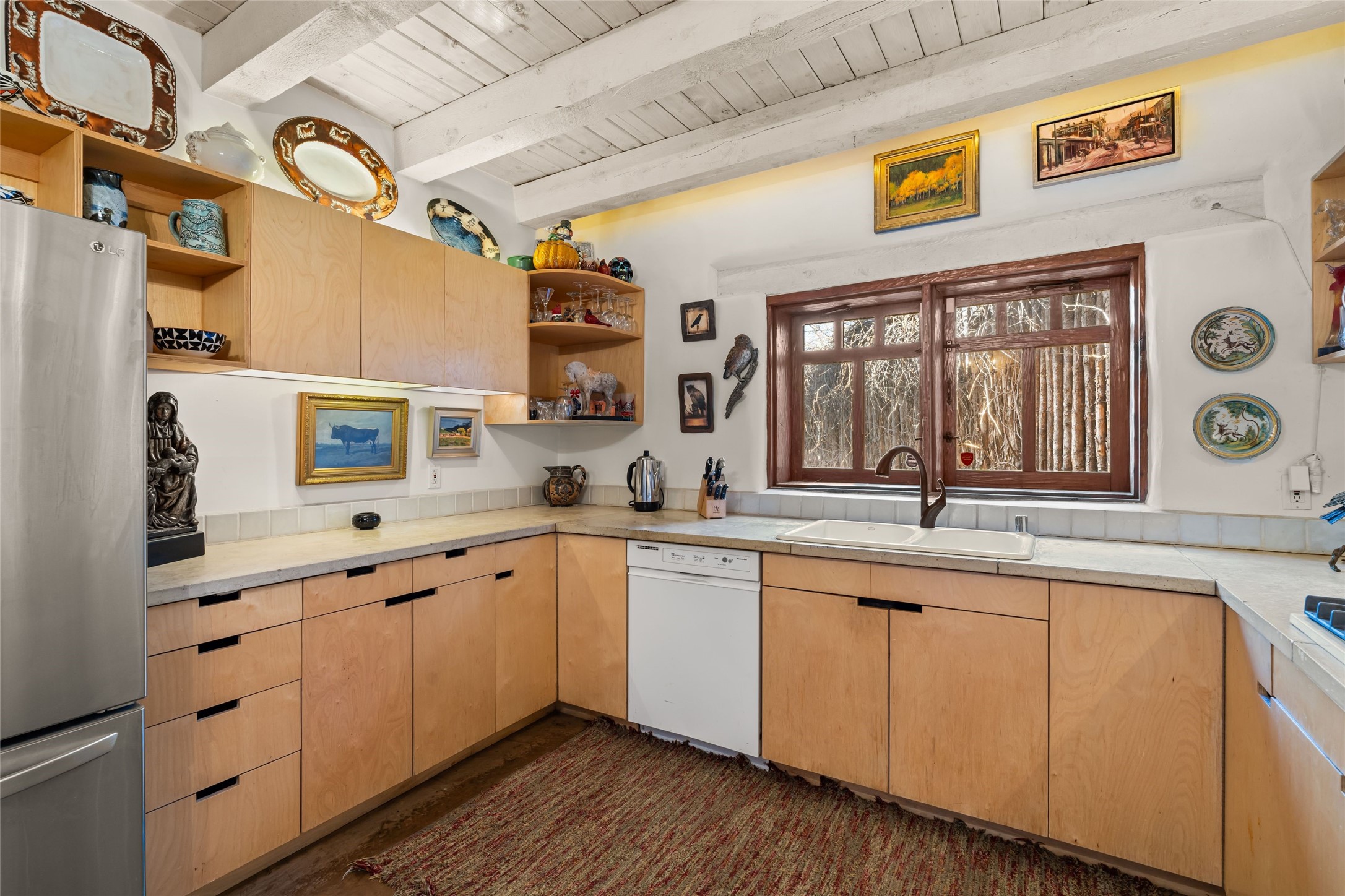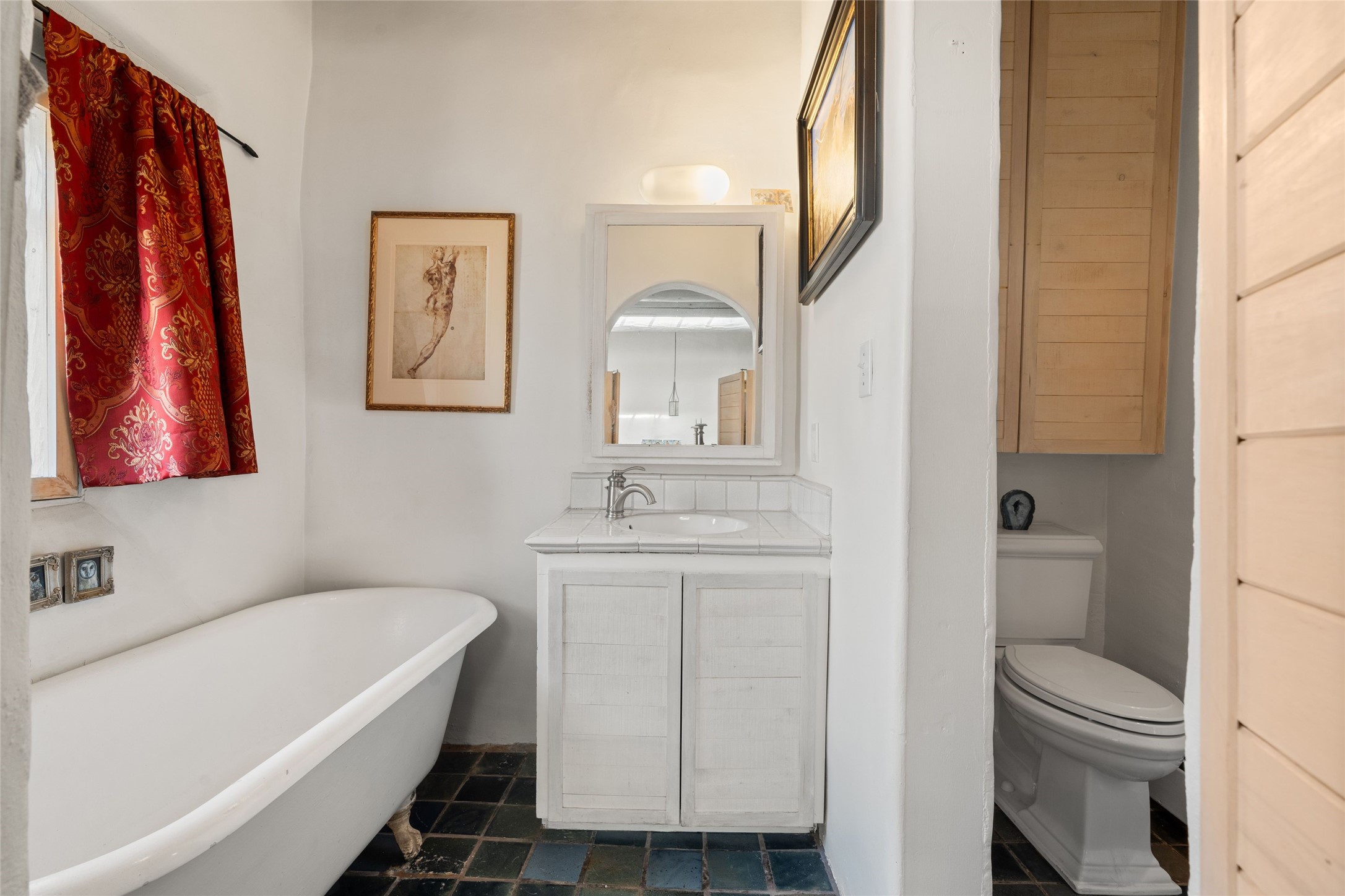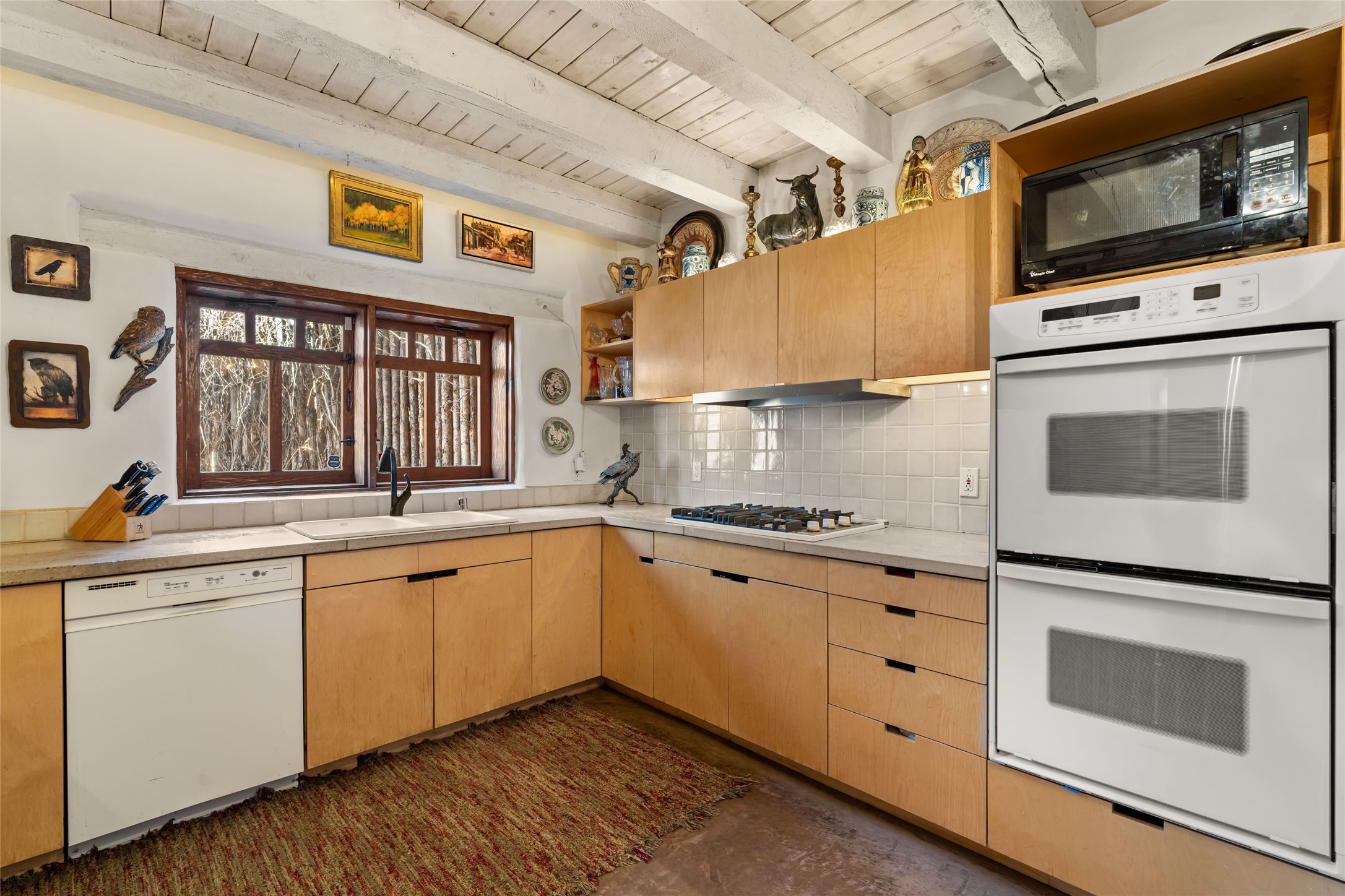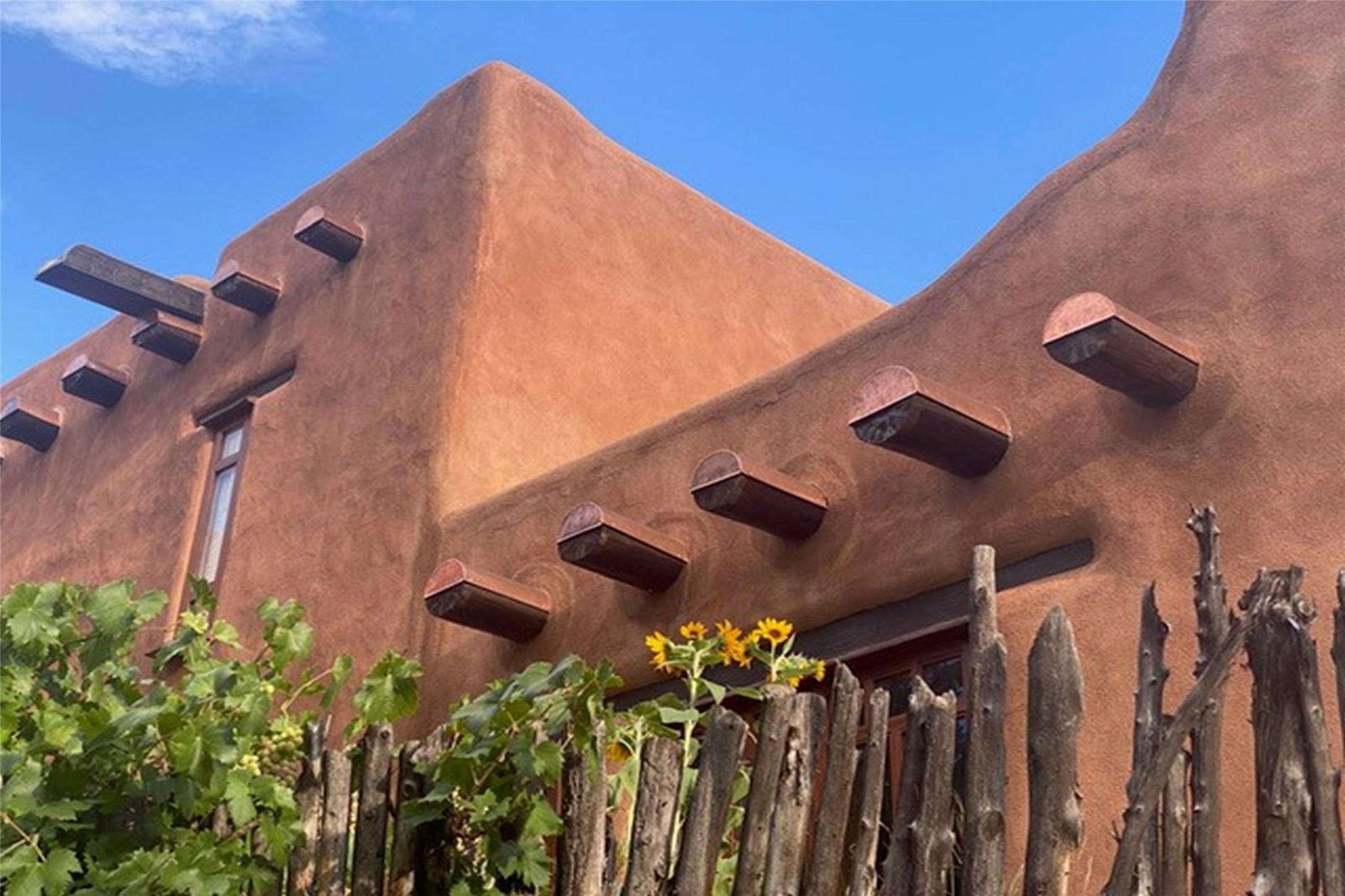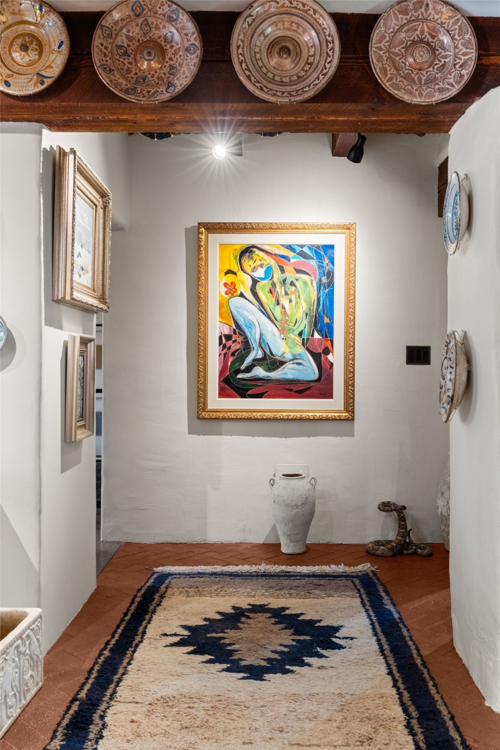 Situated in a downtown Santa Fe compound rich in history, this sophisticated and fully landscaped property represents a crown jewel in city architecture. Positioned on a quiet landscaped hilltop above Palace Avenue with convenient walkability to Canyon Road restaurants and galleries, riverside walking and bike trails, as well as the endless cultural attractions of the Santa Fe Plaza. Timeless in design and meticulously handcrafted, this adobe and frame compound in Santa Fe's highly desired Historic Eastside neighborhood was originally envisioned by a Frank Lloyd Wright trained architect to incorporate privacy, custom Pueblo design, and organic building techniques, while emphasizing an indoor-outdoor way of life borrowed heavily from Old World design. This two-bedroom and 1-3/4 bathroom, two-story condo has a spacious downstairs area perfect for an office or an additional bedroom. The flowing continuity of the adobe wall blends seamlessly with the cascade of organic wood details and hand laid bricked floors. The entire walled front and back exterior spaces are shaded and private, with seasonal landscaping and mature trees creating a visual canopy. The primary suite, anchored with a cozy wood stove, looks out to a rooftop view and is separated from the secondary bedroom. A bright and functional kitchen is located just off the large living area with a sensually designed corner wood-burning fireplace, a perfect union for entertaining and social gatherings. The owners' downstairs office space looks out onto the front gated and landscaped patio. Awash in natural light and replete with comfort, as well as in-town quiet privacy, the home also features radiant in-floor and baseboard heating, vigas, latillas, corbels, and skylights throughout the home enveloping the owner and guest in calm sophistication. Organic in feel, this property exudes an old-world charm difficult to find in many modern cities.