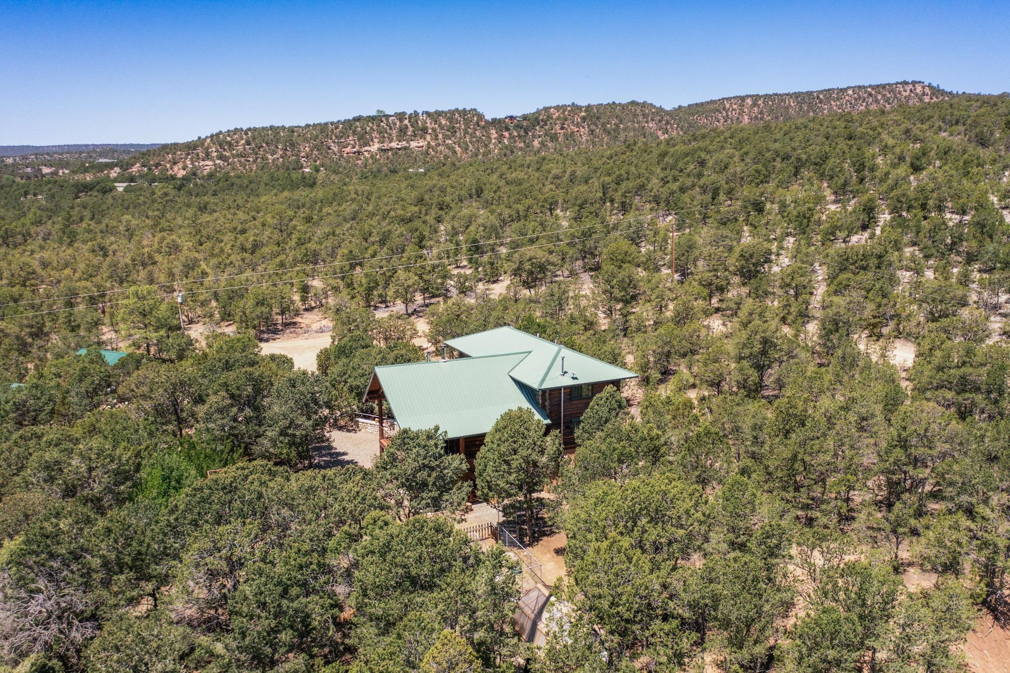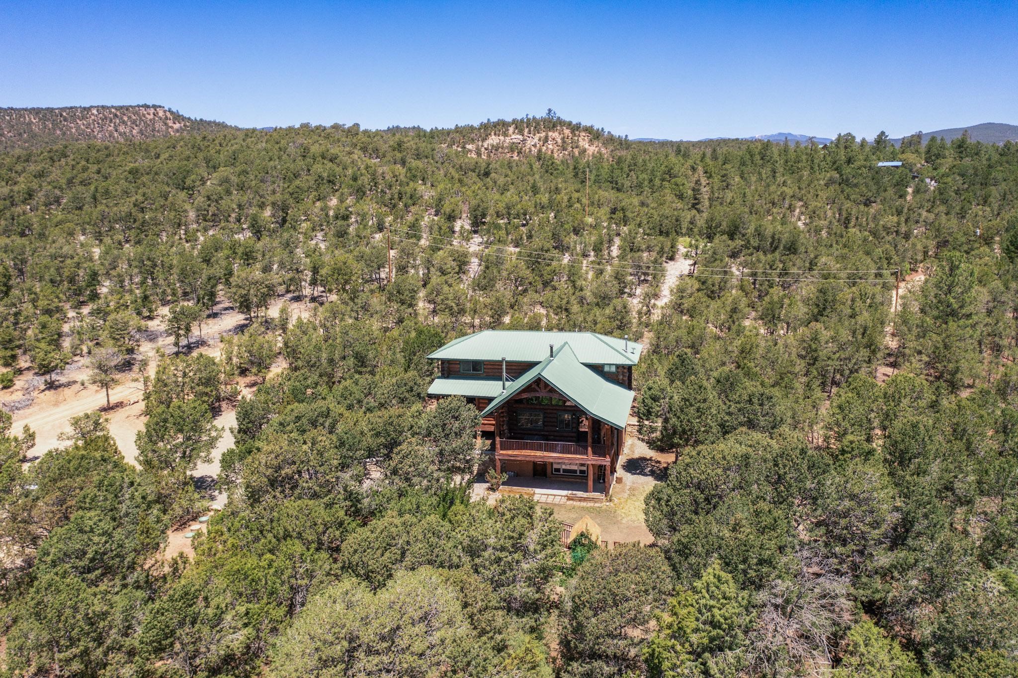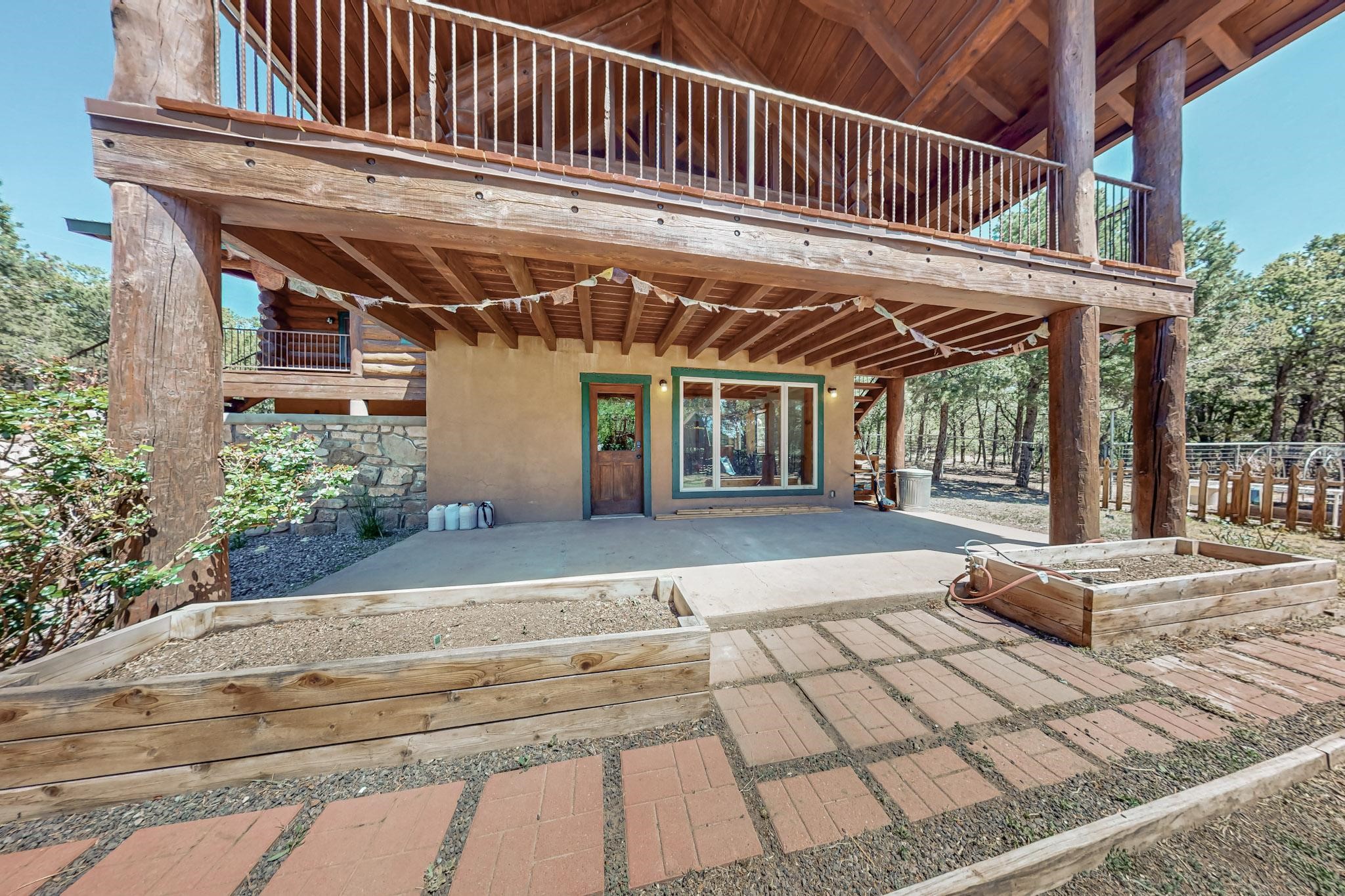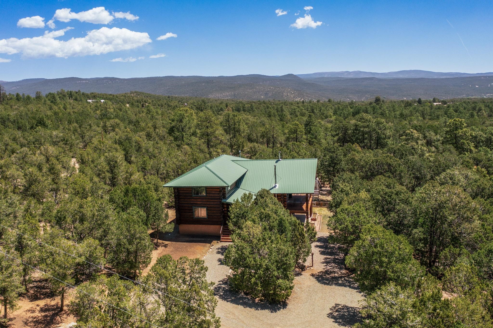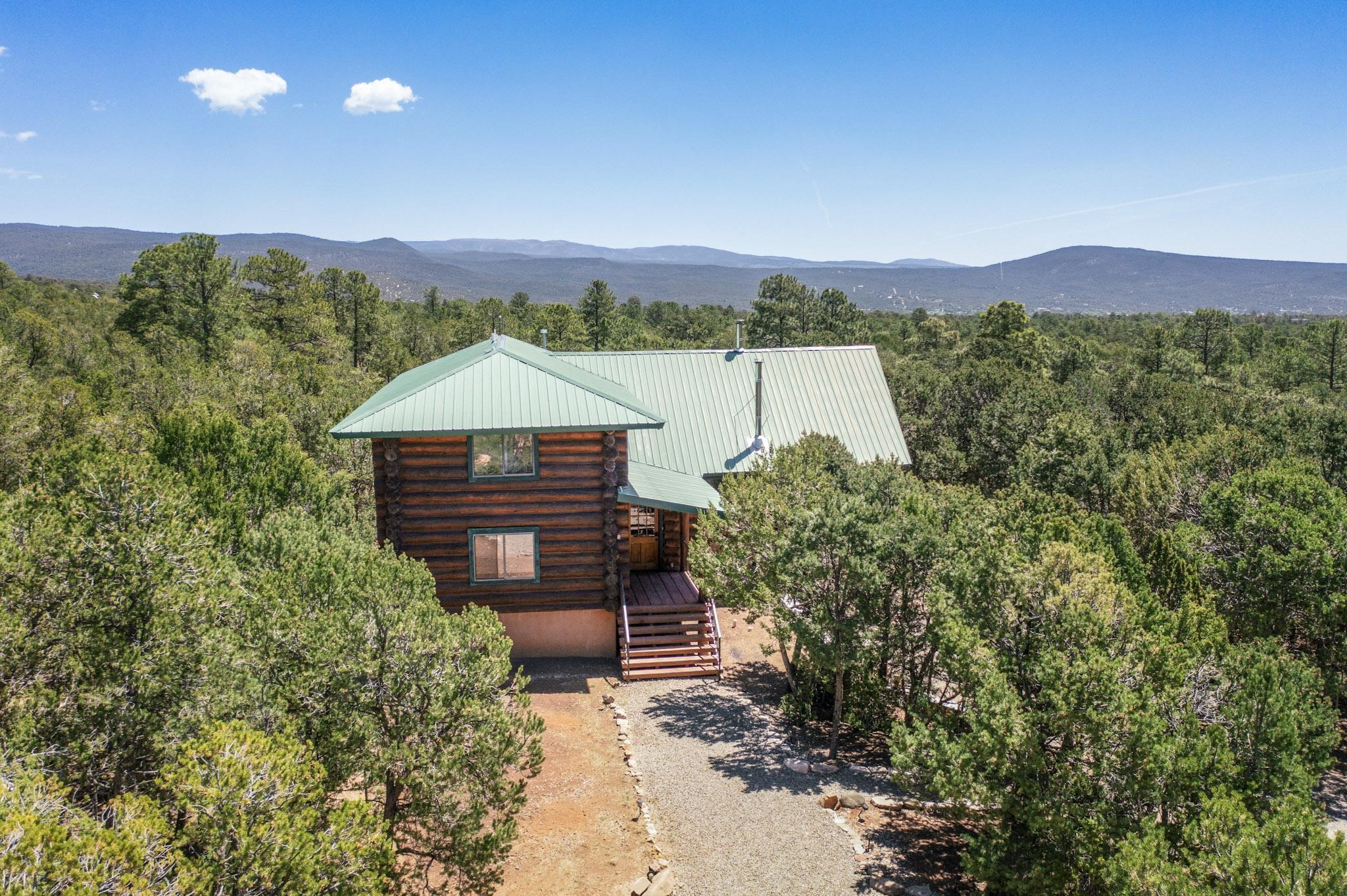 Beautiful custom built log cabin for sale on 5 gorgeous tree covered acres. The home features 5 bedrooms, 4 1/2 baths, chef's kitchen, expansive floor plan, a recently built workshop/studio, and expansive deck great for entertaining. The home is constructed using builder chosen 6-18 inch logs and features two in-home sprinkler systems. The property contains incredible landscaping and has potential for horses with ample storage and barns. There are two legal lots of record, a private well with water rights, chicken coop, greenhouse, fruit trees, sophisticated playground equipment, healthy Pion, Juniper trees, custom rock retaining walls, and graveled driveway. Conveniently located 30 minutes from downtown Santa Fe, this incredible property combines the best of rural living with easy access to amenities. Set up a showing today!
