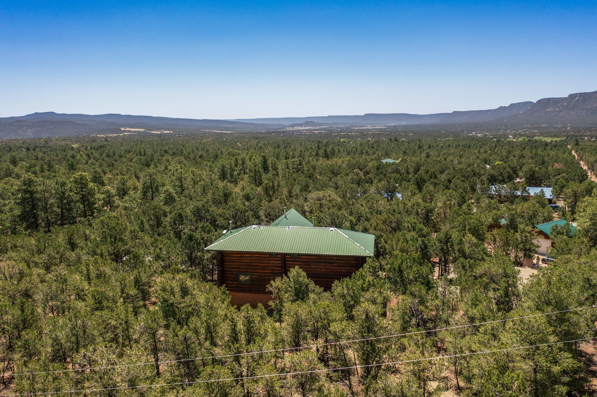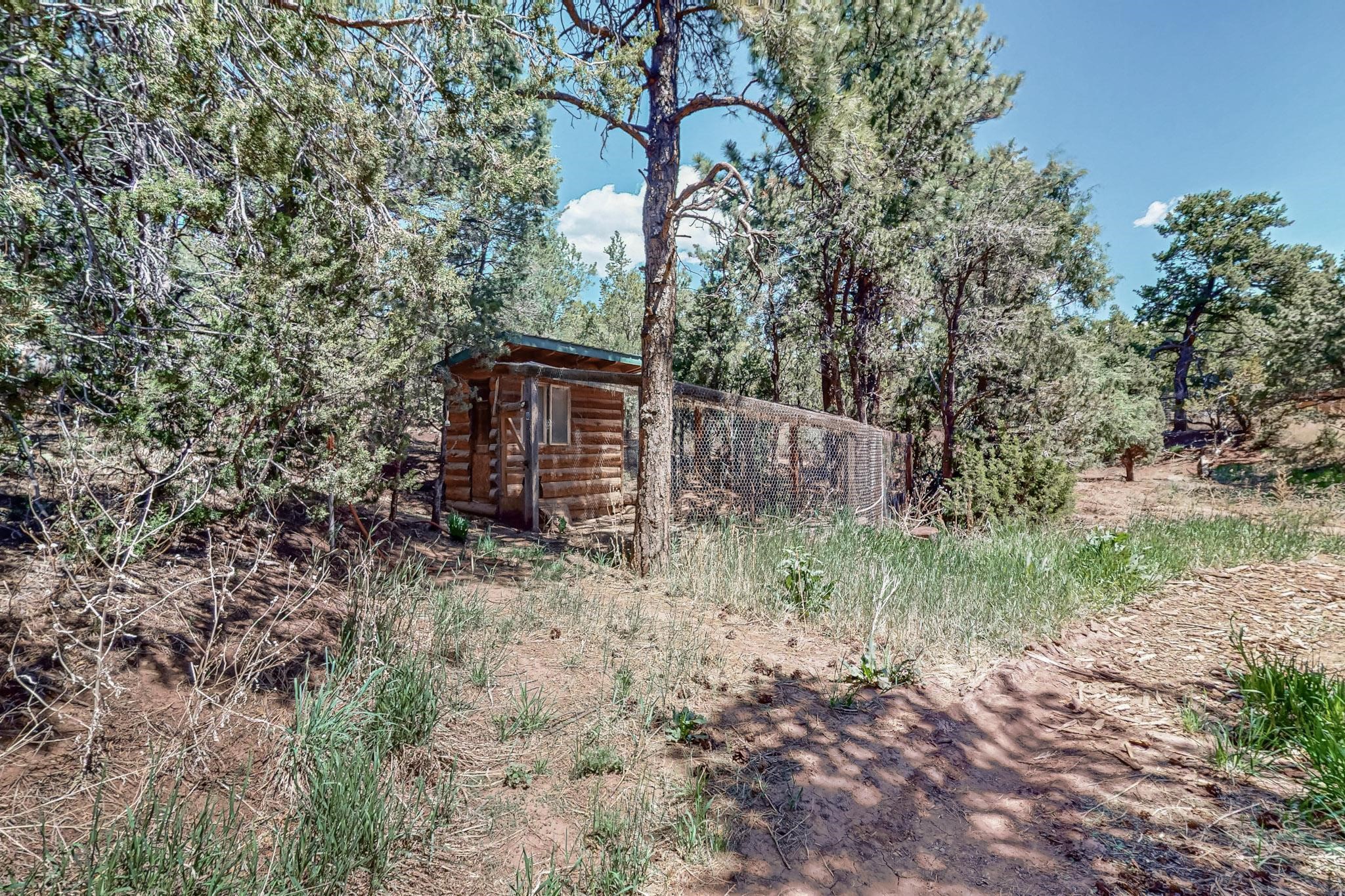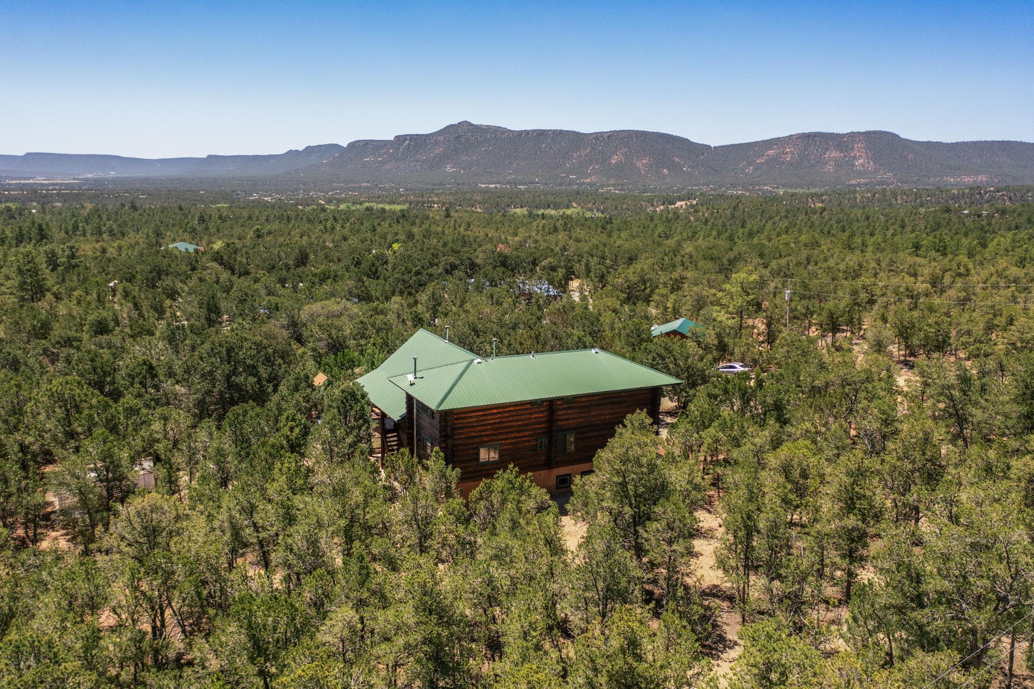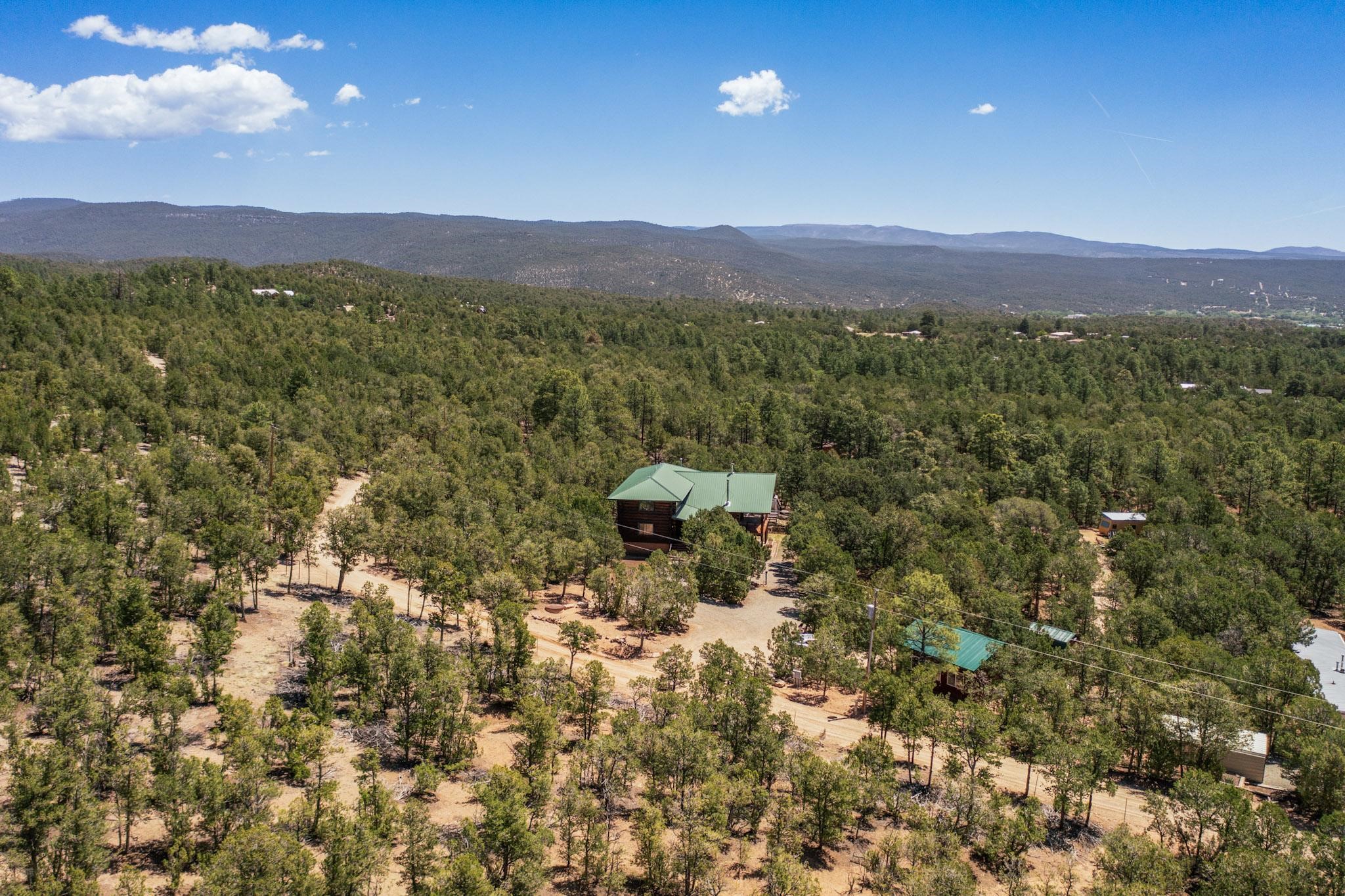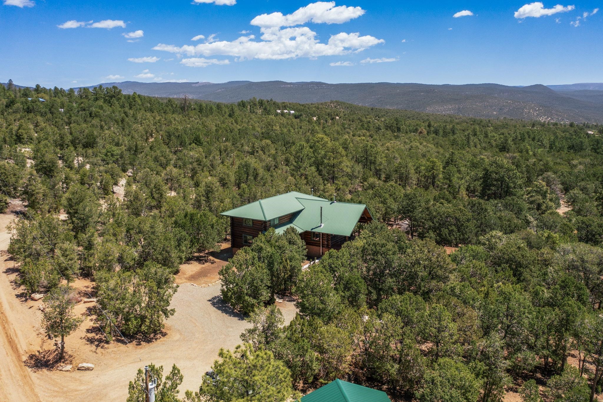 Beautiful custom built log cabin for sale on 5 gorgeous tree covered acres. The home features 5 bedrooms, 4 1/2 baths, chef's kitchen, expansive floor plan, a recently built workshop/studio, and expansive deck great for entertaining. The home is constructed using builder chosen 6-18 inch logs and features two in-home sprinkler systems. The property contains incredible landscaping and has potential for horses with ample storage and barns. There are two legal lots of record, a private well with water rights, chicken coop, greenhouse, fruit trees, sophisticated playground equipment, healthy Pion, Juniper trees, custom rock retaining walls, and graveled driveway. Conveniently located 30 minutes from downtown Santa Fe, this incredible property combines the best of rural living with easy access to amenities. Set up a showing today!