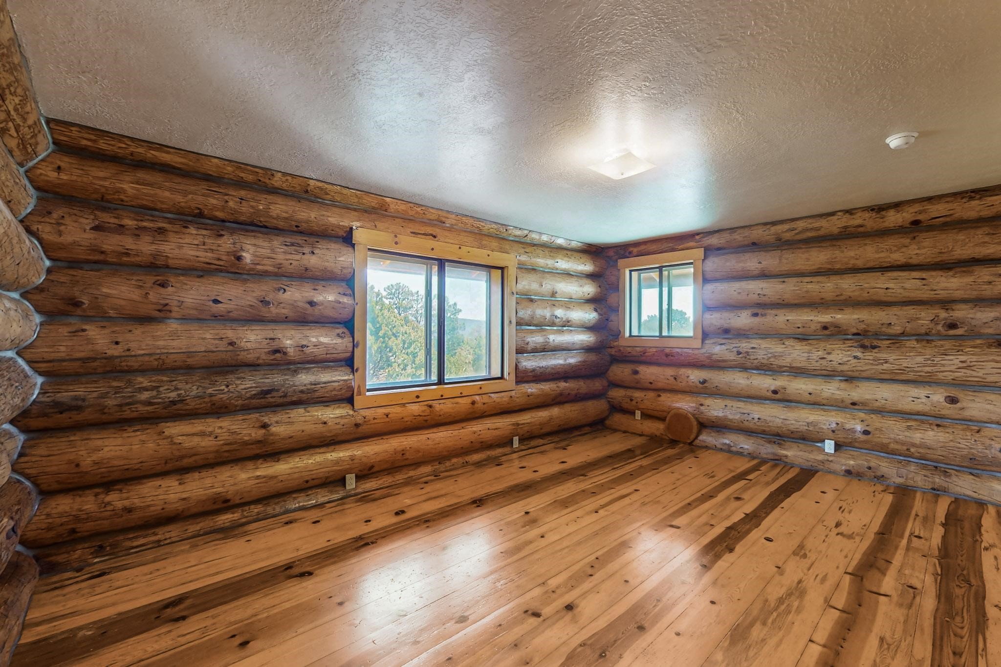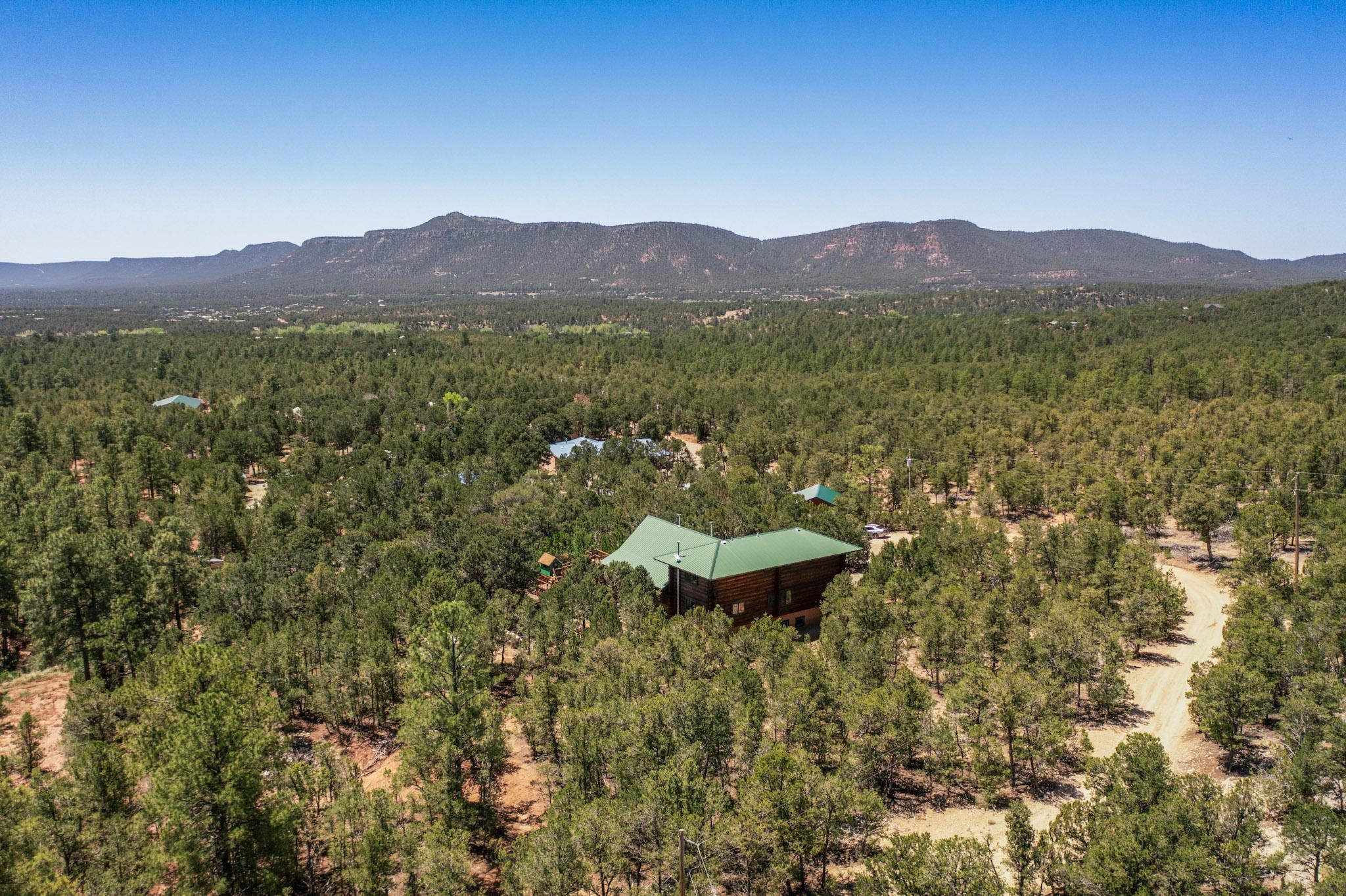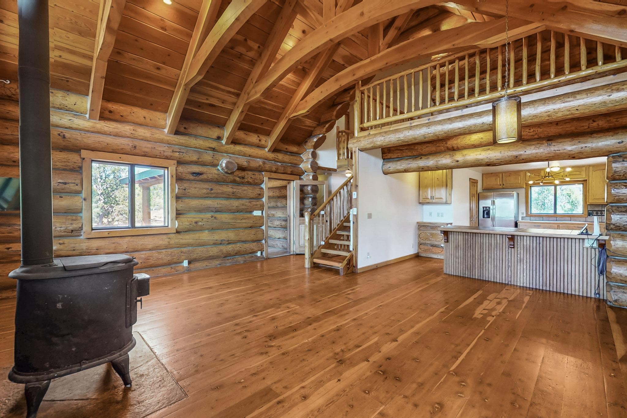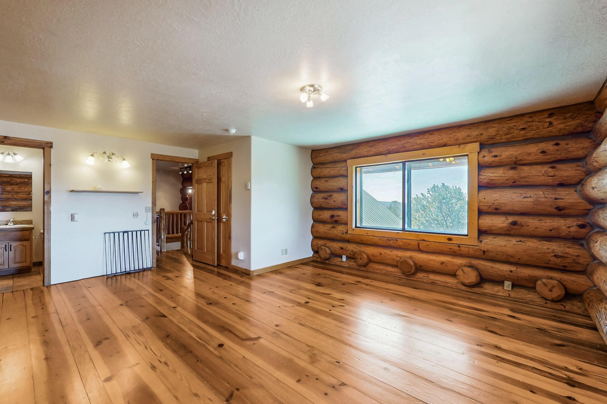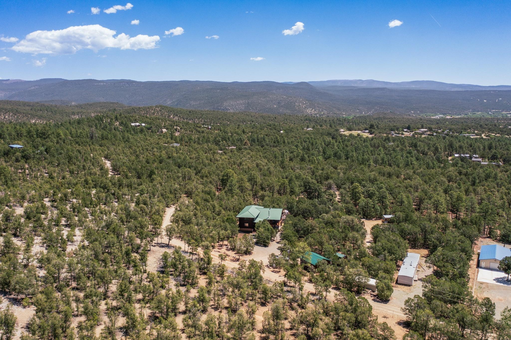Beautiful custom built log cabin for sale on 5 gorgeous tree covered acres. The home features 5 bedrooms, 4 1/2 baths, chef's kitchen, expansive floor plan, a recently built workshop/studio, and expansive deck great for entertaining. The home is constructed using builder chosen 6-18 inch logs and features two in-home sprinkler systems. The property contains incredible landscaping and has potential for horses with ample storage and barns. There are two legal lots of record, a private well with water rights, chicken coop, greenhouse, fruit trees, sophisticated playground equipment, healthy Pion, Juniper trees, custom rock retaining walls, and graveled driveway. Conveniently located 30 minutes from downtown Santa Fe, this incredible property combines the best of rural living with easy access to amenities. Set up a showing today!