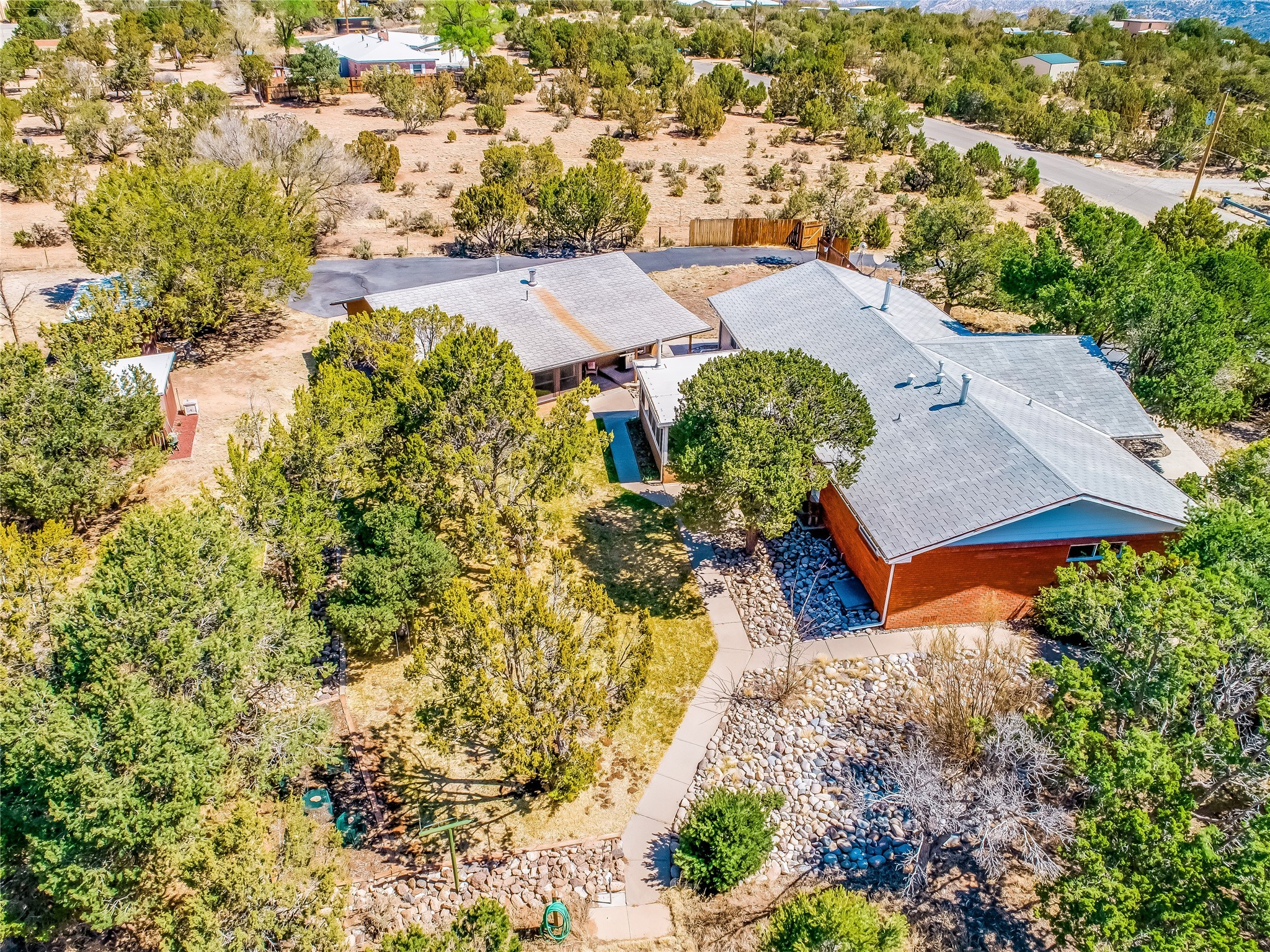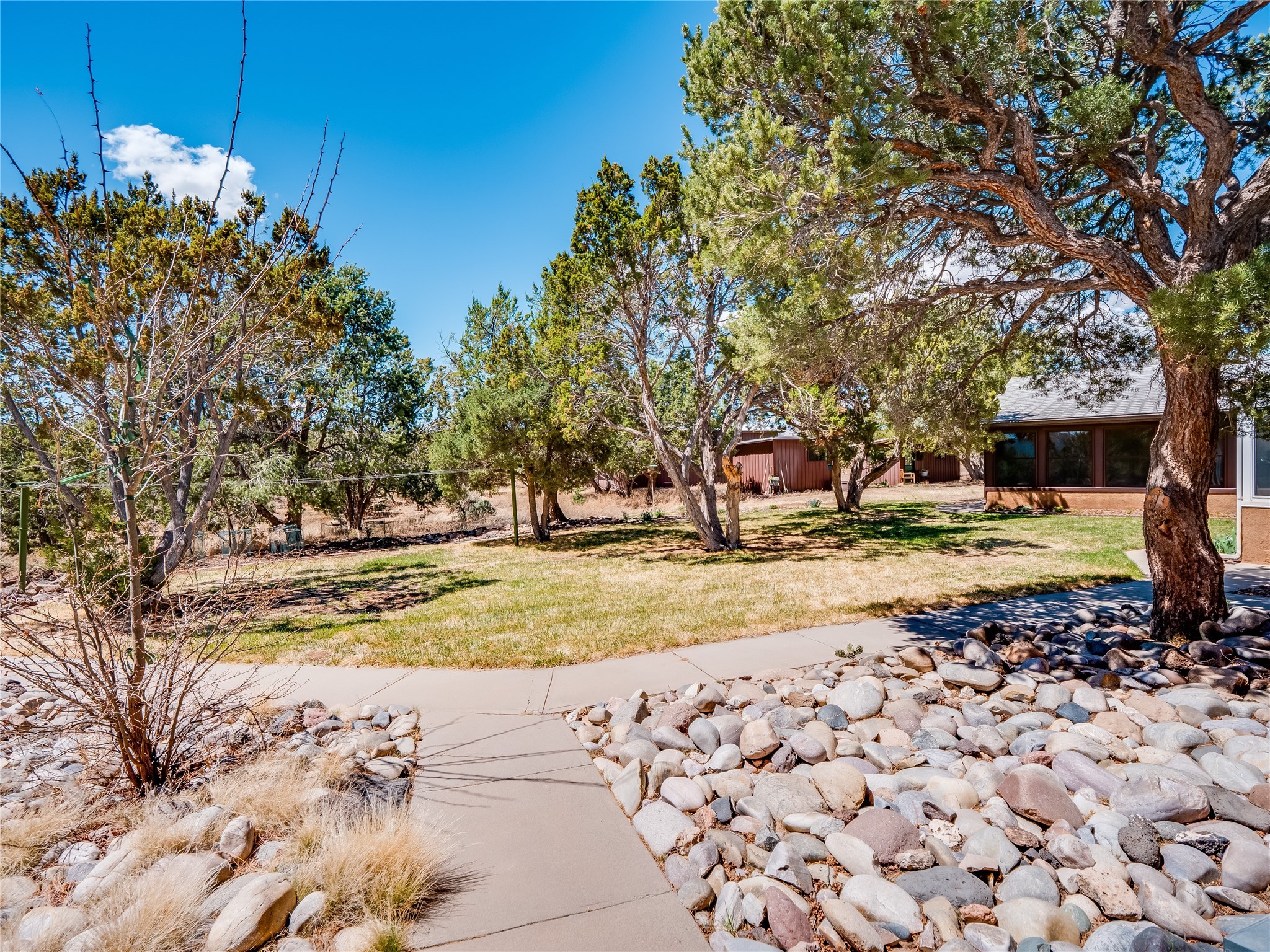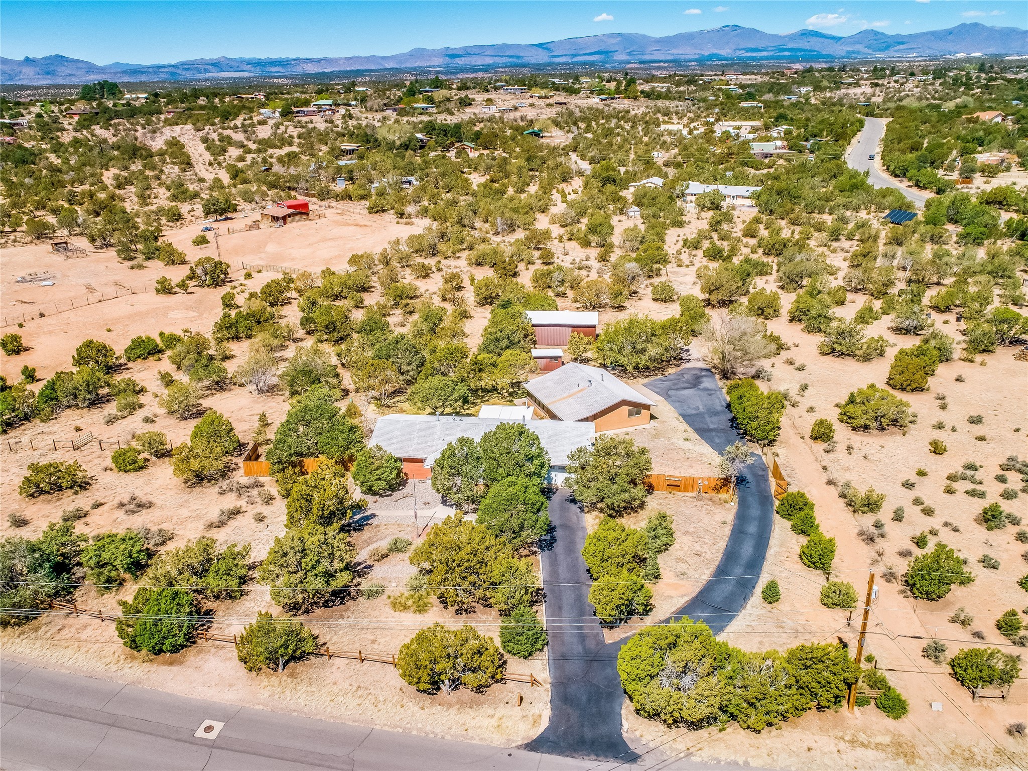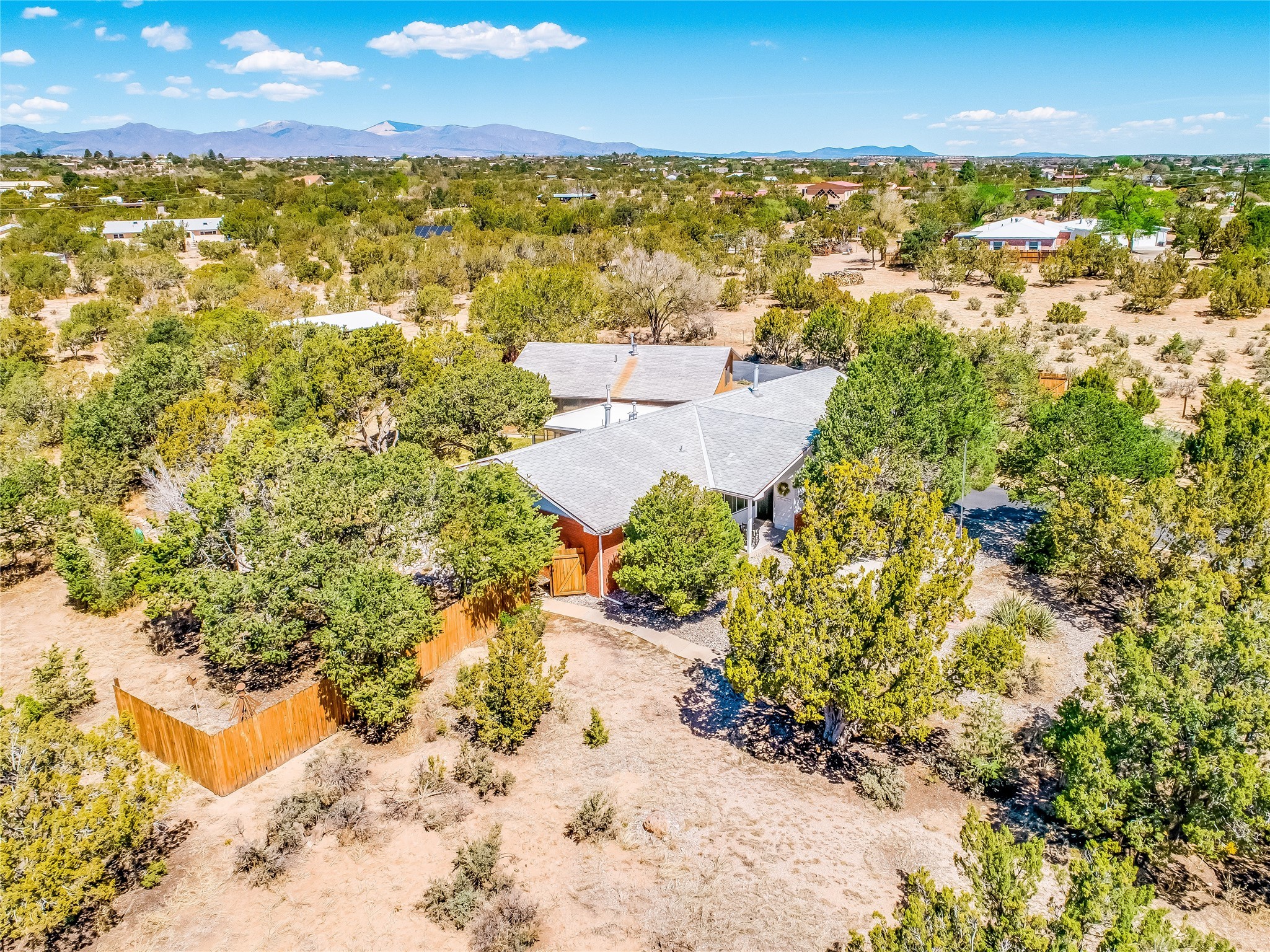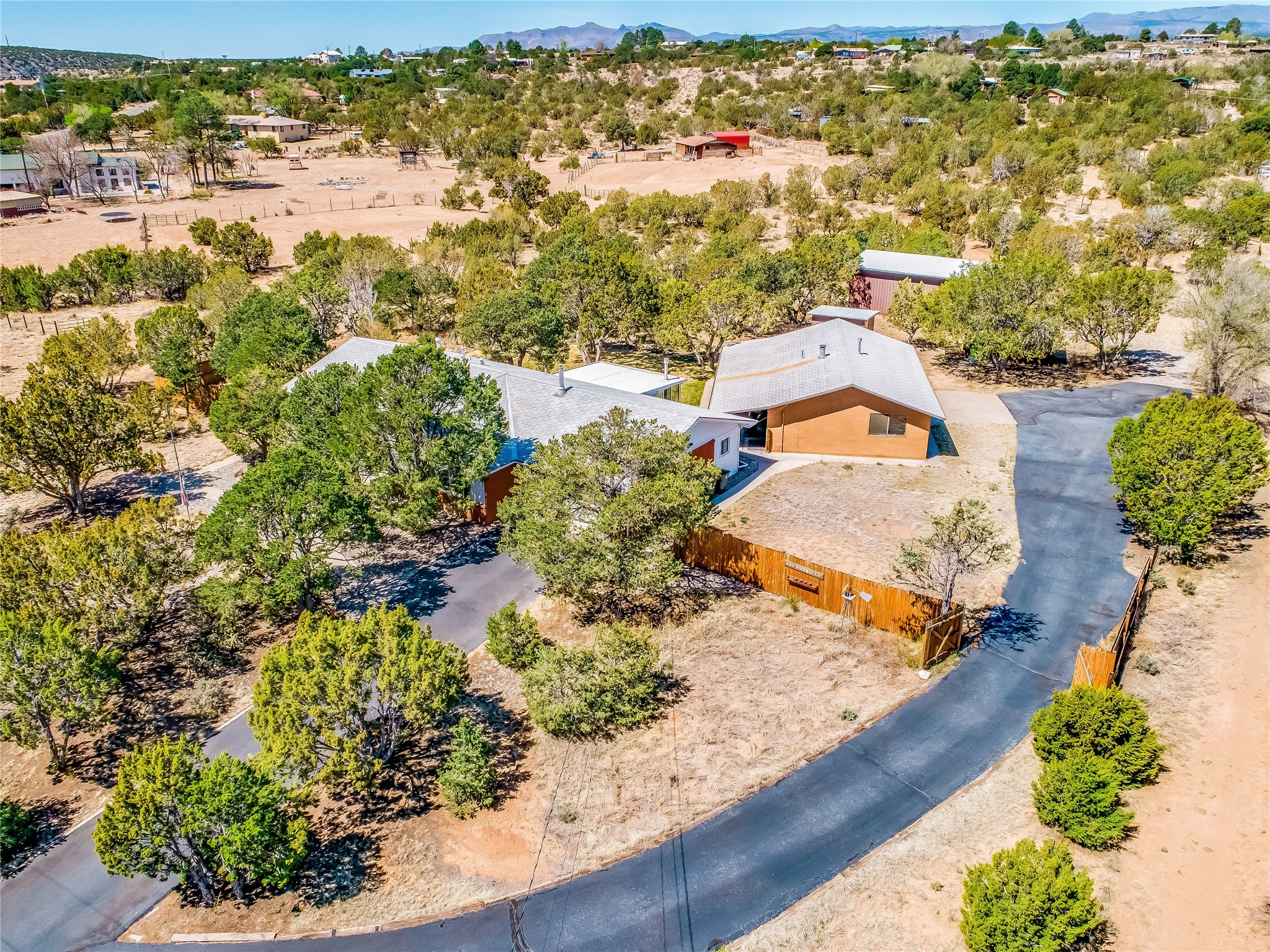 Tucked away in the desirable Pajarito Acres neighborhood, this stunning single-story home offers privacy, space, and versatility on 2.78 acres. A low-maintenance front yard with mature trees and shrubs offers a peaceful welcome and natural privacy. Inside you'll be welcomed by an expansive open floorplan designed for modern living and effortless entertaining. Gorgeous white oak flooring flows throughout, unifying each space with warmth and continuity. The living room, dining area, and kitchen connect openly, anchored by a cozy gas stove-style fireplace that provides a central gathering point. The completely remodeled gourmet kitchen is both functional and stylish, featuring sawn oak cabinetry, Corian counters, stainless steel appliances, and subway tile backsplash. With clear sightlines to both the living and dining areas, hosting guests or spending time with family feels natural and connected. Around the corner, the laundry area includes a stackable washer and dryer and convenient backyard access. Just off the dining room is a sun-filled family room with three walls of windows, gas stove and access to a backyard patio--perfect for indoor-outdoor living. Down the hall is a guest bedroom and a beautifully updated bathroom with a tiled shower/tub, glass enclosure, single sink vanity, and generous built-in cabinetry. The bright and spacious primary en-suite includes a spa-like bath with marble counters, a tiled walk-in shower, and built-in cabinets. Additional rooms include a dedicated office and a flexible bonus room. An attached two car garage with epoxy flooring. Outside, you'll find four additional structures: a huge workshop (plumbed with sewer, heated, electric, and compressed air) connected to a two-car garage, a heated greenhouse, a studio, a tool shed, and a 34-foot RV port--totaling 6 garage spaces. A unique haven for nature lovers, creatives, and entertainers. Too many upgrades to list--ask for the detailed spreadsheet and schedule your private tour today!