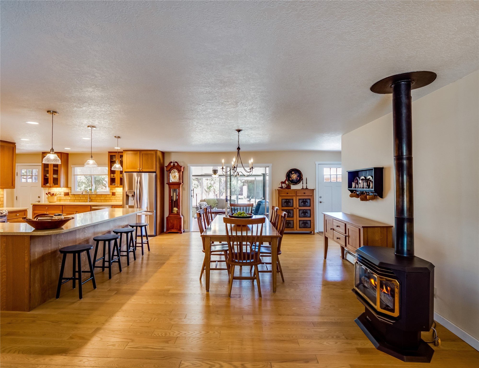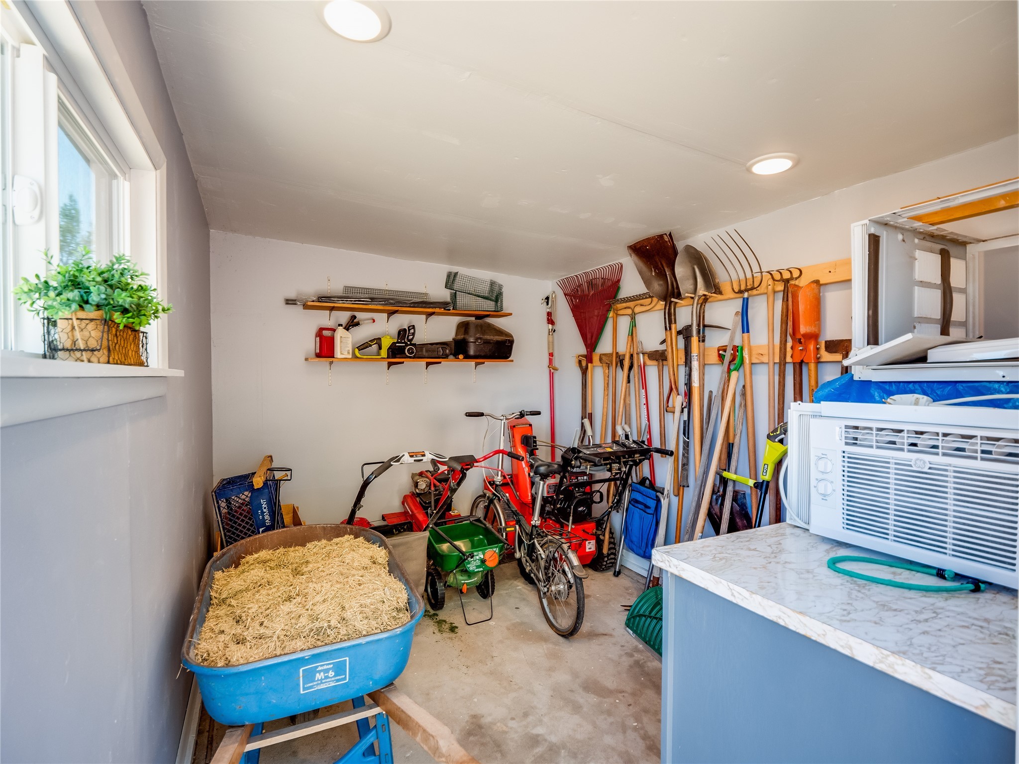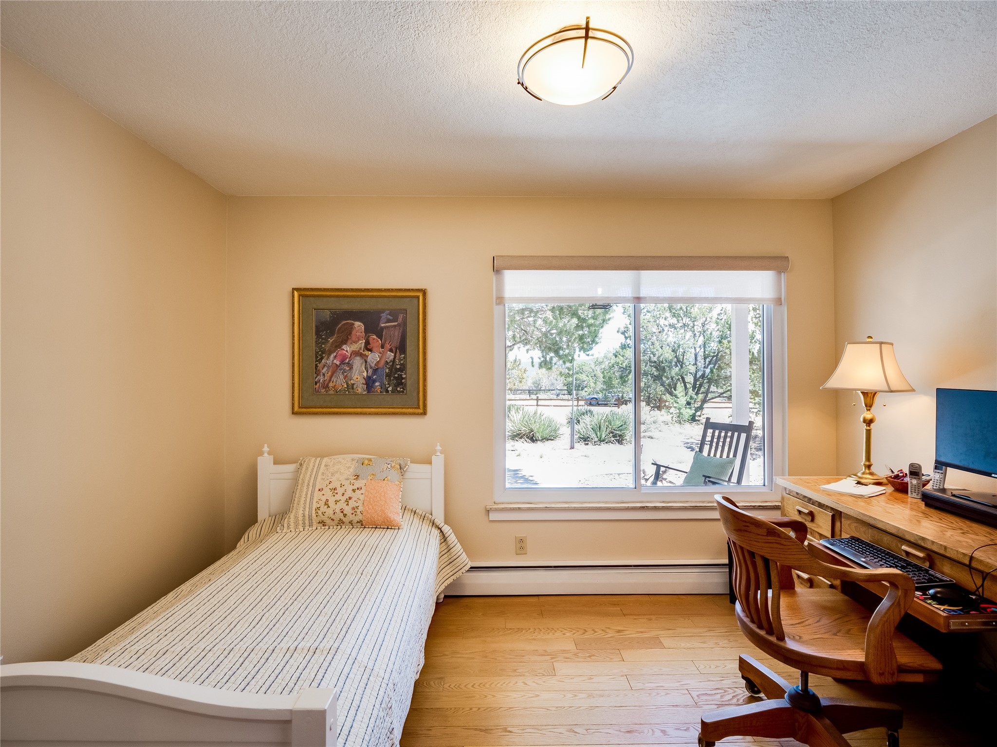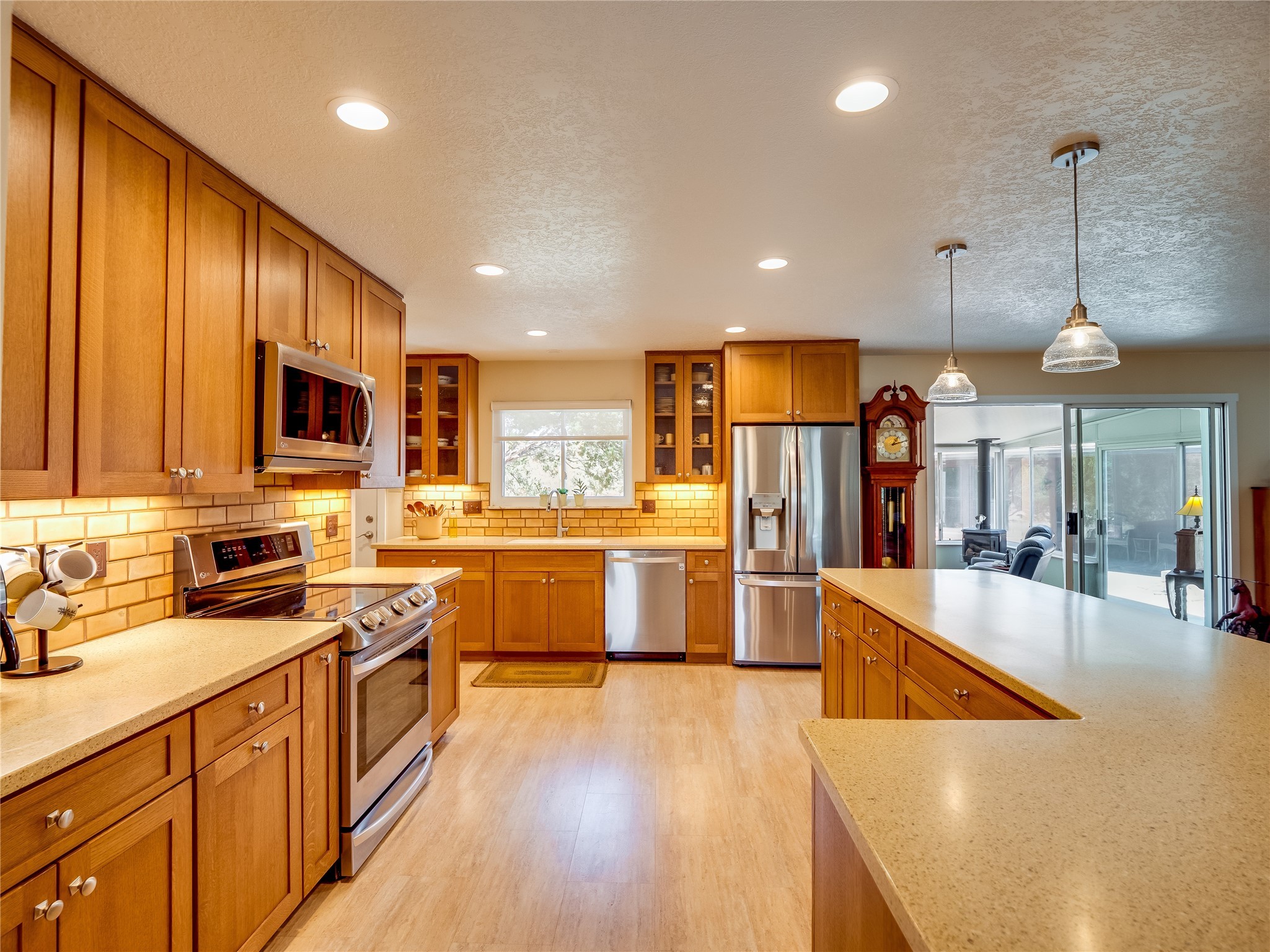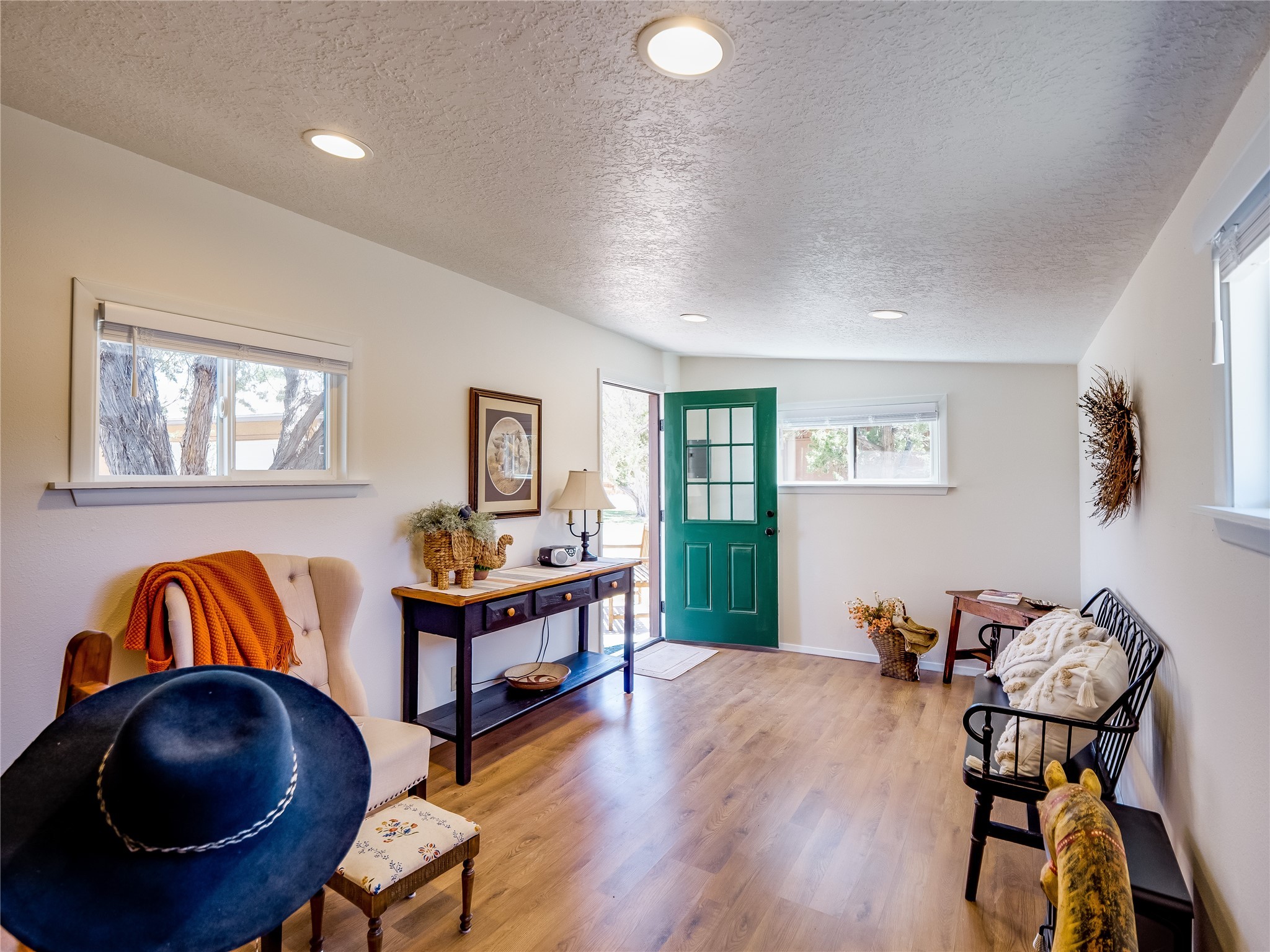 Tucked away in the desirable Pajarito Acres neighborhood, this stunning single-story home offers privacy, space, and versatility on 2.78 acres. A low-maintenance front yard with mature trees and shrubs offers a peaceful welcome and natural privacy. Inside you'll be welcomed by an expansive open floorplan designed for modern living and effortless entertaining. Gorgeous white oak flooring flows throughout, unifying each space with warmth and continuity. The living room, dining area, and kitchen connect openly, anchored by a cozy gas stove-style fireplace that provides a central gathering point. The completely remodeled gourmet kitchen is both functional and stylish, featuring sawn oak cabinetry, Corian counters, stainless steel appliances, and subway tile backsplash. With clear sightlines to both the living and dining areas, hosting guests or spending time with family feels natural and connected. Around the corner, the laundry area includes a stackable washer and dryer and convenient backyard access. Just off the dining room is a sun-filled family room with three walls of windows, gas stove and access to a backyard patio--perfect for indoor-outdoor living. Down the hall is a guest bedroom and a beautifully updated bathroom with a tiled shower/tub, glass enclosure, single sink vanity, and generous built-in cabinetry. The bright and spacious primary en-suite includes a spa-like bath with marble counters, a tiled walk-in shower, and built-in cabinets. Additional rooms include a dedicated office and a flexible bonus room. An attached two car garage with epoxy flooring. Outside, you'll find four additional structures: a huge workshop (plumbed with sewer, heated, electric, and compressed air) connected to a two-car garage, a heated greenhouse, a studio, a tool shed, and a 34-foot RV port--totaling 6 garage spaces. A unique haven for nature lovers, creatives, and entertainers. Too many upgrades to list--ask for the detailed spreadsheet and schedule your private tour today!