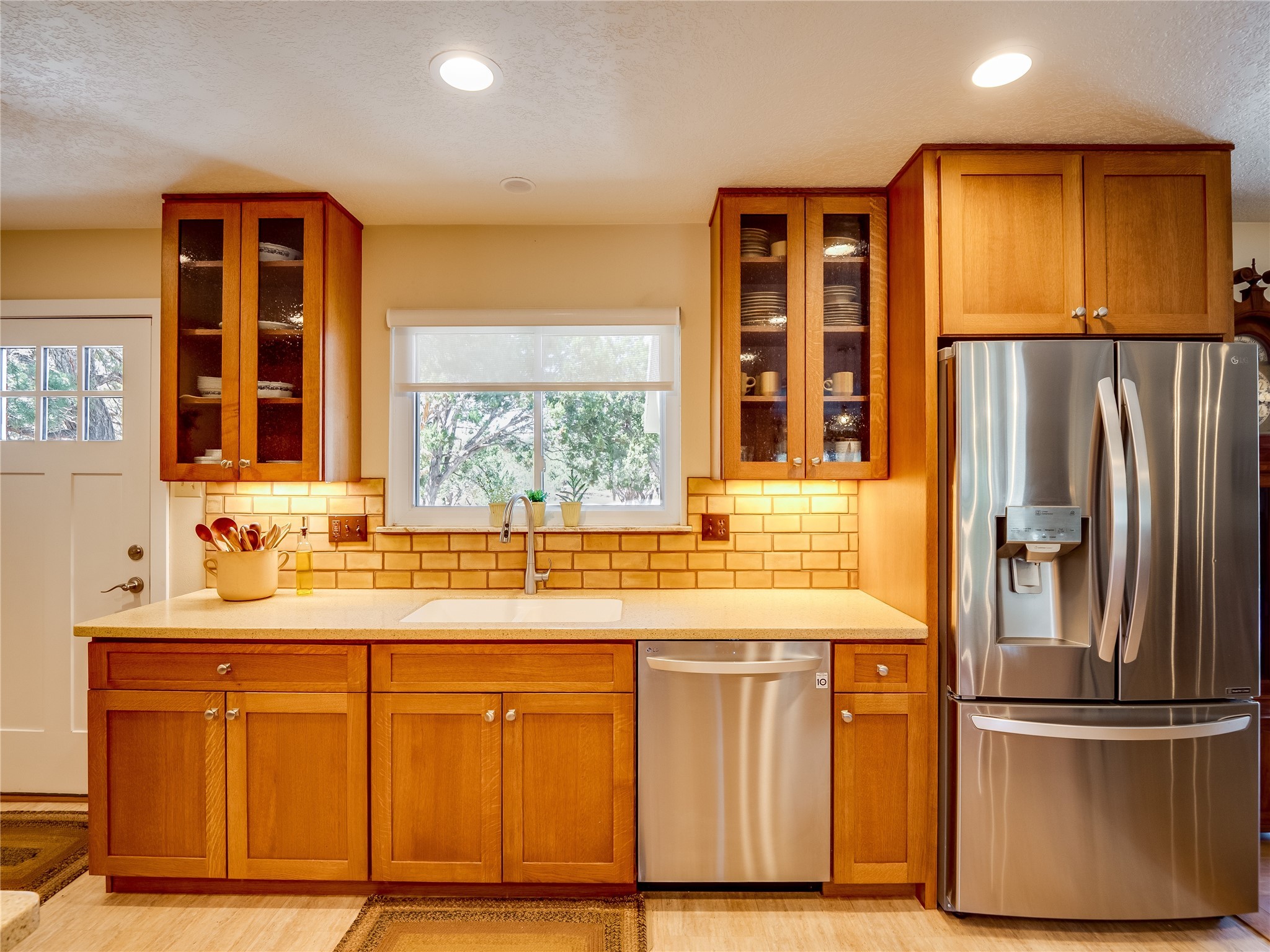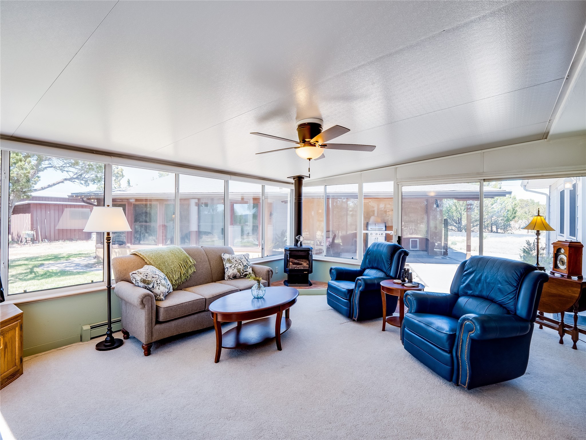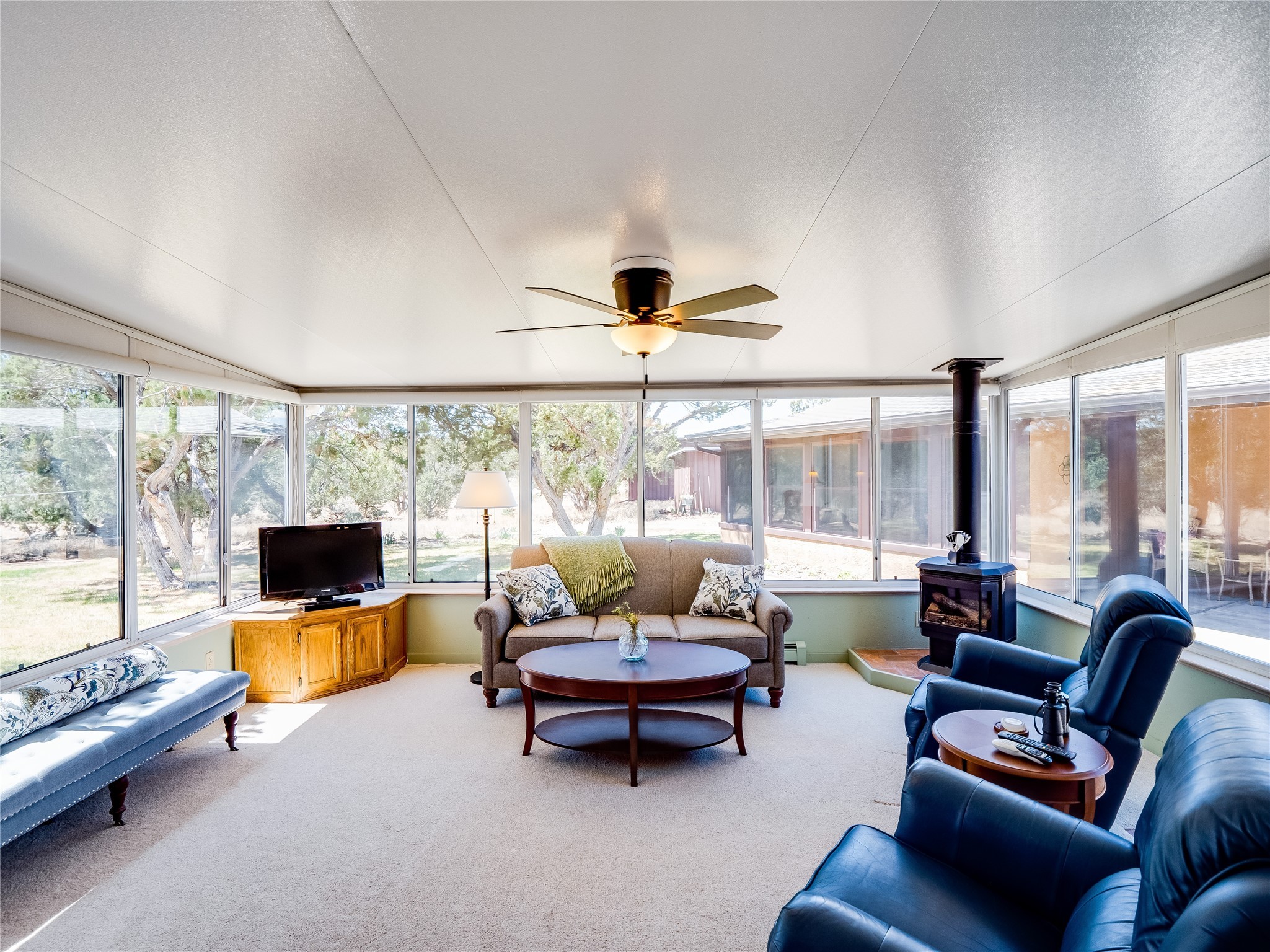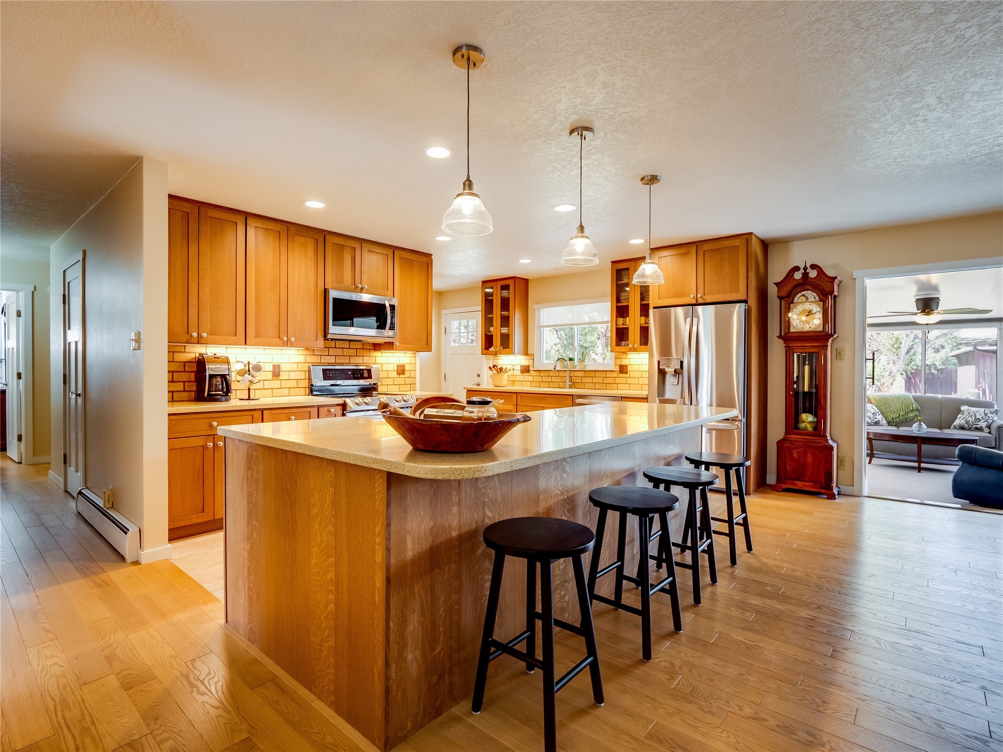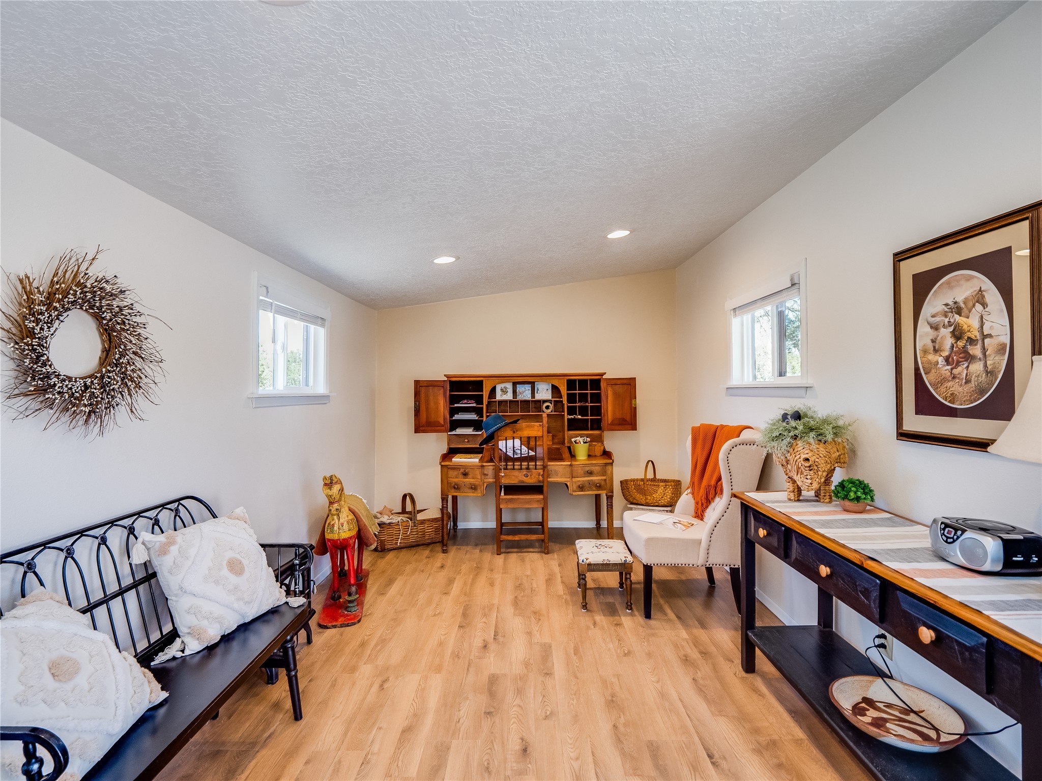 Tucked away in the desirable Pajarito Acres neighborhood, this stunning single-story home offers privacy, space, and versatility on 2.78 acres. A low-maintenance front yard with mature trees and shrubs offers a peaceful welcome and natural privacy. Inside you'll be welcomed by an expansive open floorplan designed for modern living and effortless entertaining. Gorgeous white oak flooring flows throughout, unifying each space with warmth and continuity. The living room, dining area, and kitchen connect openly, anchored by a cozy gas stove-style fireplace that provides a central gathering point. The completely remodeled gourmet kitchen is both functional and stylish, featuring sawn oak cabinetry, Corian counters, stainless steel appliances, and subway tile backsplash. With clear sightlines to both the living and dining areas, hosting guests or spending time with family feels natural and connected. Around the corner, the laundry area includes a stackable washer and dryer and convenient backyard access. Just off the dining room is a sun-filled family room with three walls of windows, gas stove and access to a backyard patio--perfect for indoor-outdoor living. Down the hall is a guest bedroom and a beautifully updated bathroom with a tiled shower/tub, glass enclosure, single sink vanity, and generous built-in cabinetry. The bright and spacious primary en-suite includes a spa-like bath with marble counters, a tiled walk-in shower, and built-in cabinets. Additional rooms include a dedicated office and a flexible bonus room. An attached two car garage with epoxy flooring. Outside, you'll find four additional structures: a huge workshop (plumbed with sewer, heated, electric, and compressed air) connected to a two-car garage, a heated greenhouse, a studio, a tool shed, and a 34-foot RV port--totaling 6 garage spaces. A unique haven for nature lovers, creatives, and entertainers. Too many upgrades to list--ask for the detailed spreadsheet and schedule your private tour today!