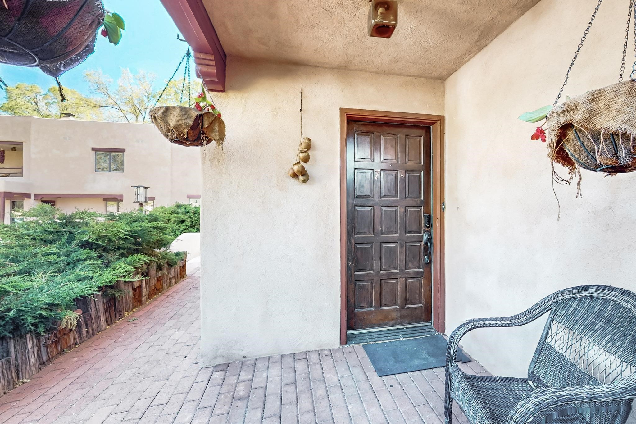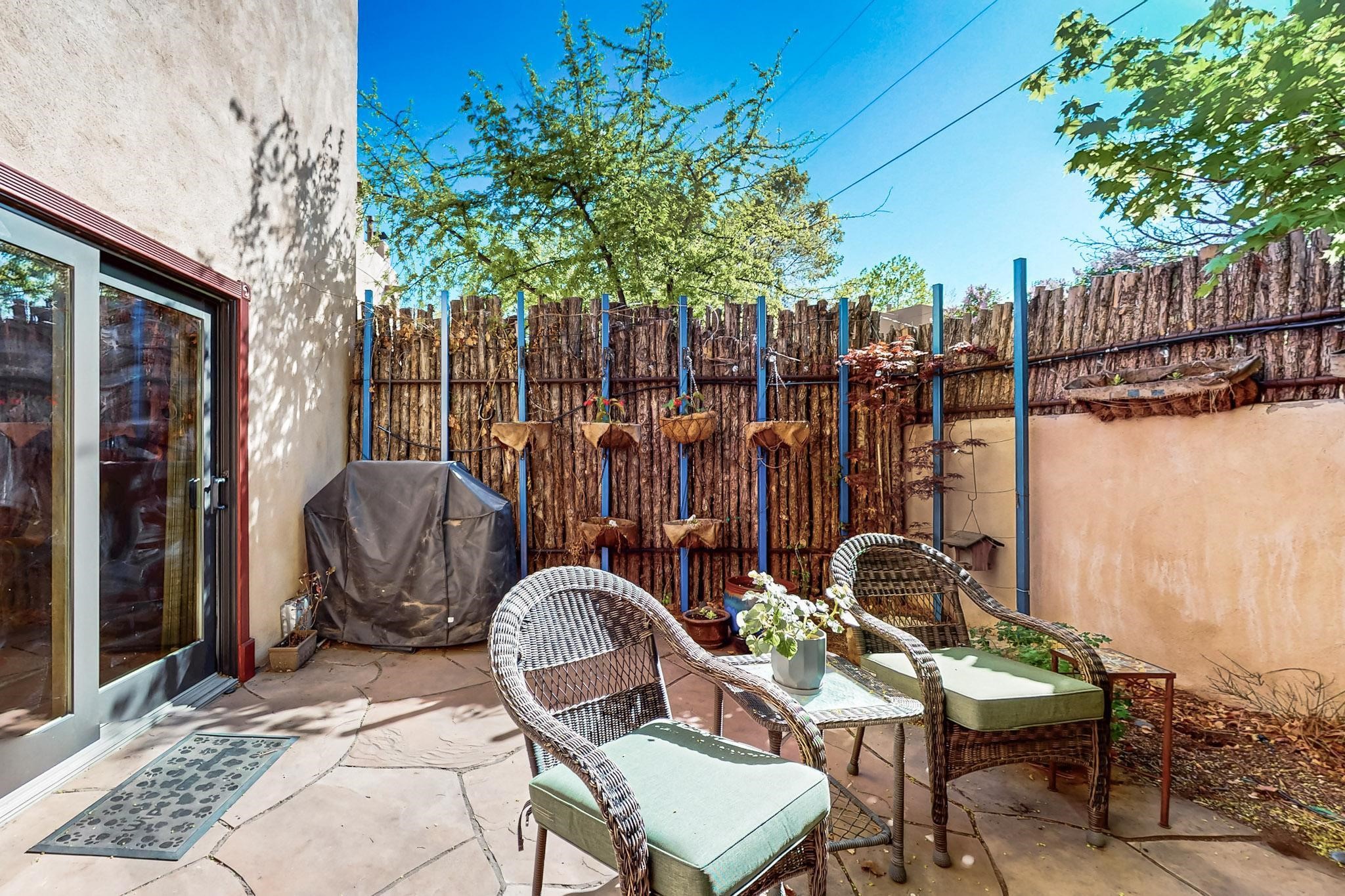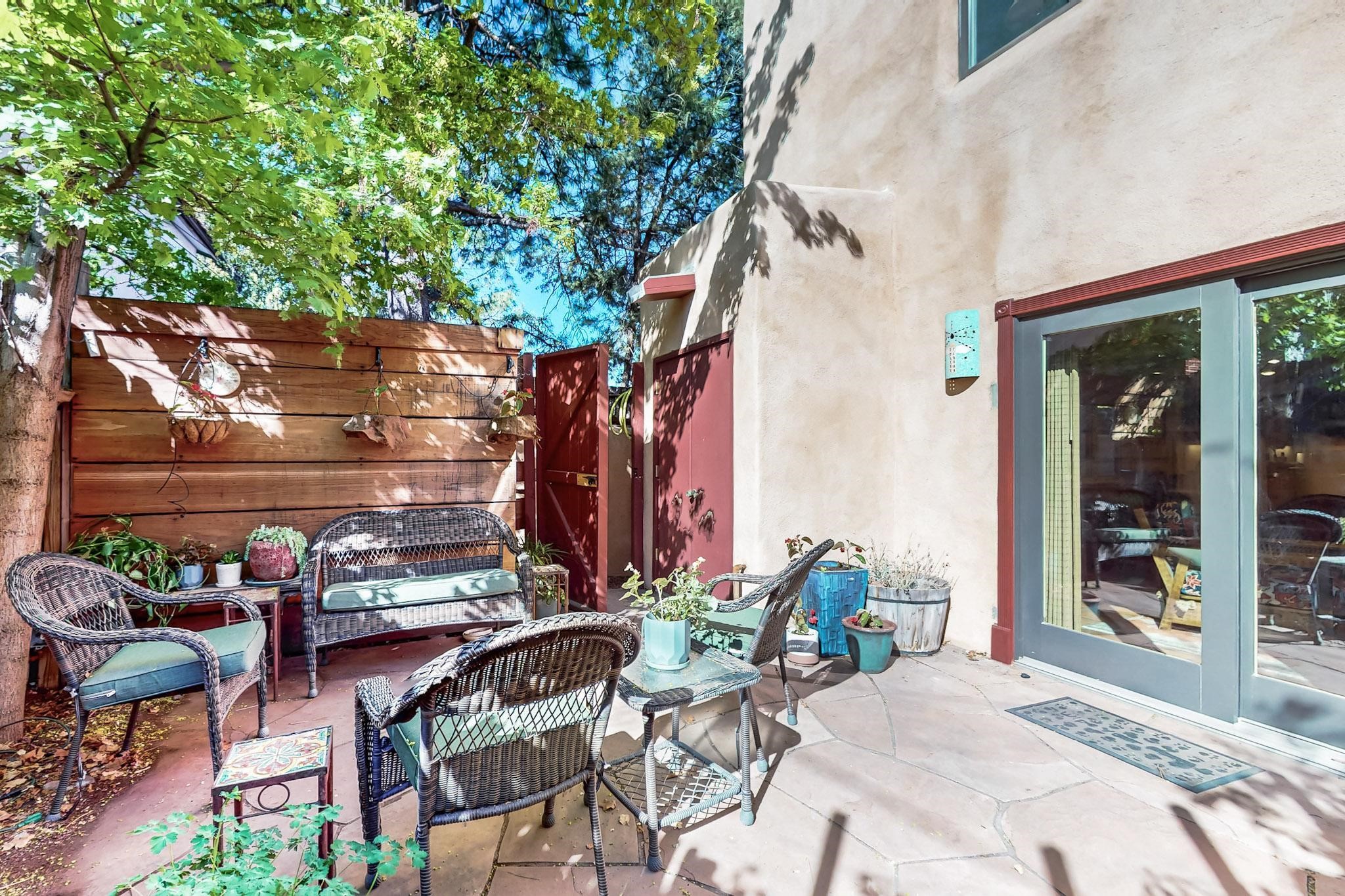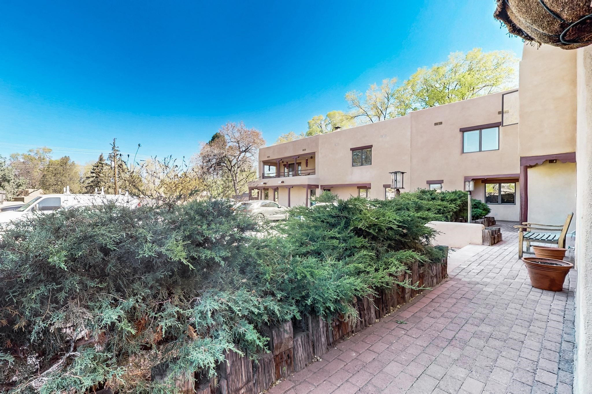 Stroll to the Plaza from this beautifully remodeled condo in a fabulous downtown location! This end unit is light and bright with plenty of windows. Close to the historic downtown area and right across from Fort Marcy Park, this lovely home has two generously sized bedrooms, both with walk-in closets. Downstairs has an open concept plan with a large kitchen, spacious living area with a corner Kiva, laundry room, and powder bath. Engineered wood floors throughout the home. No carpet. Mini-splits in the bedrooms and living area. Enjoy summer outdoor dining in the fabulous private courtyard, accessed through a new Andersen sliding glass door. Take a short walk to shopping and fine dining. A quick drive leads to some of the greatest hiking trails around. Whether looking for a vacation property or a place to call home, this could be the perfect spot.