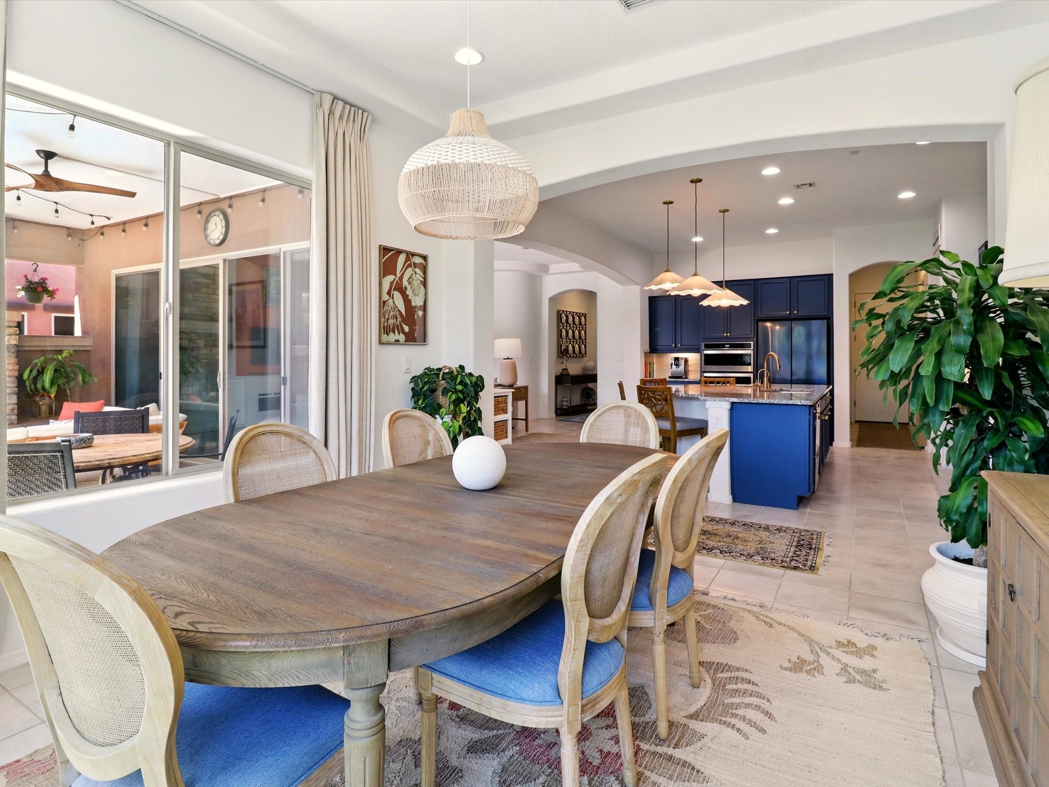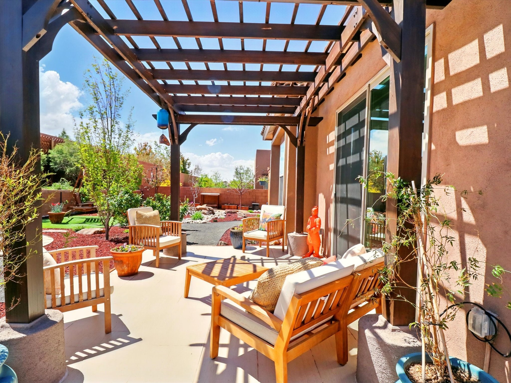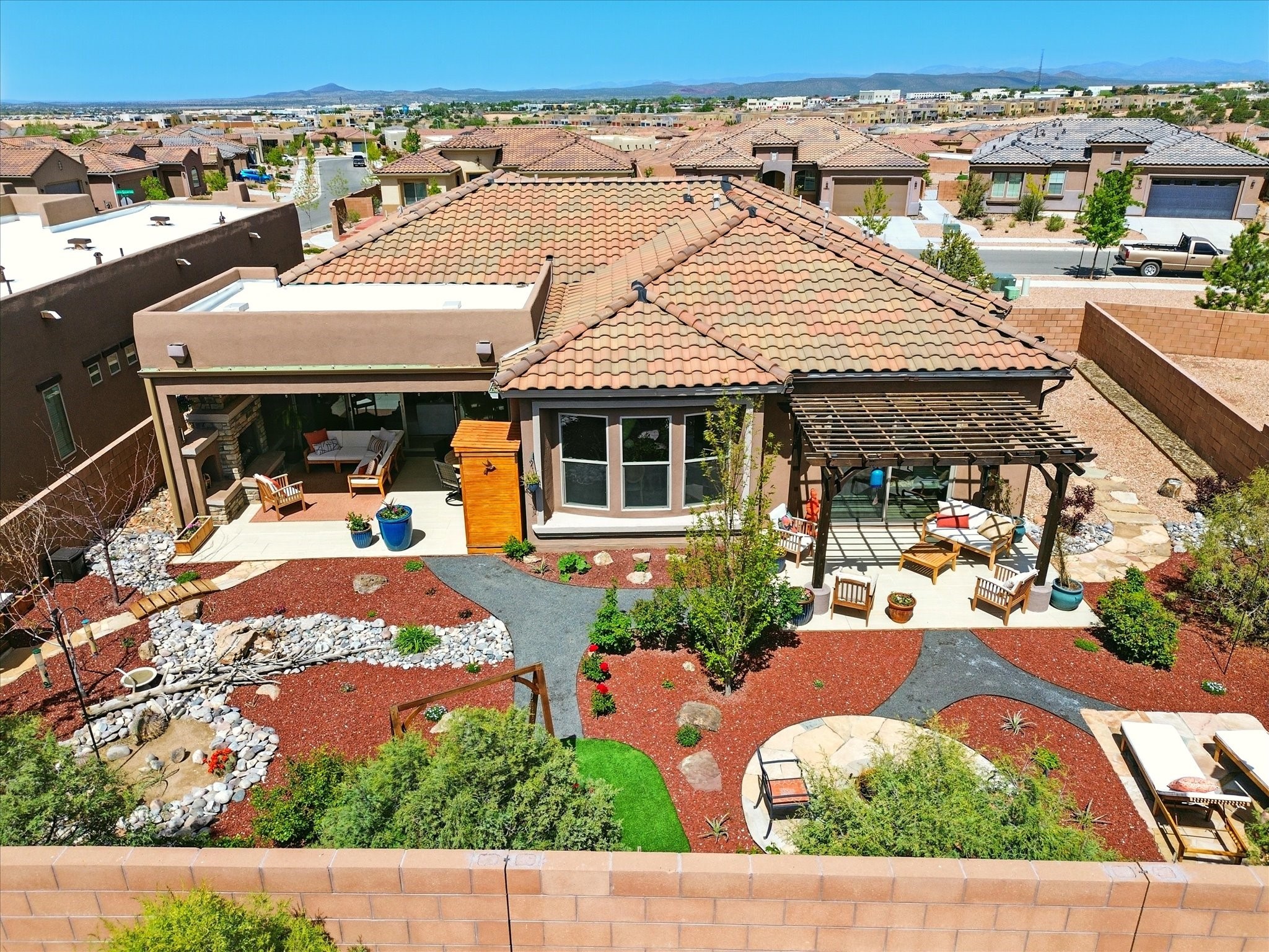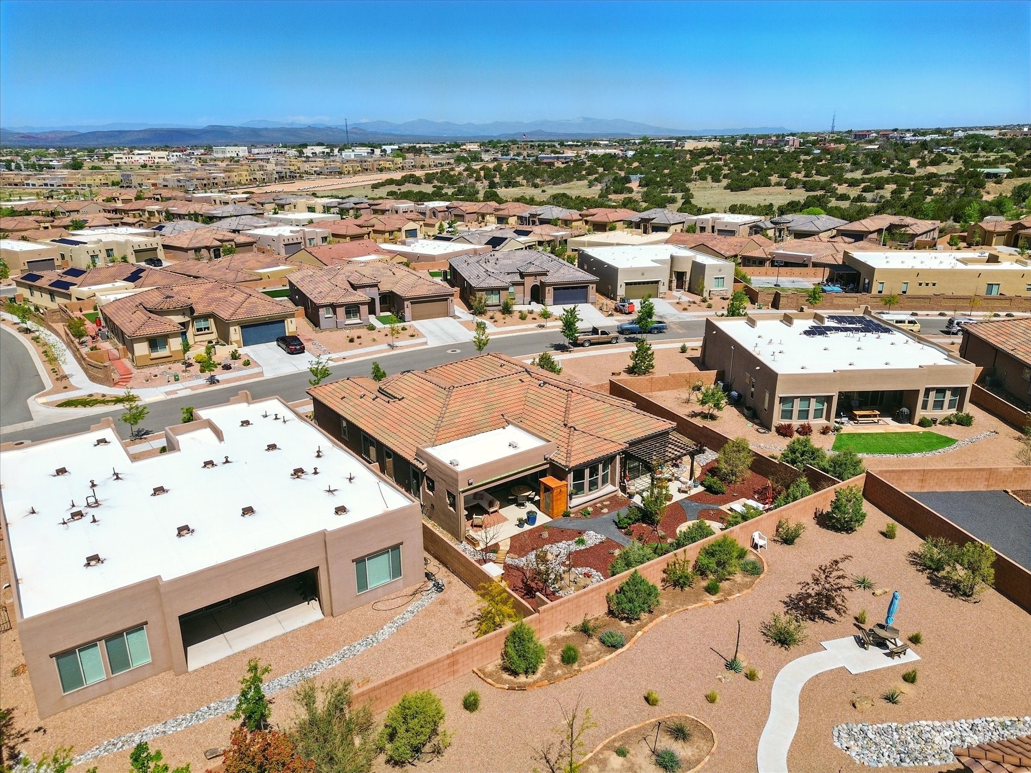 Welcome to a perfect blend of style and functionality in this beautifully appointed 3-bedroom, 2-bath home located in the highly desirable Las Soleras community. From the moment you enter, you're welcomed by a bright, versatile flex room--ideal for a home office, studio, or den--setting the tone for the open-concept living space that follows.Soaked in natural light, the spacious living and dining areas flow seamlessly into a chef-inspired kitchen featuring an in-wall Whirlpool oven and microwave combo, a sleek Samsung refrigerator, gas stovetop, and ample cabinetry for all your storage needs. A large pantry adds even more convenience for the home cook or entertainer.The generously sized primary suite offers a peaceful retreat with added Custom sliding doors that lead directly to the backyard. Step outside into your own private haven--beautifully landscaped with gravel and greenery, and extended for true outdoor living with a built-in fireplace, perfect for Santa Fe evenings under the stars.Situated on a .23-acre lot with a two-car garage, this home offers space, comfort, and thoughtful upgrades throughout.