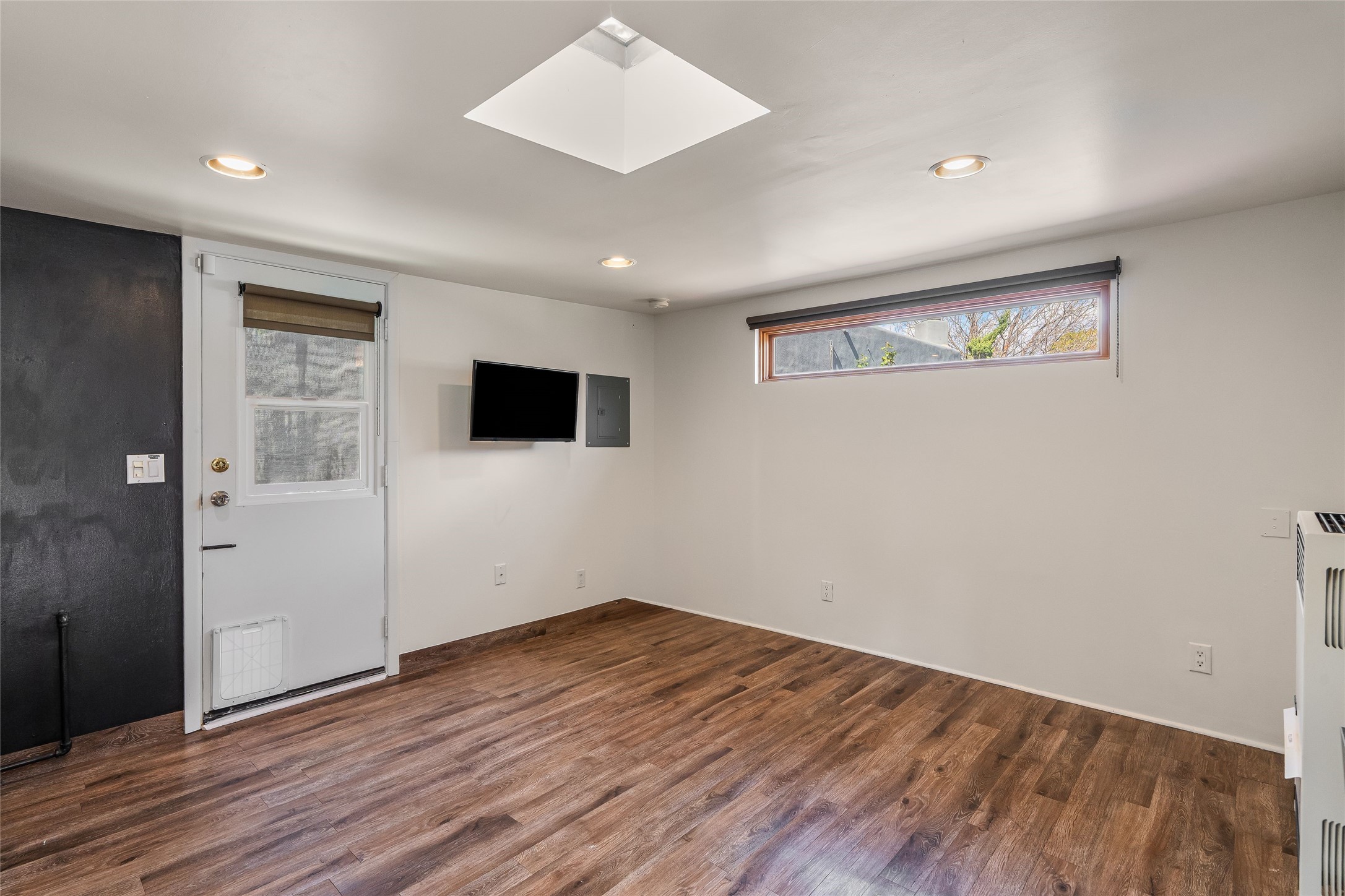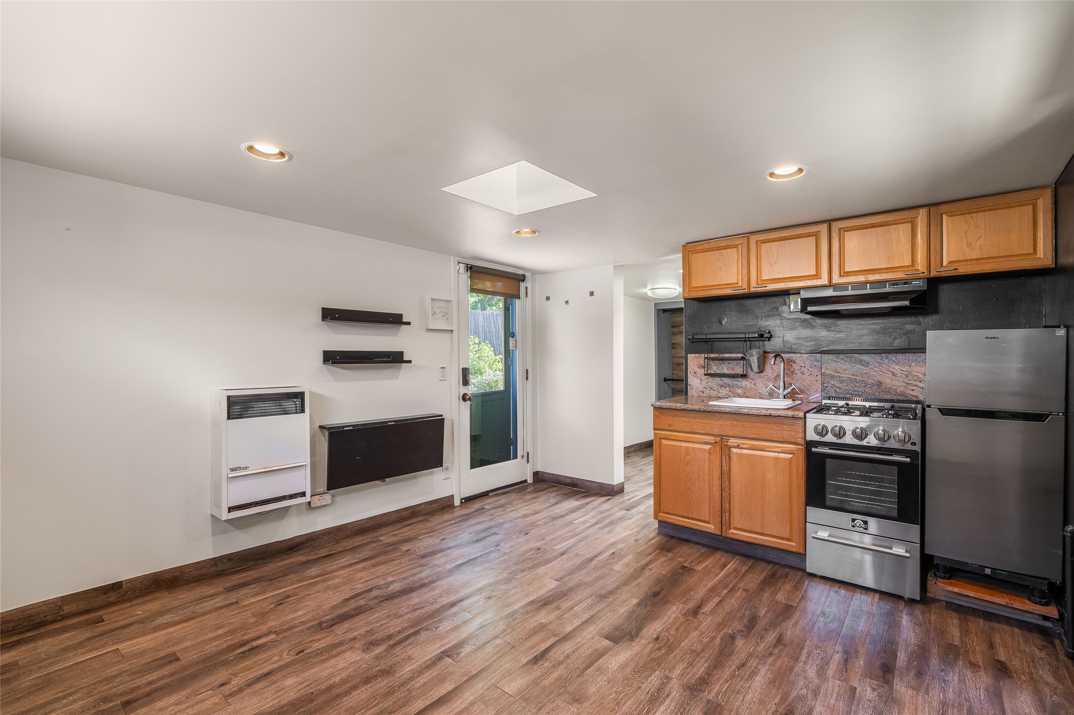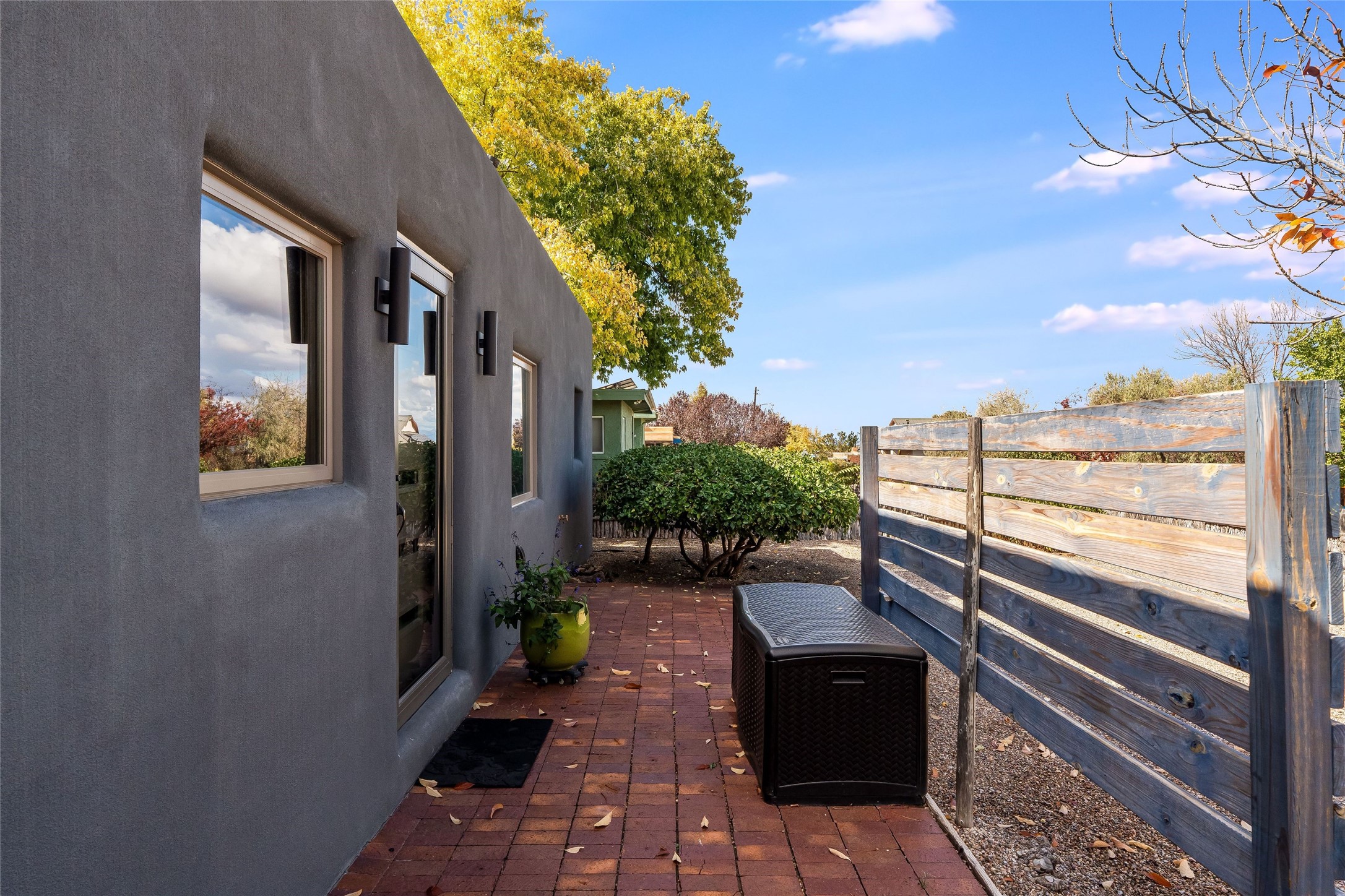 In the charming and centrally located Don Diego neighborhood, 622 Calle Grillo is a rare property with great character and flexibility. A two-bedroom main house and a detached one-bedroom casita sit opposite each other on a 0.15-acre lot, each with their own private and ample outdoor spaces. In an age of uniform whitebox houses, this classic build and styled home is refreshing for its connection to Santa Fe's puebloan architectural roots. Lovingly owned and updated, the property has modern comforts and details wrapped in the warm colors and touches complimentary of its adobe and block construction. Exposed adobe and faux painted walls are the backdrop for an open living, kitchen and dining area that flows to the large backyard. Despite being in the heart of town, the mature landscaping, which includes 70-year-old rose bushes, a large Mountain Ash and gorgeous lilacs and fruit trees, create a treasured sense of privacy. The casita provides opportunities for a future owner, either as spacious guest accommodations or as an income generating asset for short or long term rentals. A short walk to the Railyard, the Cordova shopping center, and the Plaza make this one of the few homes that provide such great value within the epicenter of Santa Fe life.