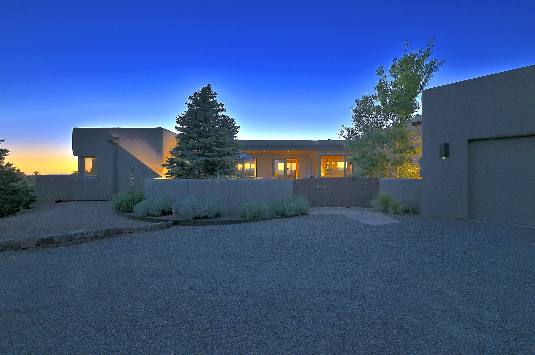 Perched atop a grassy mesa on over 40 acres covering 3 tracts, this 2009 adobe home designed by Ted Turner offers panoramic views of the Sangre de Cristo, Sandia, Jemez, Ortiz Mountain ranges& Mount Taylor. Exuding Santa Fe elegance, with soft contemporary design, featuring concrete floors, diamond-finish clay plaster walls, expansive banks of windows, exposed beams. The chef's kitchen is open and bright, with quartz countertops, a 4-burner range, convection microwave, custom soft-close cabinetry, and pantry. The open-concept layout flows into a curved gallery hallway with indoor-outdoor living and large portals to experience Santa Fe's breathtaking sunsets. Views from every room & excellent separation of bedrooms for privacy and comfort, enjoy radiant in-floor heating, a high-efficiency boiler, a 6,500-gallon rainwater collection system, 12-panel solar array, solar-powered well, and whole-house water filtration as well as a commercial grade roof. The 750-square-foot studio/guest house--built to passive house standard- can be used as an art studio, office, or guest quarters, with south-facing light, concrete floors, a kitchenette, and half-bath. Enjoy a three-car garage with a tall roll-up door, workshop space, and rodent-resistant construction. This an extraordinary retreat just minutes from the heart of Santa Fe--yet worlds away in tranquility and privacy.