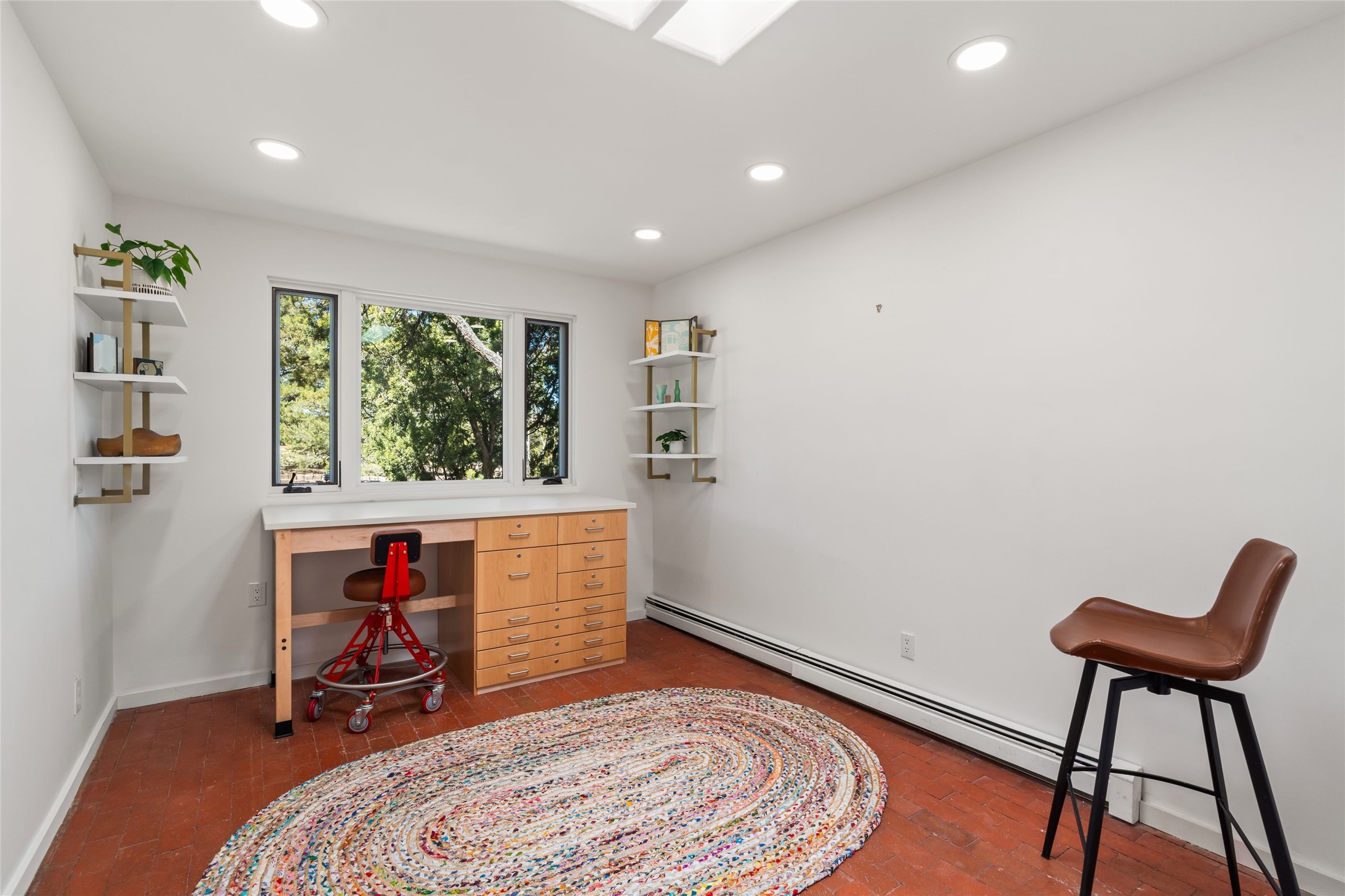Breathtaking views and timeless Santa Fe charm converge in this enchanting light-filled Pueblo Revival home, ideally situated on 2.5 private, wooded acres just minutes from the historic Santa Fe Plaza. With panoramic vistas of the Sangre de Cristo Mountains, this single story 4-bedroom, 3.5-bath residence offers a rare combination of serenity, style, and location.At the heart of the home, the open-concept chef's kitchen--fully rebuilt in 2023--flows beautifully into the dining and living spaces, anchored by a massive picture window that captures the ever-changing mountain light. Outfitted with top-tier appliances by Wolf, Thermador, and KitchenAid, the kitchen features hand-glazed brick backsplash, premium granite countertops, abundant knotty alder cabinetry, clever under-counter storage solutions, and a oversized walk-in pantry.The four spacious bedrooms include two luxurious primary suites, each with a private full bath. These suites, along with the den, living room, and dining room, open directly onto a generously scaled patio, offering spectacular indoor/outdoor living with sweeping views of the Sangre de Cristos--a true extension of the interior space and an entertainer's dream. The patio features a covered portal, dining area, hot tub, and fire pit. Inside, classic Santa Fe design elements abound: two kiva fireplaces, exposed beams and vigas, ample skylights, brick flooring, decorative tile work and built-in bookcases lend warmth and regional authenticity to every room. The layout balances openness with privacy, including a separately located owner's suite with dual walk-in closets and stunning mountain views. Creative pursuits find a natural home in the separate workshop/art studio/yoga room, while ample storage, including a large laundry room and an oversized two-car garage, ensures functionality matches beauty. A beautiful home office space with large windows provides additional options for working from home, a home gym, or can be used as a 5th bedroom