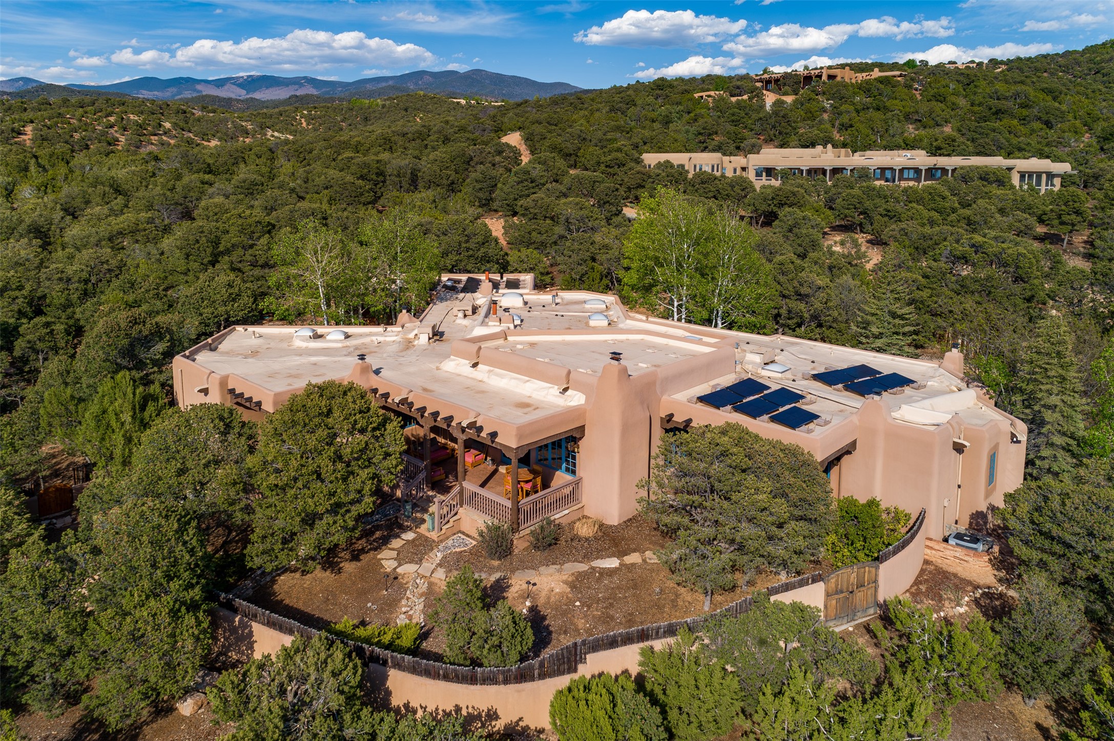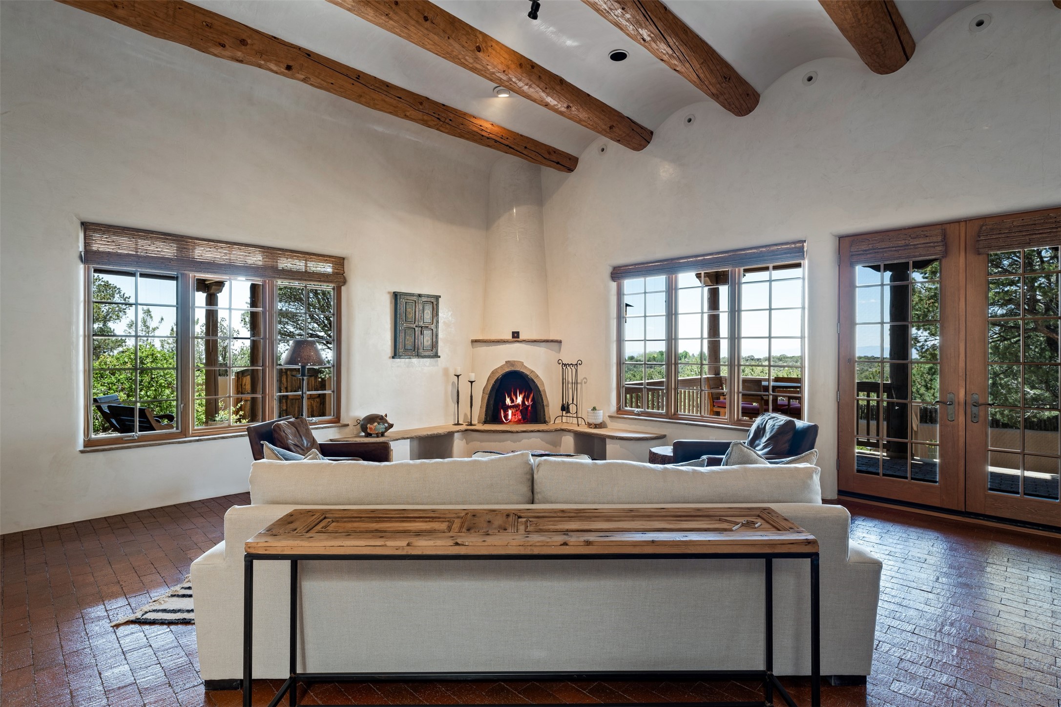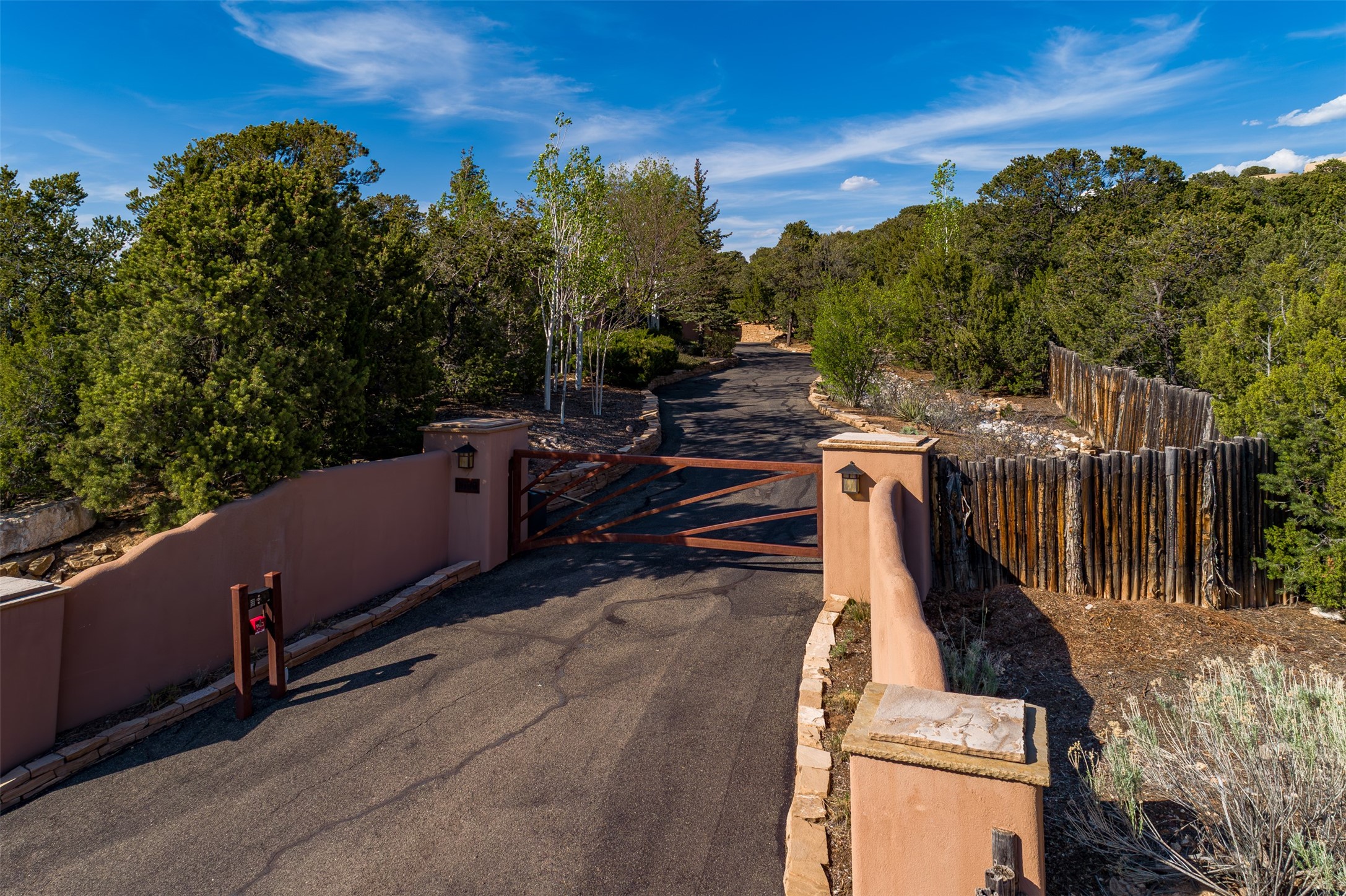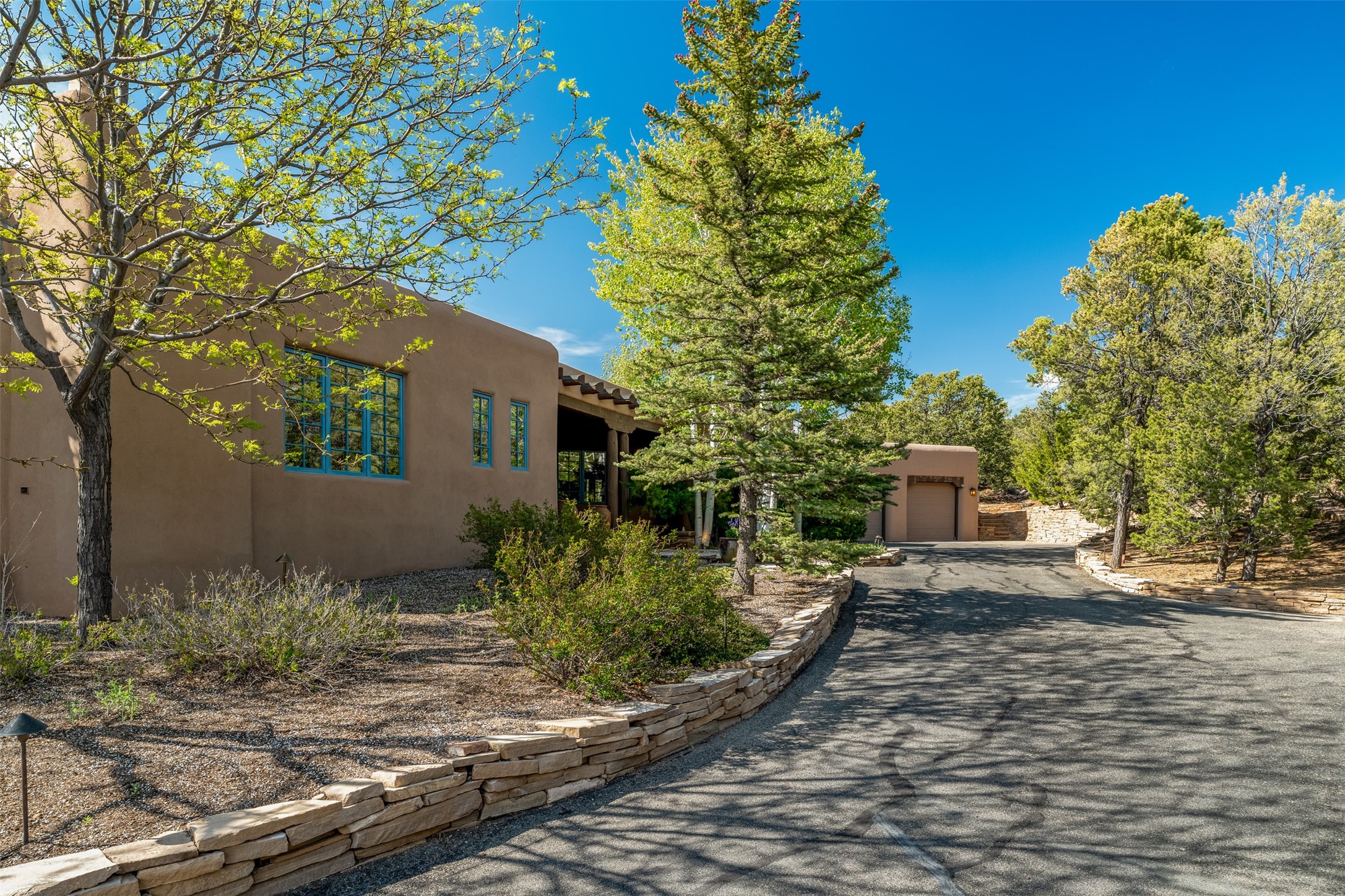 This, Rick Driscoll built, Sierra del Norte estate is perfectly located near the top of the subdivision. The 2.15 acre lot borders county open land, offers western views and can accommodate a casita. This home is a must see for the discerning buyer who wants quality, architectural excellence, privacy, views, and convenient access to the heart of Santa Fe and the ski area. Finishes include diamond polished plaster walls, vigas with coved ceilings, massive beams and reclaimed pine, brick and flagstone floors. The inviting floor plan has separated primary and guest bedrooms in addition to a private office. Each guest suite features, en-suite baths and wood burning fireplaces. The spacious kitchen was completely remodeled by the current owners and features top-notch appliances, Taj Mahal countertops and custom cabinetry. The kitchen is well placed in relation to the living/dining areas, den, and portals to allow for easy entertaining. The spacious primary suite with fireplace opens onto a private portal. The spa like bath features a large shower with separate steam shower, dual sinks, tub, dual toilets and a bidet. The home is fully air conditioned and has radiant in-floor heating, Multiple portals are thoughtfully attached to the various living spaces and bedrooms. The gated driveway leads to an oversized, heated four car garage with lots of storage and EV charger outlet. The grounds are landscaped with rock walls, mature trees, water features and are fenced. An owned photovoltaic system keeps electric bills very low. The membrane roof is under warranty. This is a wonderful, well maintained, home in one of Santa Fe's most sought after neighborhoods. Just move in and enjoy.